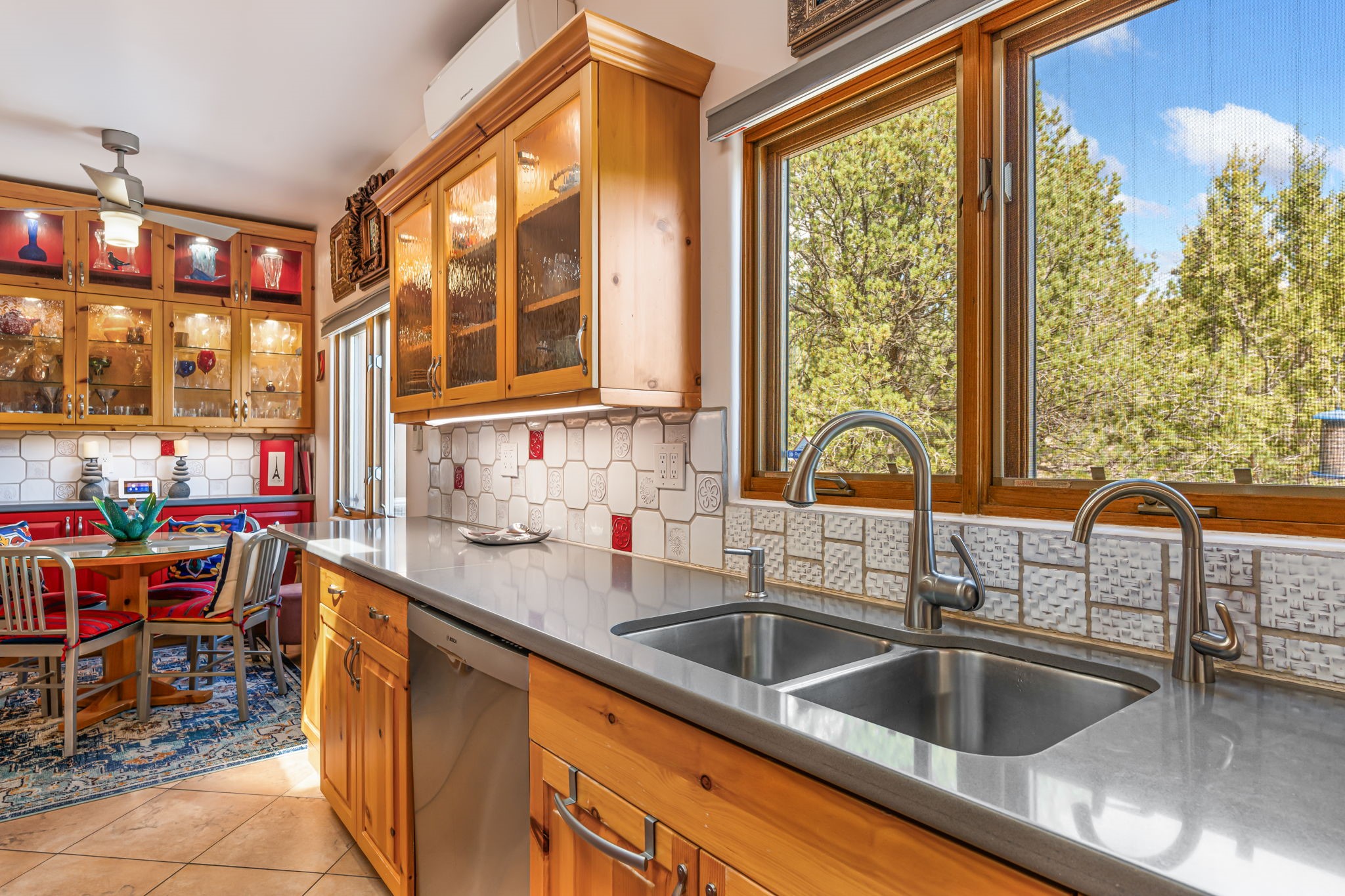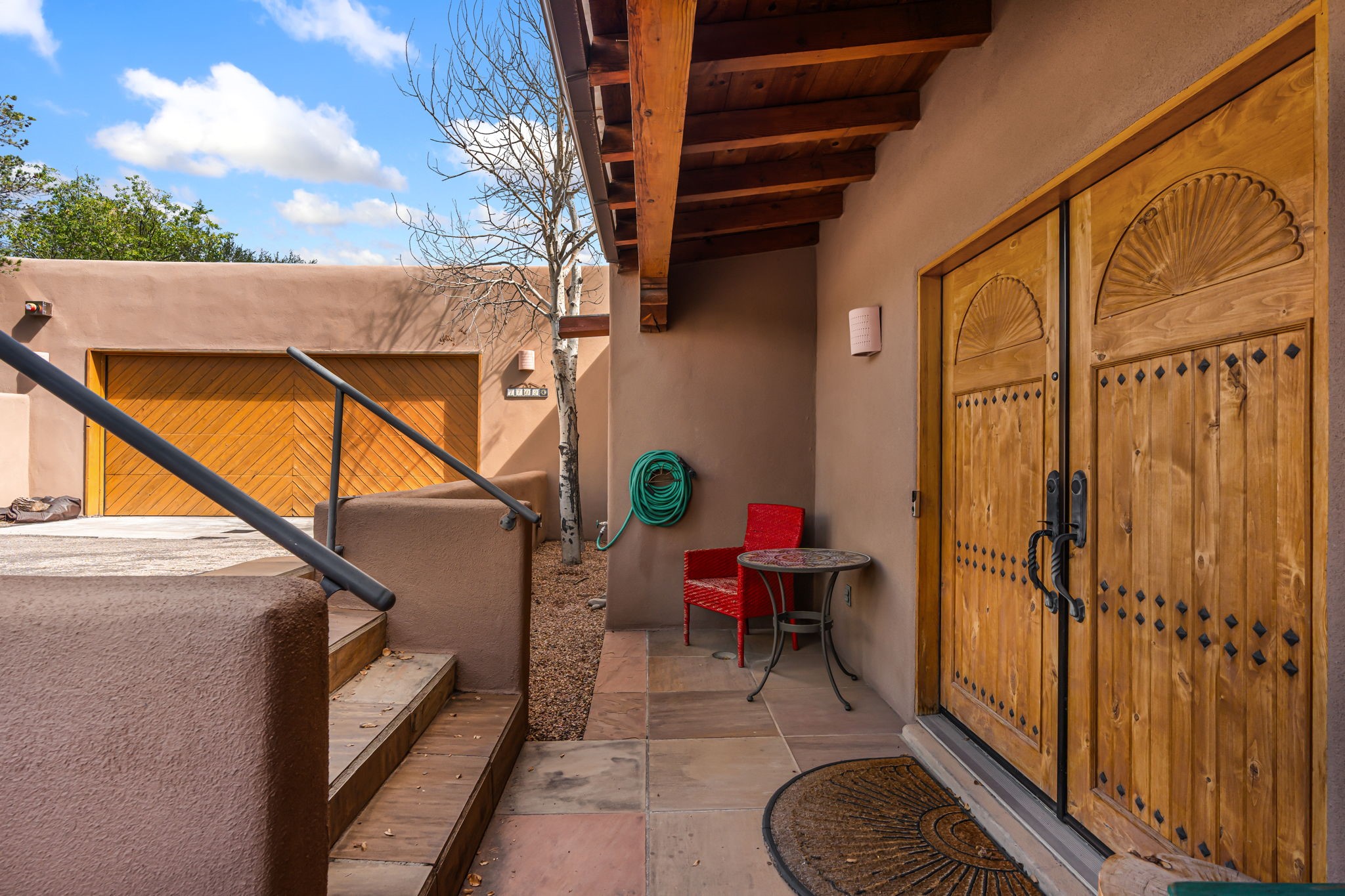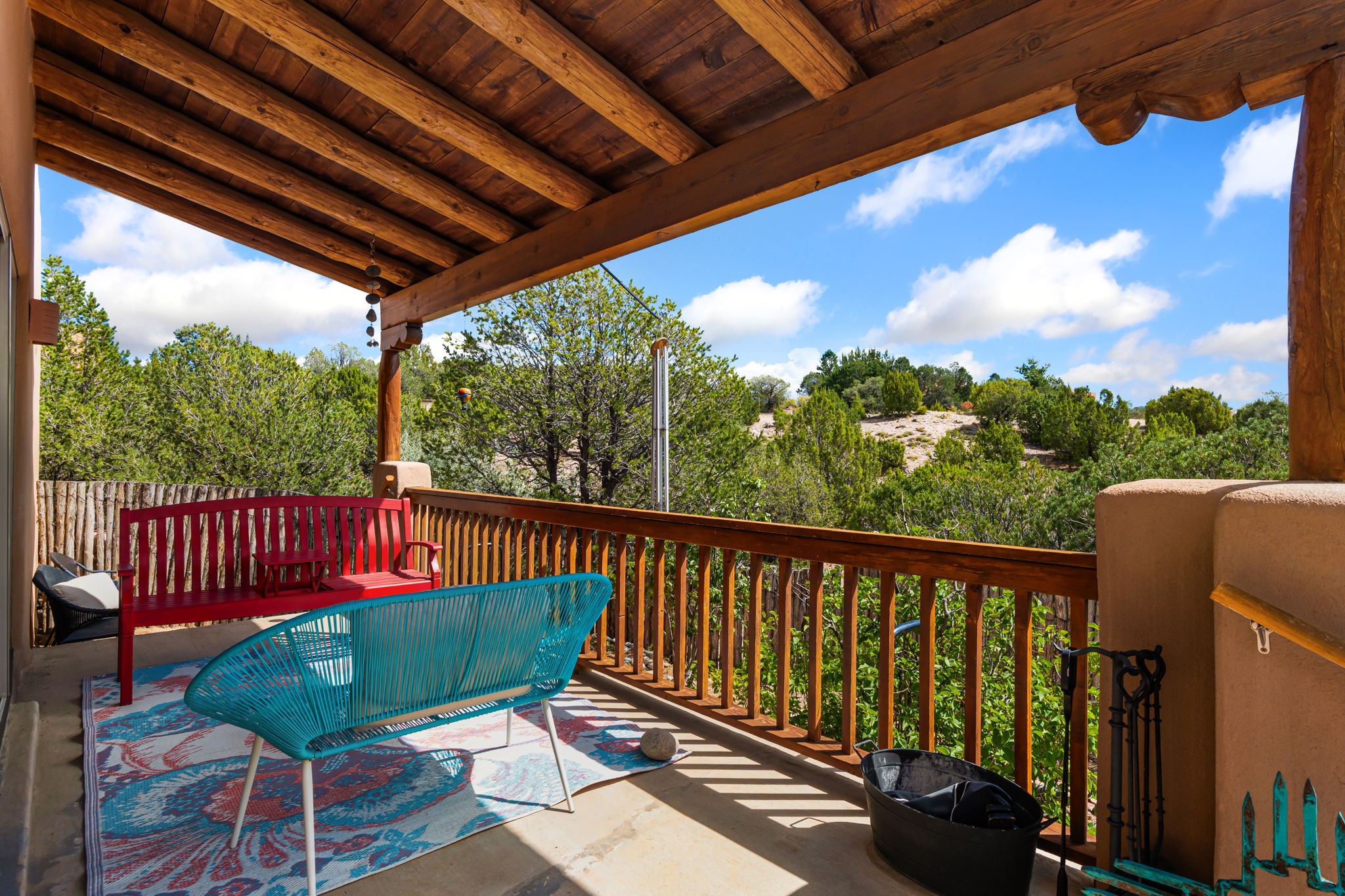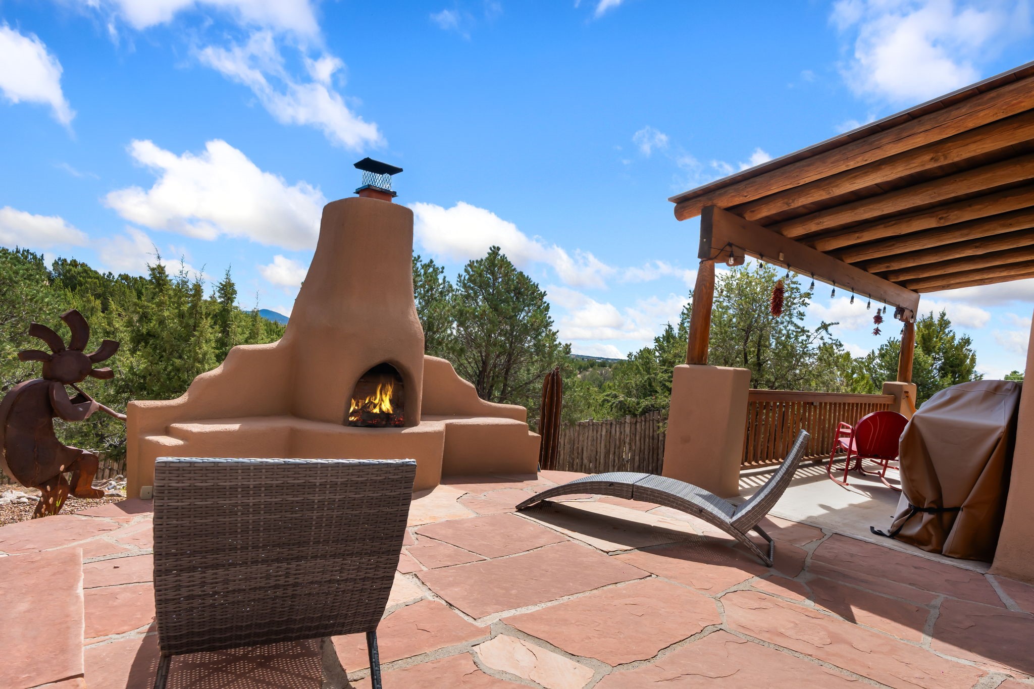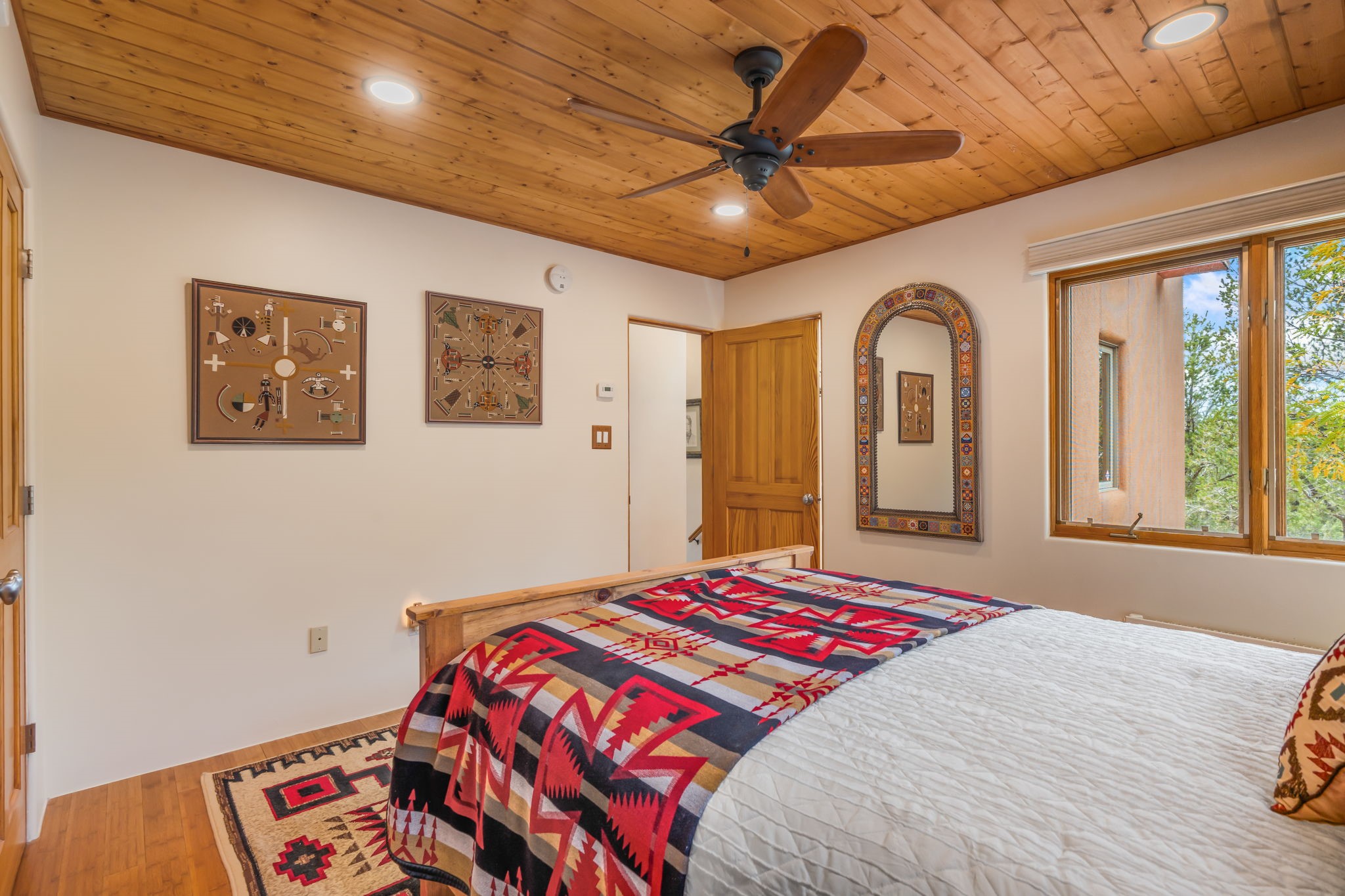 Very rarely, there is a property that combines incredible views from almost every room, ultimate Santa Fe style, modern amenities and an unbeatable location! 5 minutes from downtown, this 3 bed 3 bath custom build is the complete package!Enter the hand carved front doors and be greeted by dramatic views straight away. From here, step into the grand salon with soaring ceilings, a kiva fireplace and stately hand-troweled plaster. The dining room features a drop ceiling and recessed lighting for the most intimate ambience. You'll be serving your happy guests in style from the updated chef's kitchen -featuring Silestone quartz countertops, stainless appliances, a playful handpainted tile backsplash, and a sleek modern design. Almost every room in the home has house outdoor access for that seamless indoor-outdoor living. The views from the portal will be sure to impress: city lights at night and Sangre De Cristo-facing sunsets for that gorgeous Santa Fe color palette. The generous primary suite has its own kiva fireplace, outdoor portal, and a sumptuous bath - with oversized pebble shower, dedicated water closet, deep-soaking tub and dual sinks. The two guest rooms share a large full bath. Recent upgrades (2022) include a new foam and gravel roof with a 10-year warranty, plaster walls in the main living areas, latilla ceilings and 40 new recessed lights in dining and guest rooms, a new alarm system, and an outdoor kiva fireplace flanked by bancos. The oversized 2-car garage has direct entry into the kitchen and dedicated laundry area for easy access. With plenty of storage, this home is perfect for a primary residence, or make it your Santa Fe getaway! Don't miss this opportunity to own all the best Santa Fe has to offer! Schedule a showing today!