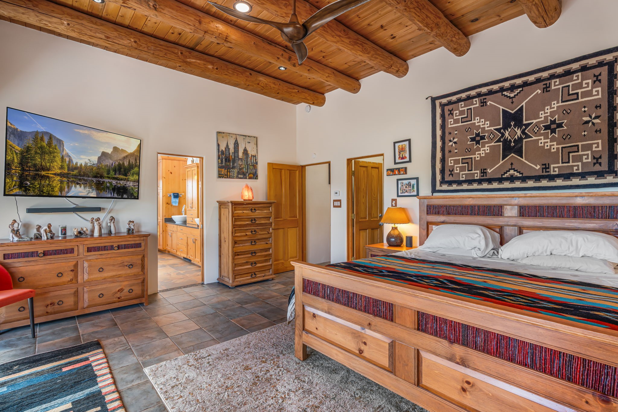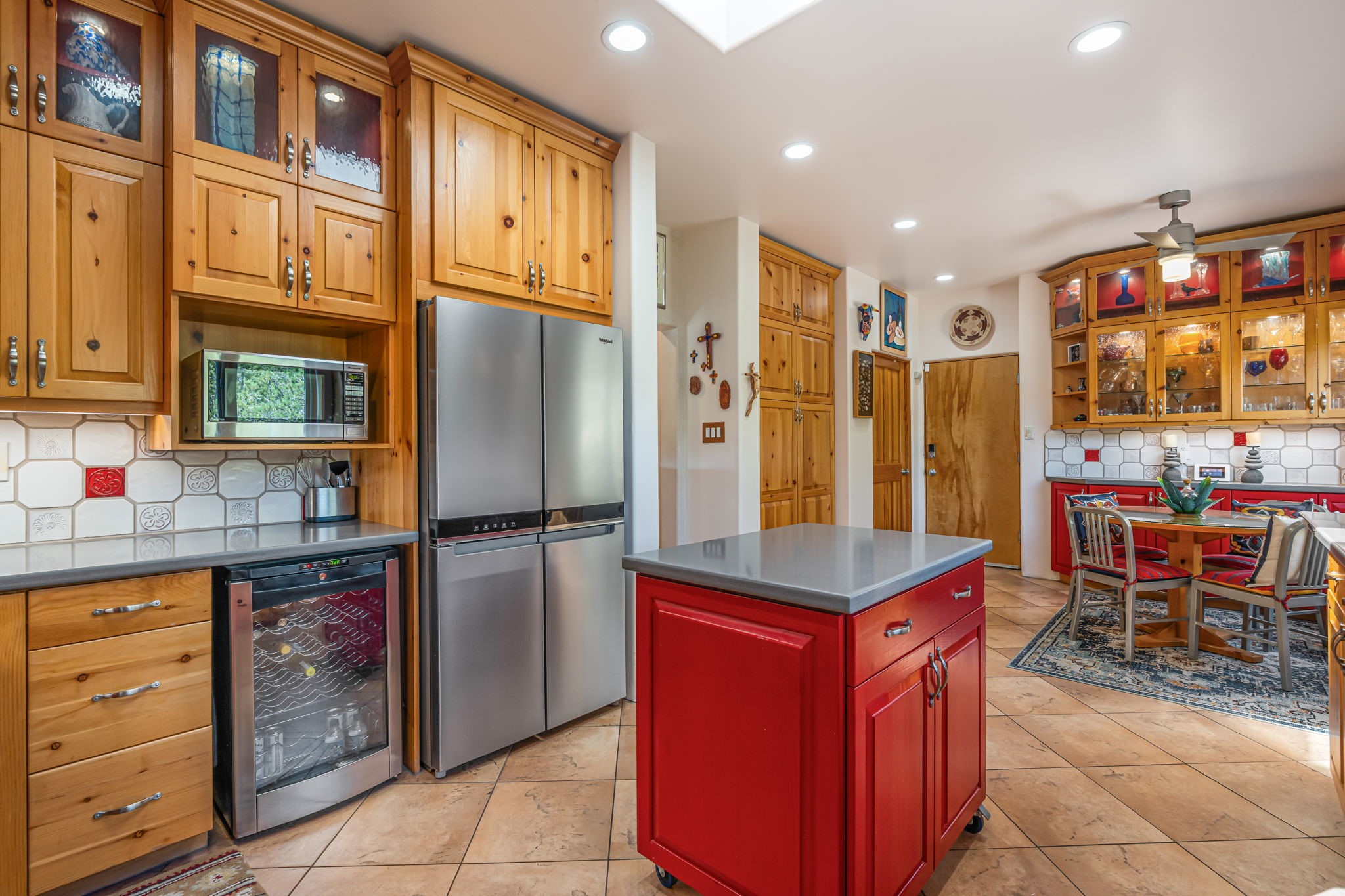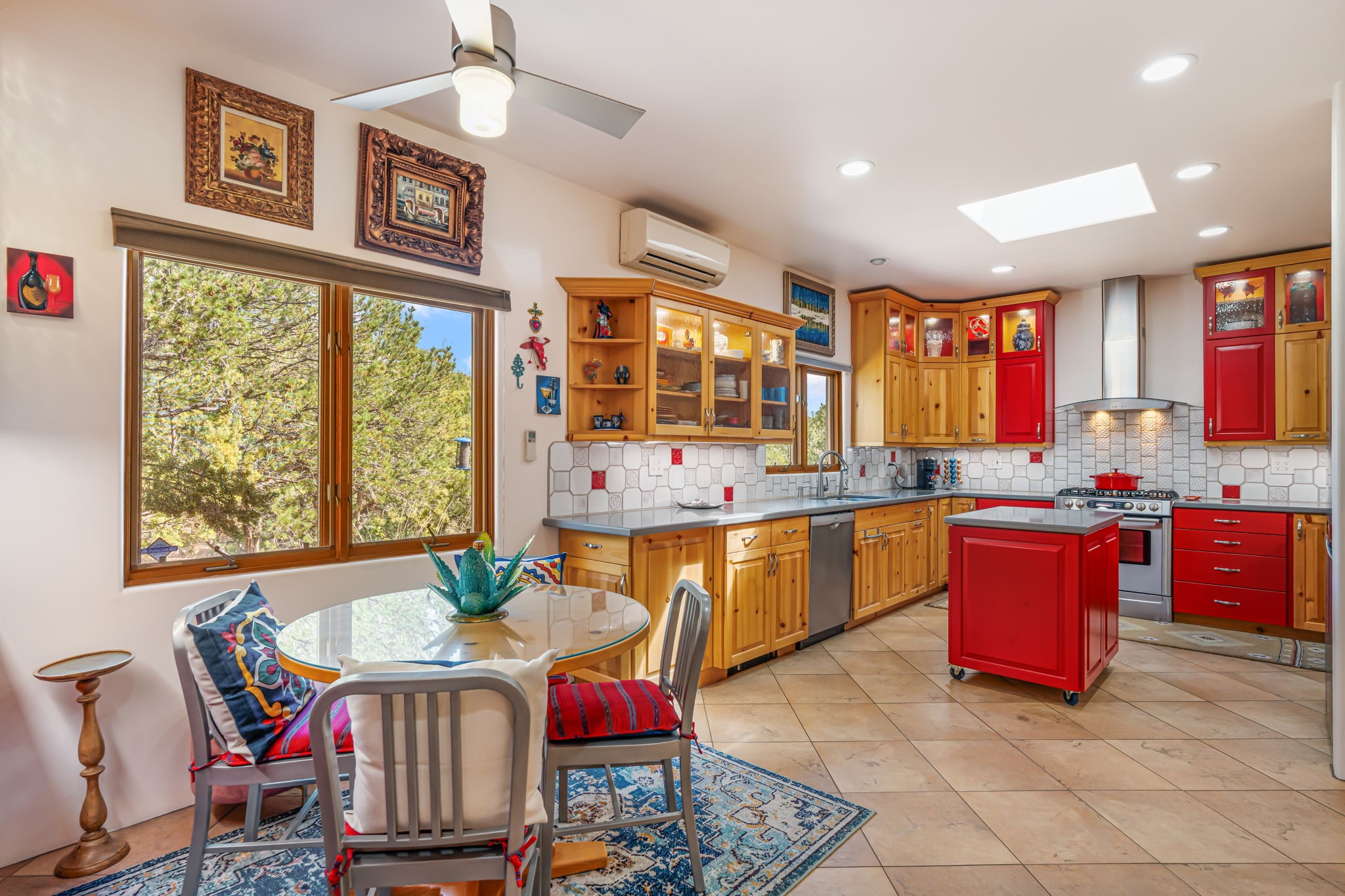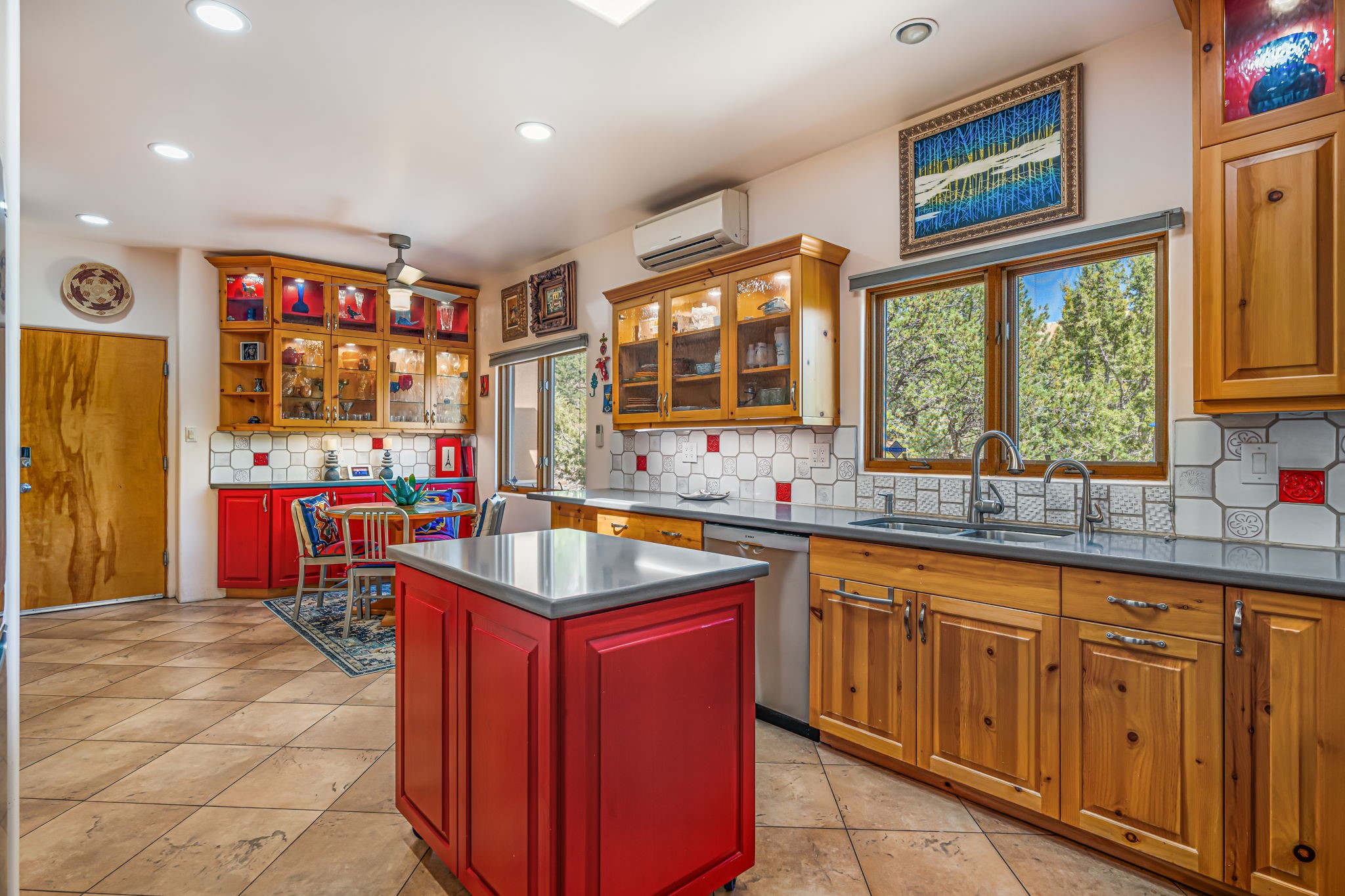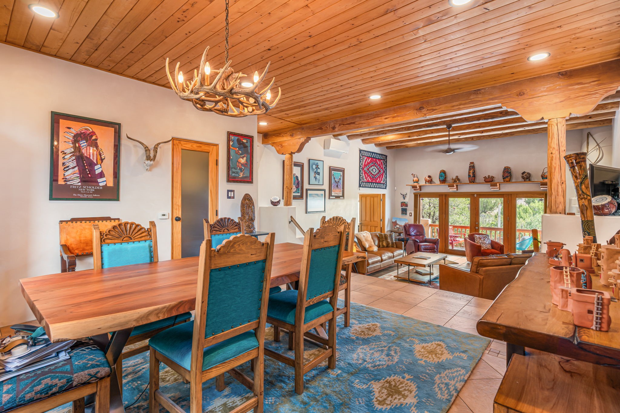 Very rarely, there is a property that combines incredible views from almost every room, ultimate Santa Fe style, modern amenities and an unbeatable location! 5 minutes from downtown, this 3 bed 3 bath custom build is the complete package!Enter the hand carved front doors and be greeted by dramatic views straight away. From here, step into the grand salon with soaring ceilings, a kiva fireplace and stately hand-troweled plaster. The dining room features a drop ceiling and recessed lighting for the most intimate ambience. You'll be serving your happy guests in style from the updated chef's kitchen -featuring Silestone quartz countertops, stainless appliances, a playful handpainted tile backsplash, and a sleek modern design. Almost every room in the home has house outdoor access for that seamless indoor-outdoor living. The views from the portal will be sure to impress: city lights at night and Sangre De Cristo-facing sunsets for that gorgeous Santa Fe color palette. The generous primary suite has its own kiva fireplace, outdoor portal, and a sumptuous bath - with oversized pebble shower, dedicated water closet, deep-soaking tub and dual sinks. The two guest rooms share a large full bath. Recent upgrades (2022) include a new foam and gravel roof with a 10-year warranty, plaster walls in the main living areas, latilla ceilings and 40 new recessed lights in dining and guest rooms, a new alarm system, and an outdoor kiva fireplace flanked by bancos. The oversized 2-car garage has direct entry into the kitchen and dedicated laundry area for easy access. With plenty of storage, this home is perfect for a primary residence, or make it your Santa Fe getaway! Don't miss this opportunity to own all the best Santa Fe has to offer! Schedule a showing today!