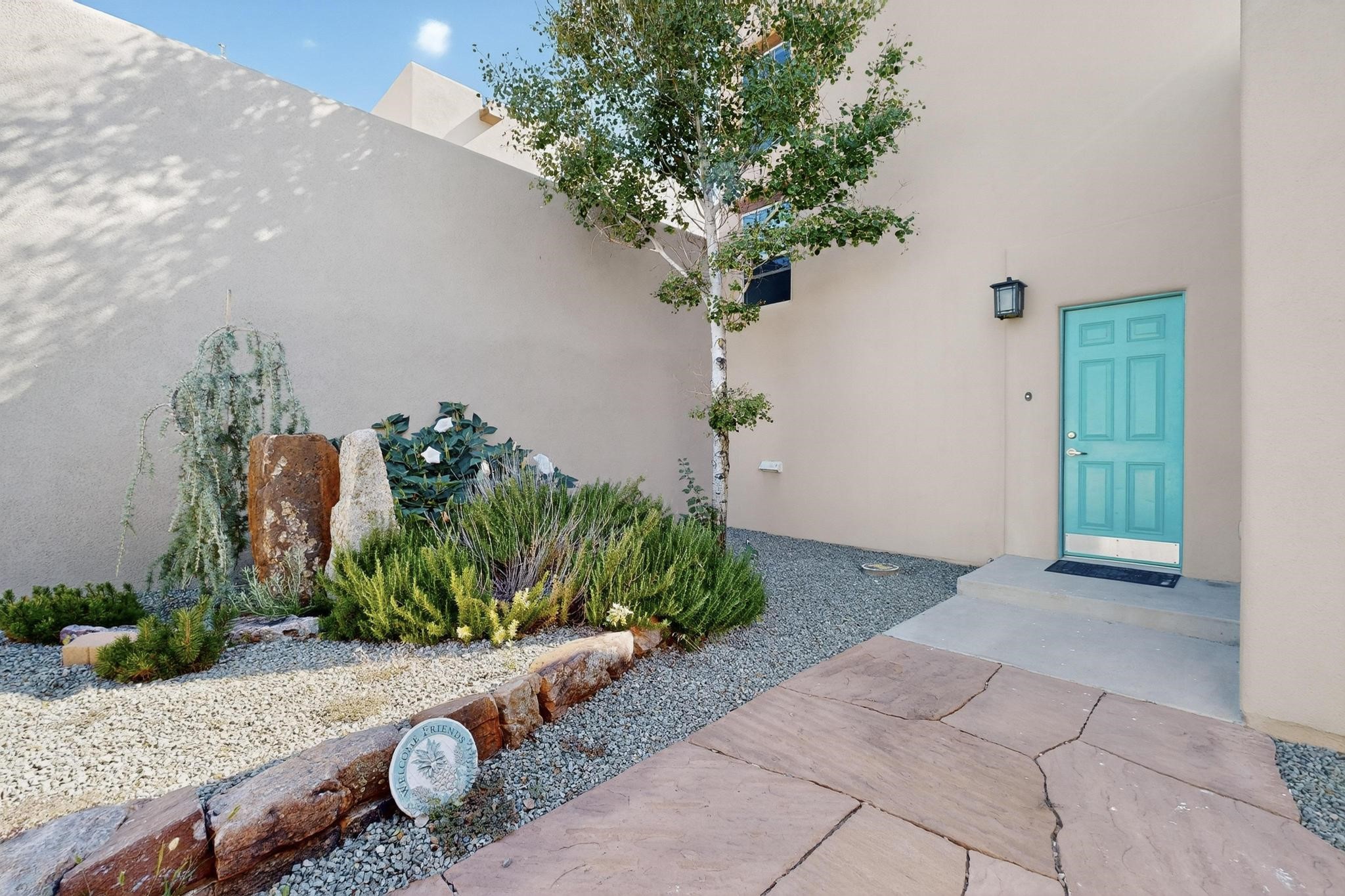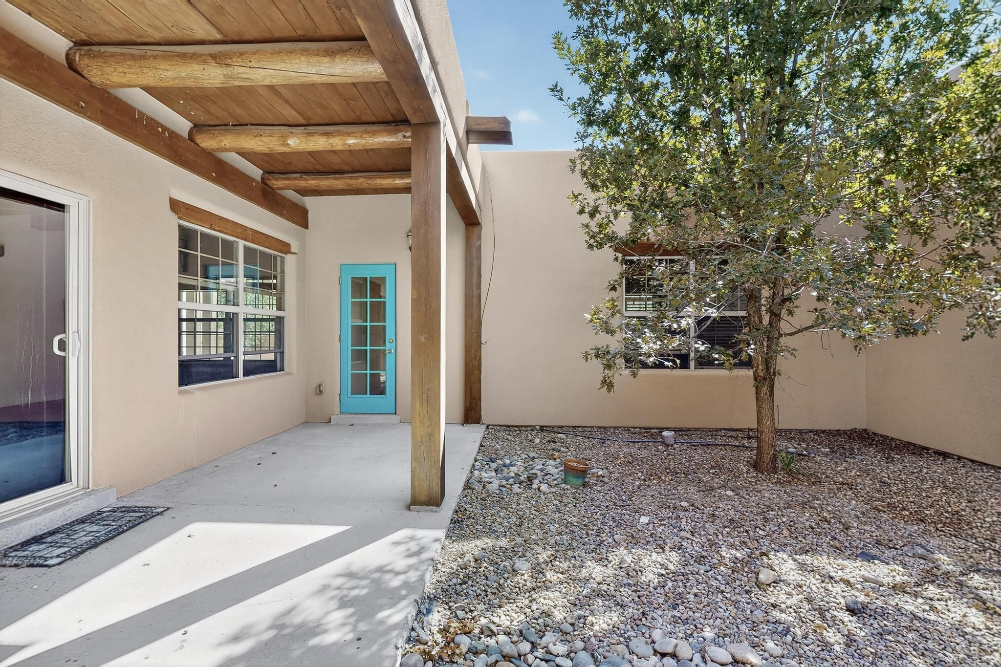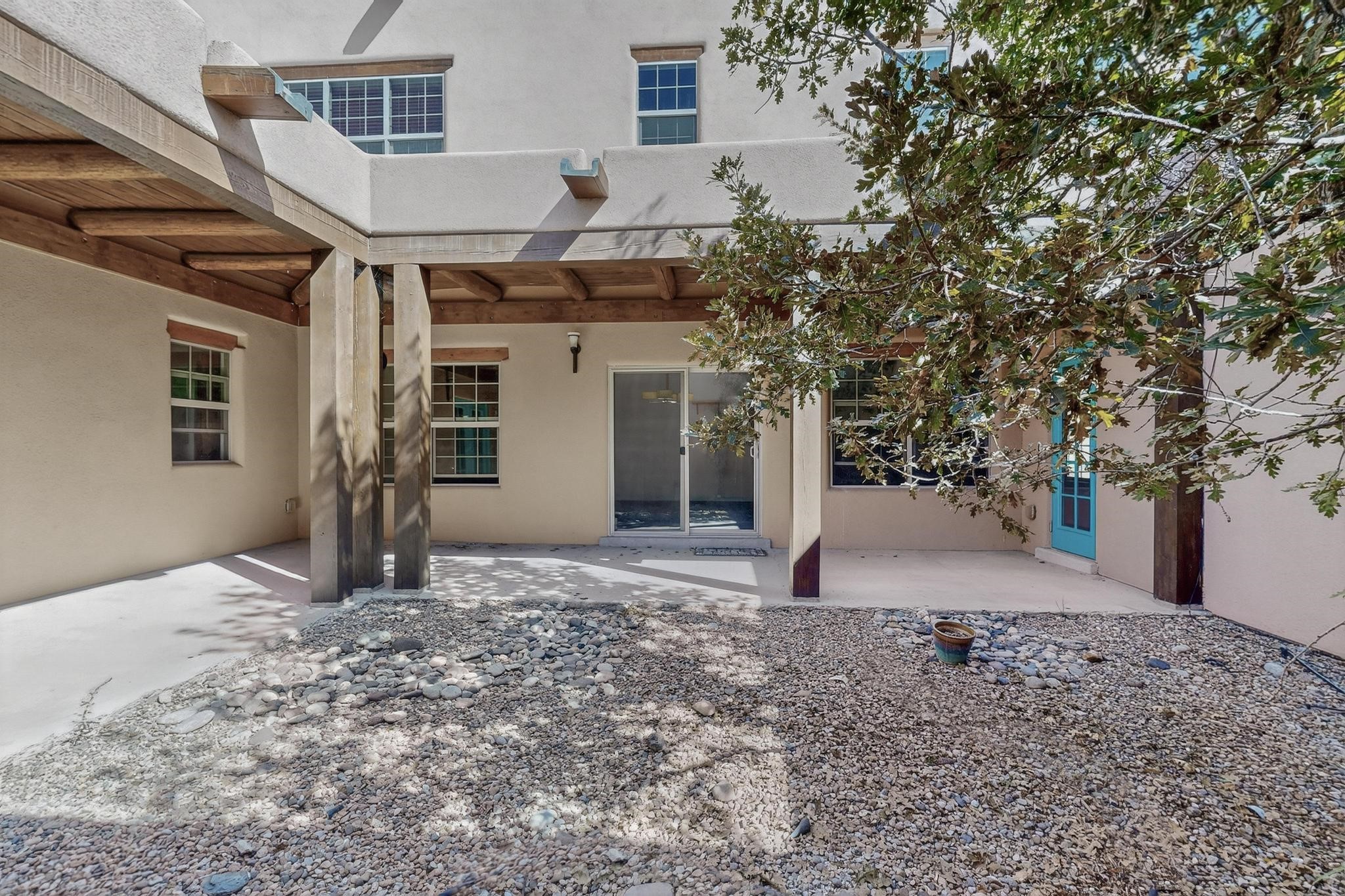 Centrally located in the vibrant Oshara Village, this move-in ready townhome features 2 spacious suites on the main level, along with 2 additional bedrooms and a full bath upstairs, offering comfort and flexibility. The open floor plan connects the kitchen, dining and living areas to a delightful central courtyard, perfect for entertaining or private relaxation. Additional perks include a detached two-car garage, fully-paid solar panels, transferable roof warranty, and a private fenced backyard with low-maintenance xeriscaping. This location offers easy access to medical facilities and diverse dining and shopping options. Whether you're seeking a cozy retreat or a dynamic live/work/play environment, this home has it all!
