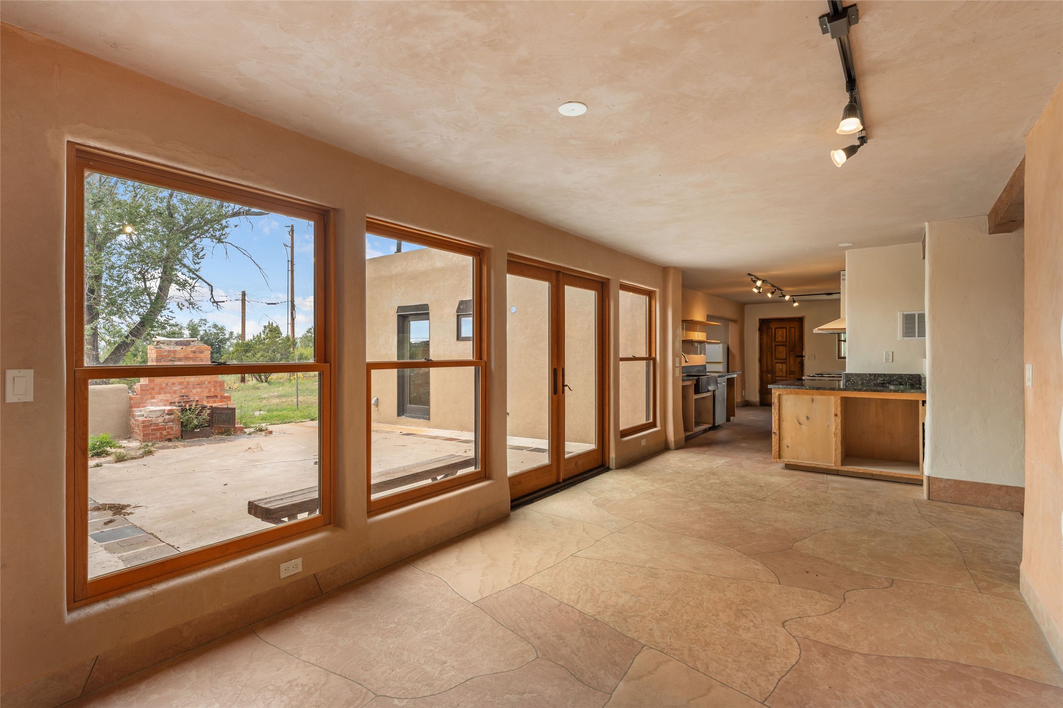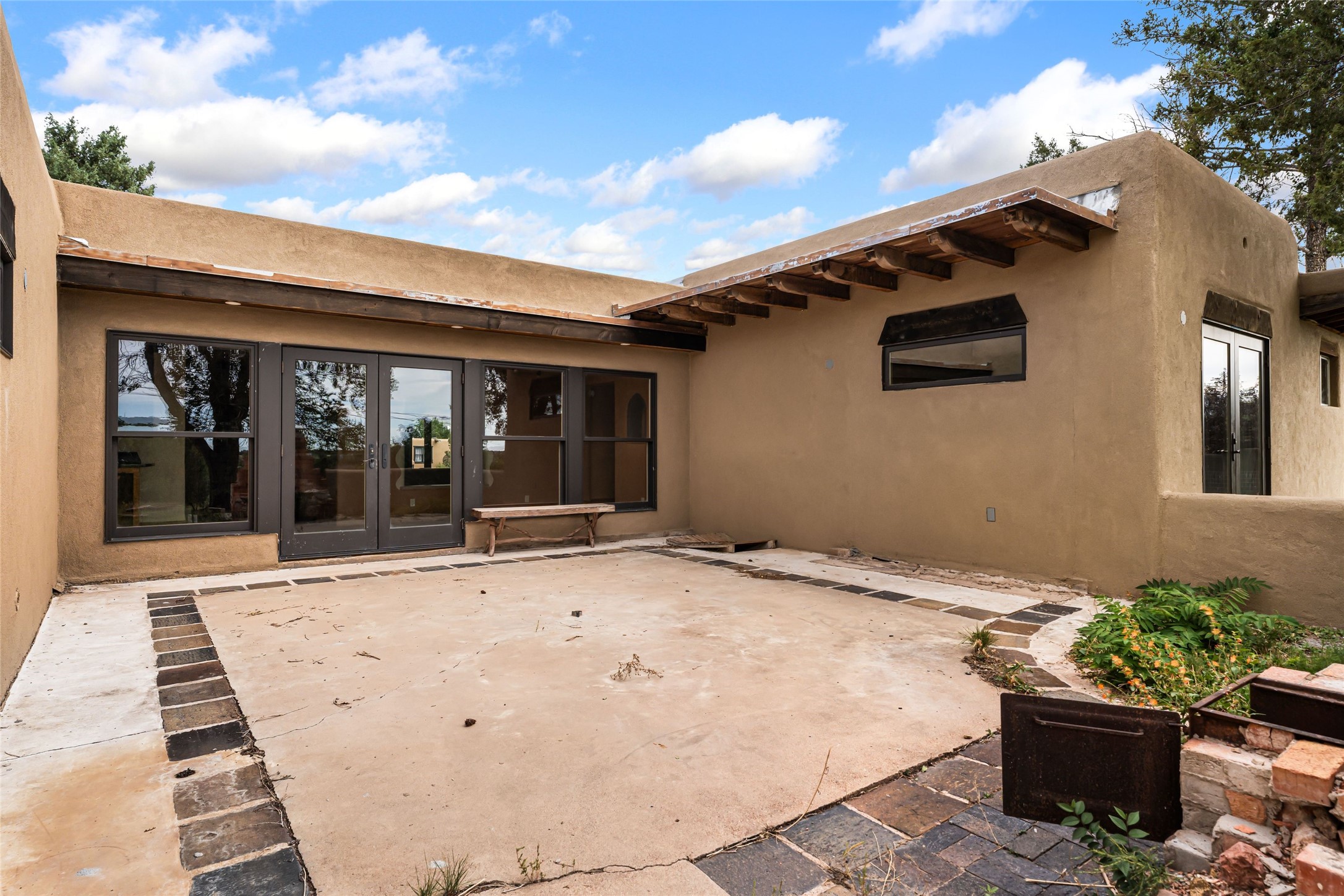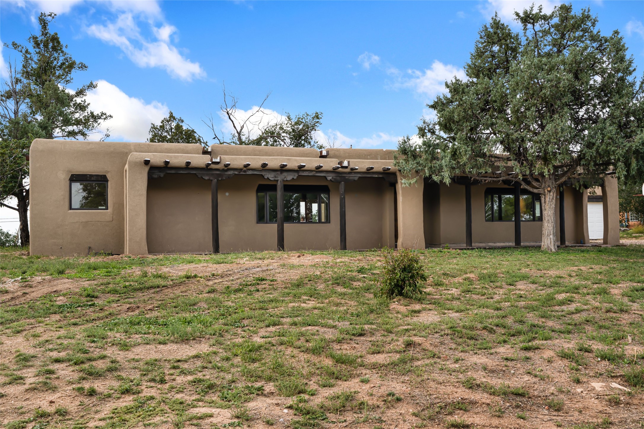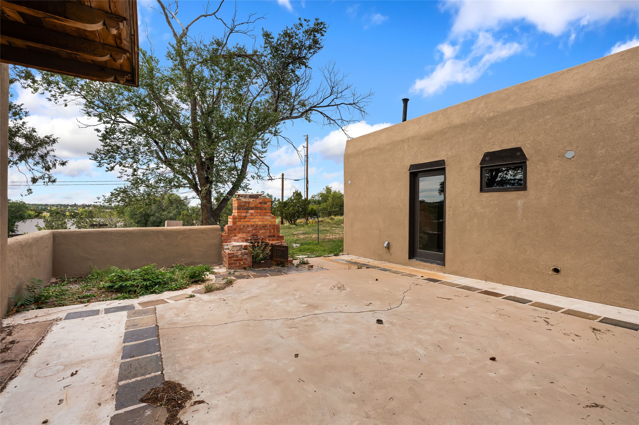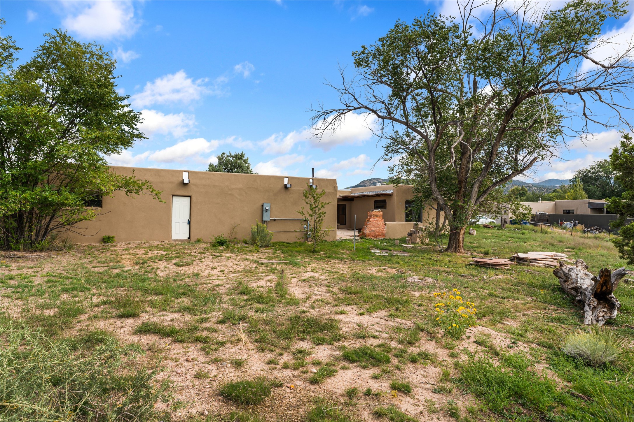Wonderful opportunity to own a Sol Y Lomas adobe gem. Set your sights on the final finishing touches and upgrades on this adobe, three bedroom, two bathroom home at the end of the Santa Barbara Drive. Home is situated on a 3/4 acre lot with mature trees. Large Sunken Living Room and Dining Room with room for lots of entertaining, both with wood burning Fireplaces and flagstone floors. Beautiful Ceilings with Vigas and Latillas. New Marvin double pane wood windows and hardwood floors. Beautiful carved doors and wood accents in the home. The oversized two car garage has enough additional space for a small workshop. Ductless mini-splits heat and cool. Rinnai tankless hot water heater. Brand new stucco done in 2025. Bathroom includes tub, separate shower and dual sinks with nice tile accents. Lots of storage space. Outside in the back yard is a patio with an older brick fireplace. In the back of home is a space to be finished for a studio apartment with an additional bathroom and access to the back patio. Minutes to Downtown Santa Fe, hospital, shopping, and I-25.