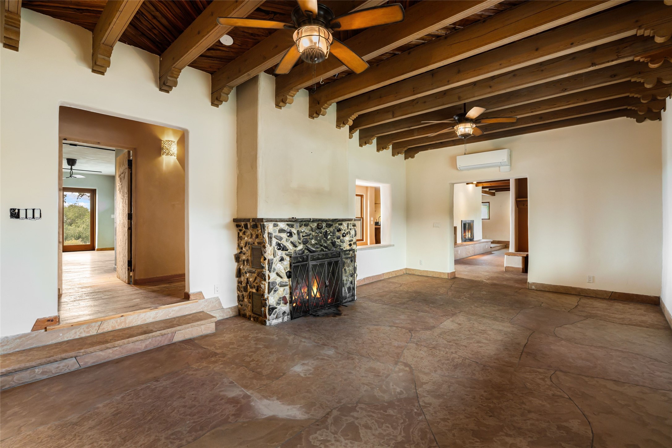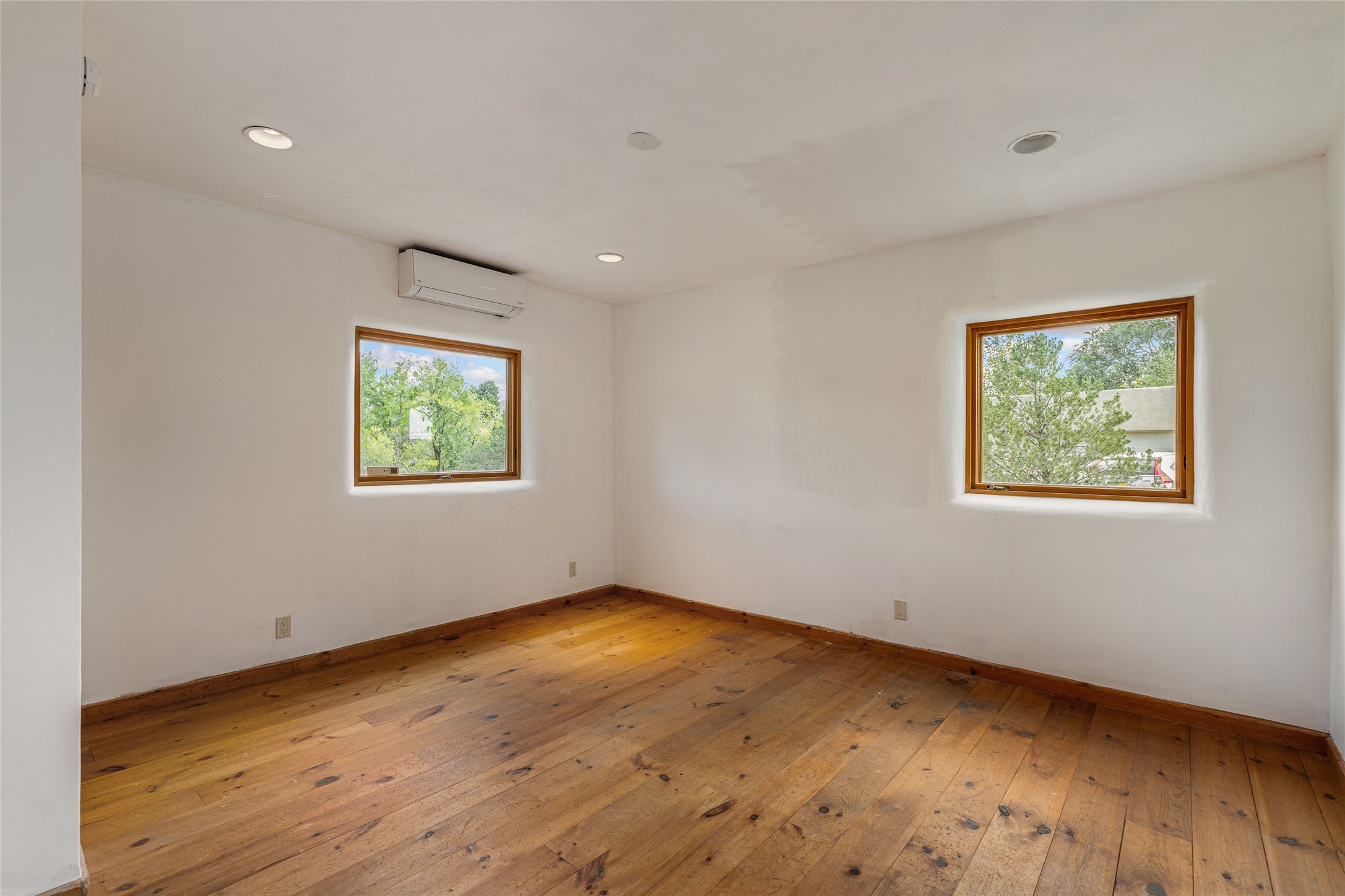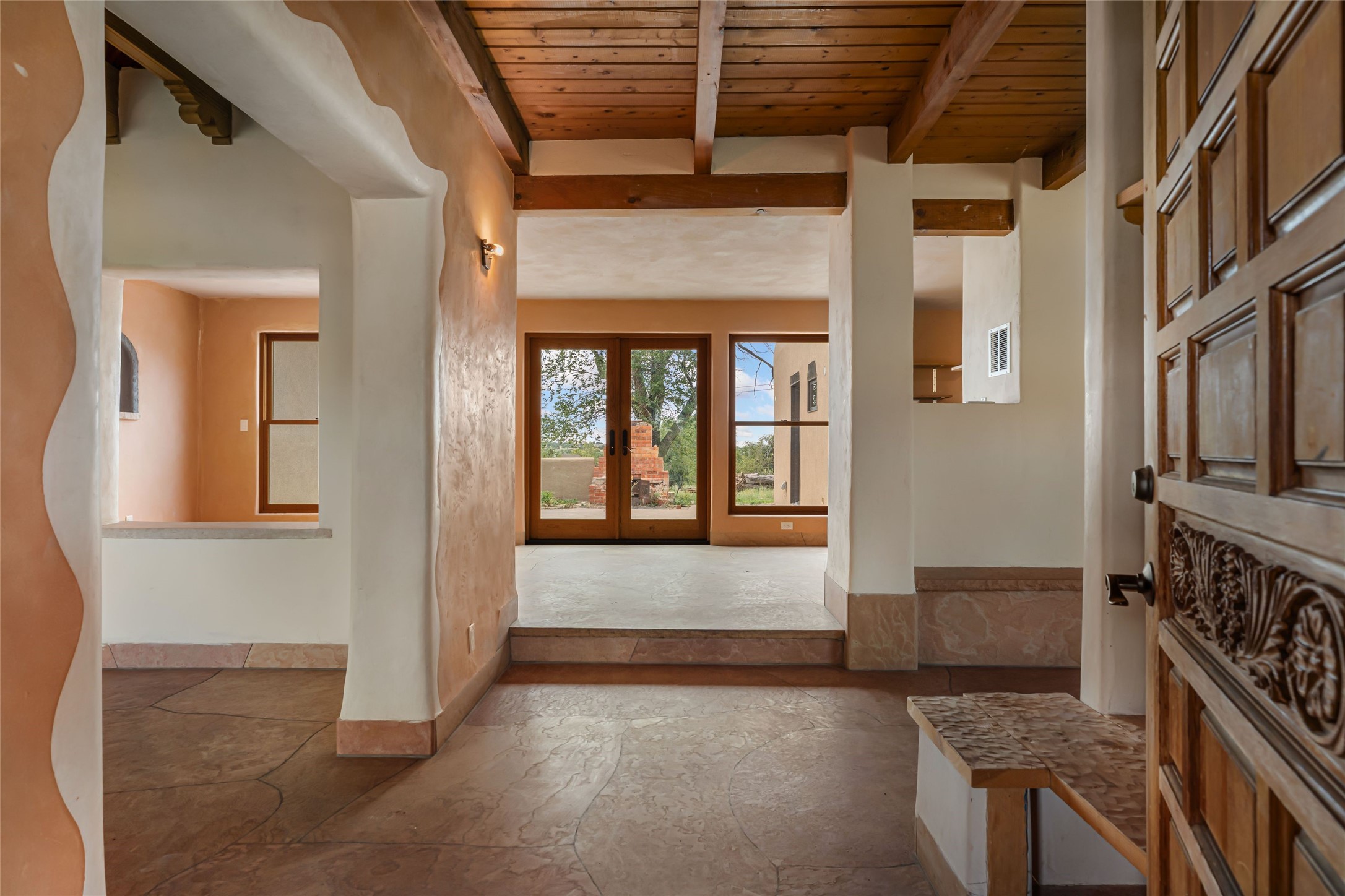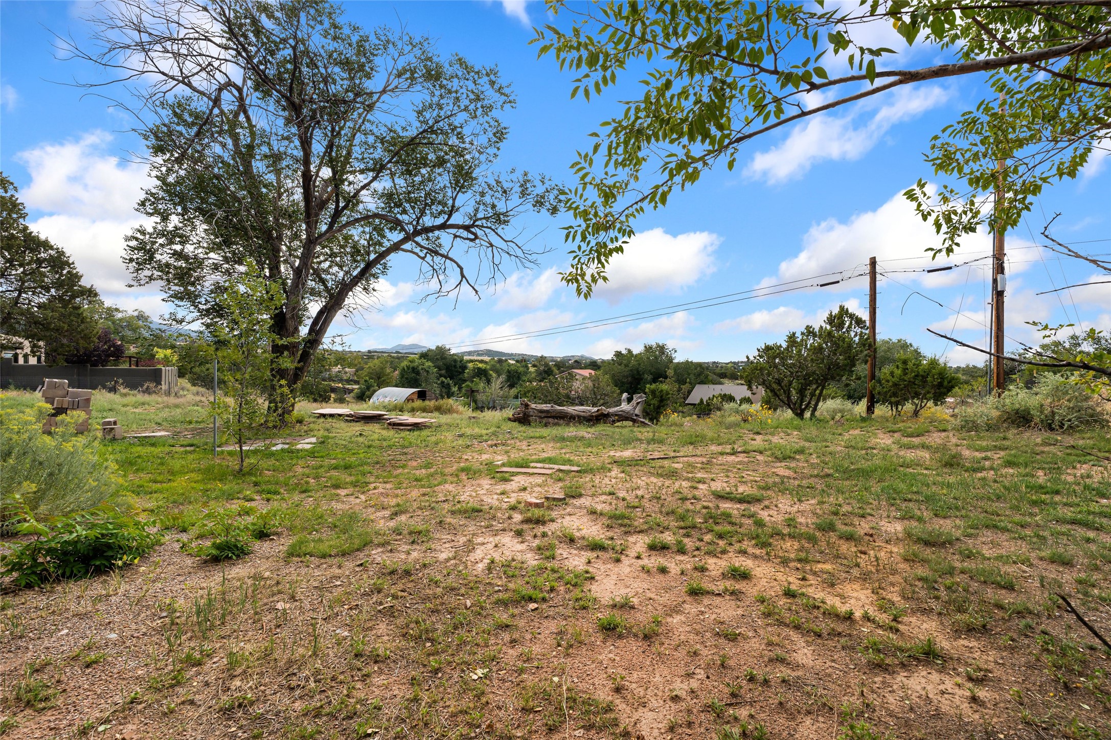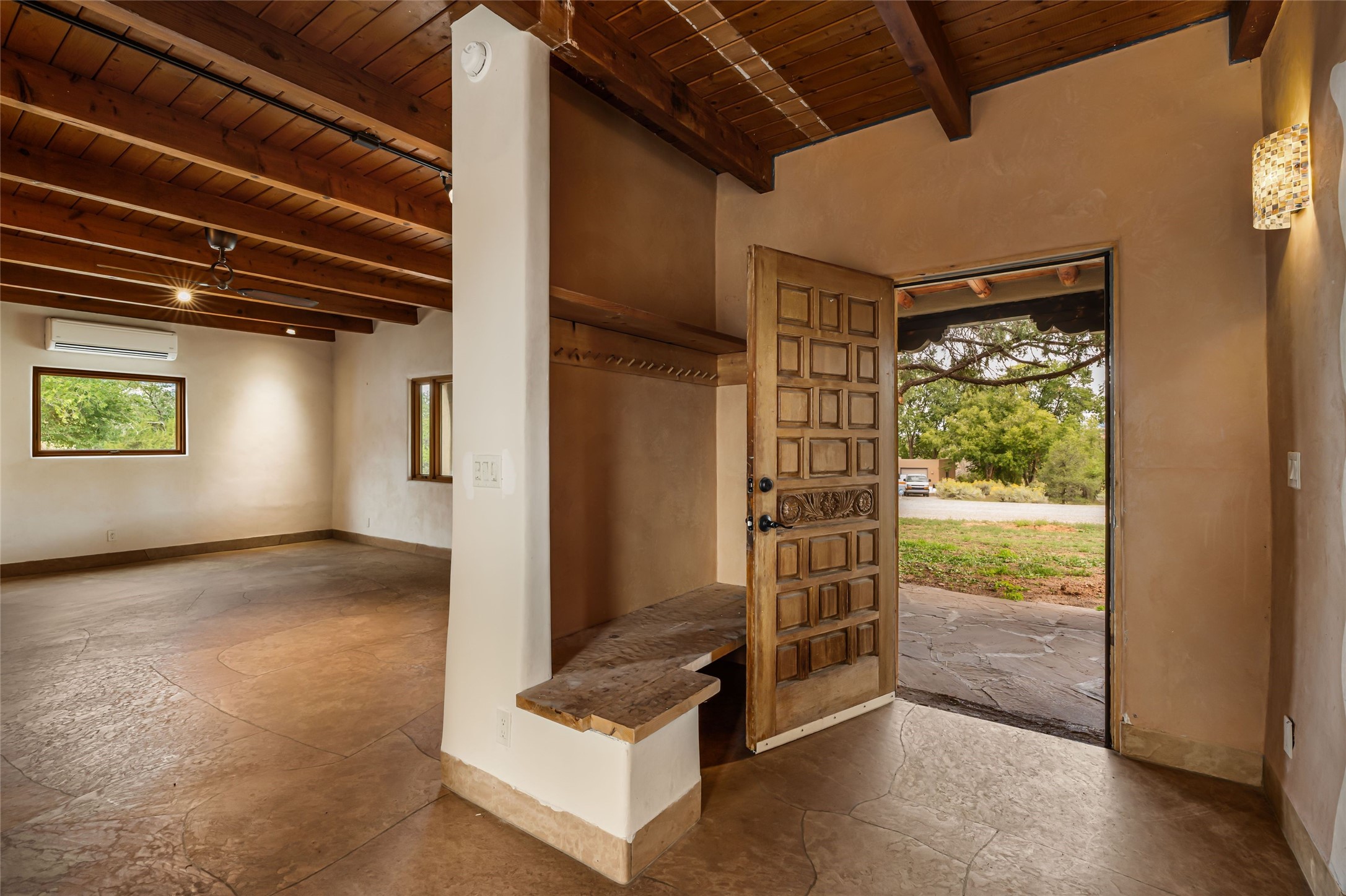Wonderful opportunity to own a Sol Y Lomas adobe gem. Set your sights on the final finishing touches and upgrades on this adobe, three bedroom, two bathroom home at the end of the Santa Barbara Drive. Home is situated on a 3/4 acre lot with mature trees. Large Sunken Living Room and Dining Room with room for lots of entertaining, both with wood burning Fireplaces and flagstone floors. Beautiful Ceilings with Vigas and Latillas. New Marvin double pane wood windows and hardwood floors. Beautiful carved doors and wood accents in the home. The oversized two car garage has enough additional space for a small workshop. Ductless mini-splits heat and cool. Rinnai tankless hot water heater. Brand new stucco done in 2025. Bathroom includes tub, separate shower and dual sinks with nice tile accents. Lots of storage space. Outside in the back yard is a patio with an older brick fireplace. In the back of home is a space to be finished for a studio apartment with an additional bathroom and access to the back patio. Minutes to Downtown Santa Fe, hospital, shopping, and I-25.