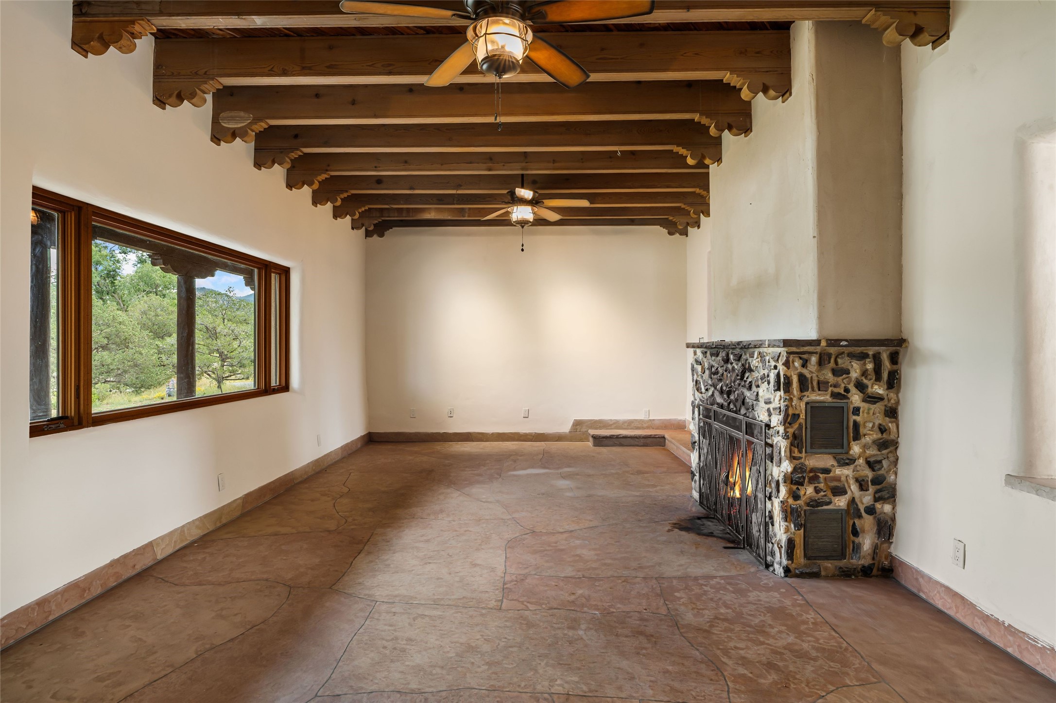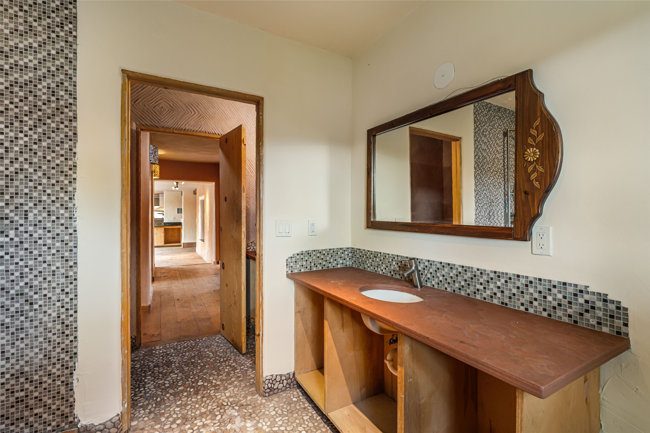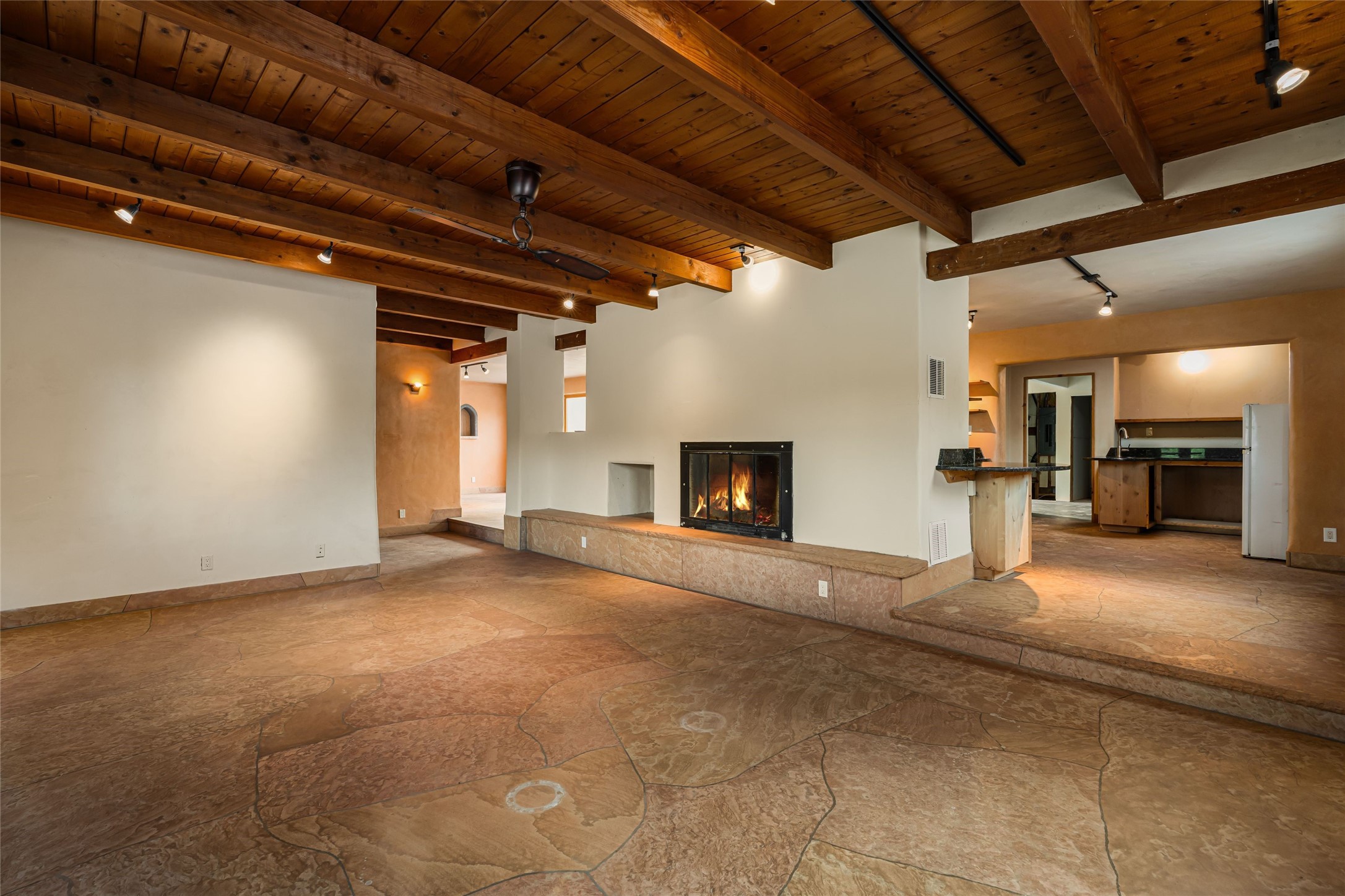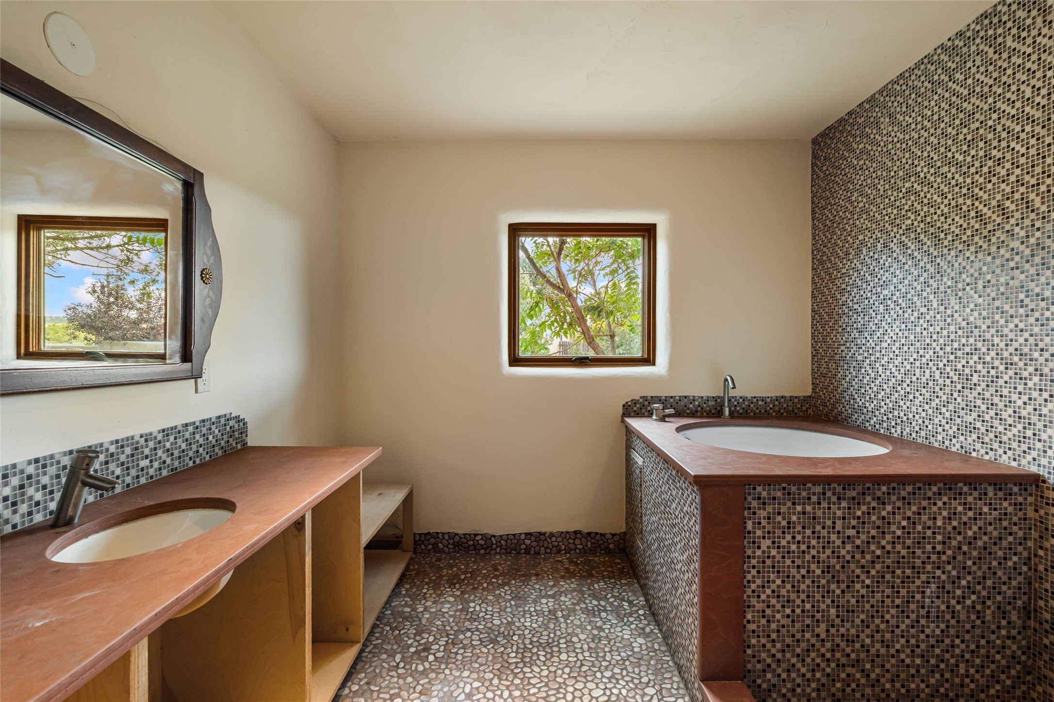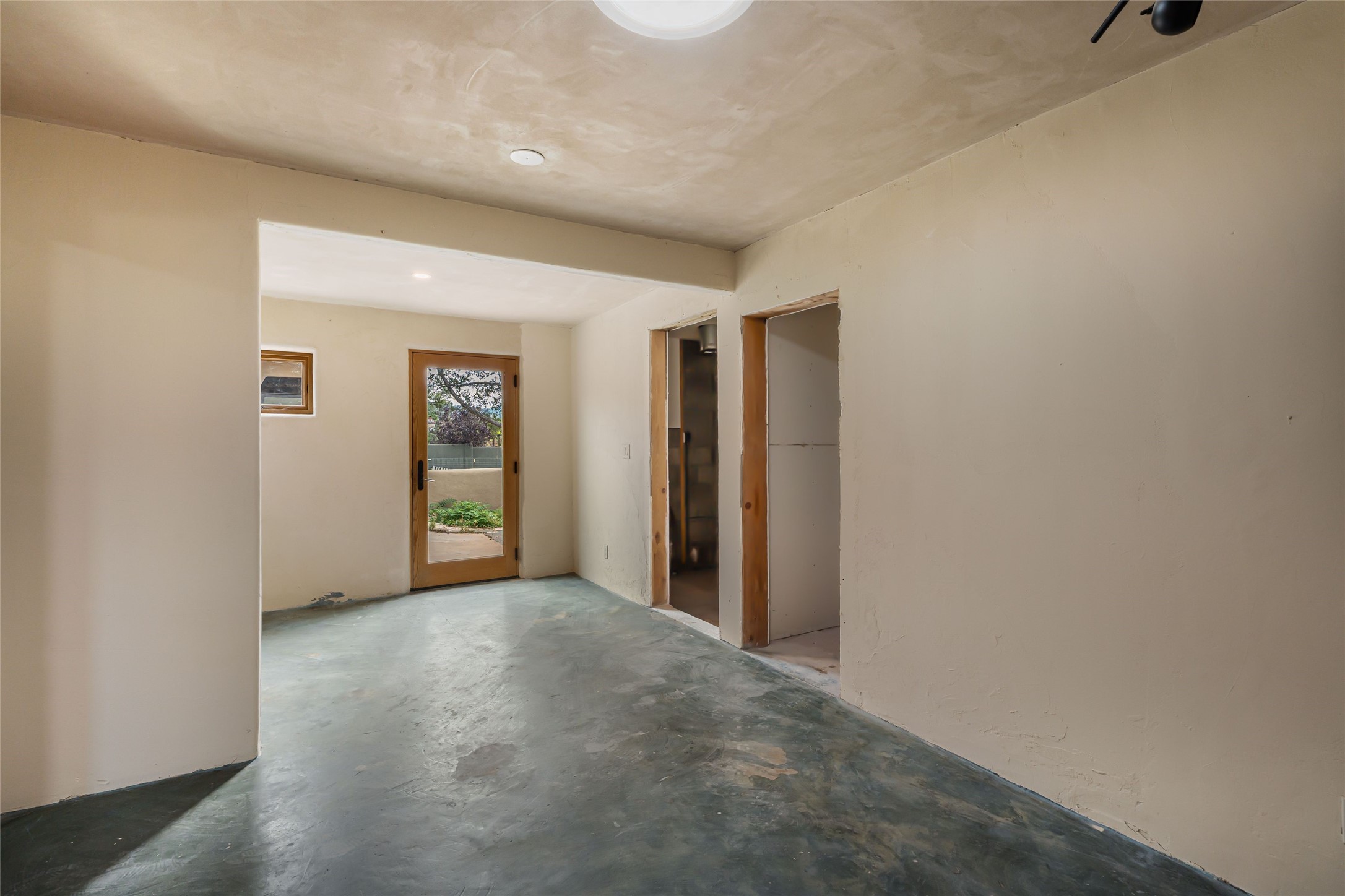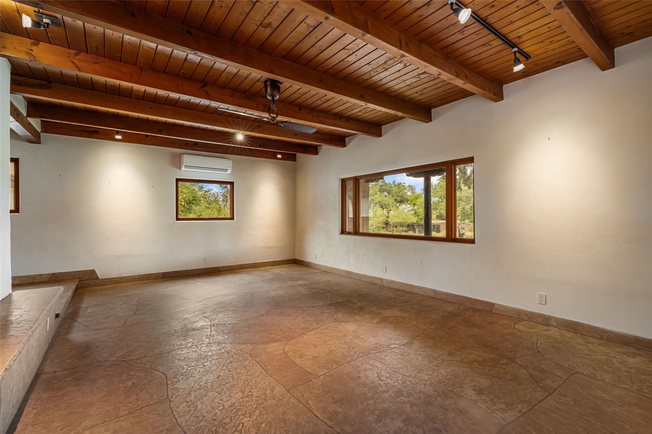Wonderful opportunity to own a Sol Y Lomas adobe gem. Set your sights on the final finishing touches and upgrades on this adobe, three bedroom, two bathroom home at the end of the Santa Barbara Drive. Home is situated on a 3/4 acre lot with mature trees. Large Sunken Living Room and Dining Room with room for lots of entertaining, both with wood burning Fireplaces and flagstone floors. Beautiful Ceilings with Vigas and Latillas. New Marvin double pane wood windows and hardwood floors. Beautiful carved doors and wood accents in the home. The oversized two car garage has enough additional space for a small workshop. Ductless mini-splits heat and cool. Rinnai tankless hot water heater. Brand new stucco done in 2025. Bathroom includes tub, separate shower and dual sinks with nice tile accents. Lots of storage space. Outside in the back yard is a patio with an older brick fireplace. In the back of home is a space to be finished for a studio apartment with an additional bathroom and access to the back patio. Minutes to Downtown Santa Fe, hospital, shopping, and I-25.