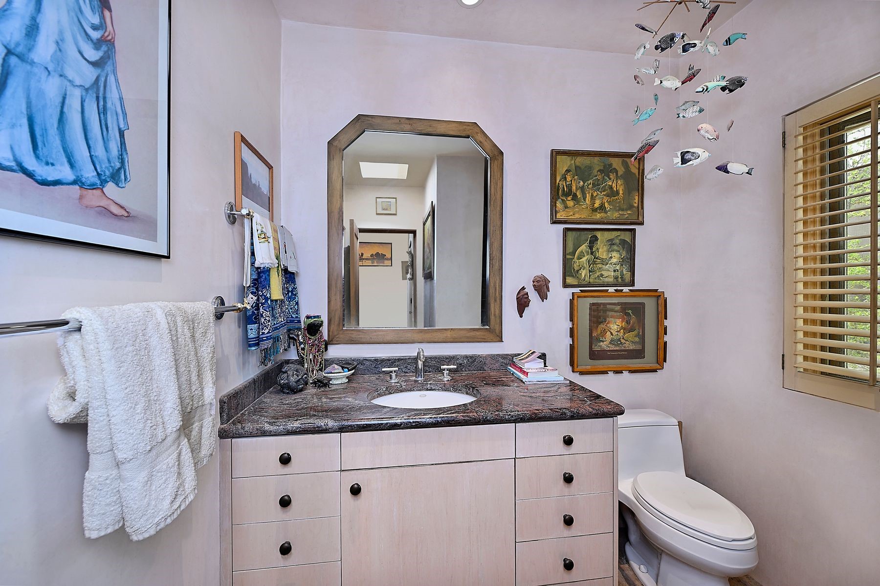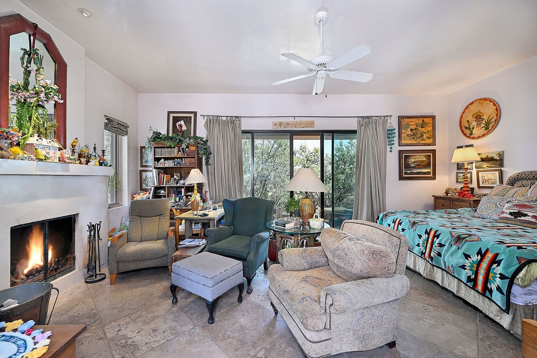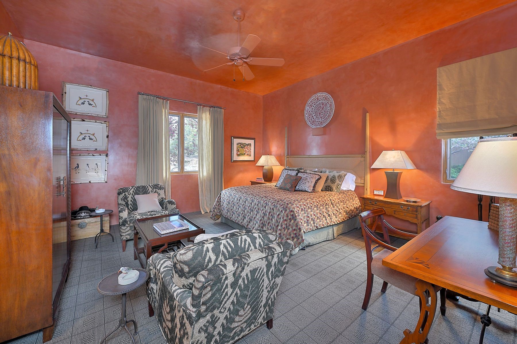 In the rugged reaches of exclusive Las Campanas this secluded estate--a sophisticated home and guesthouse--was custom-designed and -built amid blossoming trees, aspens, and stalwart evergreens. The residence is a bastion of color and volume featuring three luxuriously restful bedroom suites, formal living and dining rooms, a vast cook's kitchen with a wet bar and a family room, an inviting guesthouse with a full kitchen and bath, and painstakingly landscaped grounds. Vibrantly colored polished plaster walls combine with soaring ceilings, wide windows, multiple fireplaces, a collection of portales, a roof deck, and a swimming pool shaded by a pergola to create an ideal setting for grand entertaining, a haven crafted for the appreciation of the outdoors, and the perfect venue for the display of art. Surrounding the home are natural greenery, carefully chosen landscaping, sculpture gardens, water features, and a water-wise artificial turf lawn.