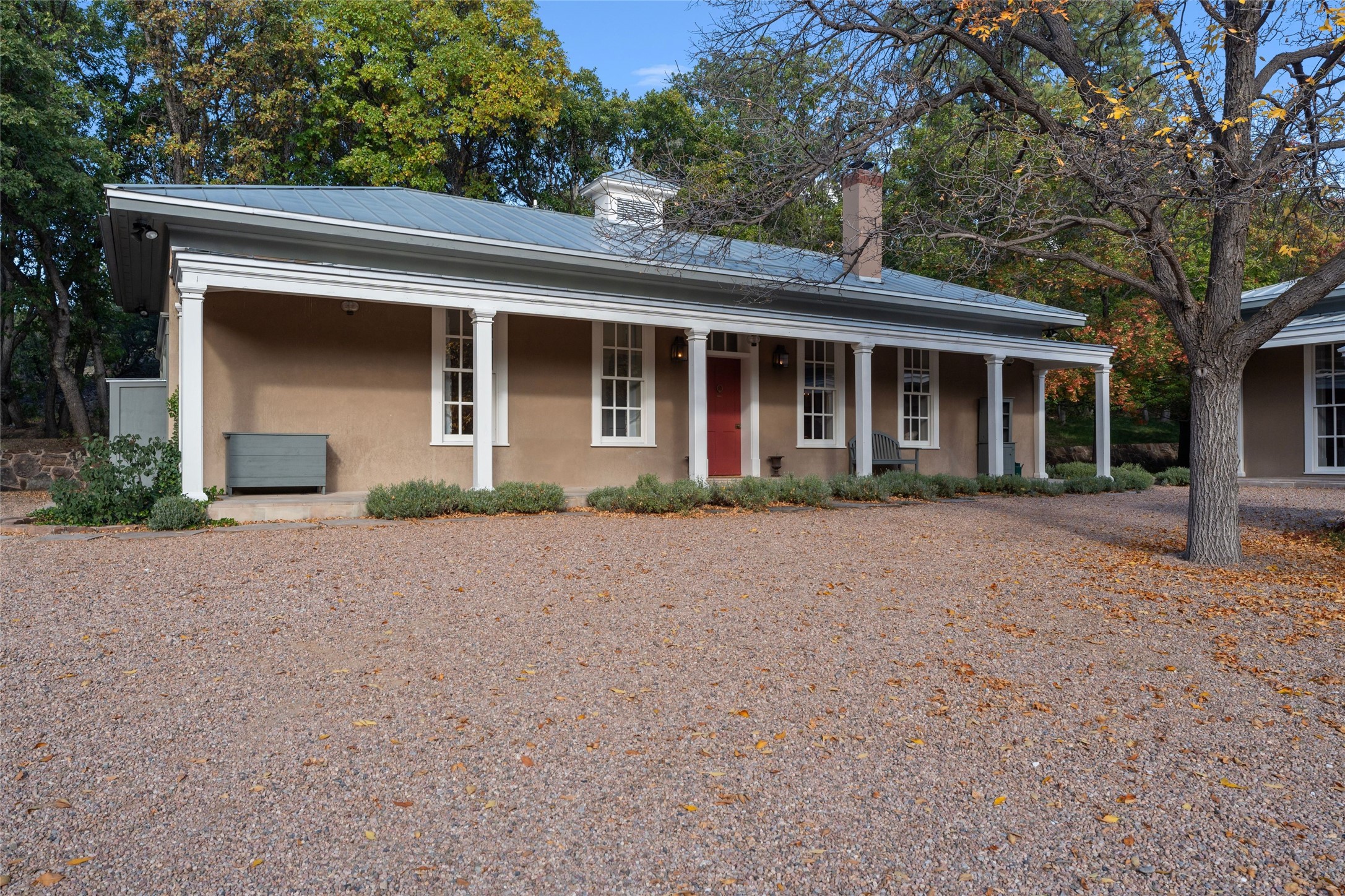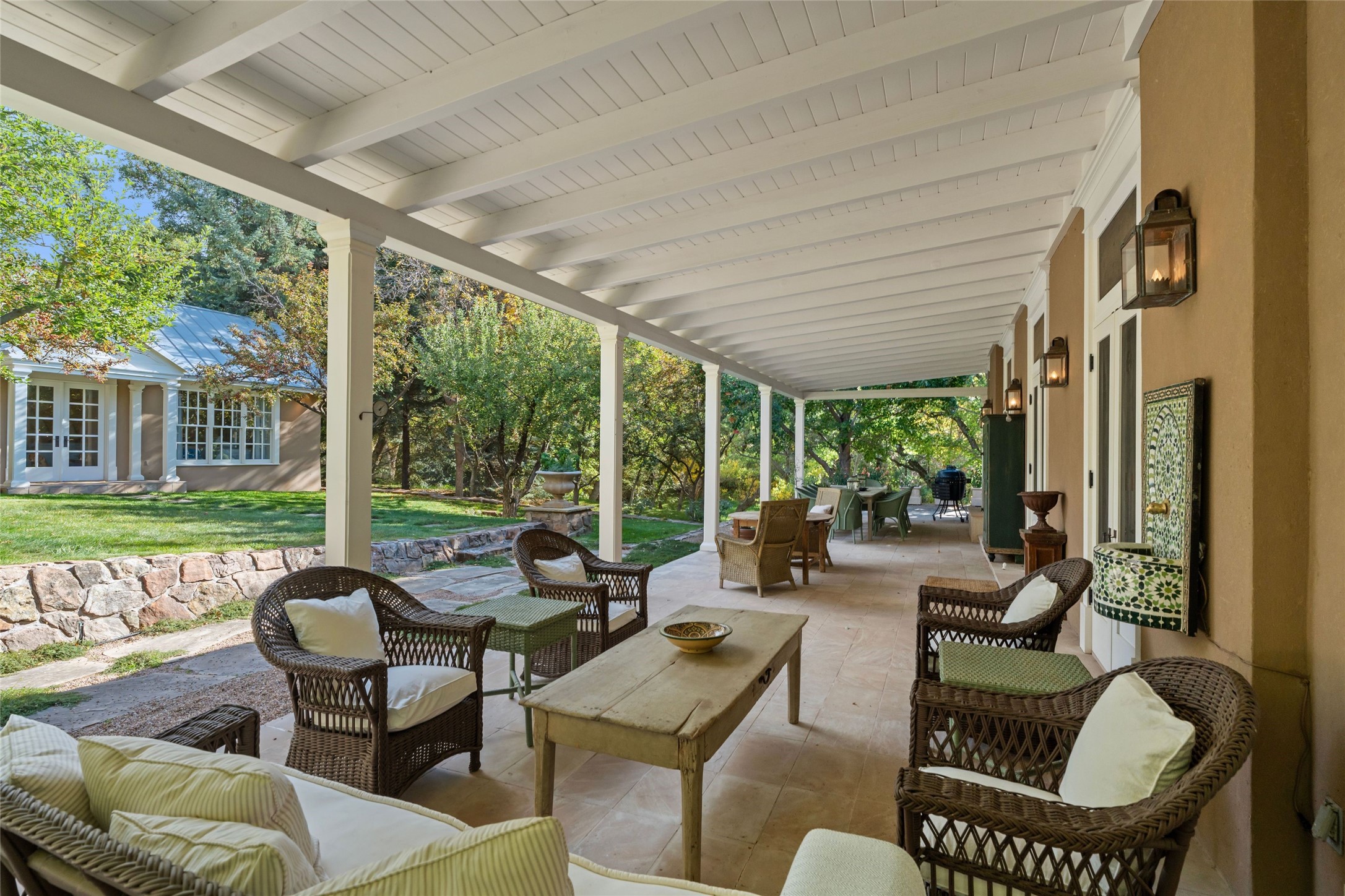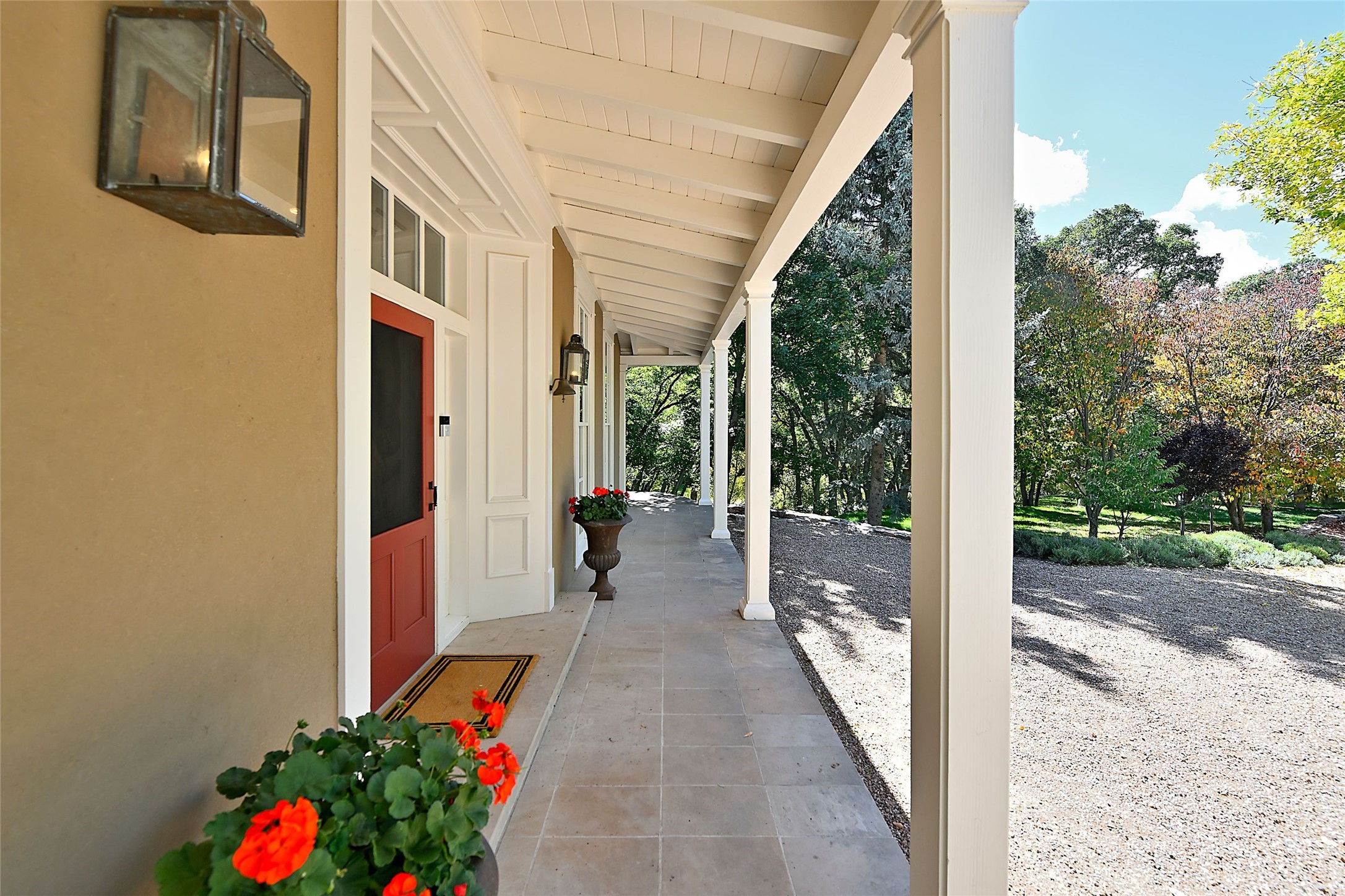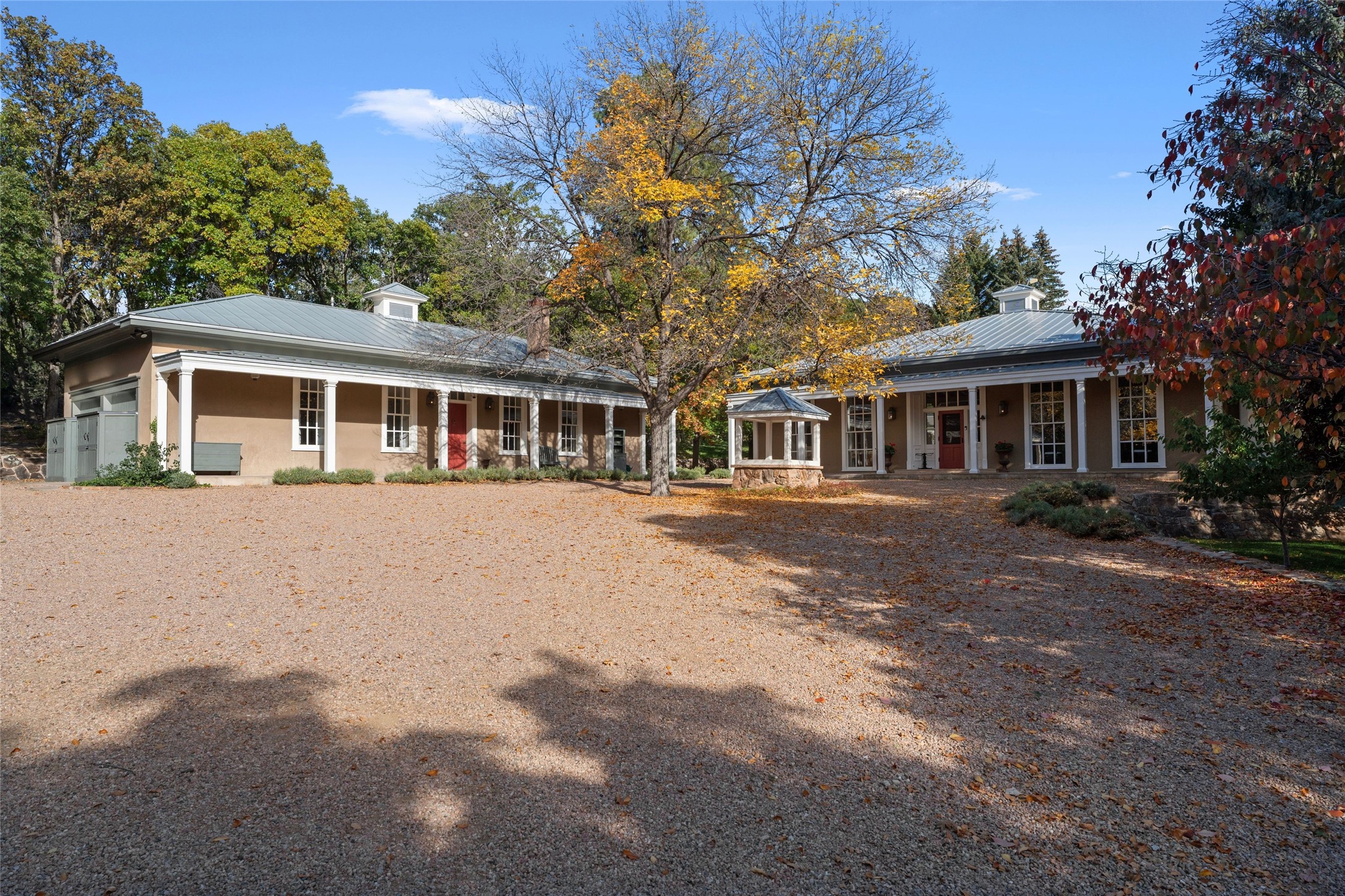 Nestled 3.5 miles past the Four Seasons Resort, and set on 25 acres along the Rio en Medio, this double adobe Territorial estate includes a main house and two guesthouses with five bedrooms in total, surrounded by orchards, meadows, and protected land stretching far beyond the property's boundaries. With 20+ acre feet of water rights, the estate sustains lush grounds, a swimming pond with stone decking, and an organic orchard. The main house features a chef's kitchen with two Sub-Zero refrigerators and a La Cornue range, plus seven fireplaces and floor-to-ceiling windows blending Southern detailing with Territorial design. The first guesthouse offers three bedrooms with its own kitchen and living room, while the second is an open-plan suite with a redwood portal and sunken hot tub overlooking the wildflower meadow. Amenities include commercial-grade irrigation and solar systems, a 6+ car garage, gated fencing, and a second private entrance. With a dedicated access road, with ample water rights, and 4 separately deeded parcels, the property presents appealing possibilities for future expansion or additional structures, subject to buyer verification.
