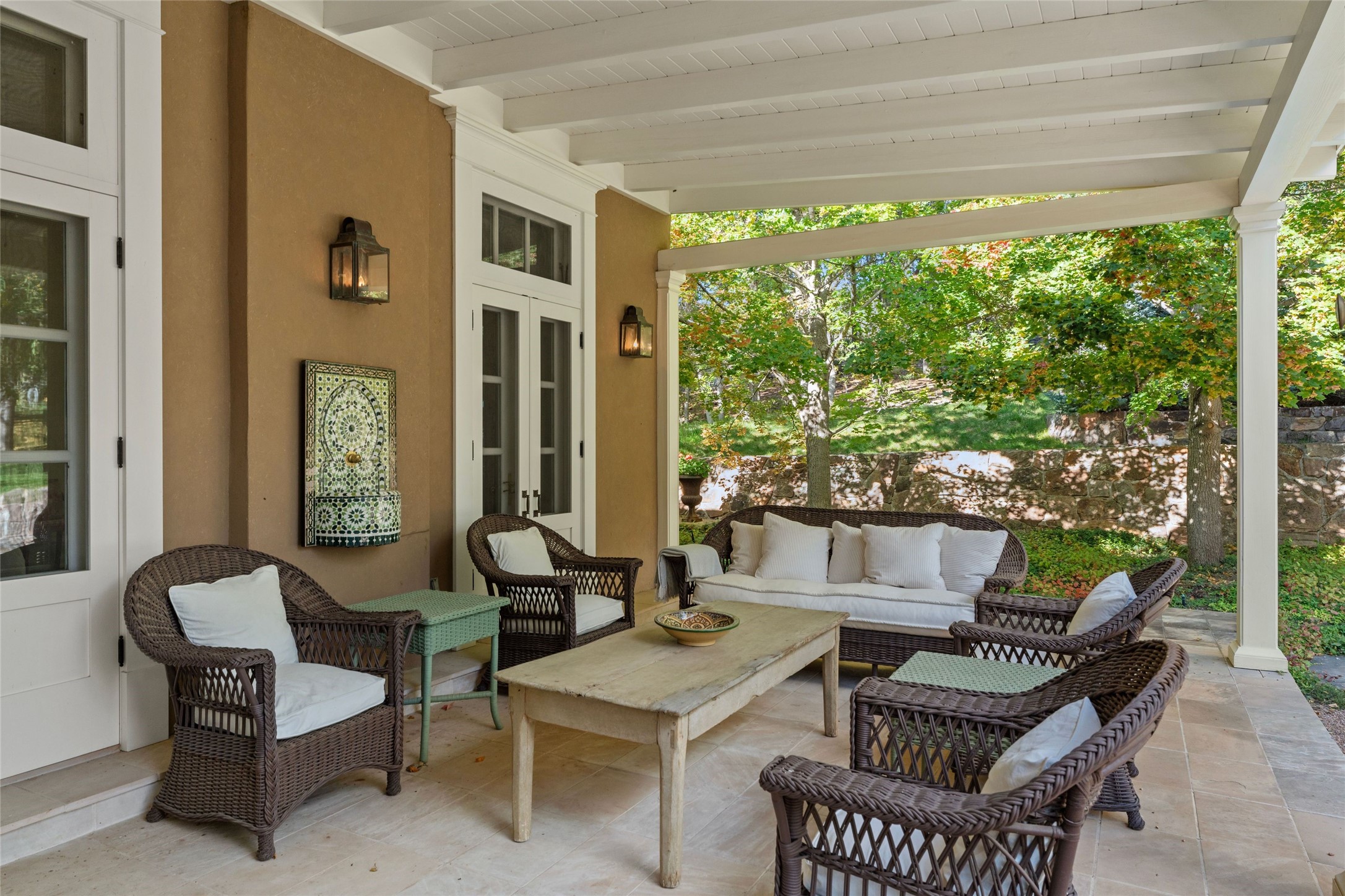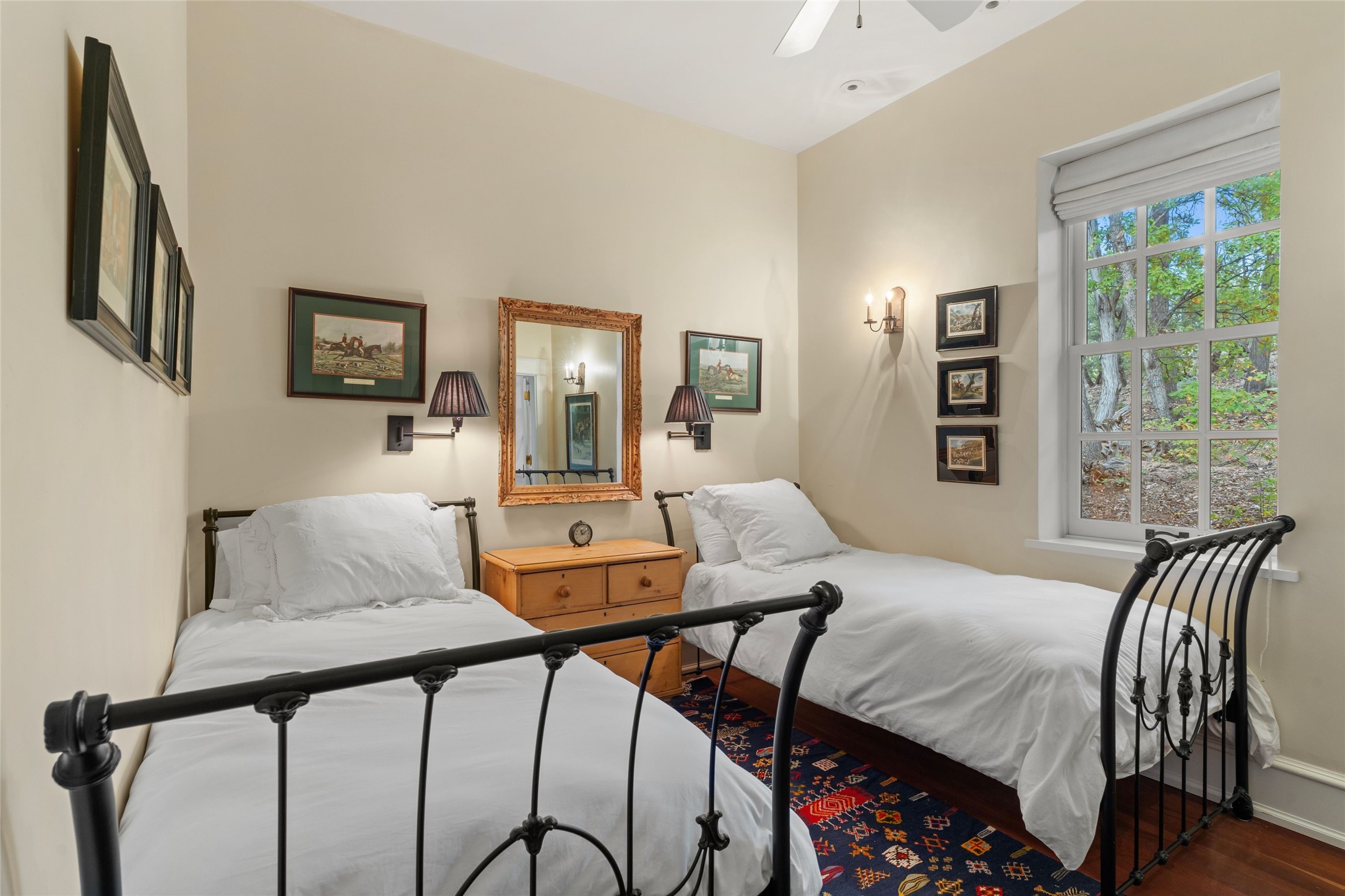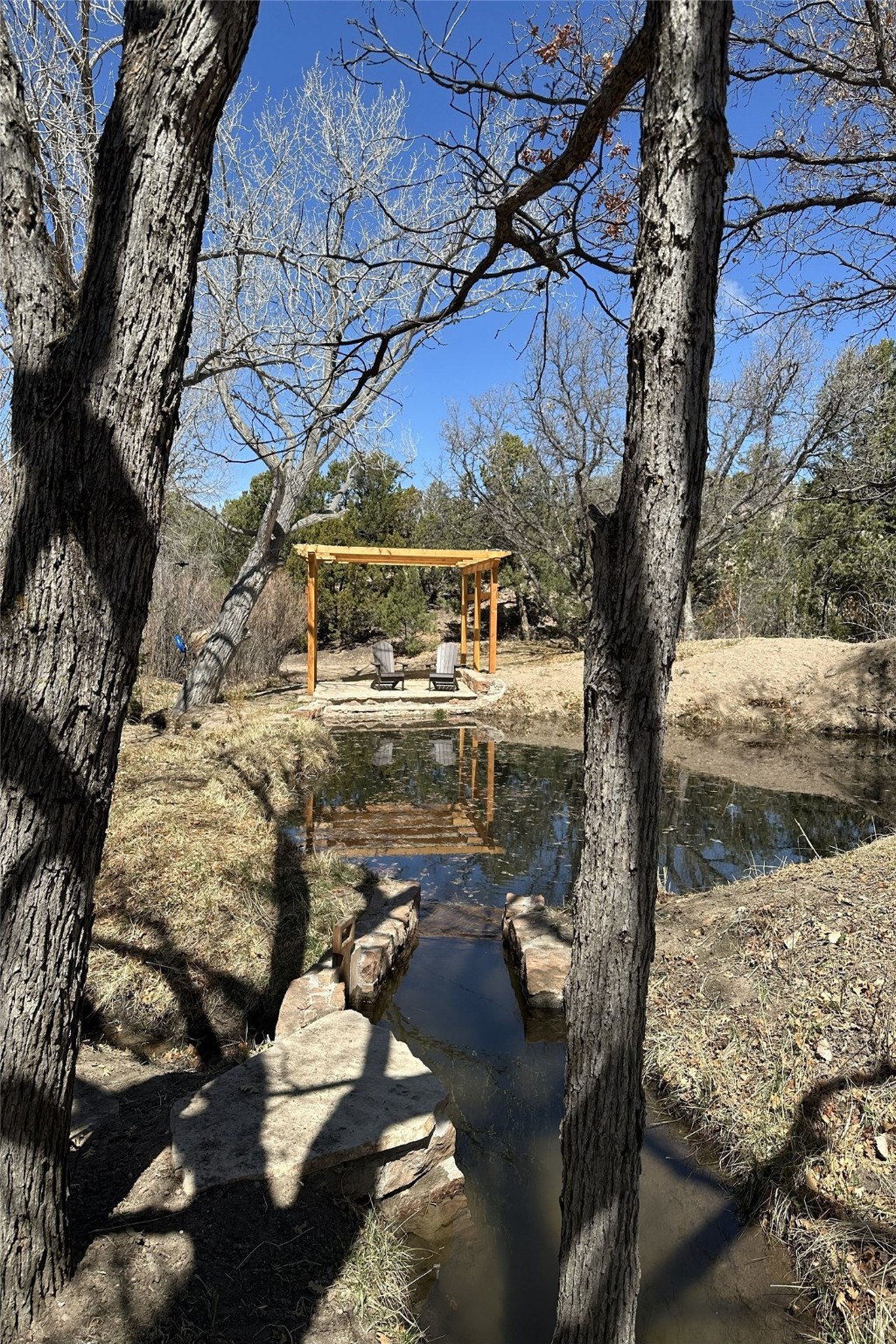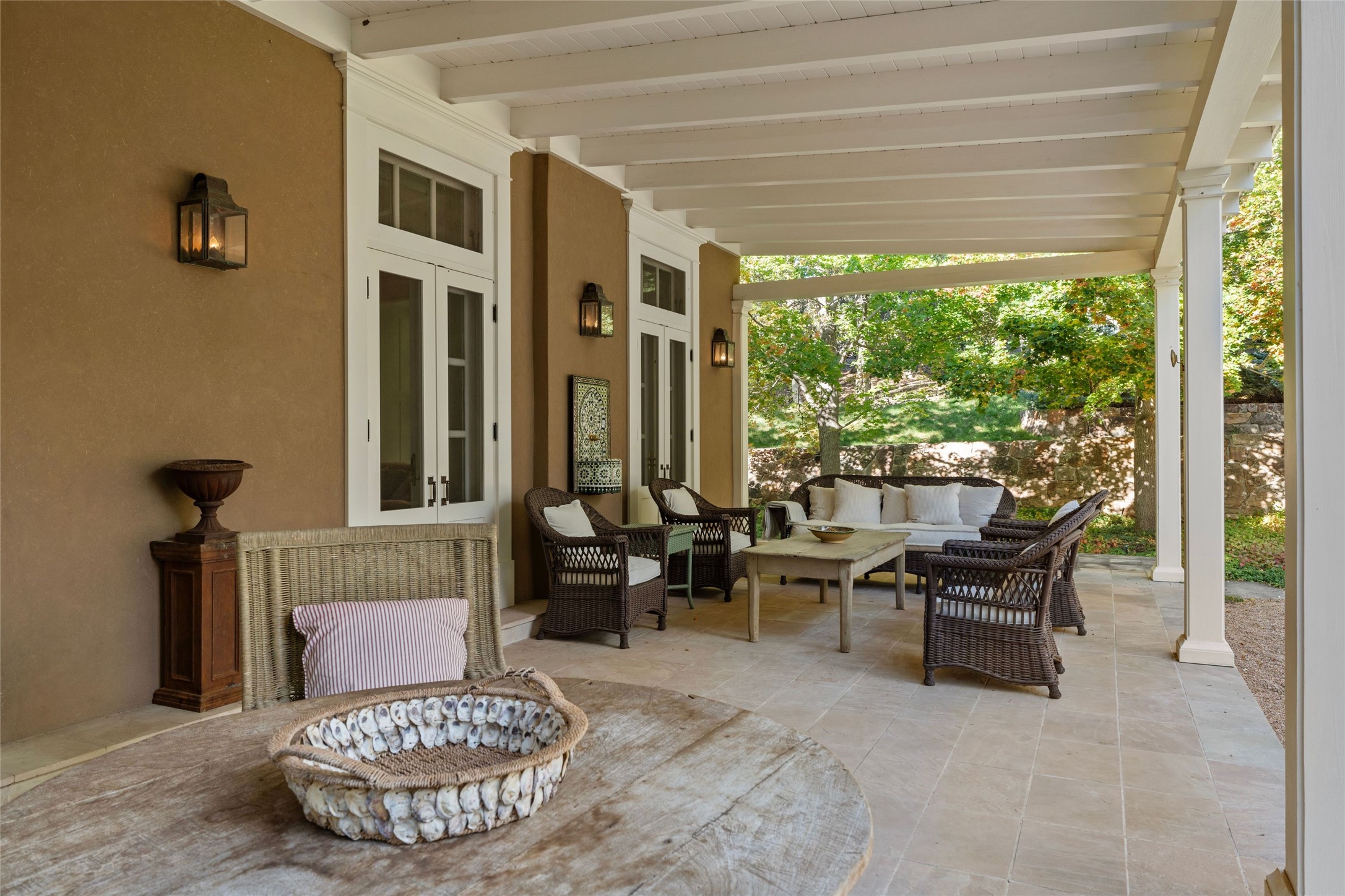 Nestled 3.5 miles past the Four Seasons Resort, and set on 25 acres along the Rio en Medio, this double adobe Territorial estate includes a main house and two guesthouses with five bedrooms in total, surrounded by orchards, meadows, and protected land stretching far beyond the property's boundaries. With 20+ acre feet of water rights, the estate sustains lush grounds, a swimming pond with stone decking, and an organic orchard. The main house features a chef's kitchen with two Sub-Zero refrigerators and a La Cornue range, plus seven fireplaces and floor-to-ceiling windows blending Southern detailing with Territorial design. The first guesthouse offers three bedrooms with its own kitchen and living room, while the second is an open-plan suite with a redwood portal and sunken hot tub overlooking the wildflower meadow. Amenities include commercial-grade irrigation and solar systems, a 6+ car garage, gated fencing, and a second private entrance. With a dedicated access road, with ample water rights, and 4 separately deeded parcels, the property presents appealing possibilities for future expansion or additional structures, subject to buyer verification.