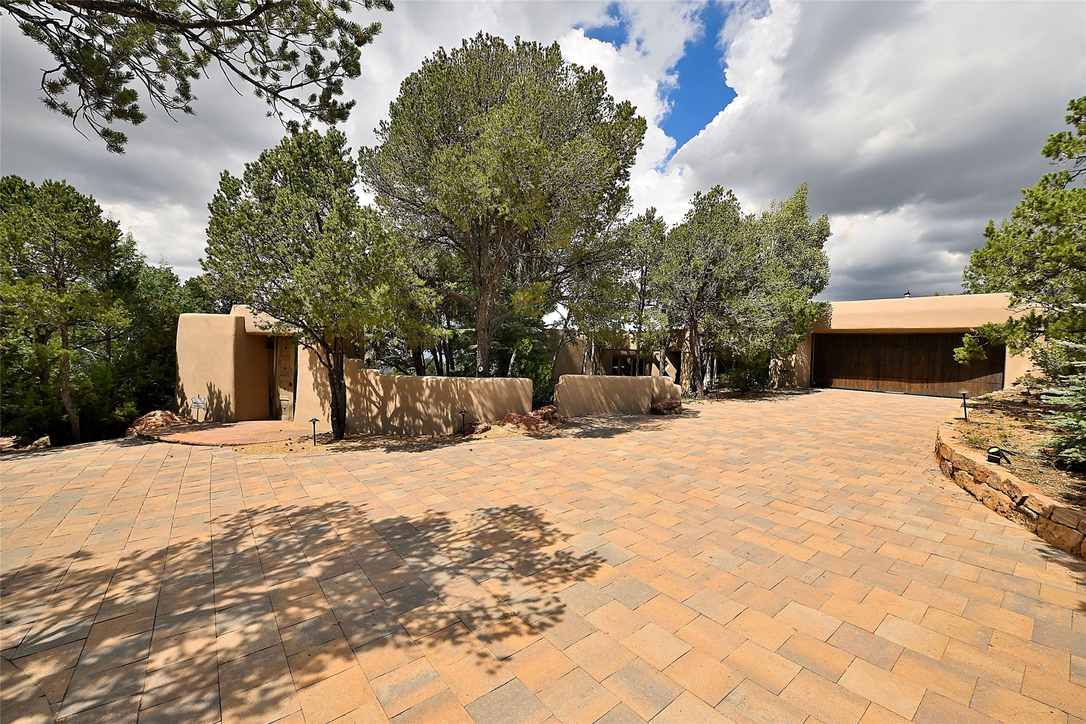 This striking 5-bedroom, 5.5-bath residence, set on 1.19 forested acres in High Summit, offers commanding views of the Jemez Mountains and Santa Fe city lights, creating a mesmerizing backdrop that transforms with the setting sun. Designed with the essence of Santa Fe style, this home includes soaring ceilings framed by rustic beams, a harmonious blend of hardwood and flagstone floors, and unique banco seating areas. Step into the grand living room, where an oversized fireplace makes a bold statement, effortlessly flowing into an elegant dining area that invites gatherings and celebrations. The outside portal calls to those who enjoy alfresco living, featuring an outdoor kiva and a hot tub that promise evenings of relaxation and stargazing. The kitchen, complete with a Wolf range and a Subzero refrigerator, seamlessly connect to a den/media room with its own kiva fireplace. The primary suite features a fireplace, sitting area that opens to the outdoor portal and a gorgeous spa-like bathroom, showcasing a soaking tub, a fireplace for those chilly evenings, and an expansive walk-in shower with double shower heads. In addition, there is a detached 2-bedroom, 2-bath guesthouse. Recent enhancements, including new pine trees and a new driveway, alongside a newer roof with a 10-year warranty. Located just minutes away from the renowned Ten Thousand Waves Spa, the Santa Fe Ski Basin, Dale Ball Trails, and the downtown Plaza