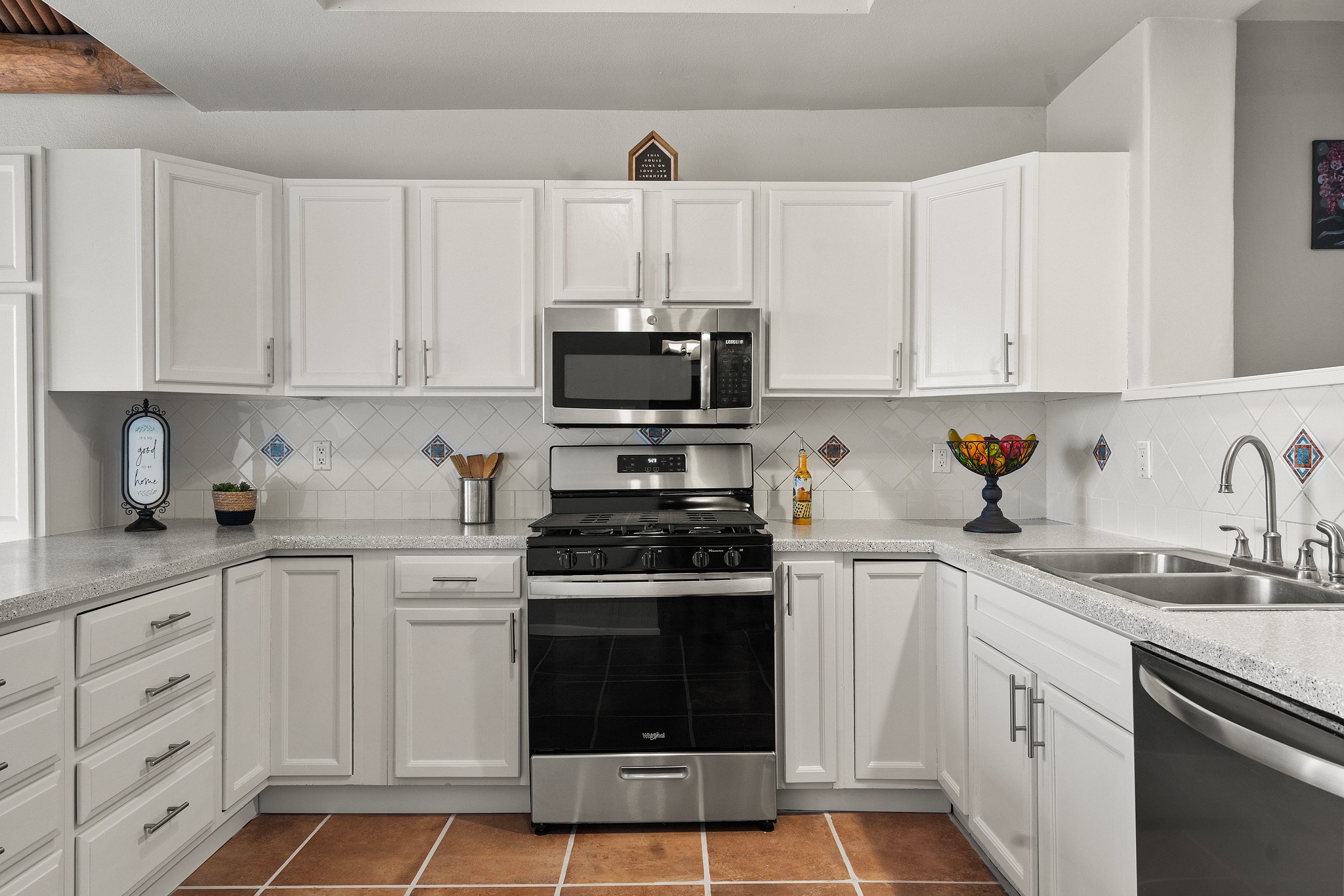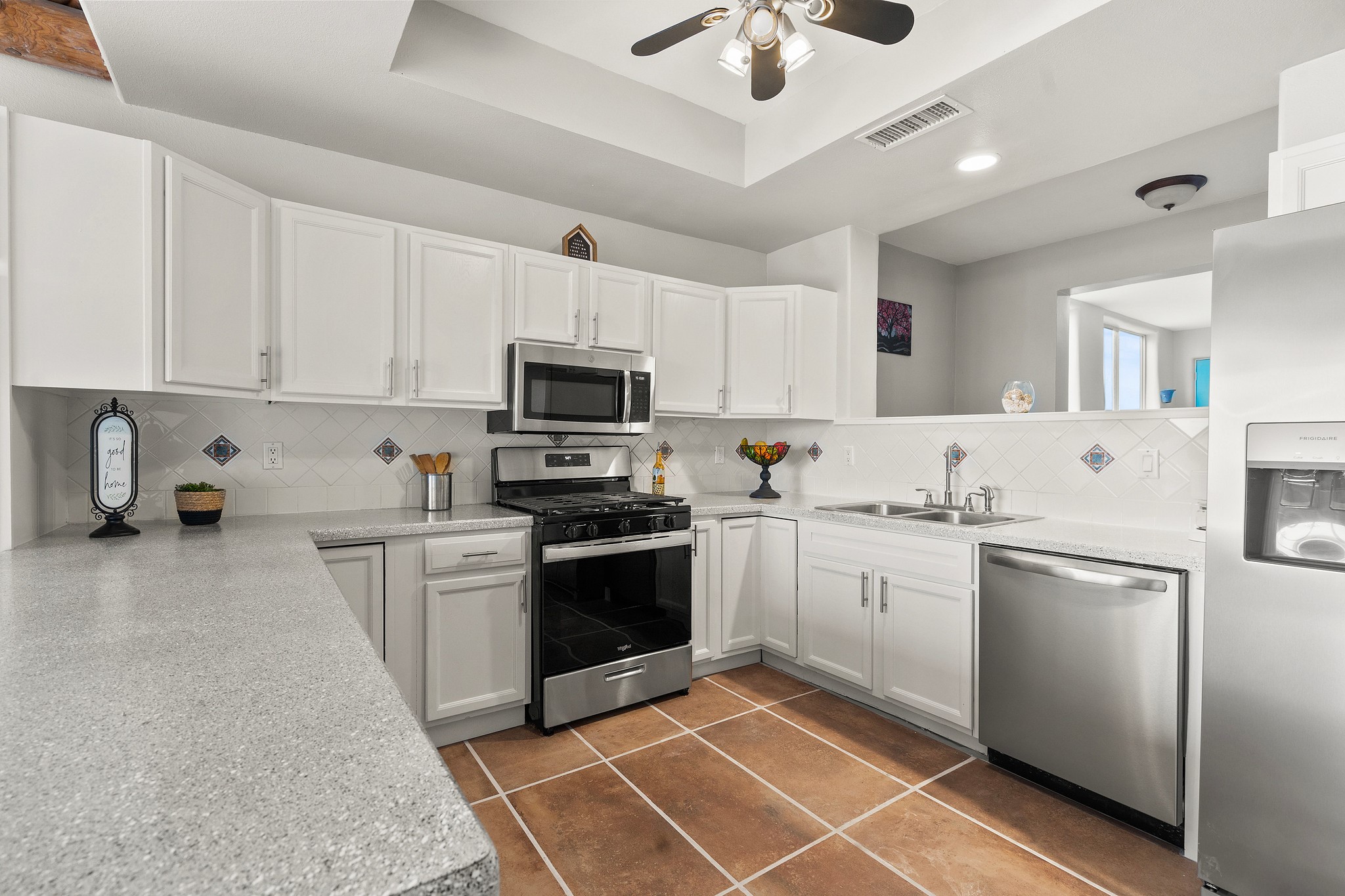 Extensively updated multi level townhome that is move in ready and on an end lot! 100K worth of upgrades. Exterior features a new roof, new stucco, and new swamp cooler, and a new furnace. Inside: fresh paint, new carpet, new tile in kitchen & primary bath, updated kitchen, and new appliances. The garage features a new insulated door, epoxy floor, and fresh paint. Bathrooms have new toilets, shower fixtures, and upgraded shower door. Bright, open spaces with great natural lighting, show casing vigas, and a cozy Kiva fireplace. The spacious primary bedroom offers a walkout balcony with stunning views. Minutes from Cochiti golf course and Cochiti lake, with breathtaking skies and scenic views all around! Don't miss out on this spectacular home! Washer/dryer and pool table included.