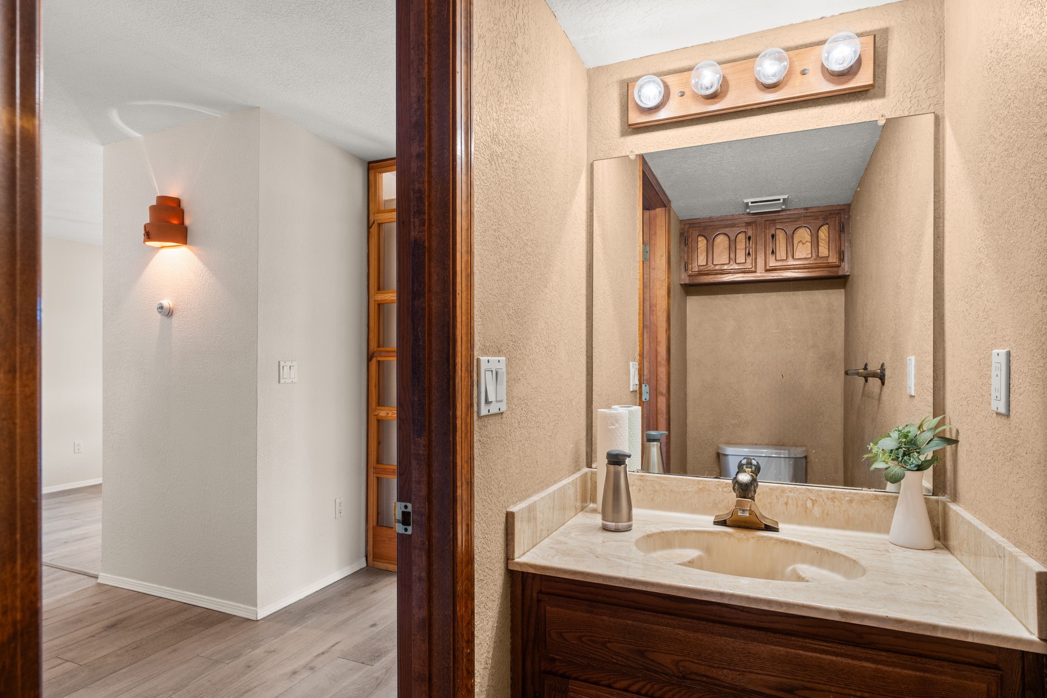 Well loved two story home with an in ground pool 40*18 in Length and 4ft-8ft depth. Updated, new floors, spacious living areas quality living, defined yet open rooms that access the outside pool/ patio area. Large study with built in's, half bath, all on main floor. Upstairs newly carpeted with two large bedrooms, hall bath, primary bedroom with Sandia Mountains views welcoming you every morning. Access to east deck. Fabulous! Situated on a private cul de sac. Green house to enjoy all year long, and dual CFA unit for the second level with Refrigerated air. A wonderful place to call home.