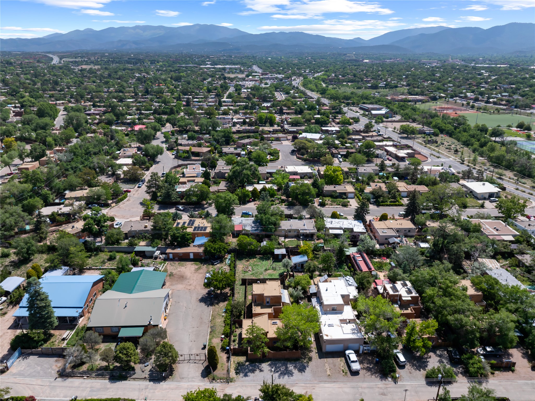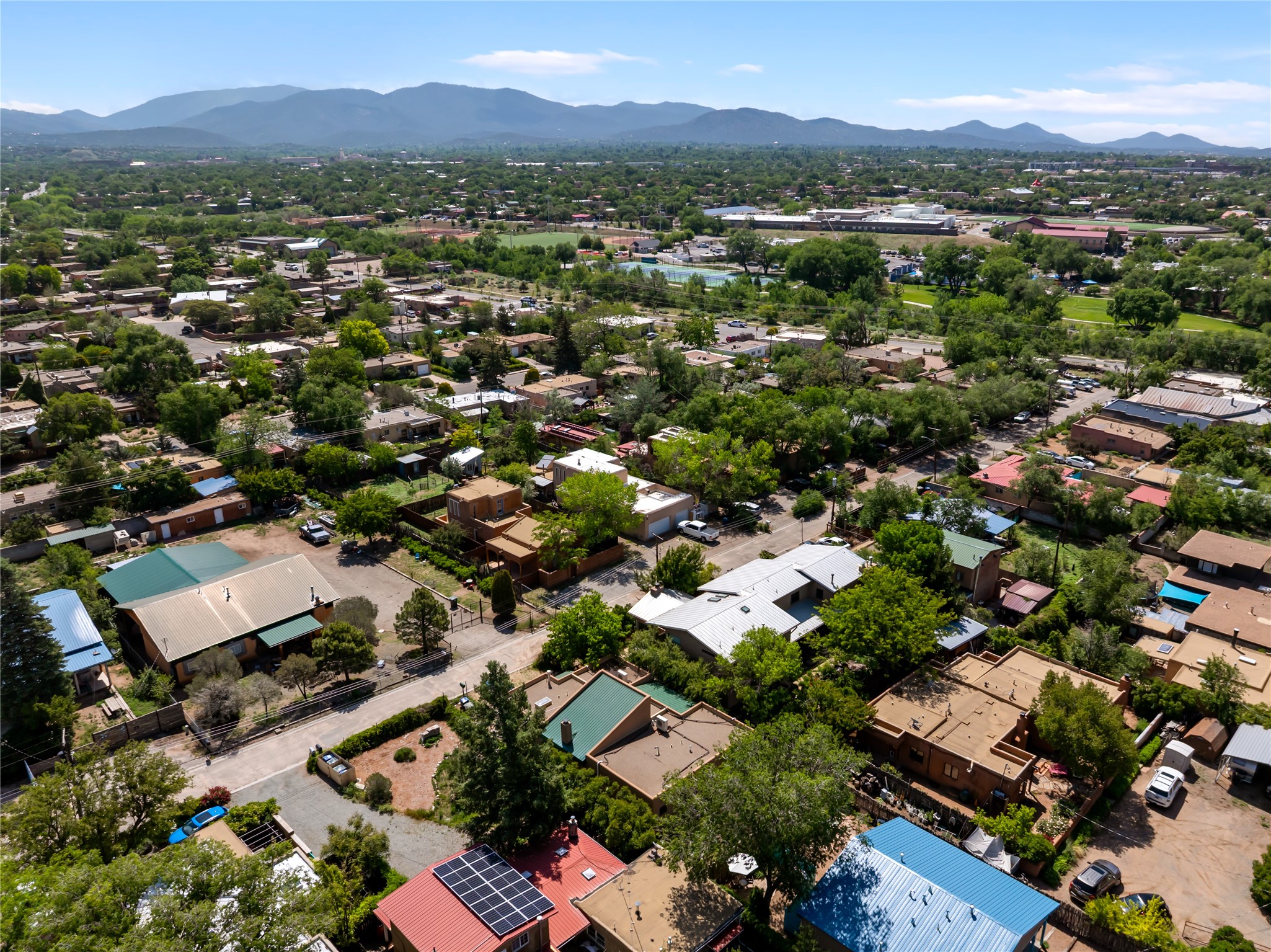 Located only 1.8 miles from the Santa Fe Plaza, this 4-bedroom house and guest house offers both privacy and convenience on a generous lot with future building potential. At the end of a quiet dead-end lane, the home enjoys direct access to beloved community amenities, including Frank Ortiz Dog Park, the Santa Fe River Trail, and Alto Park with its pool and tennis courts. The main residence features authentic adobe construction on the ground floor and custom design details including vigas, handcrafted solid-wood cabinetry, striking sunrises over the Sangre De Cristo Moutnains and sunset views from a private deck.A separate passive-solar adobe casita enhances the property's versatility, ideal for guests, extended family, or a private studio; it includes a gas fireplace, cast-iron soaking tub, tile flooring, clerestory windows, sleeping loft, and its own fenced yard. A gated front courtyard and ample off-street parking complete this rare offering. With its blend of traditional charm, thoughtful details and location, this home is truly a Santa Fe gem.