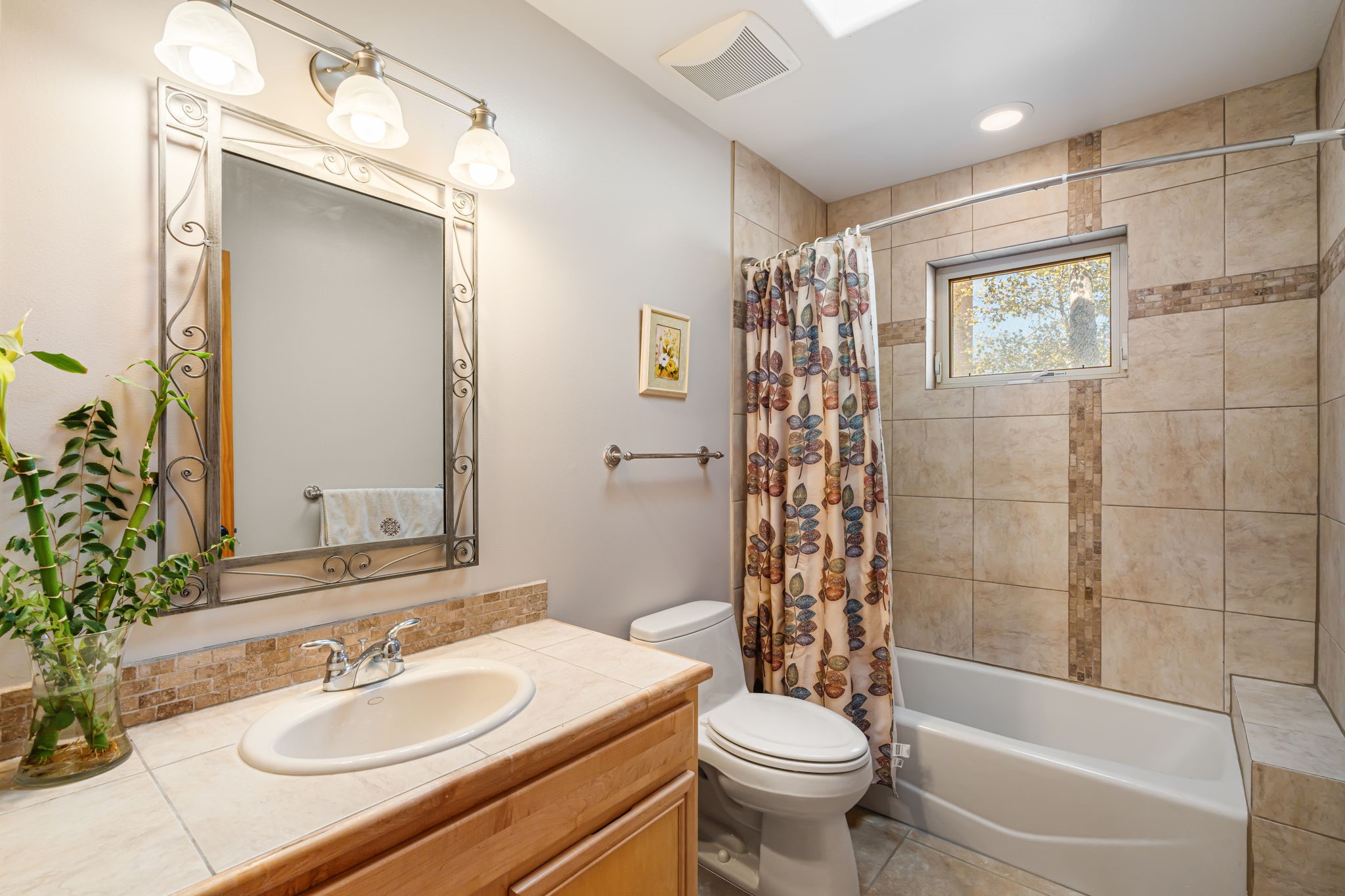 RARE OFFERING IN SPIRIT WIND RANCH! This single-level, passive-solar beauty offers long-range mountain views and privacy. Sited on 5 acres overlooking the Galisteo Basin, Sandia and Ortiz mountains. Radiant heat tubing is WIRSBO. Wonderful kitchen has Taj Mahal counters, bar with seating, two pantries, high-end stainless steel appliances and seating area. Living area has beautiful viga ceilings and wood-burning kiva fireplace. Primary bedroom has a gas fireplace and doors to rear portal. Bath has double sinks, jetted tub, separate shower and walk-in closet. Spacious office/studio space with en-suite 3/4 bath and separate entrance. Property has been pre-inspected and all repairs have been made. Inspection report available on request. Walled front courtyard is on drip with freshly painted gate. Proper laundry with sink and storage. Insulated blinds are all on a remote. Oversized and finished 2-car garage. NO KITEC. NO STEPS. Whole house water filtration - Aguasana. HOA has contract with Farrellgas for reduced rates. Septic has been inspected and lot corners are flagged.
