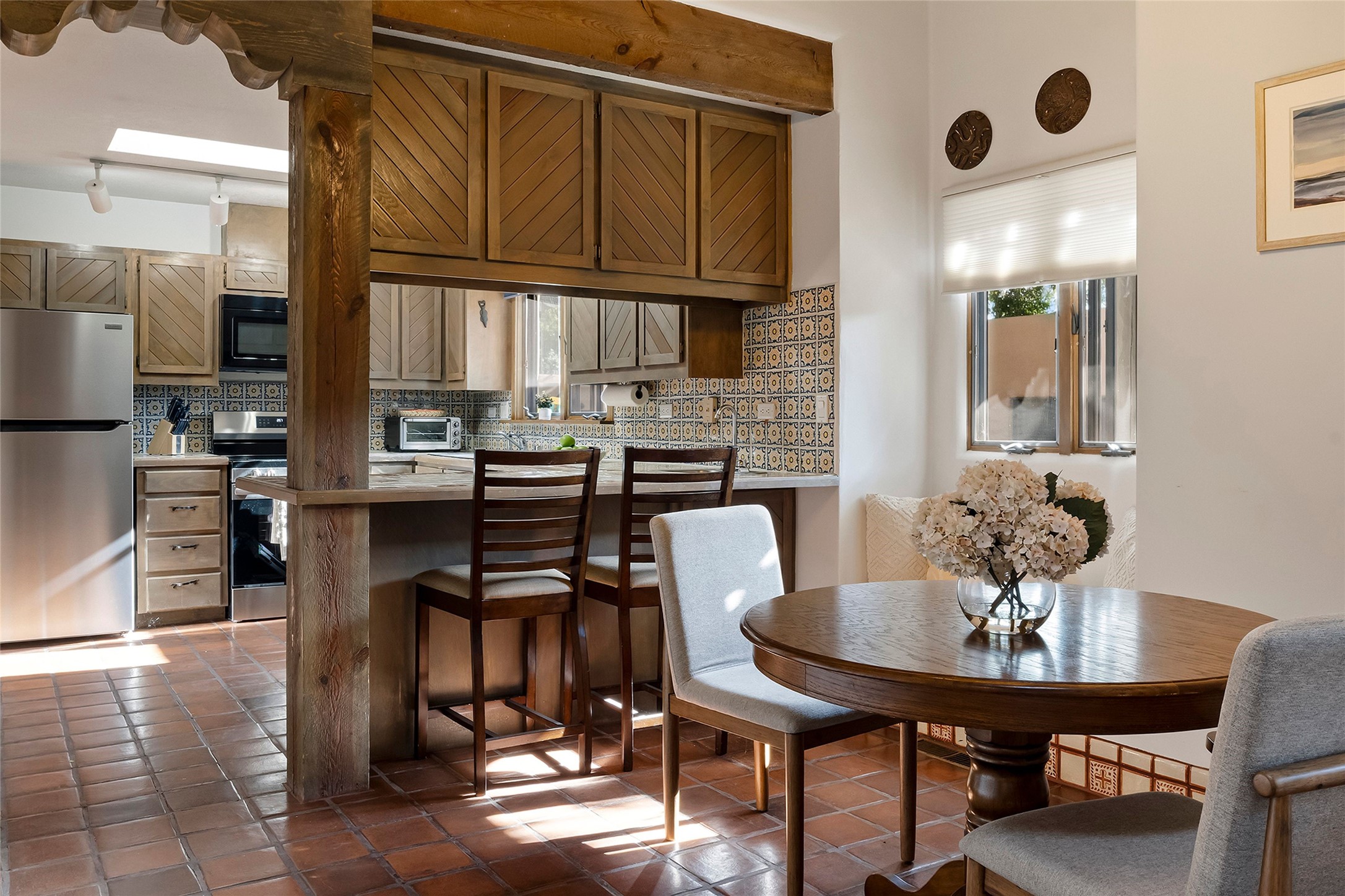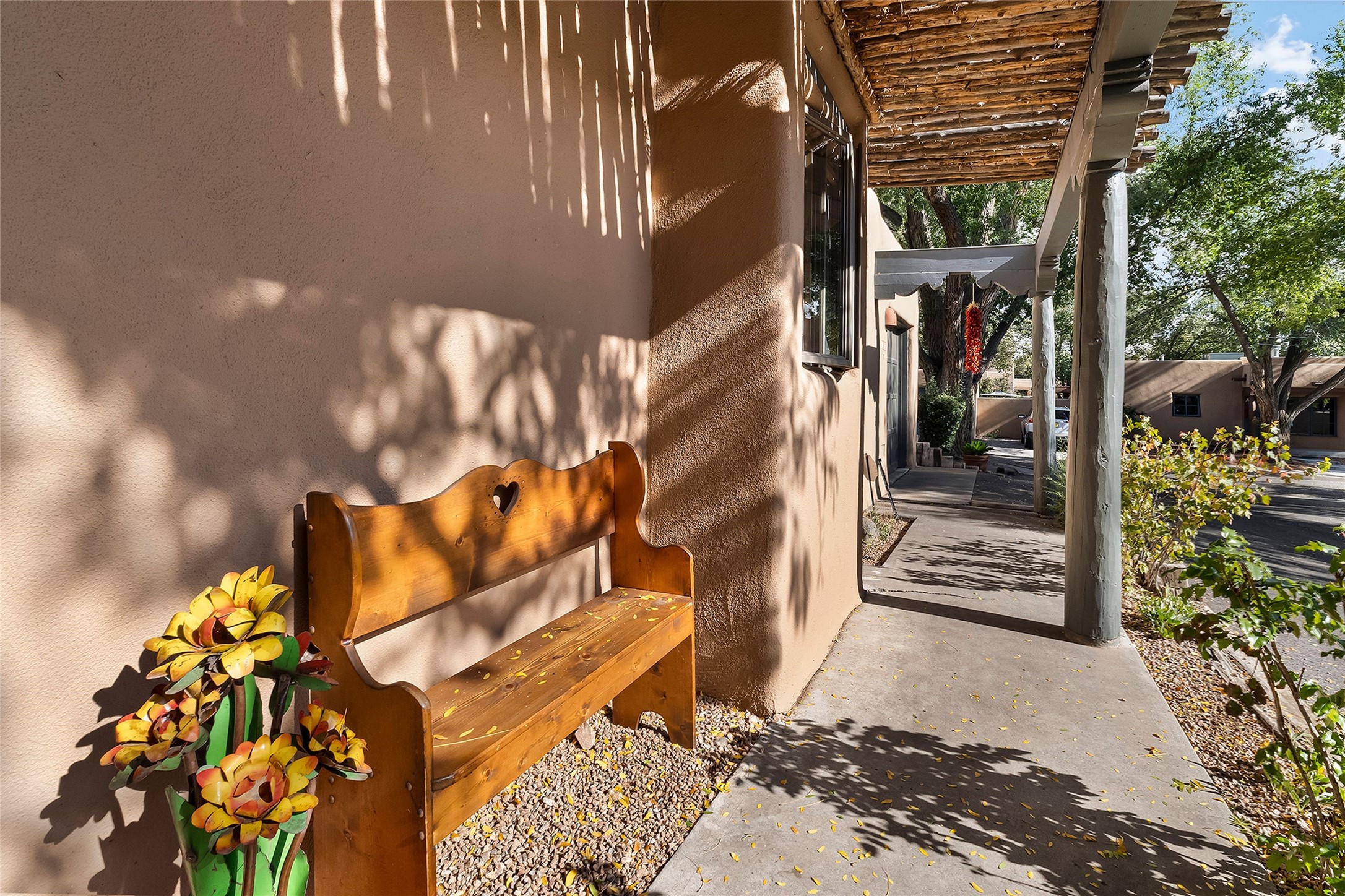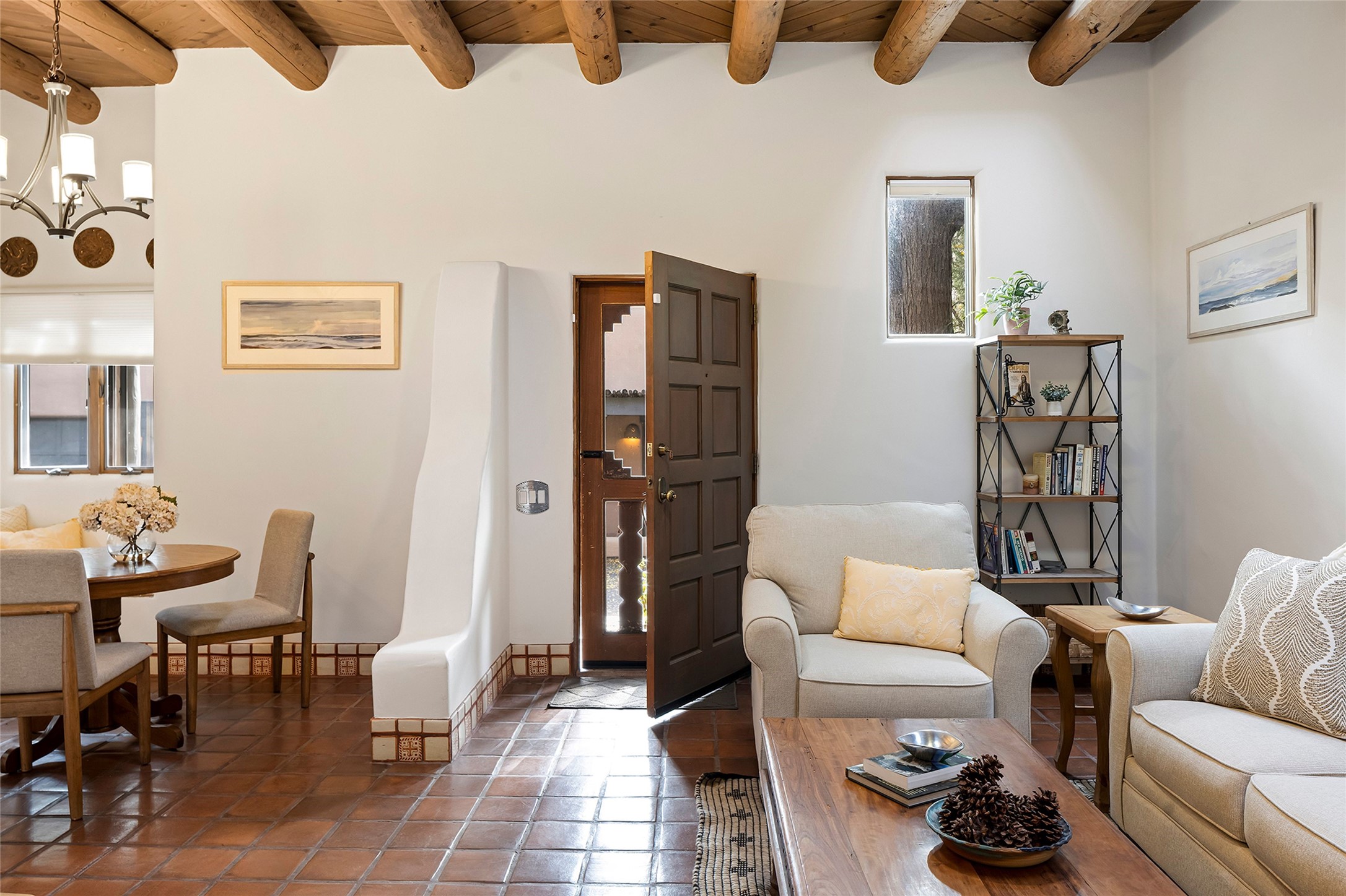 In-town Santa Fe living at its best!Rare single-level, 2-bedroom, 2-bath Santa Fe-style condo in the highly sought-after Griffin Park Condo community--just a few blocks from the Plaza. This charming home features classic Santa Fe details including a front portal with Latillas, Vigas, Saltillo tile floors and two Kiva wood burning fireplaces. In September 2025, the seller added a built in wine refrigerator and a stainless steel Frigidaire appliance package that included a stove, refrigerator and dishwasher. The kitchen has a bar seating and the pantry/laundry room connects directly to the attached single car garage for easy access and extra storage. The spacious primary suite offers a large closet and its own fireplace with French doors that open to the private courtyard under a canopy of trees. Modern comforts include central heating and air, tankless water heater and full-size washer and dryer. HOA covers water, sewer, trash, roof, stucco, and exterior landscaping. Quiet end-unit location on a peaceful street--ideal as a primary residence, pied--terre, or investment.