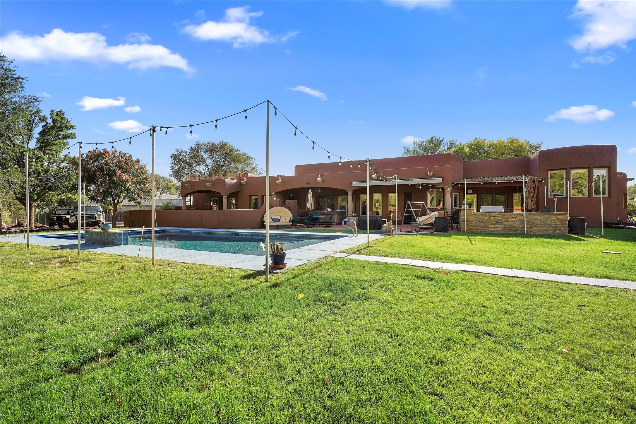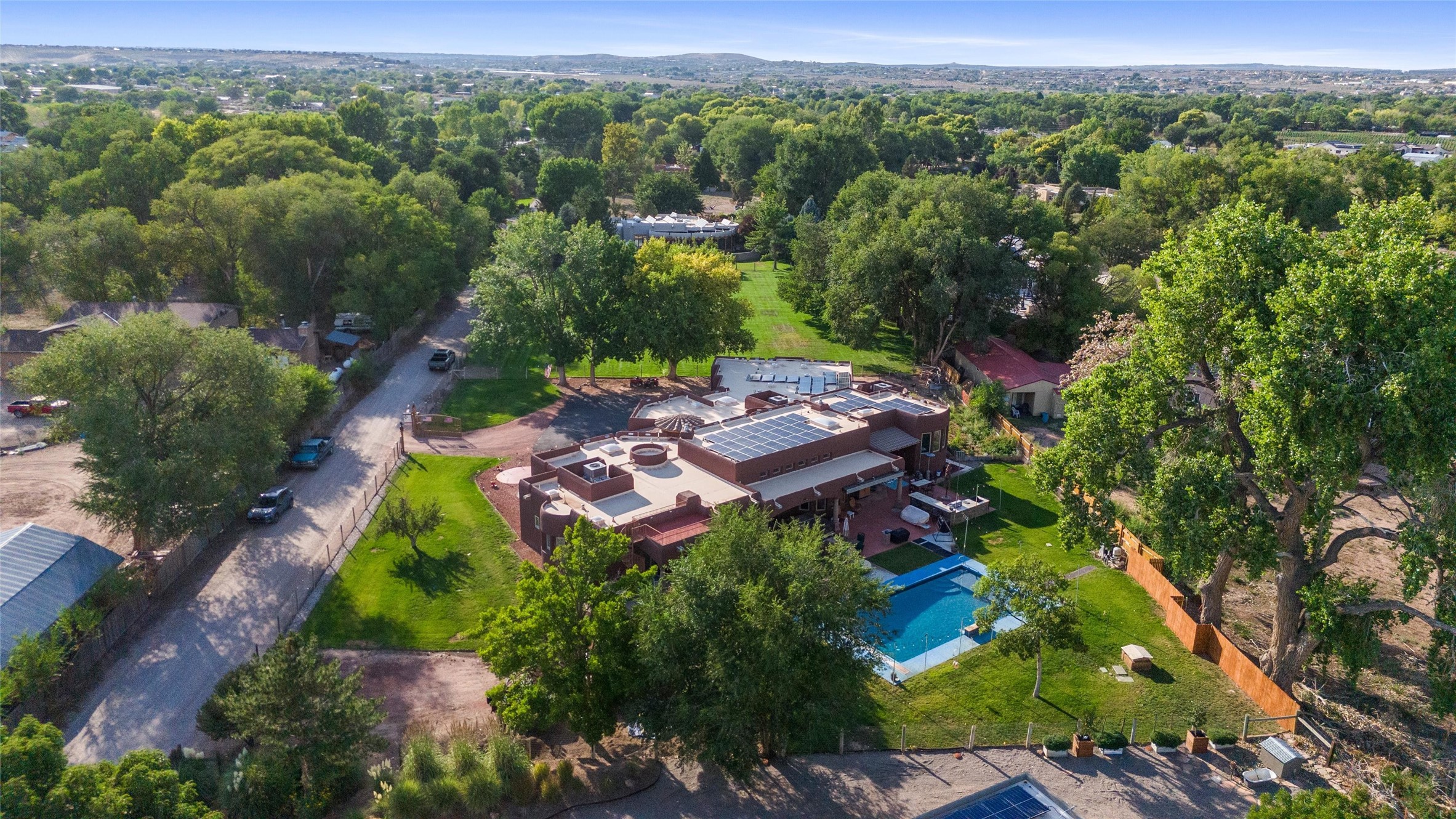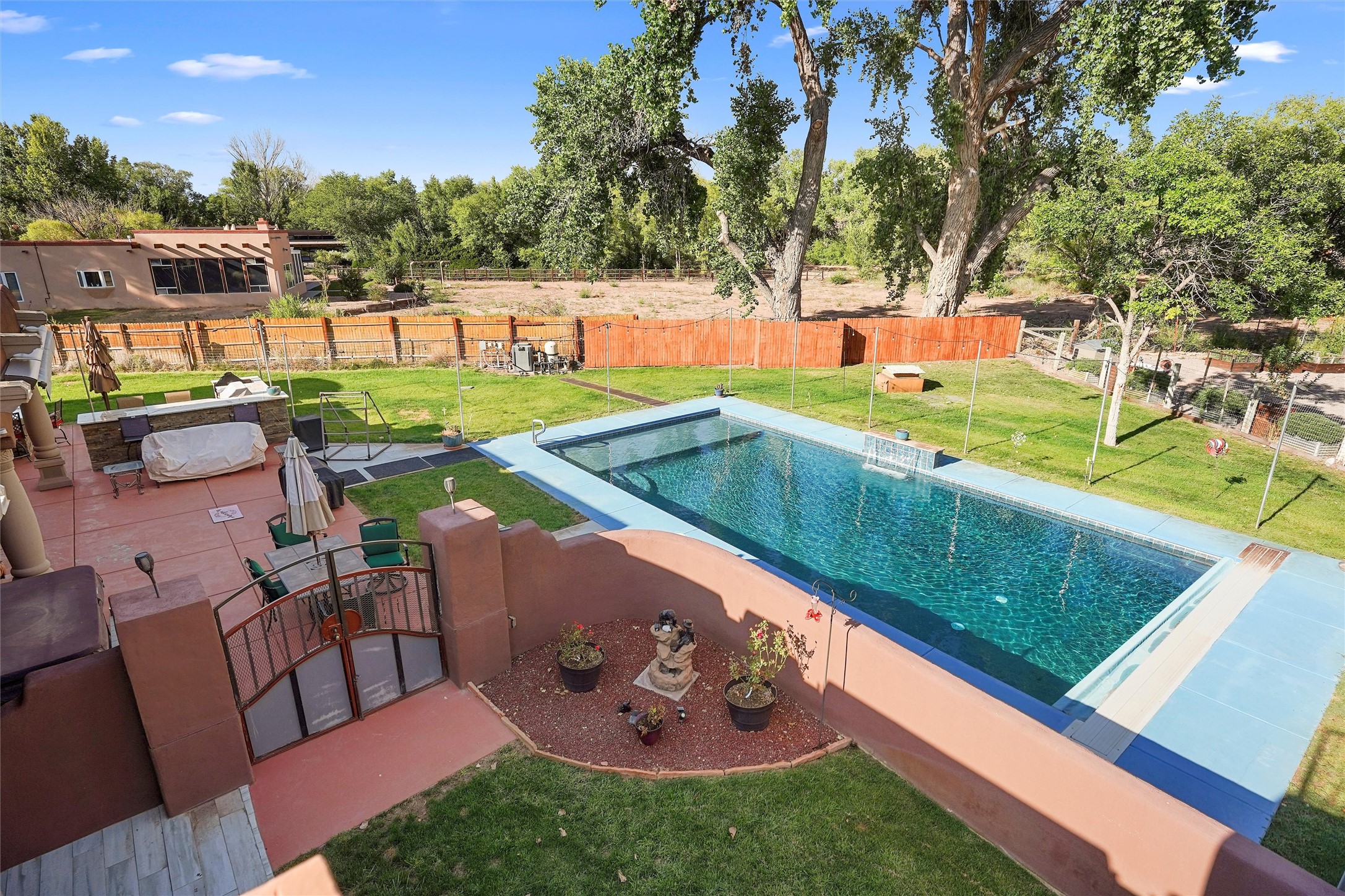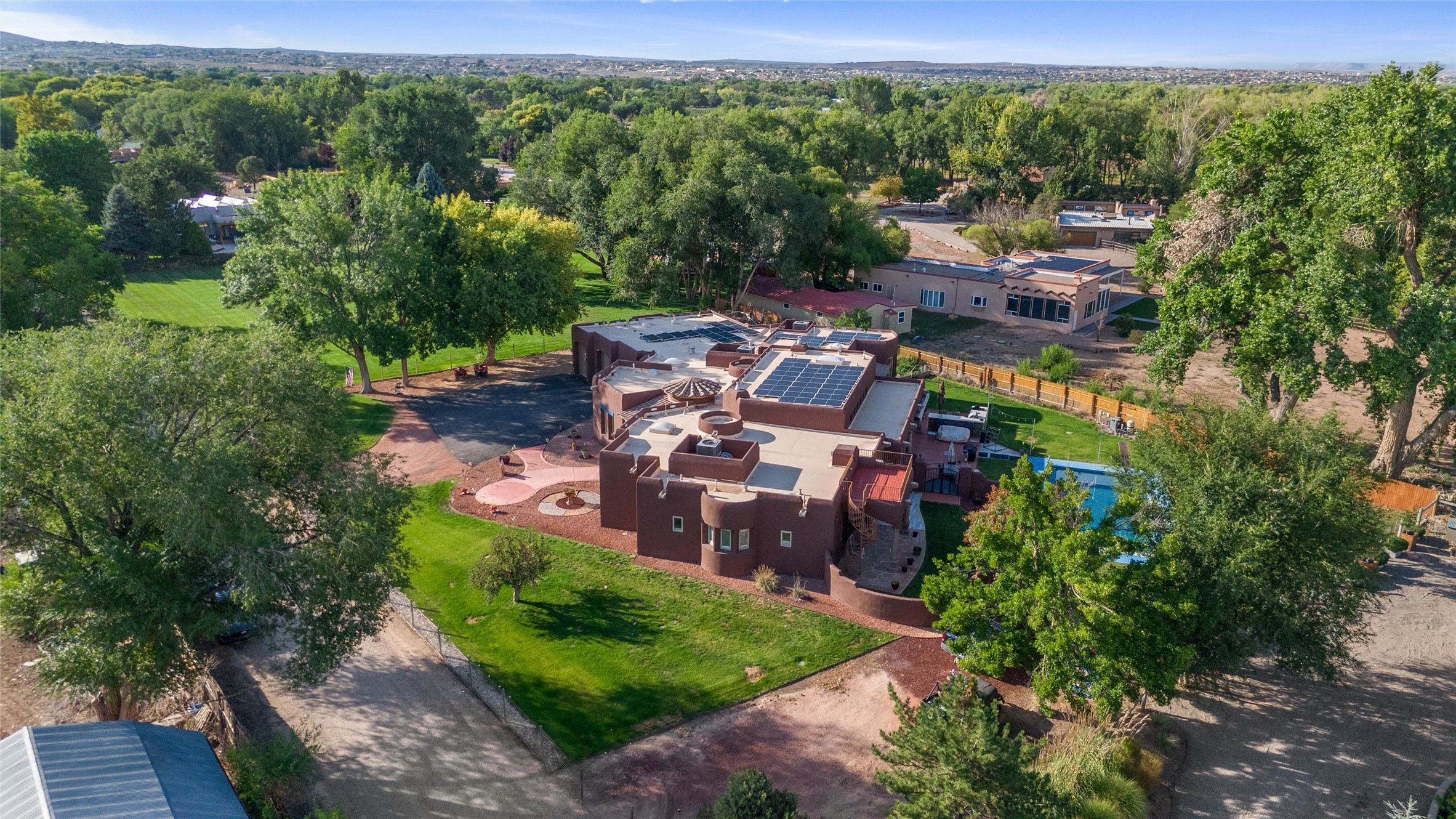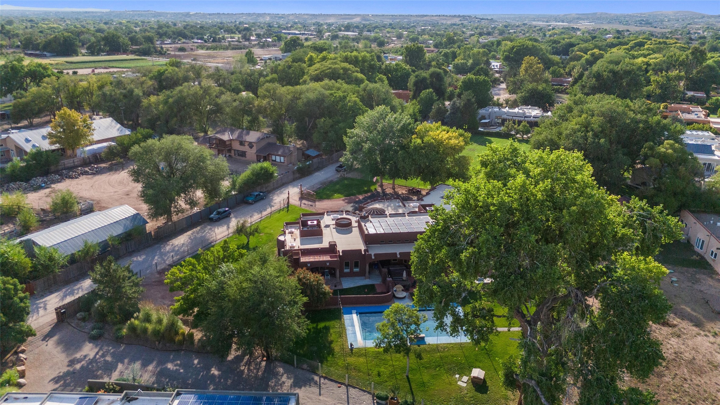 IMAGINE WAKING TO THE BOSQUE'S COTTONWOODS AT YOUR DREAM HOME! Nestled on a quiet cul-de-sac in NM's coolest village with PAID OFF SOLAR, this custom adobe exudes luxury. Sunlight streams thru clerestory windows and beam ceilings, lighting travertine floors in a vast great room with a fireplace. The gourmet kitchen boasts granite counters, prep sink, WOLF six-burner cooktop, oven, micro, and warming drawer--its huge island ideal for gatherings. A separate outdoor kitchen awaits. The master suite features a loft for an office, plus a spa-like bath with steam shower, jetted tub, and double sinks. Four beds + office and 4.5 baths ensure room for all. Pella windows frame deck views; a heated 4-car garage awaits. Dive into the inground pool or relax on an open patio. Seize the day and call!