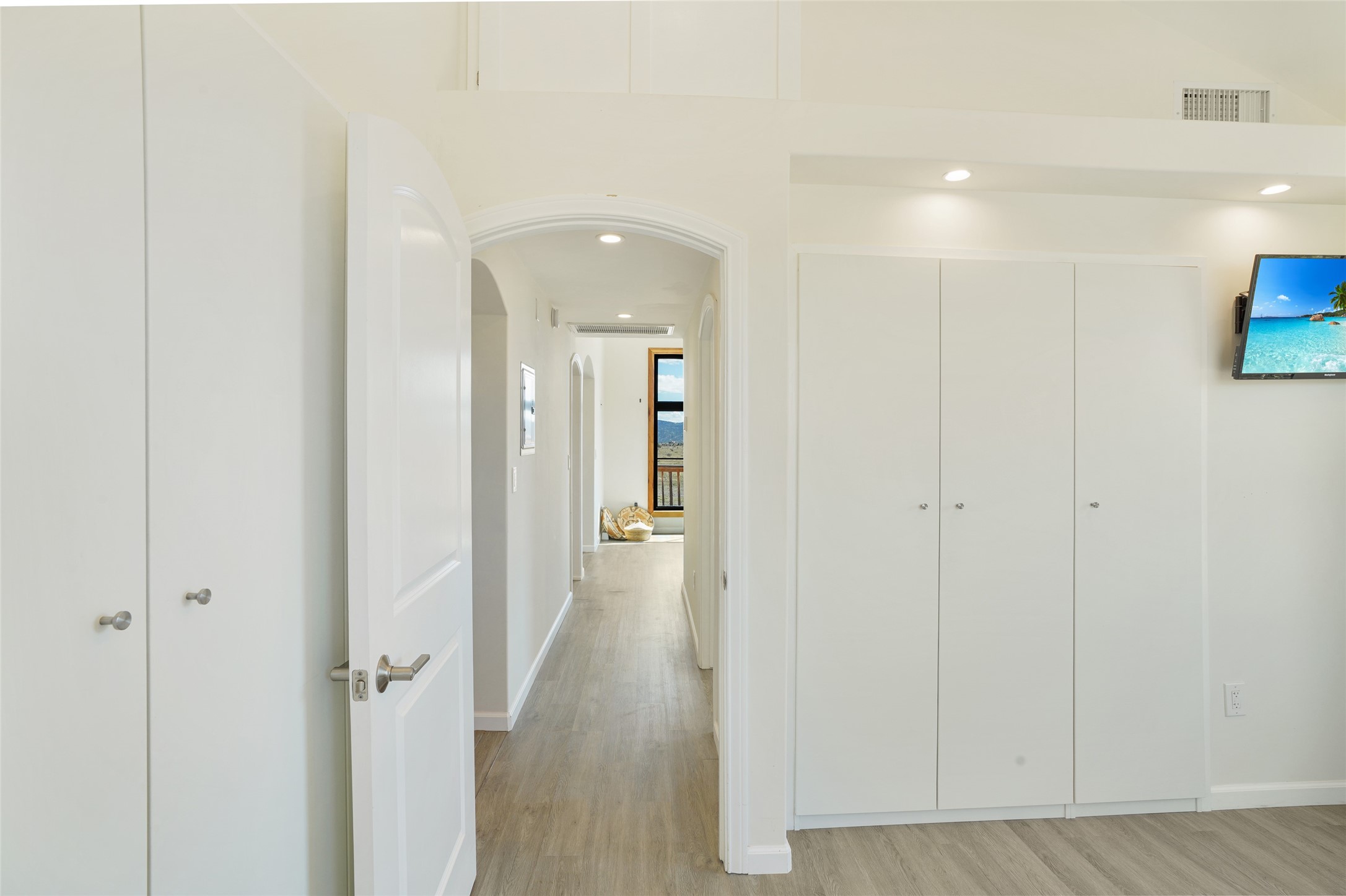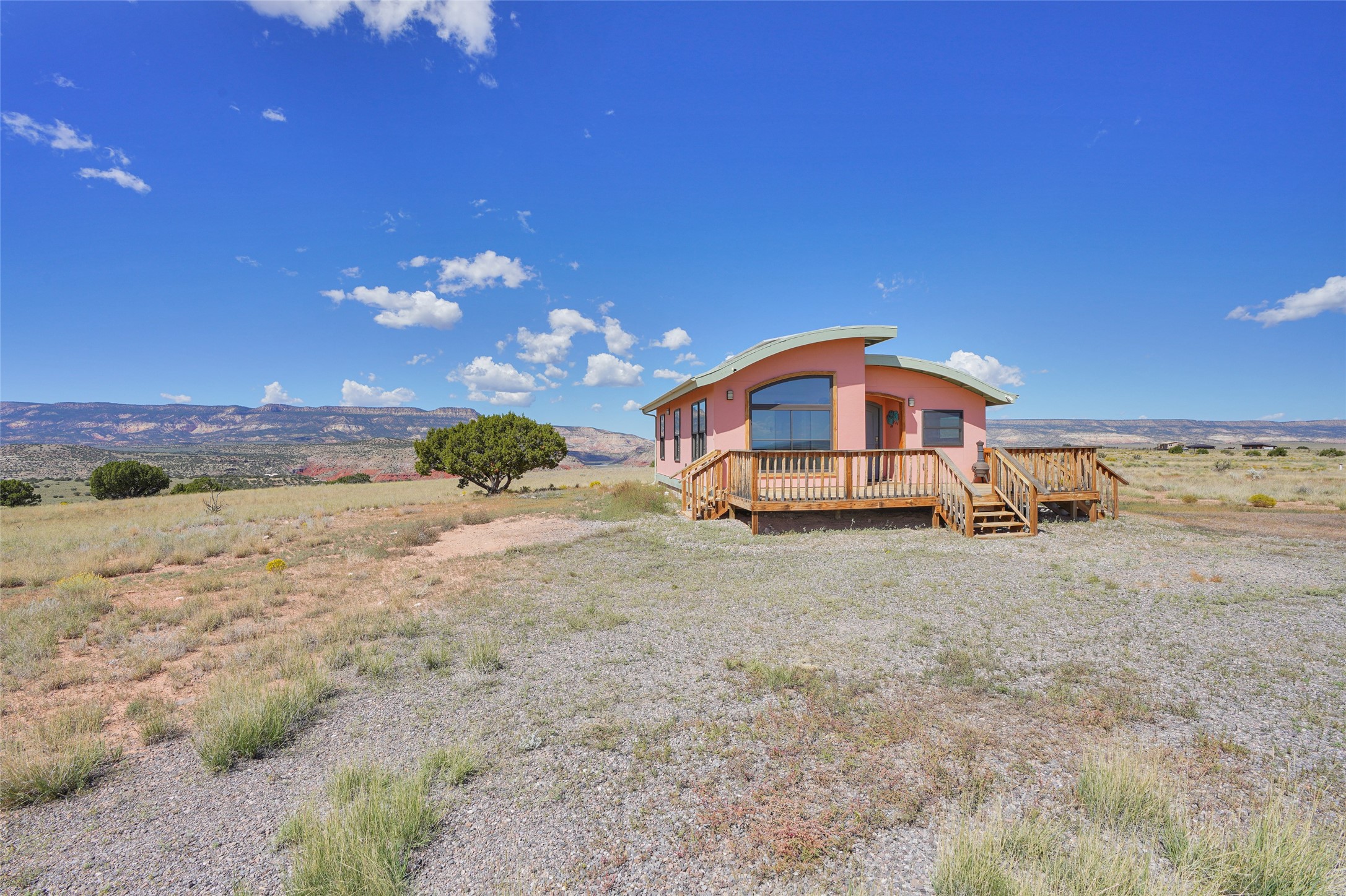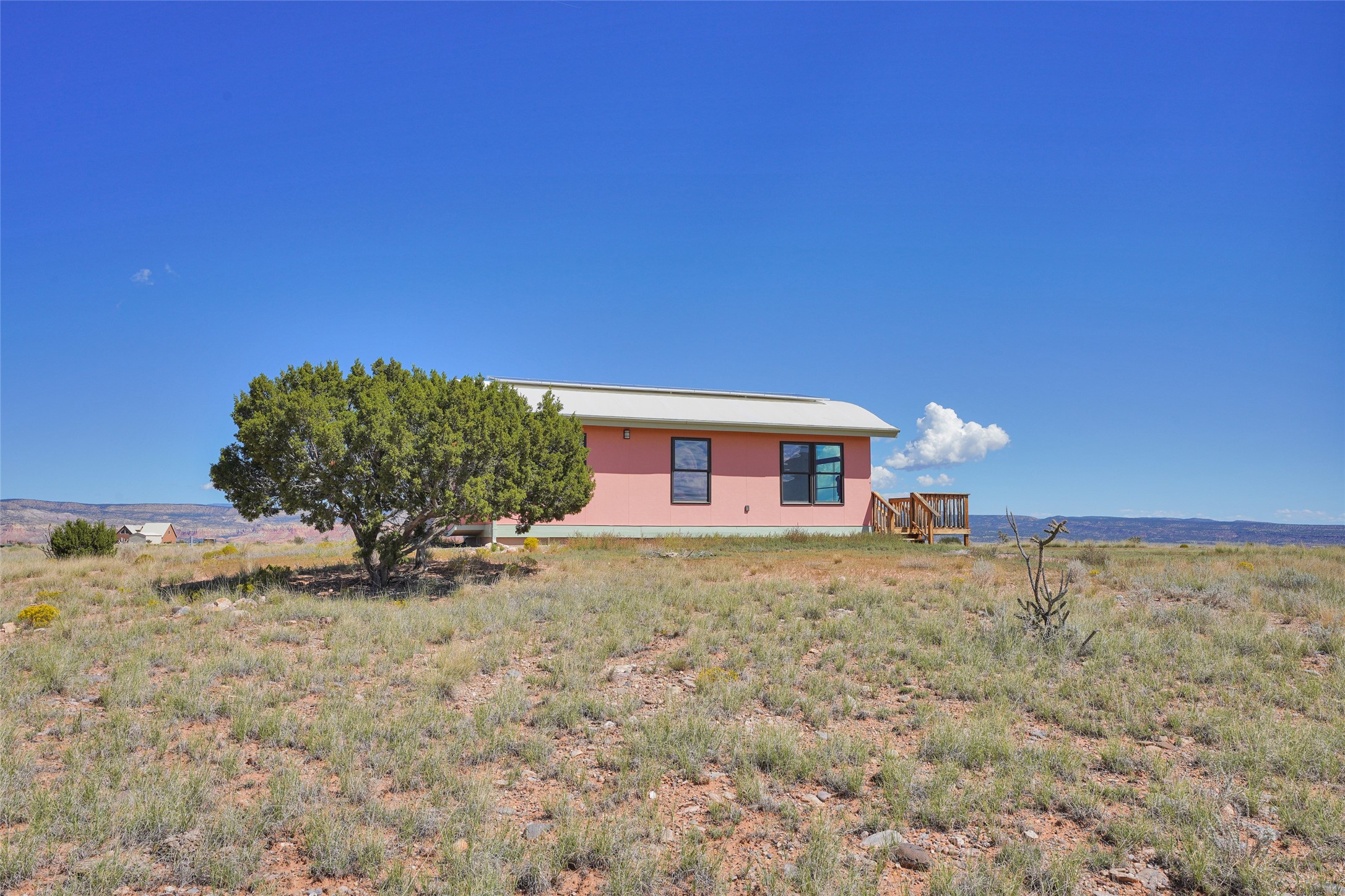 199 Private Drive 1728 in Youngsville sits on five acres with access to a private boat ramp and recreation area on Abiquiu Lake. Behind a motorized gate, the property offers both privacy and convenience. The 768-square-foot home, completed in 2020, was designed around the idea of efficient living. High ceilings, clerestory windows, and rounded corners create an easy flow through two bedrooms, a full kitchen, dining nook, living area, and three-quarter bath.Energy-efficient windows and appliances, mini-split heating and cooling, and smart-home features are already in place. The home is tied to the grid, and the solar array helps offset electric costs, with the option to add battery backup if desired. Low-flow fixtures, low or no-VOC finishes, and fire-resistant siding contribute to its durability and efficiency.The property is served by a shared well with a reverse osmosis system and a conventional septic system. From the house, the views reach across Ghost Ranch, Cerro Pedernal, and Mesa Prieta--landscapes that define northern New Mexico. With gated entry, lake access, and a home designed for efficiency, this property offers a comfortable balance between setting and design.