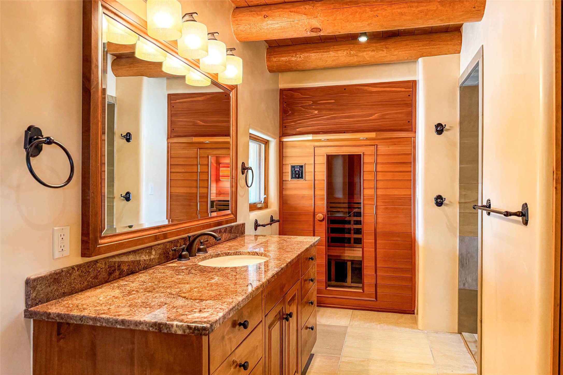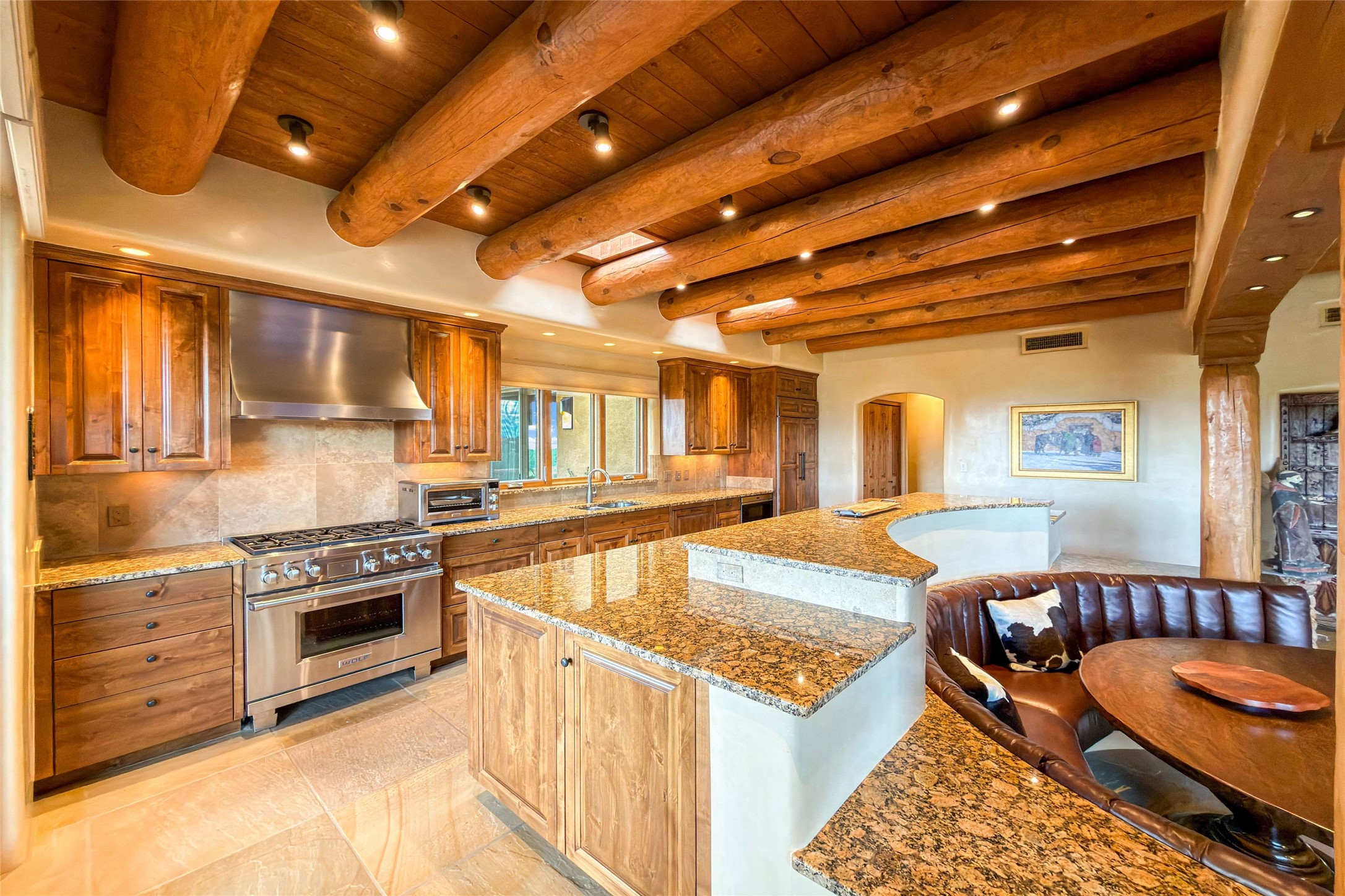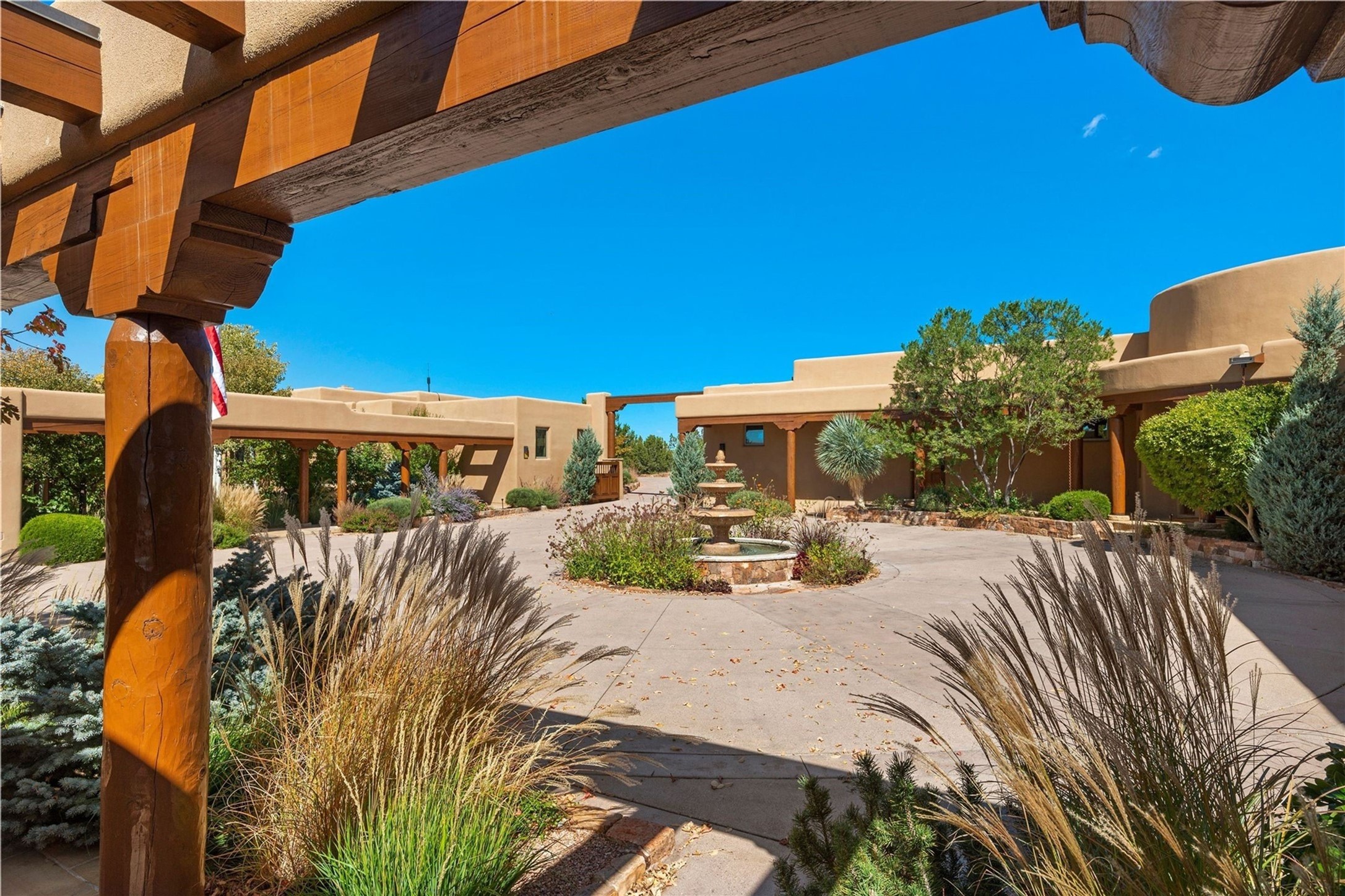 Set high on a private hilltop, and enjoying sunset mountain views, this custom Pueblo Revival compound embodies craftsmanship, substance, and timeless Santa Fe style. Built with quality at every turn and refreshed with a new roof and stucco, the property is introduced by a grand, gated courtyard with center fountain, full poured concrete drive, and a spacious garage for 4 cars. The 3-bedroom main residence, remodeled by Kim Dressel in 2012, reveals artisan details from the moment you step into the dramatic Zaguan entry. Finishes include slate floors, carved woodwork by master craftsman David Naylor, thick plaster walls, and a freestanding bar that anchors the open living and dining spaces. The chef's island kitchen features Wolf, Sub-Zero, and wine refrigeration, ideal for both daily living and entertaining. The split-bedroom layout offers privacy, while the primary suite is a sanctuary with dual closets, built-ins with fridge, kiva fireplace, and a dedicated exercise room. Outdoor living extends to multiple portals, a rooftop deck with 360 mountain views, a full kitchen, fireplace, and an elegant in-ground cocktail pool. The 3,050 sq. ft. second residence, newly built by Kim Dressel in 2013, echoes the same solid construction and fine finishes. With 2 bedrooms, 2 living rooms, a full kitchen and dining space, carved details by David Naylor, and far-reaching Sangre de Cristo and Jemez views, it offers luxurious comfort. Special features include a built-in bar, 90-inch screen with 9-speaker theater, and an expansive portal with pizza oven, grill, and fireplace. Additional amenities--a workshop, generator, and 15,000 gallon irrigation cistern--enhance function and reliability. Only 15 minutes from The Plaza and Santa Fe Airport, this compound is ideal for multi-generational living or hosting guests in a one-of-a-kind setting where custom design, quality finishes, and Pueblo Revival authenticity define the experience. A contiguous 1.7-acre lot on Black Mesa may be available separately. Membership to the Club at Las Campanas is available for purchase and upon approval.