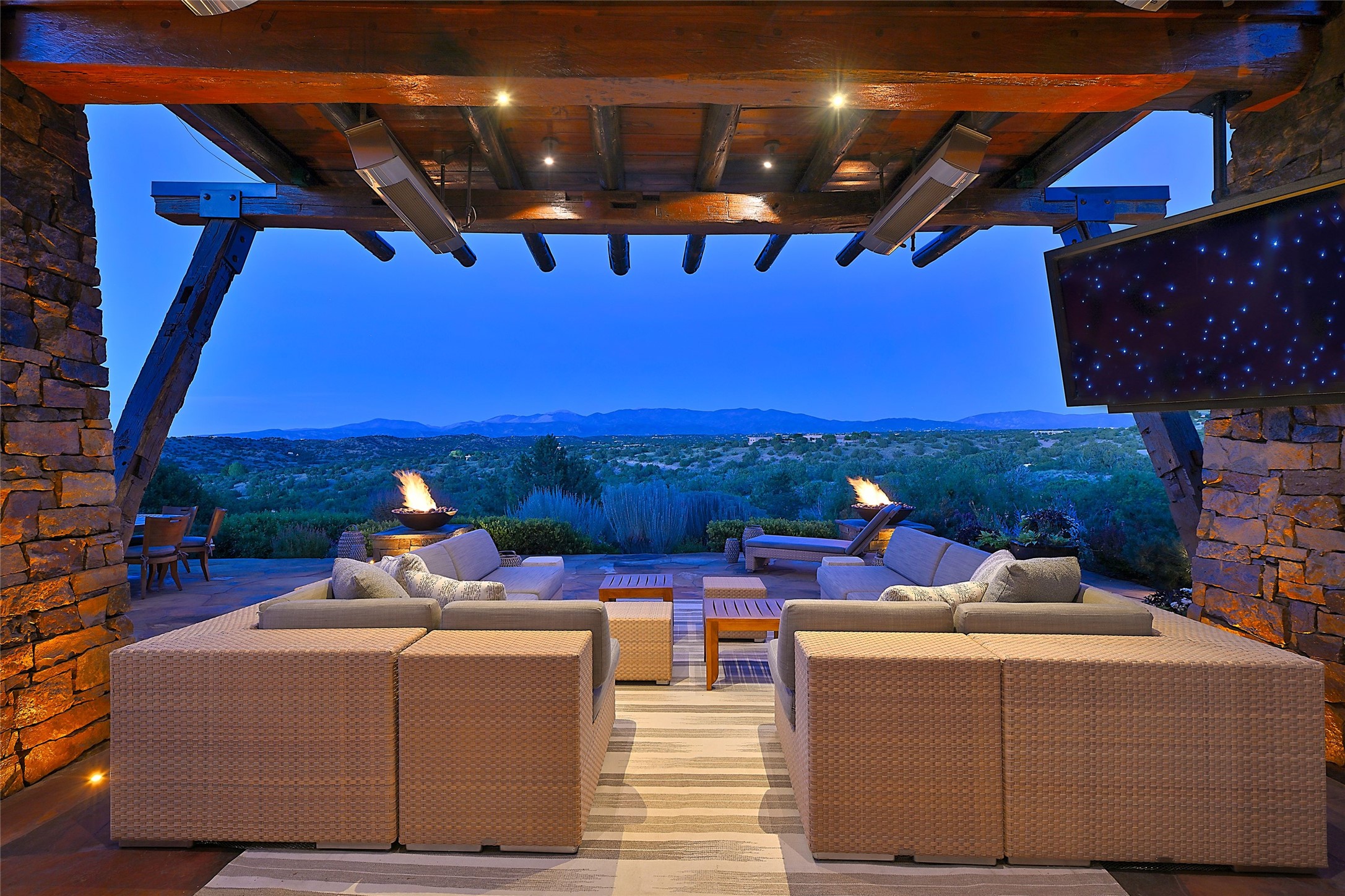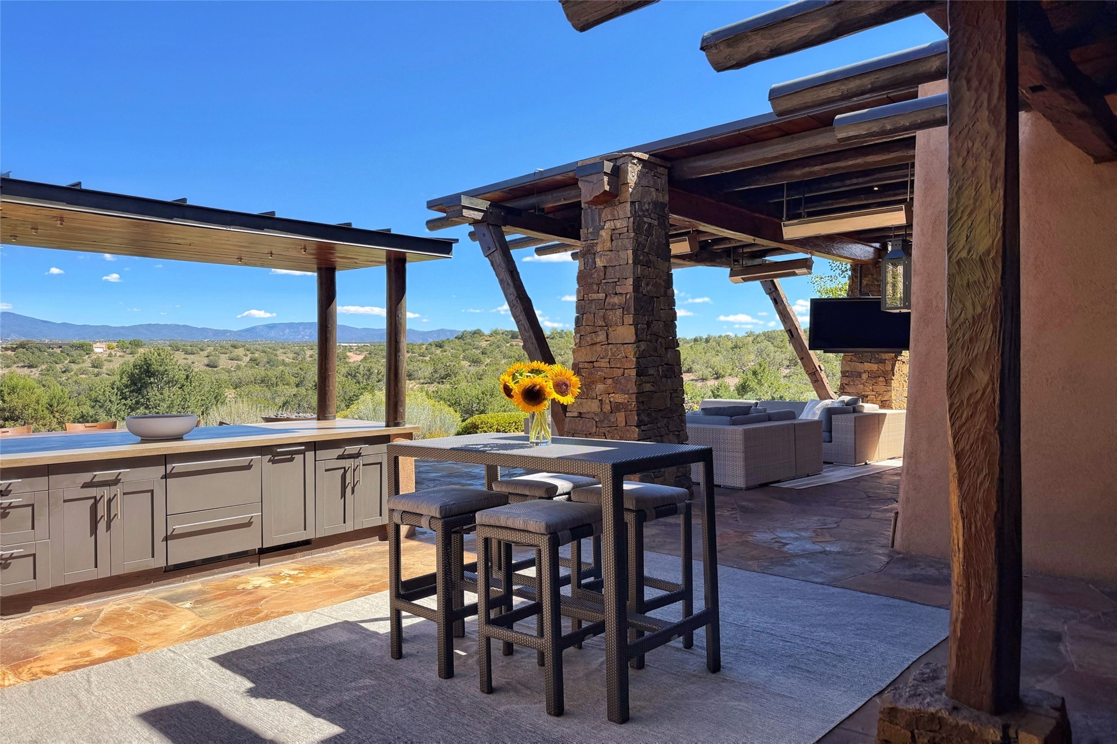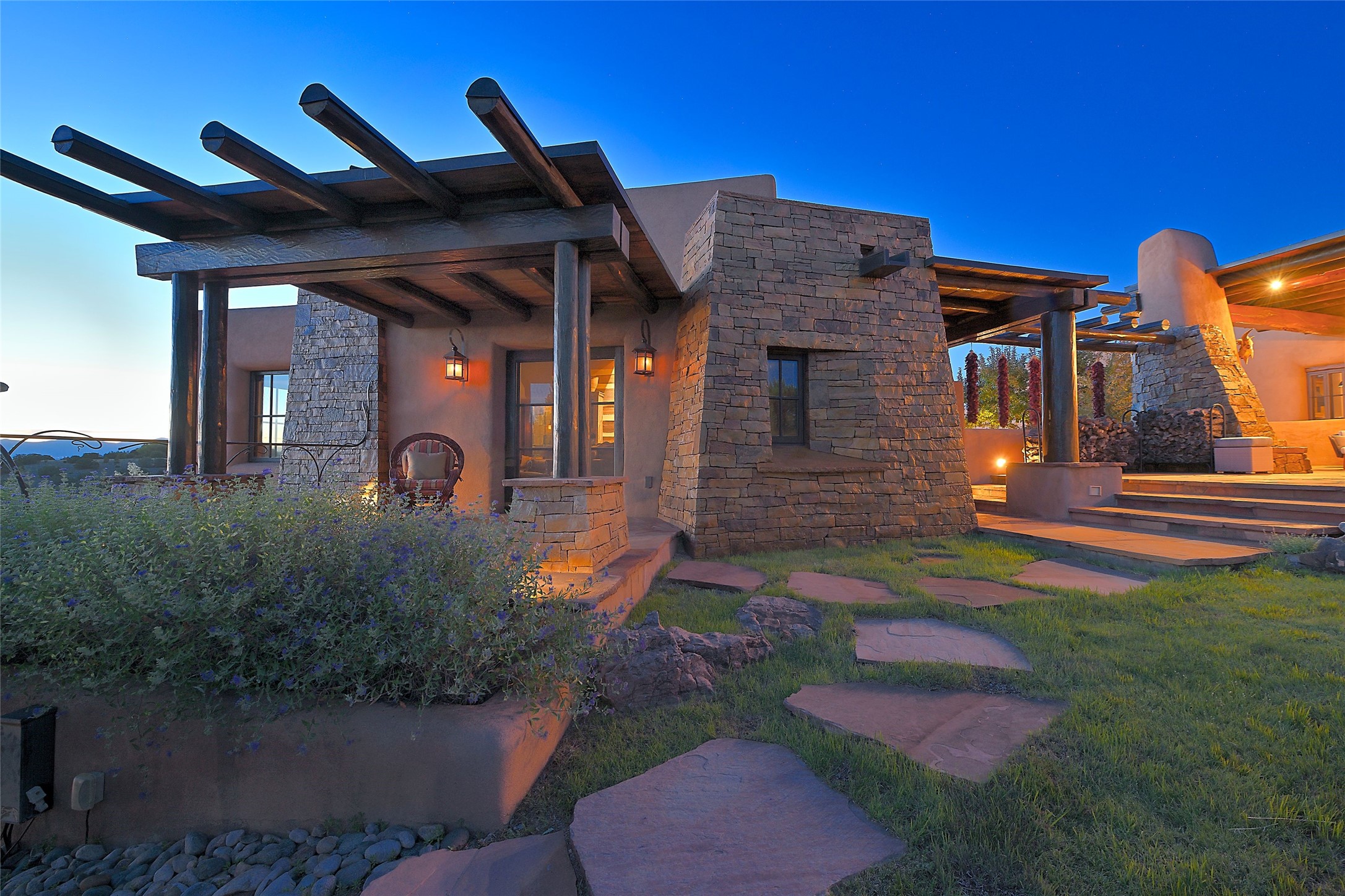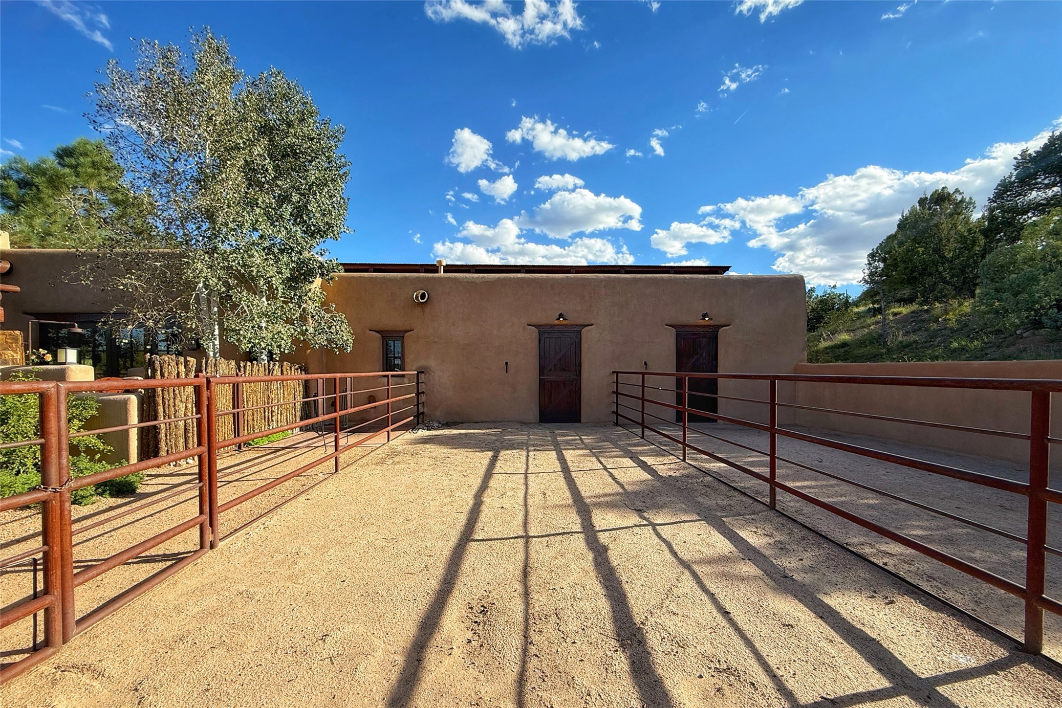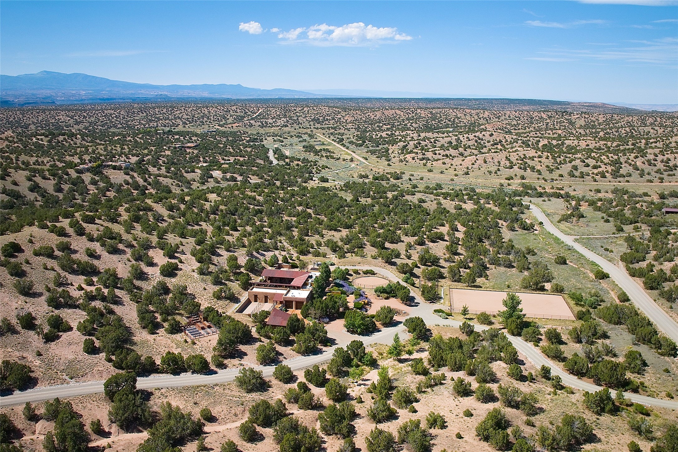 Welcome to 'The Dusty Boot', a 25.3-acre sanctuary where the spirit of the Old West meets the artistry of modern living. Set on a buildable ridgetop with sweeping 360 views of the Sangre de Cristo and Jemez Mountains, this 5,186 sqft estate combines a luxury residence, guest compound, and world-class equestrian facility within the gated community of La Tierra Nueva, minutes from Santa Fe and The Club at Las Campanas. Designed by Steven Samuelson Studio and built in 2007, the Pueblo-revival residence (2 BD/3BA) radiates rustic sophistication: a grand great room centered on a stone-and-copper fireplace beneath soaring ceilings, an infinity patio that seems to float above the desert horizon, and an outdoor chef's kitchen anchored by a wood-fired pizza oven. Your guests will enjoy comfort and hospitality in a cozy standalone guest house (1BD/2BA) just steps from the main living area. The equestrian compound (1 BD/2BA), envisioned by Pedro Marquez, extends far beyond function. Four oversized heated stalls with turnouts, automatic waterers, tack room, horse wash, arena, round pen, and horse walker support the finest in equine care. Cantilevered vigas and lush courtyards with a sala, double water-trough waterfall, and firepit create a striking architectural setting for entertaining. At the heart of the stable complex lies a spacious studio and office suite, climate-controlled, connected, and light-filled space ideal for various endeavors: a fully integrated, executive-level remote office, professional art studio, music recording and production studio, or a serene environment for yoga, pilates, tai chi, or fitness. This flexible environment bridges creativity and productivity, all within the serenity of Santa Fe's high desert. Completing the lifestyle and integrated with the exquisite landscaping are orchards, gardens, water features, and a hen house. The 'Dusty Boot' is more than a property, it is a private world where work, creativity, and leisure thrive in harmony.