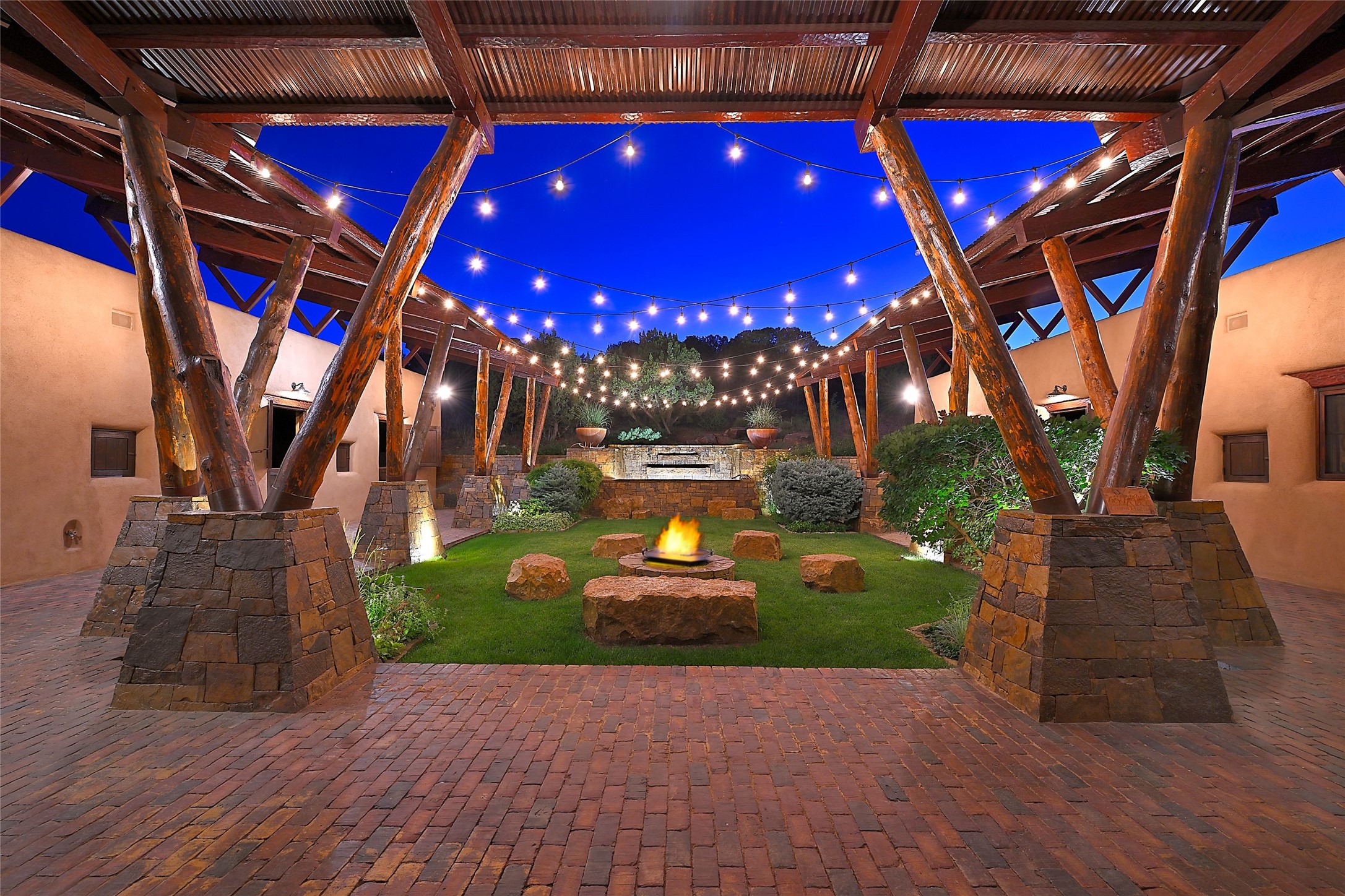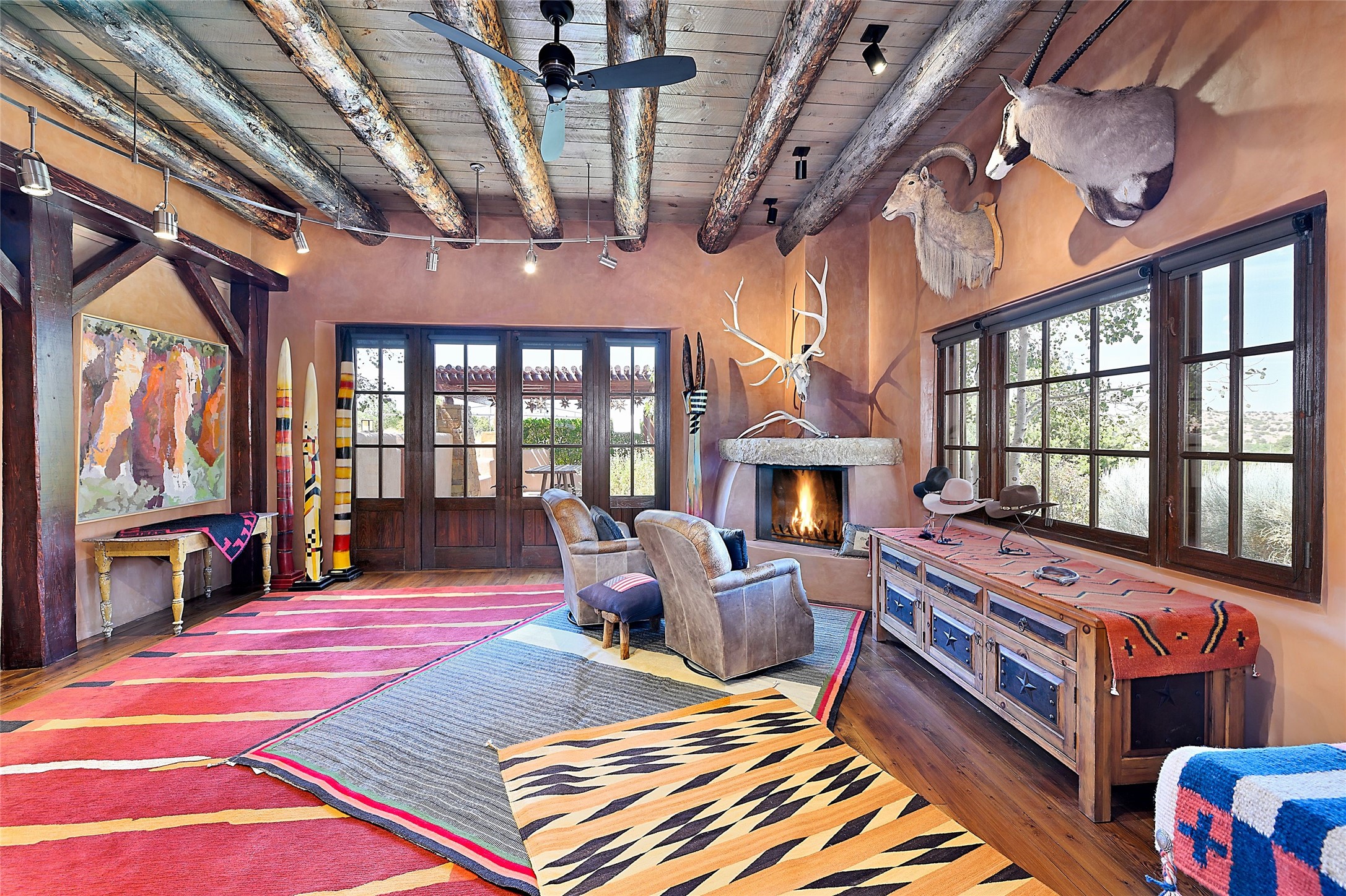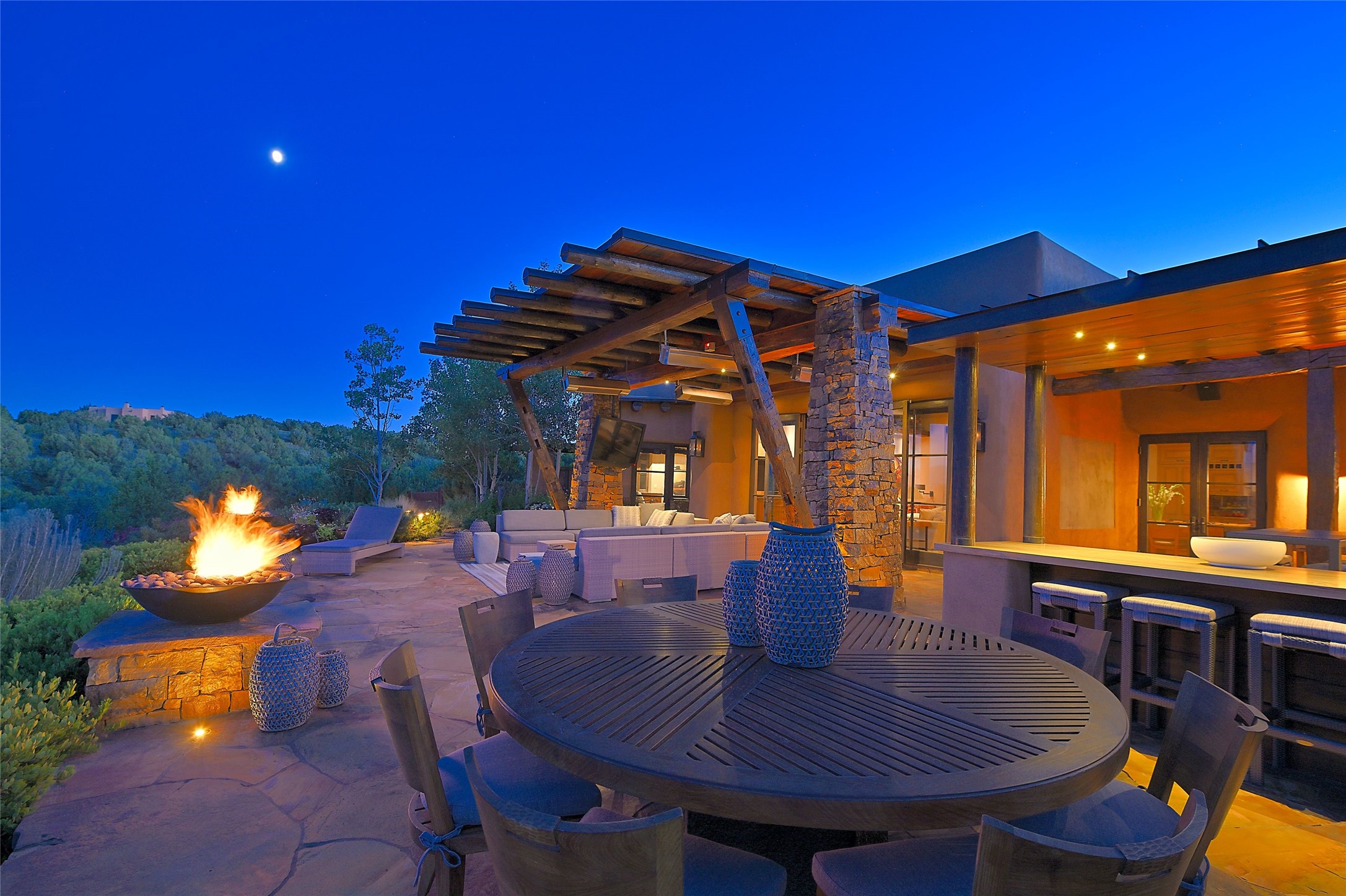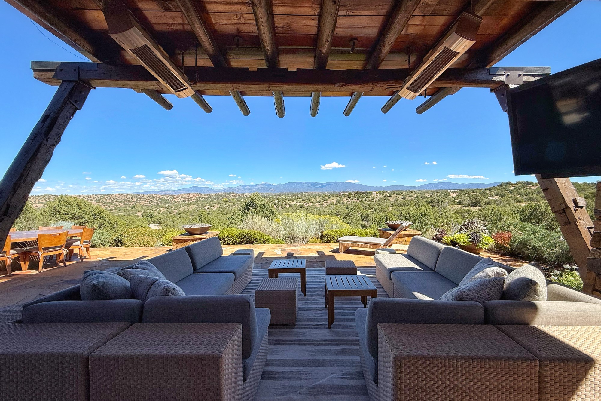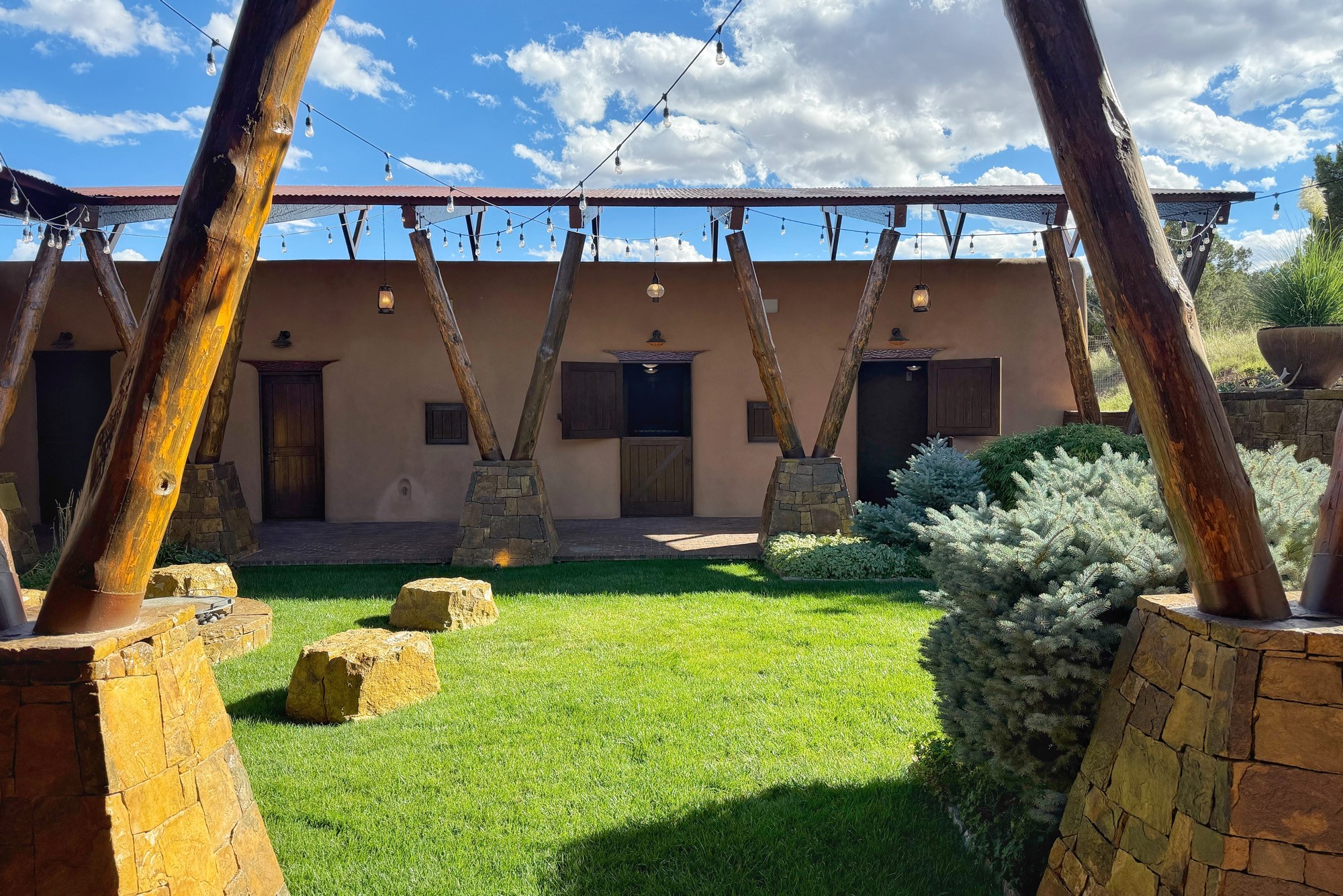 Welcome to 'The Dusty Boot', a 25.3-acre sanctuary where the spirit of the Old West meets the artistry of modern living. Set on a buildable ridgetop with sweeping 360 views of the Sangre de Cristo and Jemez Mountains, this 5,186 sqft estate combines a luxury residence, guest compound, and world-class equestrian facility within the gated community of La Tierra Nueva, minutes from Santa Fe and The Club at Las Campanas. Designed by Steven Samuelson Studio and built in 2007, the Pueblo-revival residence (2 BD/3BA) radiates rustic sophistication: a grand great room centered on a stone-and-copper fireplace beneath soaring ceilings, an infinity patio that seems to float above the desert horizon, and an outdoor chef's kitchen anchored by a wood-fired pizza oven. Your guests will enjoy comfort and hospitality in a cozy standalone guest house (1BD/2BA) just steps from the main living area. The equestrian compound (1 BD/2BA), envisioned by Pedro Marquez, extends far beyond function. Four oversized heated stalls with turnouts, automatic waterers, tack room, horse wash, arena, round pen, and horse walker support the finest in equine care. Cantilevered vigas and lush courtyards with a sala, double water-trough waterfall, and firepit create a striking architectural setting for entertaining. At the heart of the stable complex lies a spacious studio and office suite, climate-controlled, connected, and light-filled space ideal for various endeavors: a fully integrated, executive-level remote office, professional art studio, music recording and production studio, or a serene environment for yoga, pilates, tai chi, or fitness. This flexible environment bridges creativity and productivity, all within the serenity of Santa Fe's high desert. Completing the lifestyle and integrated with the exquisite landscaping are orchards, gardens, water features, and a hen house. The 'Dusty Boot' is more than a property, it is a private world where work, creativity, and leisure thrive in harmony.