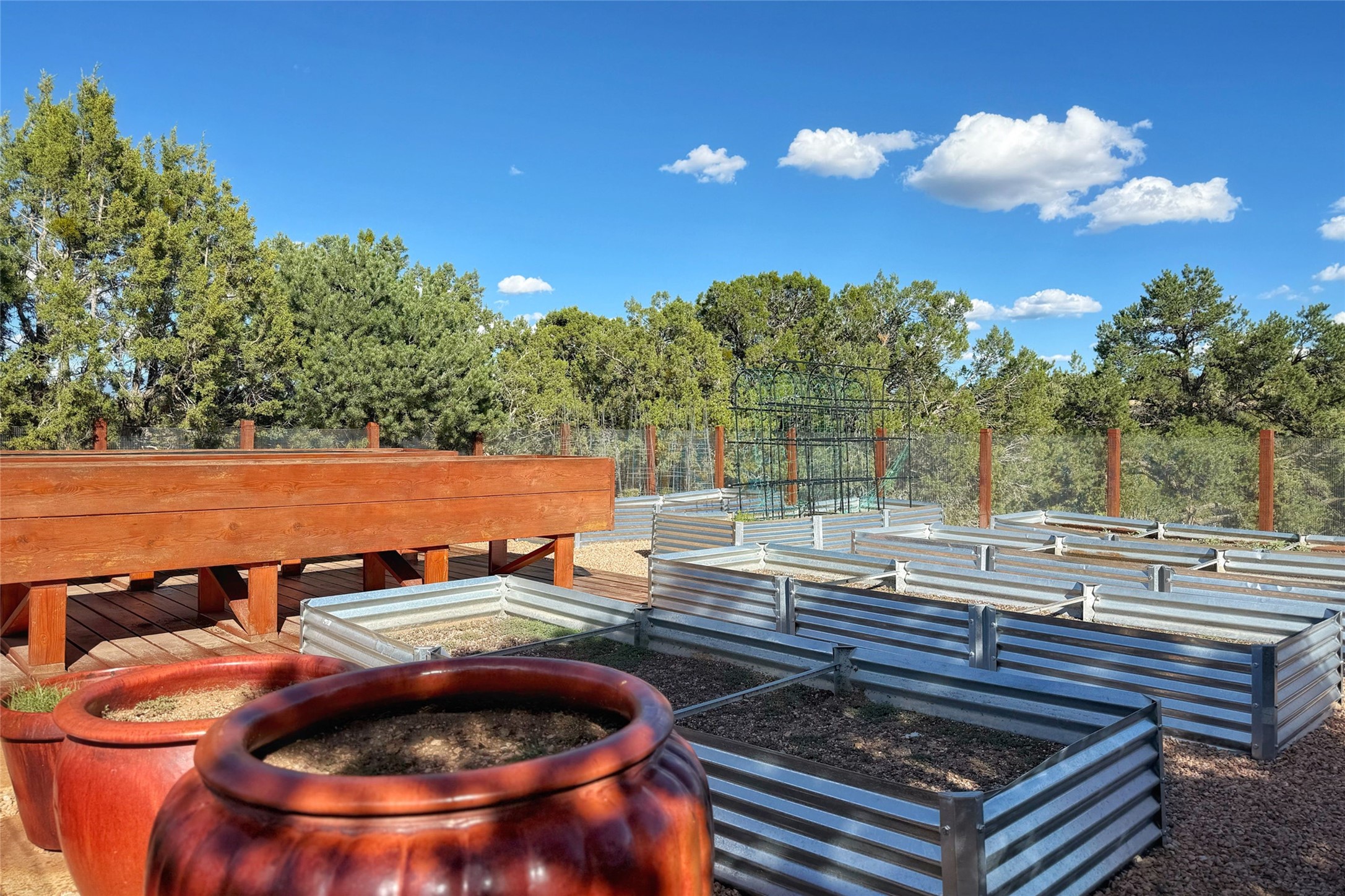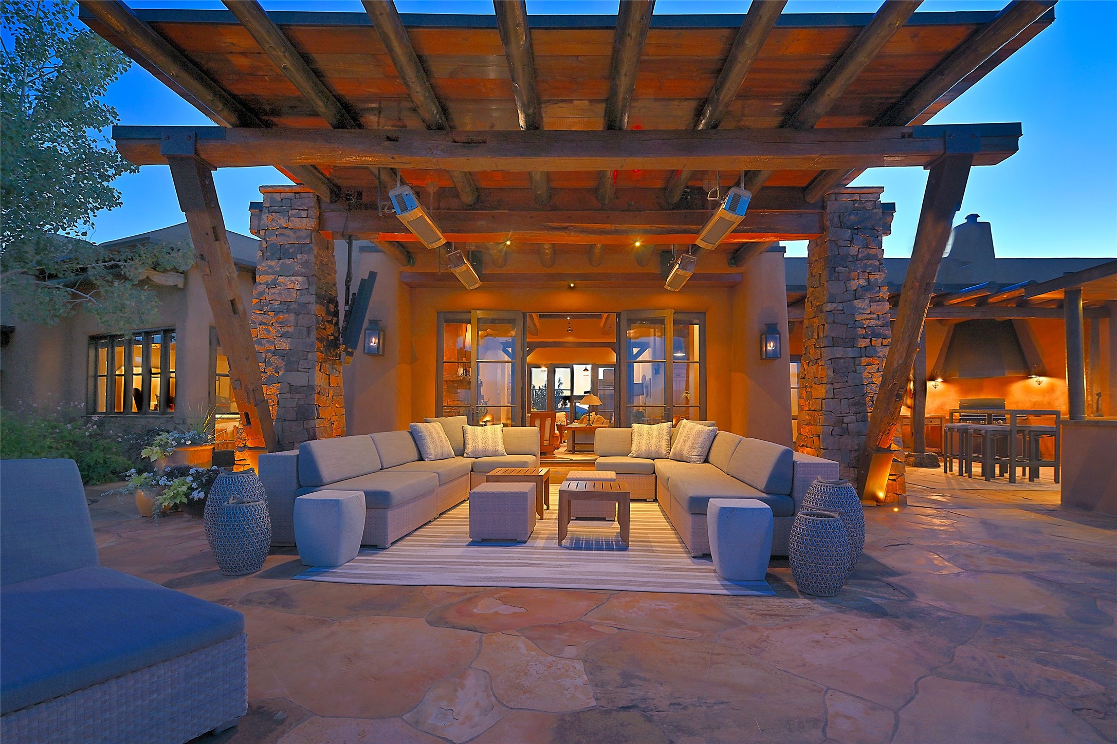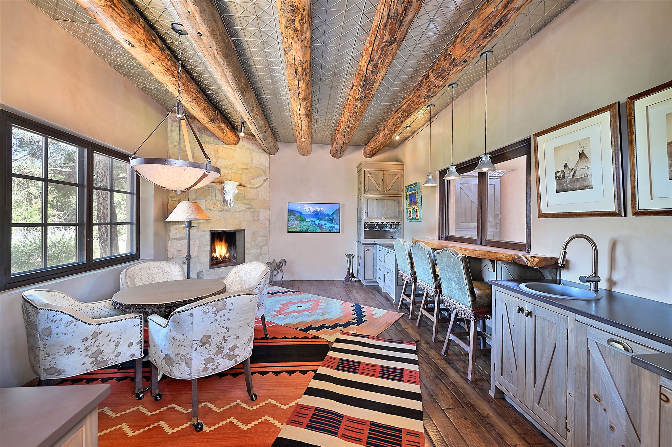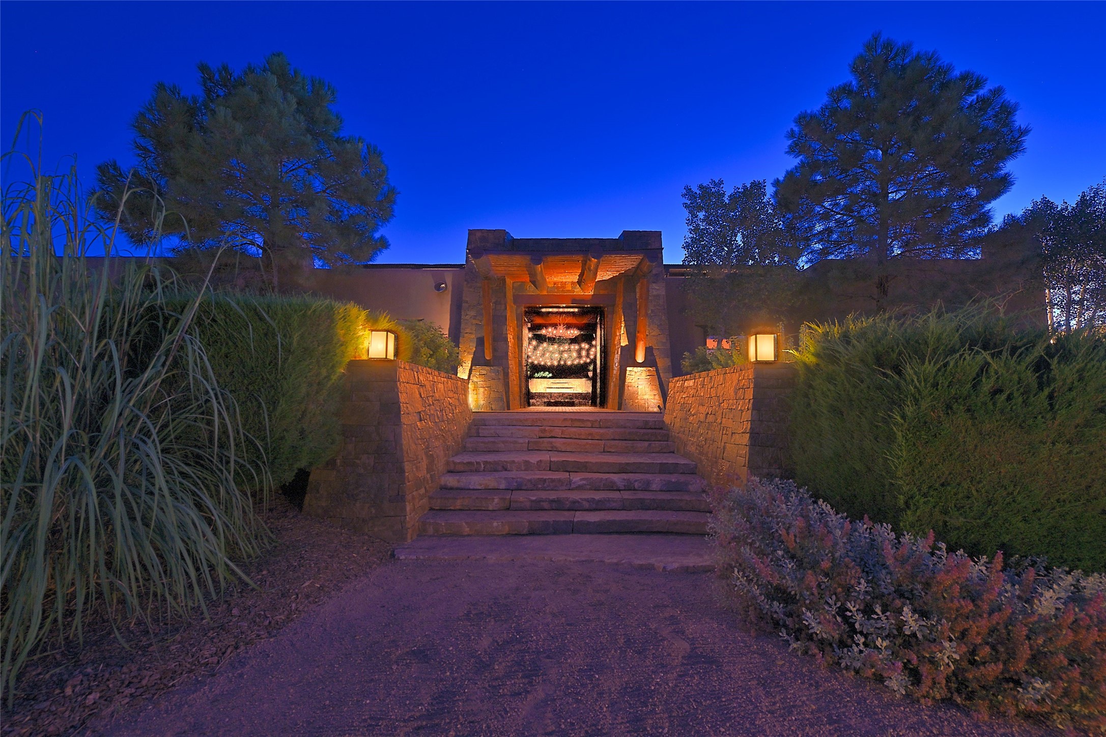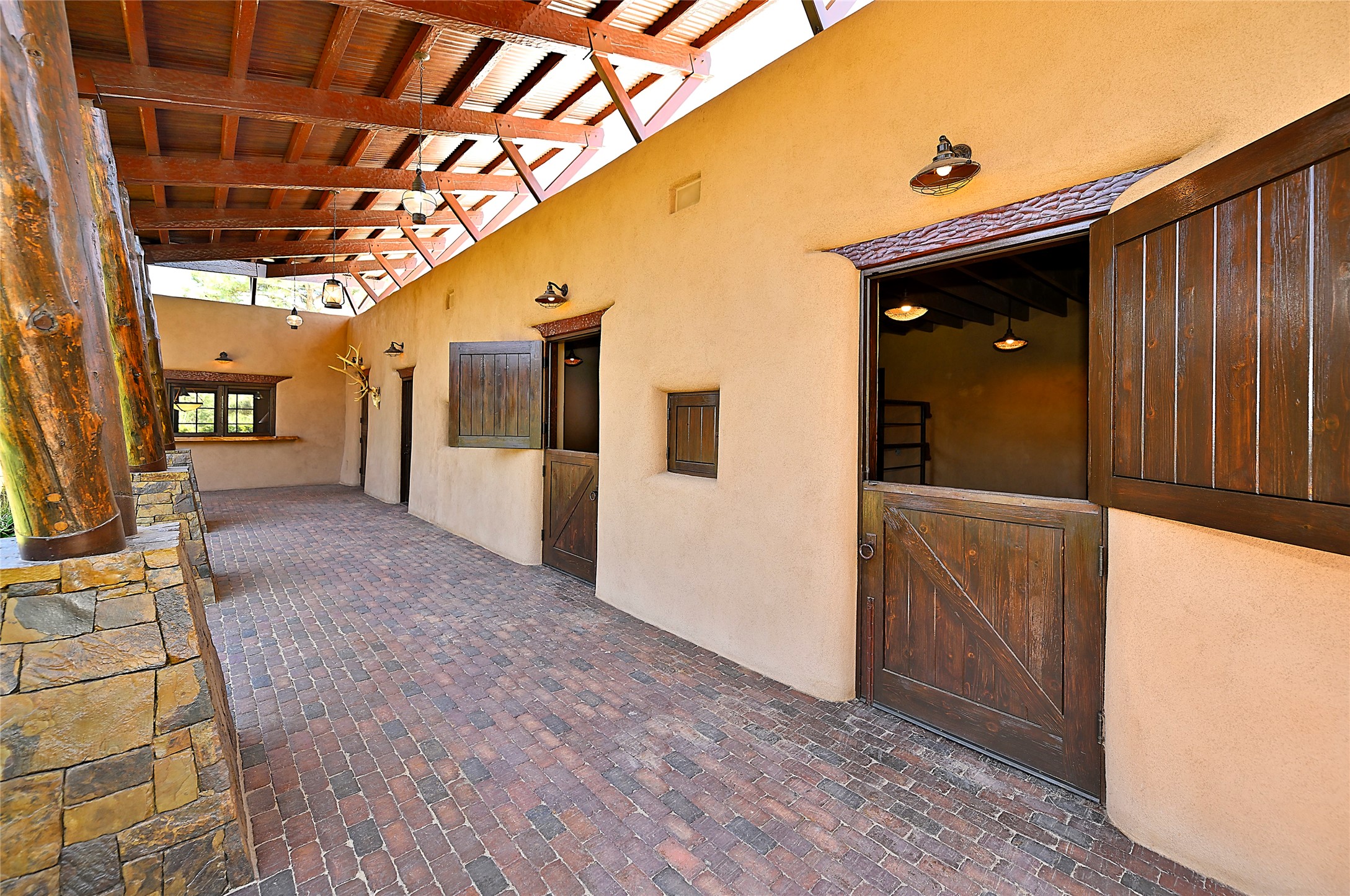 Welcome to 'The Dusty Boot', a 25.3-acre sanctuary where the spirit of the Old West meets the artistry of modern living. Set on a buildable ridgetop with sweeping 360 views of the Sangre de Cristo and Jemez Mountains, this 5,186 sqft estate combines a luxury residence, guest compound, and world-class equestrian facility within the gated community of La Tierra Nueva, minutes from Santa Fe and The Club at Las Campanas. Designed by Steven Samuelson Studio and built in 2007, the Pueblo-revival residence (2 BD/3BA) radiates rustic sophistication: a grand great room centered on a stone-and-copper fireplace beneath soaring ceilings, an infinity patio that seems to float above the desert horizon, and an outdoor chef's kitchen anchored by a wood-fired pizza oven. Your guests will enjoy comfort and hospitality in a cozy standalone guest house (1BD/2BA) just steps from the main living area. The equestrian compound (1 BD/2BA), envisioned by Pedro Marquez, extends far beyond function. Four oversized heated stalls with turnouts, automatic waterers, tack room, horse wash, arena, round pen, and horse walker support the finest in equine care. Cantilevered vigas and lush courtyards with a sala, double water-trough waterfall, and firepit create a striking architectural setting for entertaining. At the heart of the stable complex lies a spacious studio and office suite, climate-controlled, connected, and light-filled space ideal for various endeavors: a fully integrated, executive-level remote office, professional art studio, music recording and production studio, or a serene environment for yoga, pilates, tai chi, or fitness. This flexible environment bridges creativity and productivity, all within the serenity of Santa Fe's high desert. Completing the lifestyle and integrated with the exquisite landscaping are orchards, gardens, water features, and a hen house. The 'Dusty Boot' is more than a property, it is a private world where work, creativity, and leisure thrive in harmony.