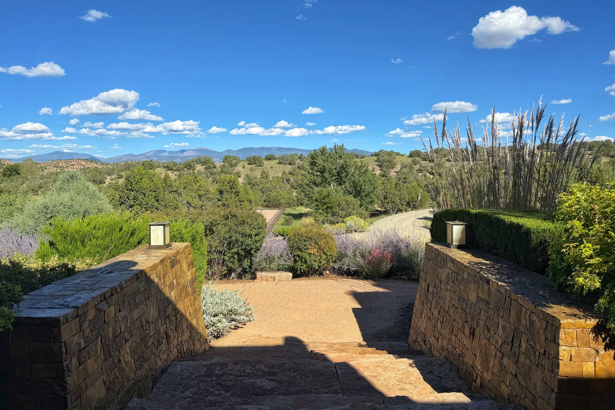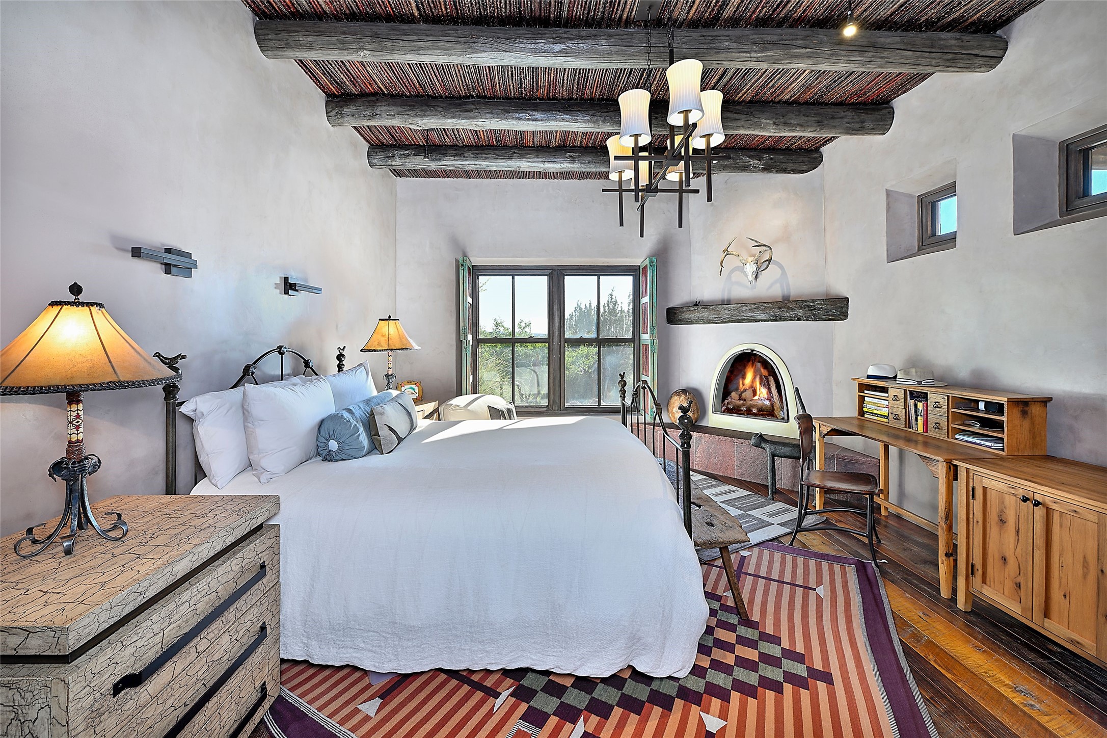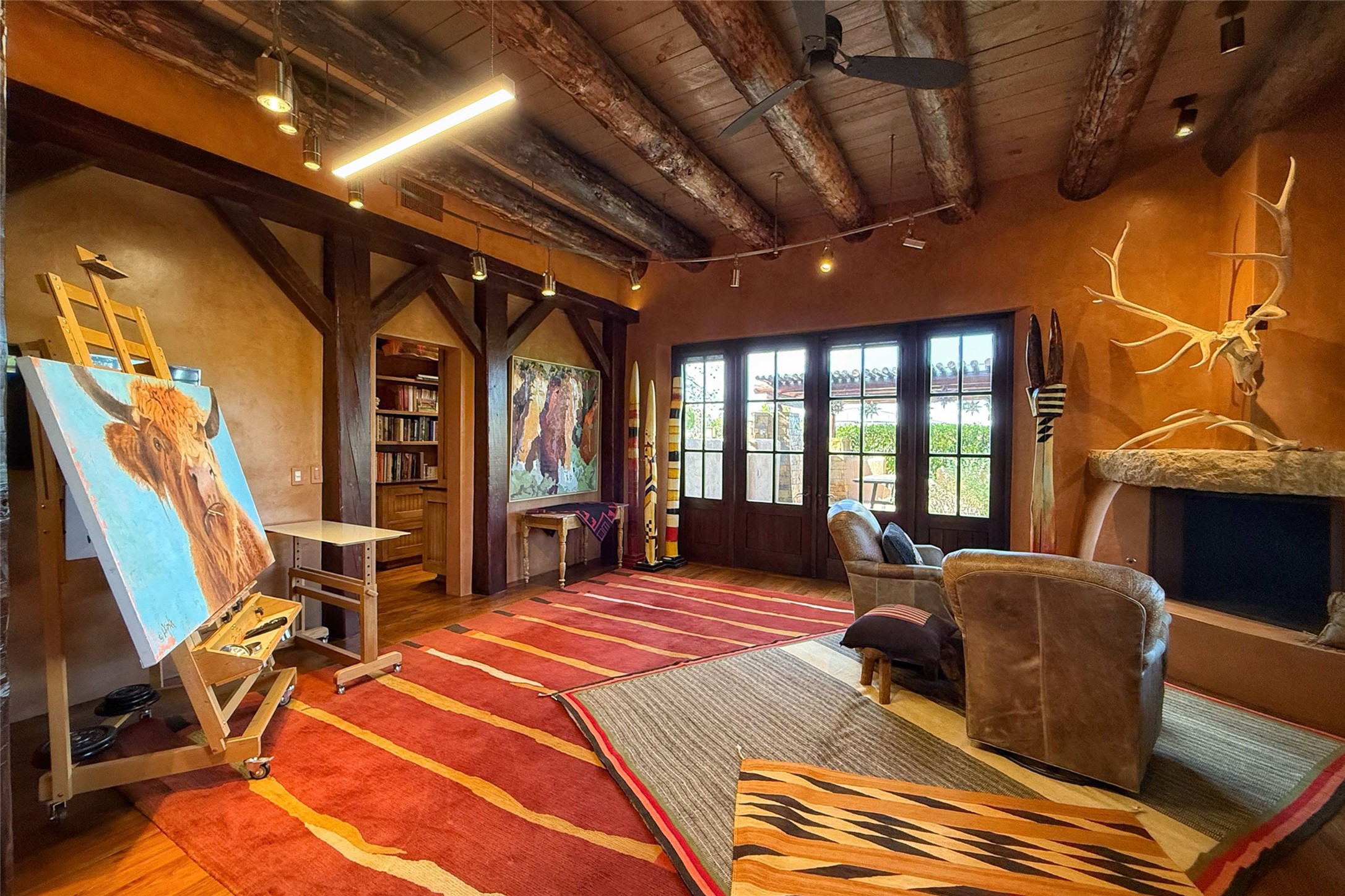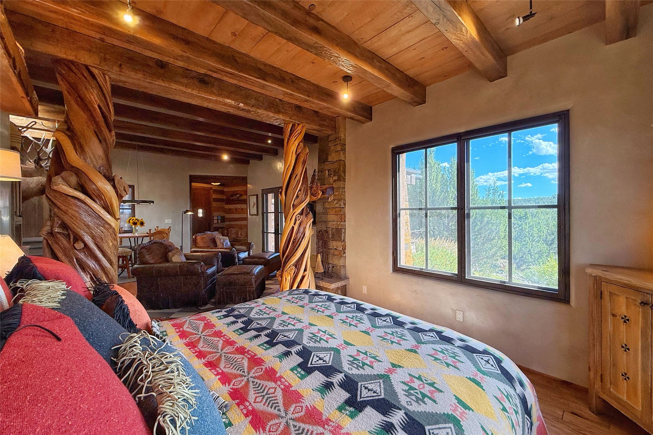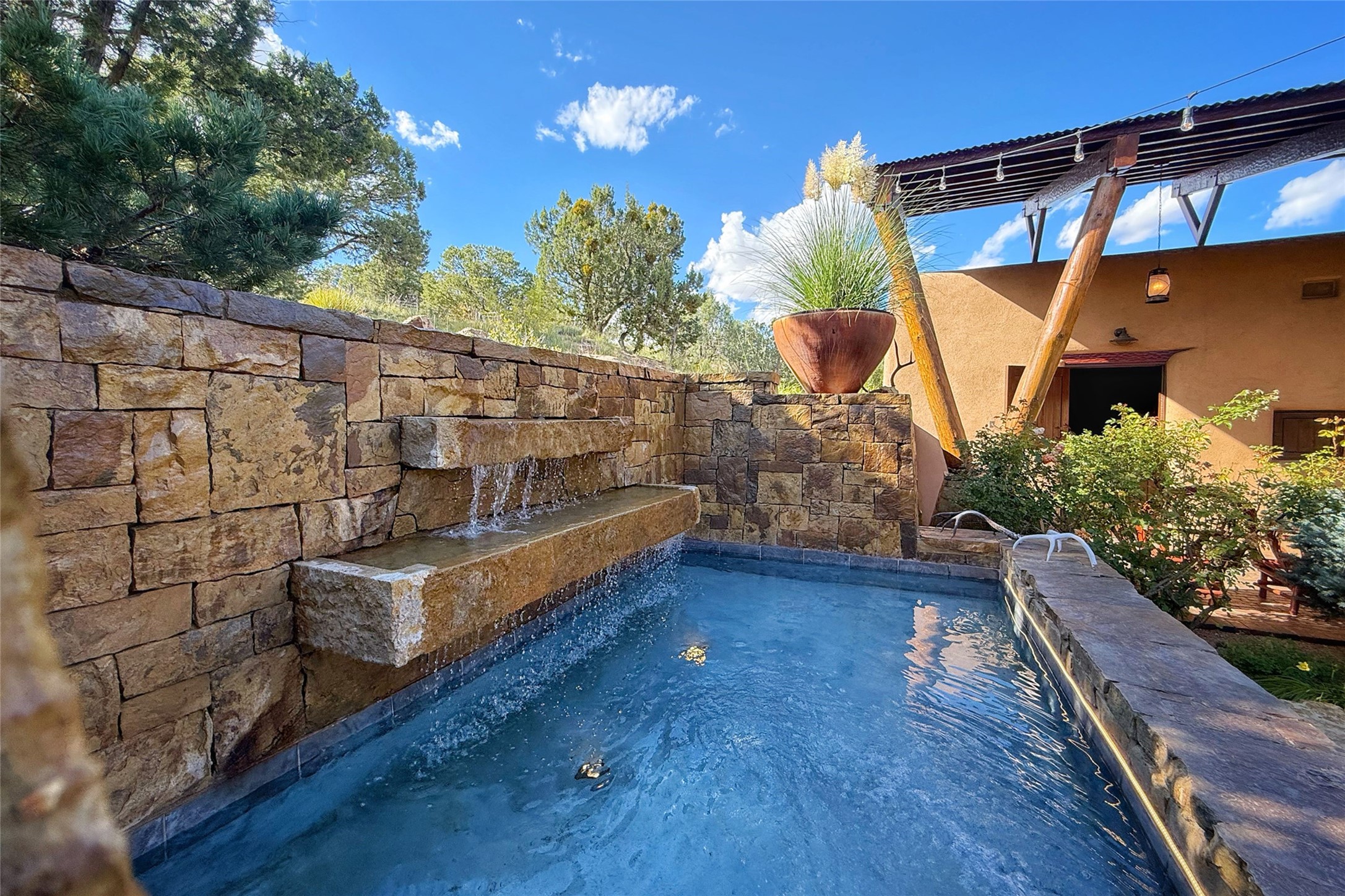 Welcome to 'The Dusty Boot', a 25.3-acre sanctuary where the spirit of the Old West meets the artistry of modern living. Set on a buildable ridgetop with sweeping 360 views of the Sangre de Cristo and Jemez Mountains, this 5,186 sqft estate combines a luxury residence, guest compound, and world-class equestrian facility within the gated community of La Tierra Nueva, minutes from Santa Fe and The Club at Las Campanas. Designed by Steven Samuelson Studio and built in 2007, the Pueblo-revival residence (2 BD/3BA) radiates rustic sophistication: a grand great room centered on a stone-and-copper fireplace beneath soaring ceilings, an infinity patio that seems to float above the desert horizon, and an outdoor chef's kitchen anchored by a wood-fired pizza oven. Your guests will enjoy comfort and hospitality in a cozy standalone guest house (1BD/2BA) just steps from the main living area. The equestrian compound (1 BD/2BA), envisioned by Pedro Marquez, extends far beyond function. Four oversized heated stalls with turnouts, automatic waterers, tack room, horse wash, arena, round pen, and horse walker support the finest in equine care. Cantilevered vigas and lush courtyards with a sala, double water-trough waterfall, and firepit create a striking architectural setting for entertaining. At the heart of the stable complex lies a spacious studio and office suite, climate-controlled, connected, and light-filled space ideal for various endeavors: a fully integrated, executive-level remote office, professional art studio, music recording and production studio, or a serene environment for yoga, pilates, tai chi, or fitness. This flexible environment bridges creativity and productivity, all within the serenity of Santa Fe's high desert. Completing the lifestyle and integrated with the exquisite landscaping are orchards, gardens, water features, and a hen house. The 'Dusty Boot' is more than a property, it is a private world where work, creativity, and leisure thrive in harmony.