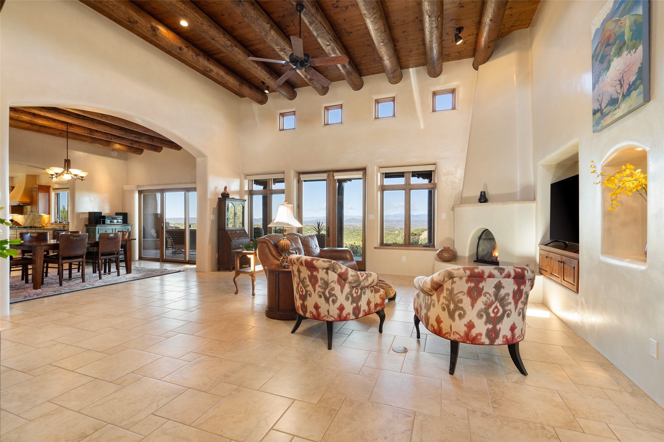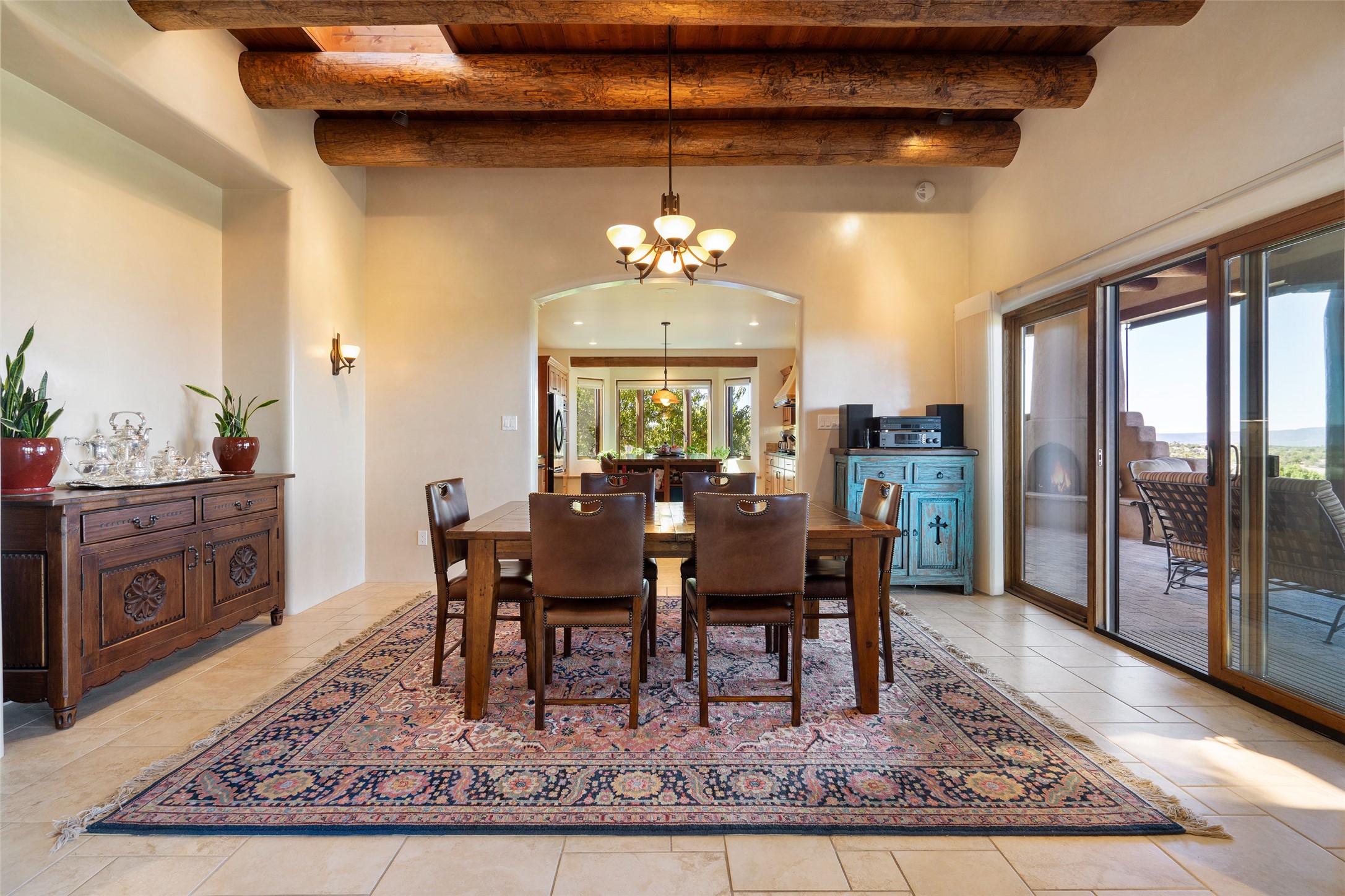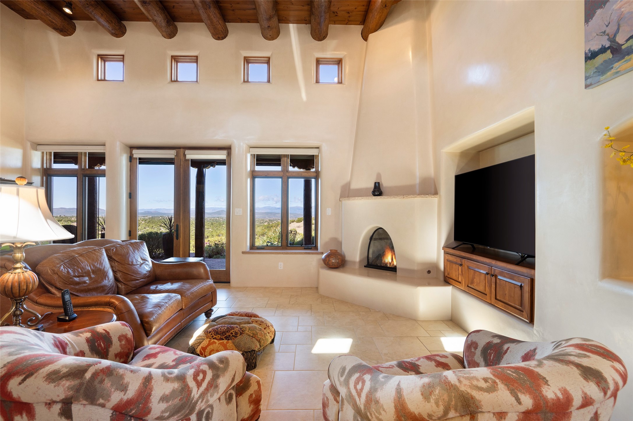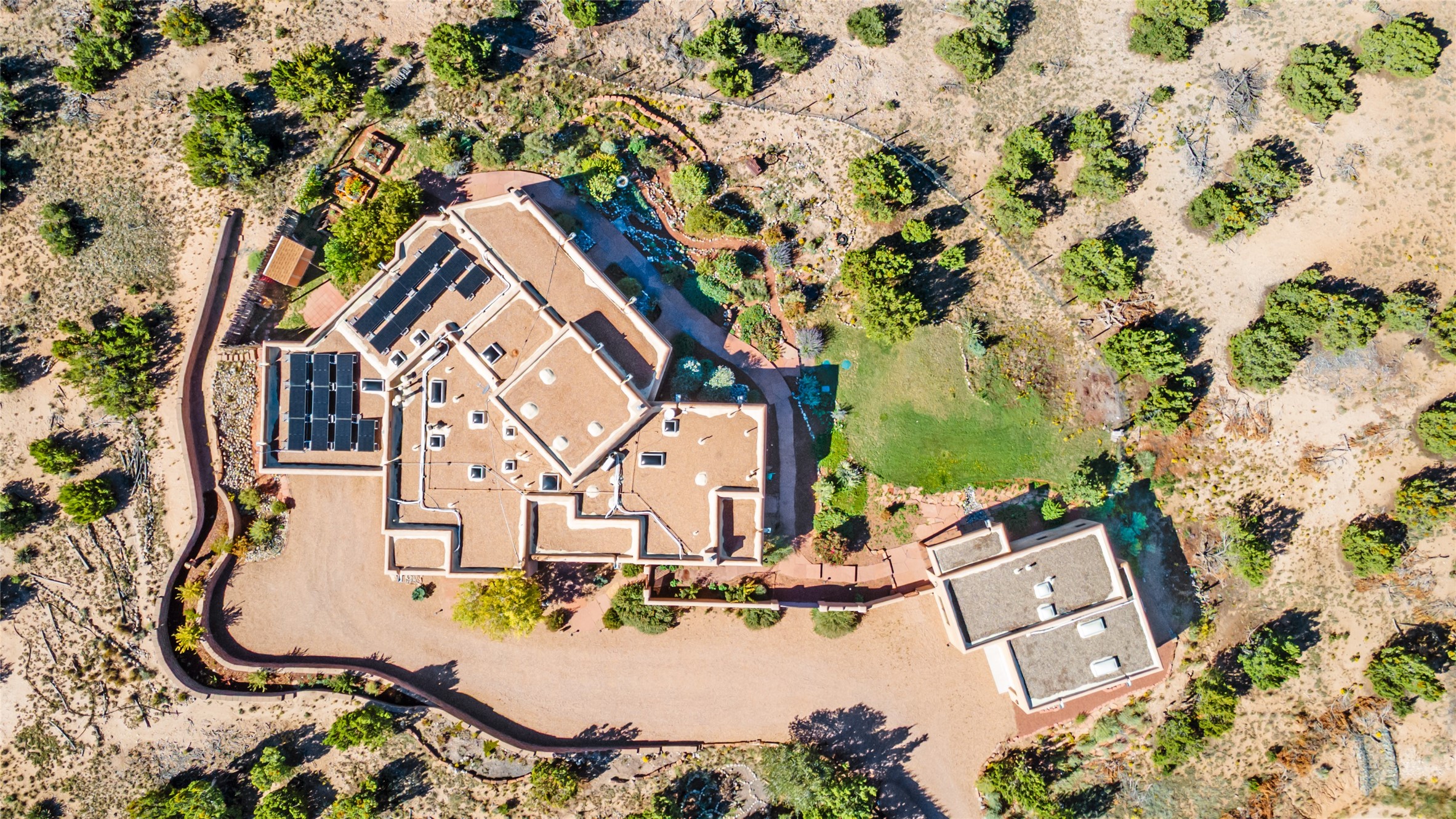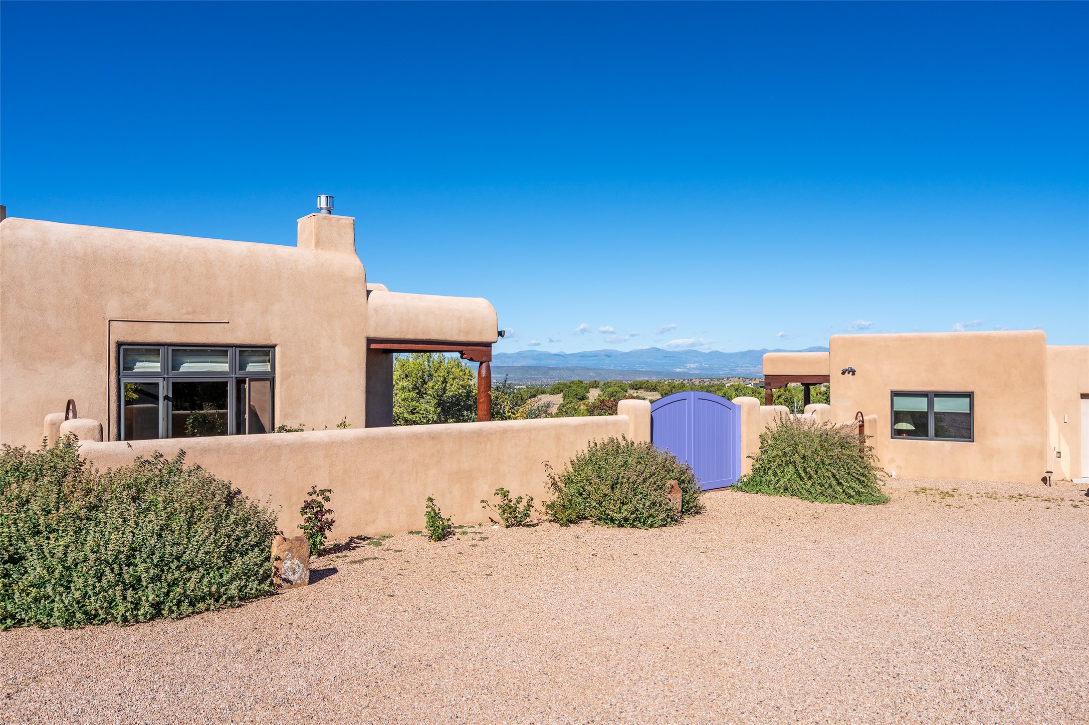 BREATHTAKING SANTA FE STYLE WITH SUNSET VIEWS. Perched on 2.5 acres with unobstructed views of the Western Jemez Mountains, this home was designed with PATTERN LANGUAGE principles in mind including multiple arches that visually repeat throughout the home. This 4-bedroom, 4-bathroom residence (including detached guest house built in 2016) offers the best of Southwestern living with intentional design. Prull Custom Builders built this residence in 2009 for the current owners and the home is sited perfectly to capture glorious sunsets and the dramatic New Mexico landscape, all while blending seamlessly into its natural surroundings. The floor plan ensures excellent separation between the primary suite and guest room, with soaring ceilings, vigas & beams, plastered walls, and abundant natural light throughout. The spacious living room flows to a large sunny gourmet kitchen with multiple granite countertops, a huge island, generous cabinetry, and vistas of the mountains beyond. Radiant in-floor heating and mini-splits provide year-round comfort, while a fully paid Positive Energy solar system keeps electricity costs minimal! The main garage is equipped with EV charging support. Outdoor living is equally inviting with covered portals, brick paver patios, a fireplace, and flagstone paths leading to the guest house - complete with its own garage for added privacy. The landscaped grounds include a fenced backyard for pets and a charming side garden, offering a balance of beauty and function. Free from HOA restrictions, with a newer paved road, privacy and coveted location, this property is an exceptional blend of style, sustainability, and Santa Fe charm.