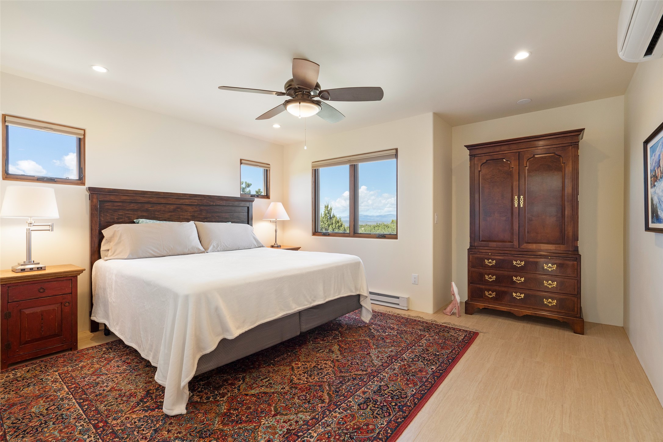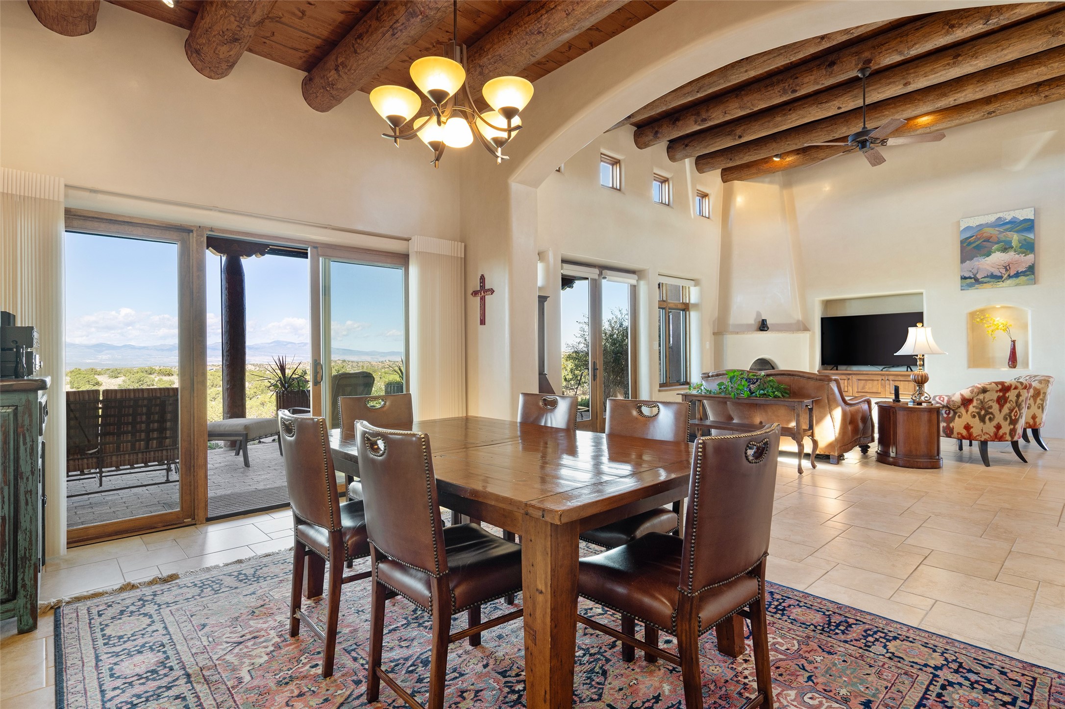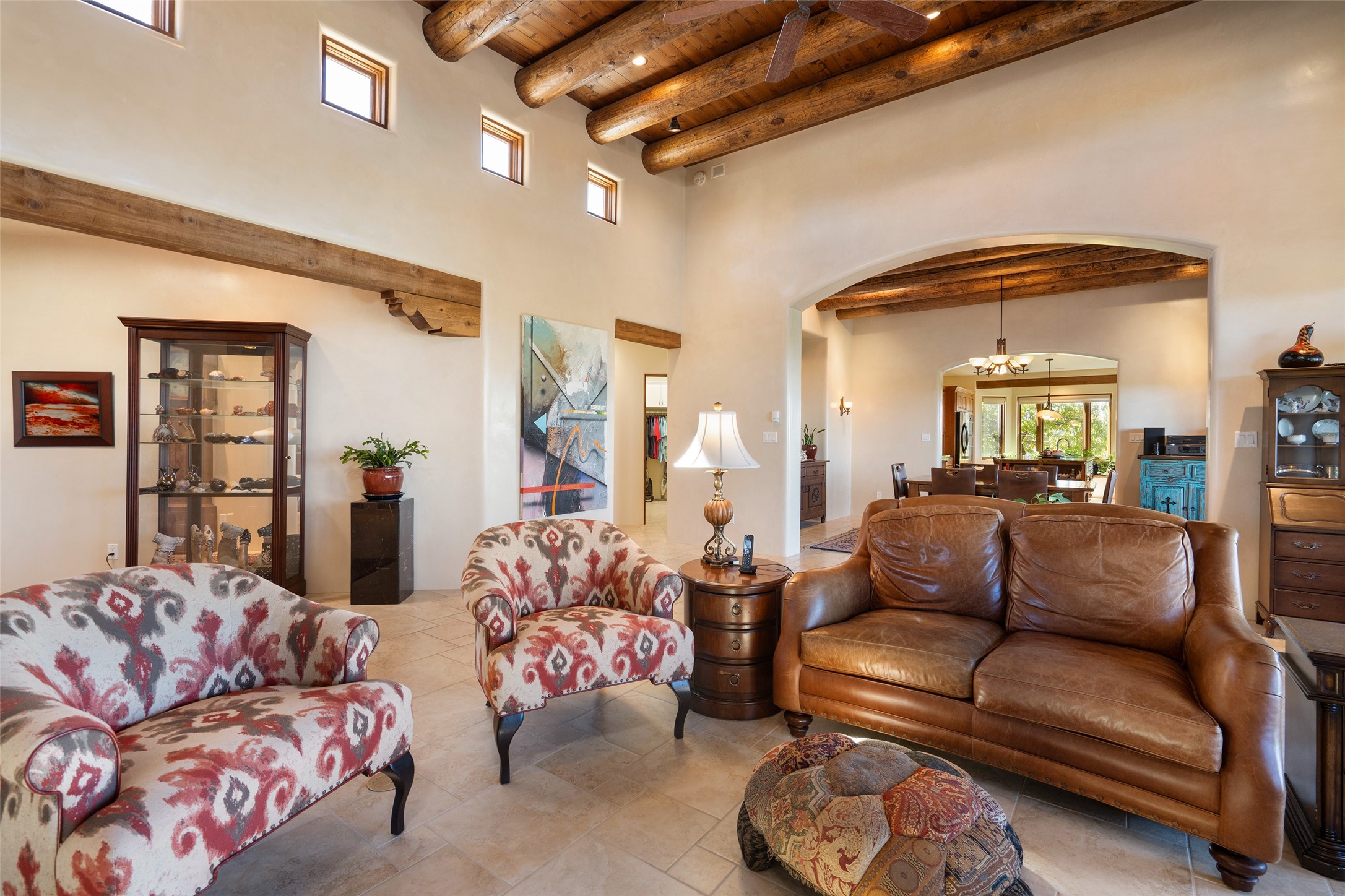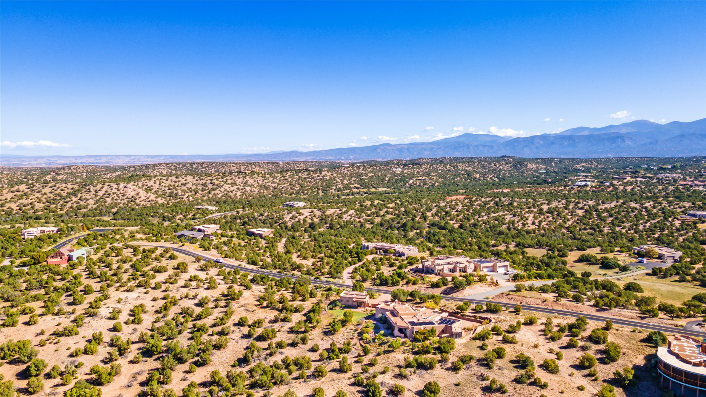 BREATHTAKING SANTA FE STYLE WITH SUNSET VIEWS. Perched on 2.5 acres with unobstructed views of the Western Jemez Mountains, this home was designed with PATTERN LANGUAGE principles in mind including multiple arches that visually repeat throughout the home. This 4-bedroom, 4-bathroom residence (including detached guest house built in 2016) offers the best of Southwestern living with intentional design. Prull Custom Builders built this residence in 2009 for the current owners and the home is sited perfectly to capture glorious sunsets and the dramatic New Mexico landscape, all while blending seamlessly into its natural surroundings. The floor plan ensures excellent separation between the primary suite and guest room, with soaring ceilings, vigas & beams, plastered walls, and abundant natural light throughout. The spacious living room flows to a large sunny gourmet kitchen with multiple granite countertops, a huge island, generous cabinetry, and vistas of the mountains beyond. Radiant in-floor heating and mini-splits provide year-round comfort, while a fully paid Positive Energy solar system keeps electricity costs minimal! The main garage is equipped with EV charging support. Outdoor living is equally inviting with covered portals, brick paver patios, a fireplace, and flagstone paths leading to the guest house - complete with its own garage for added privacy. The landscaped grounds include a fenced backyard for pets and a charming side garden, offering a balance of beauty and function. Free from HOA restrictions, with a newer paved road, privacy and coveted location, this property is an exceptional blend of style, sustainability, and Santa Fe charm.