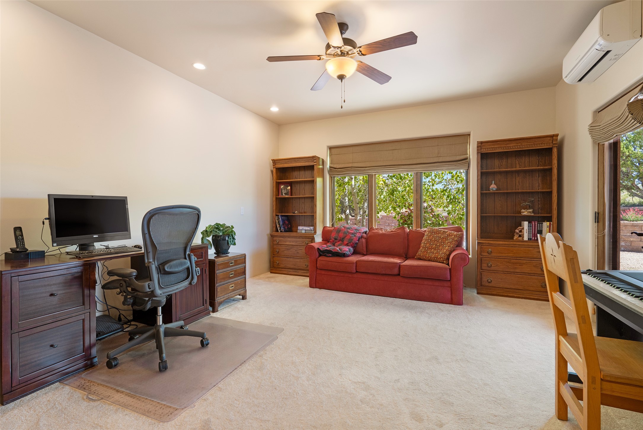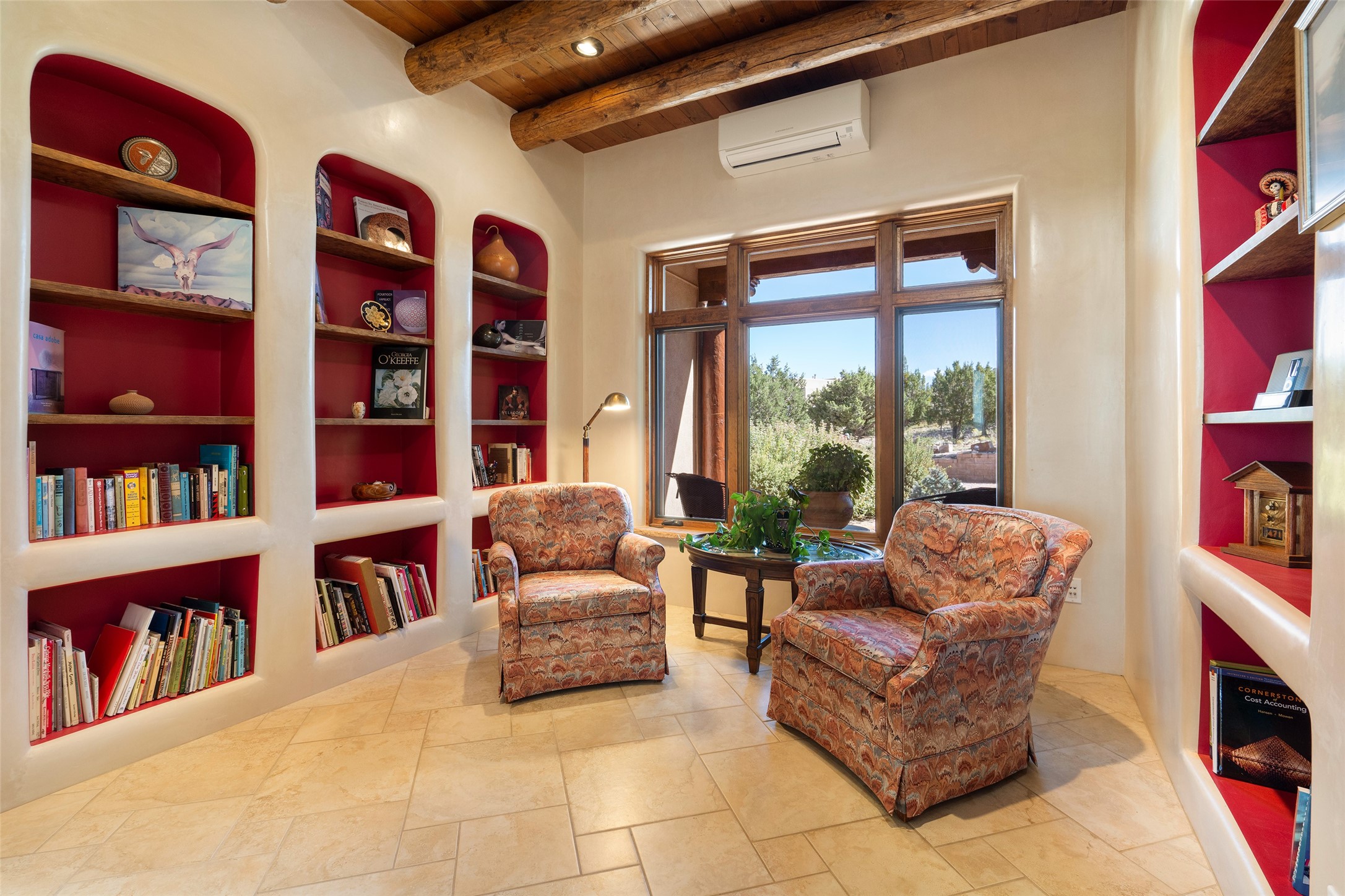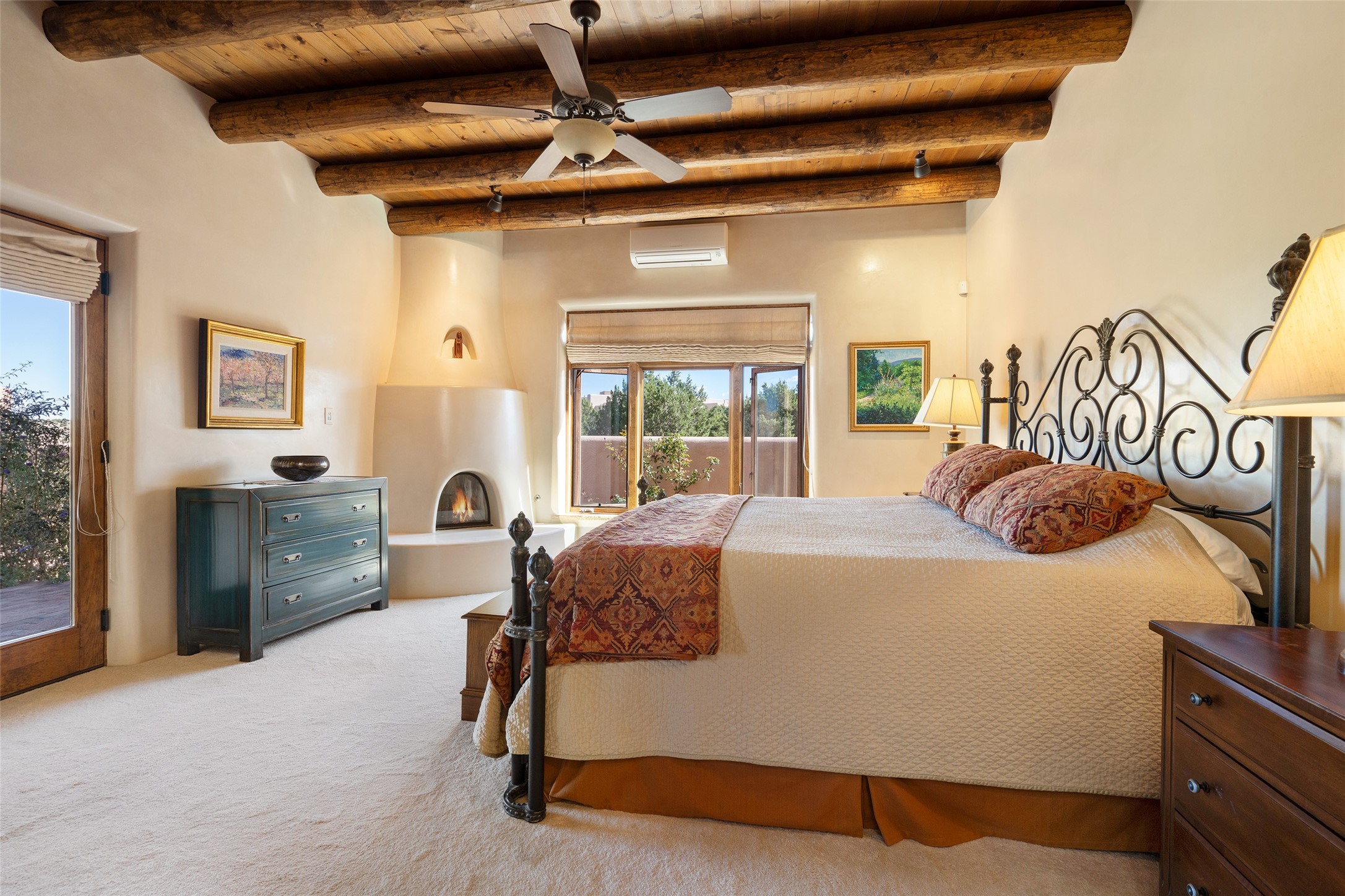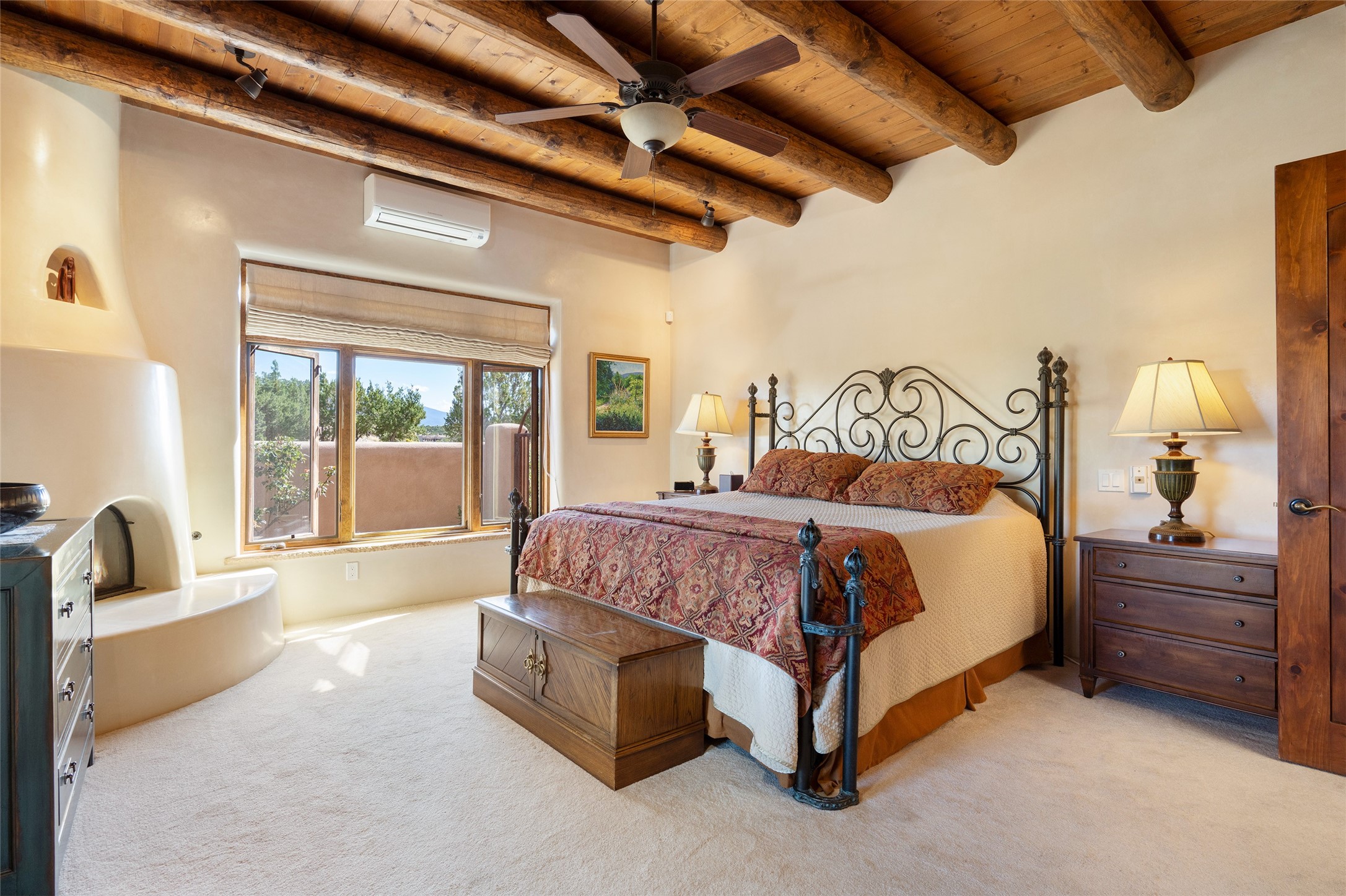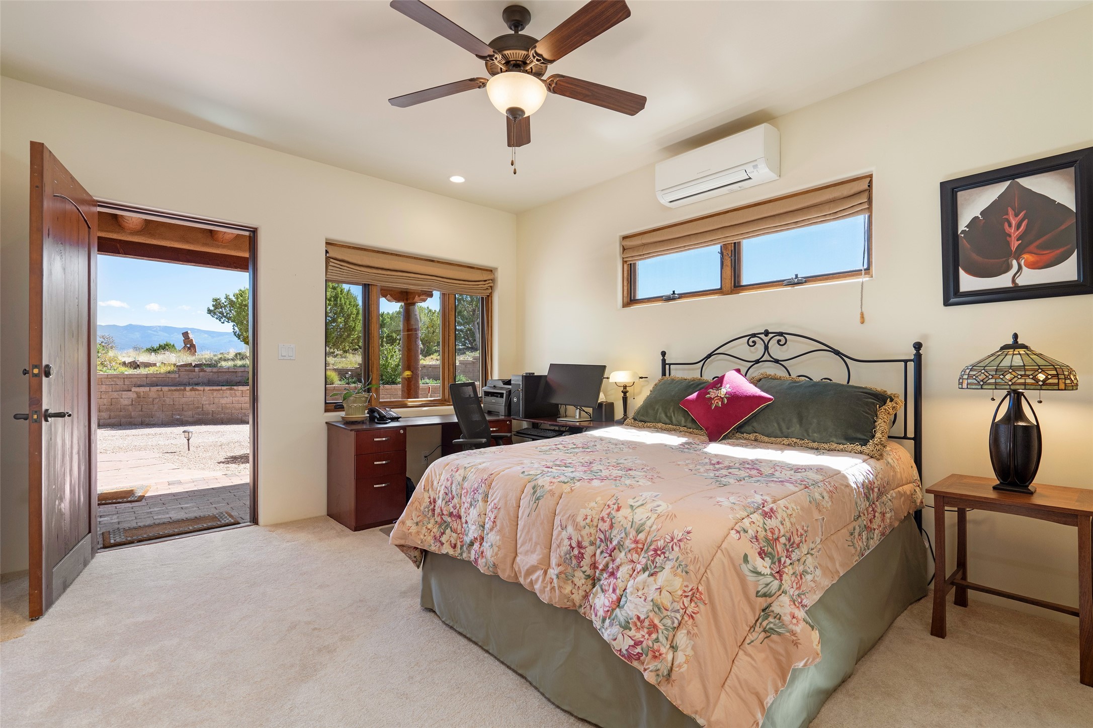 BREATHTAKING SANTA FE STYLE WITH SUNSET VIEWS. Perched on 2.5 acres with unobstructed views of the Western Jemez Mountains, this home was designed with PATTERN LANGUAGE principles in mind including multiple arches that visually repeat throughout the home. This 4-bedroom, 4-bathroom residence (including detached guest house built in 2016) offers the best of Southwestern living with intentional design. Prull Custom Builders built this residence in 2009 for the current owners and the home is sited perfectly to capture glorious sunsets and the dramatic New Mexico landscape, all while blending seamlessly into its natural surroundings. The floor plan ensures excellent separation between the primary suite and guest room, with soaring ceilings, vigas & beams, plastered walls, and abundant natural light throughout. The spacious living room flows to a large sunny gourmet kitchen with multiple granite countertops, a huge island, generous cabinetry, and vistas of the mountains beyond. Radiant in-floor heating and mini-splits provide year-round comfort, while a fully paid Positive Energy solar system keeps electricity costs minimal! The main garage is equipped with EV charging support. Outdoor living is equally inviting with covered portals, brick paver patios, a fireplace, and flagstone paths leading to the guest house - complete with its own garage for added privacy. The landscaped grounds include a fenced backyard for pets and a charming side garden, offering a balance of beauty and function. Free from HOA restrictions, with a newer paved road, privacy and coveted location, this property is an exceptional blend of style, sustainability, and Santa Fe charm.