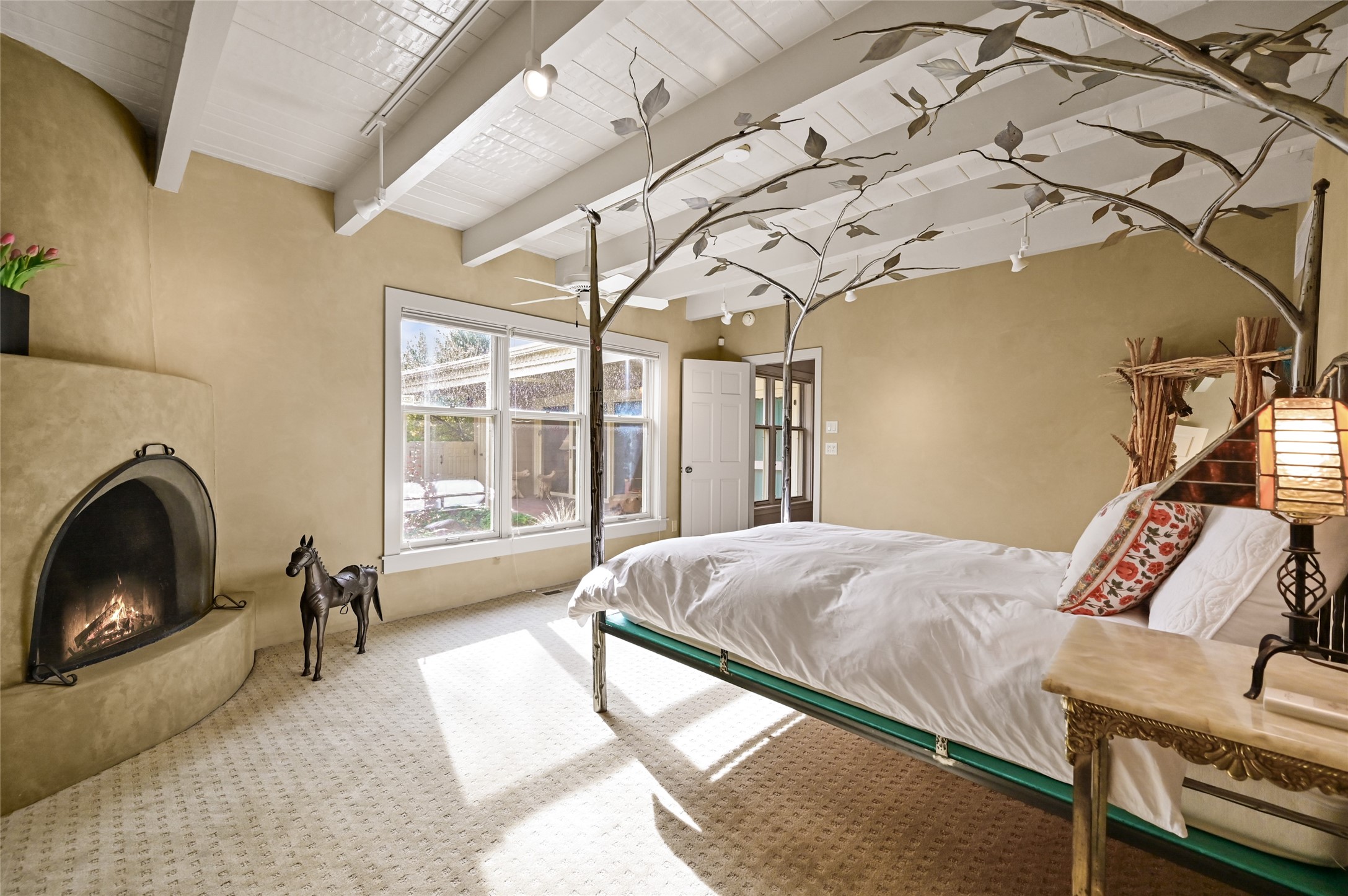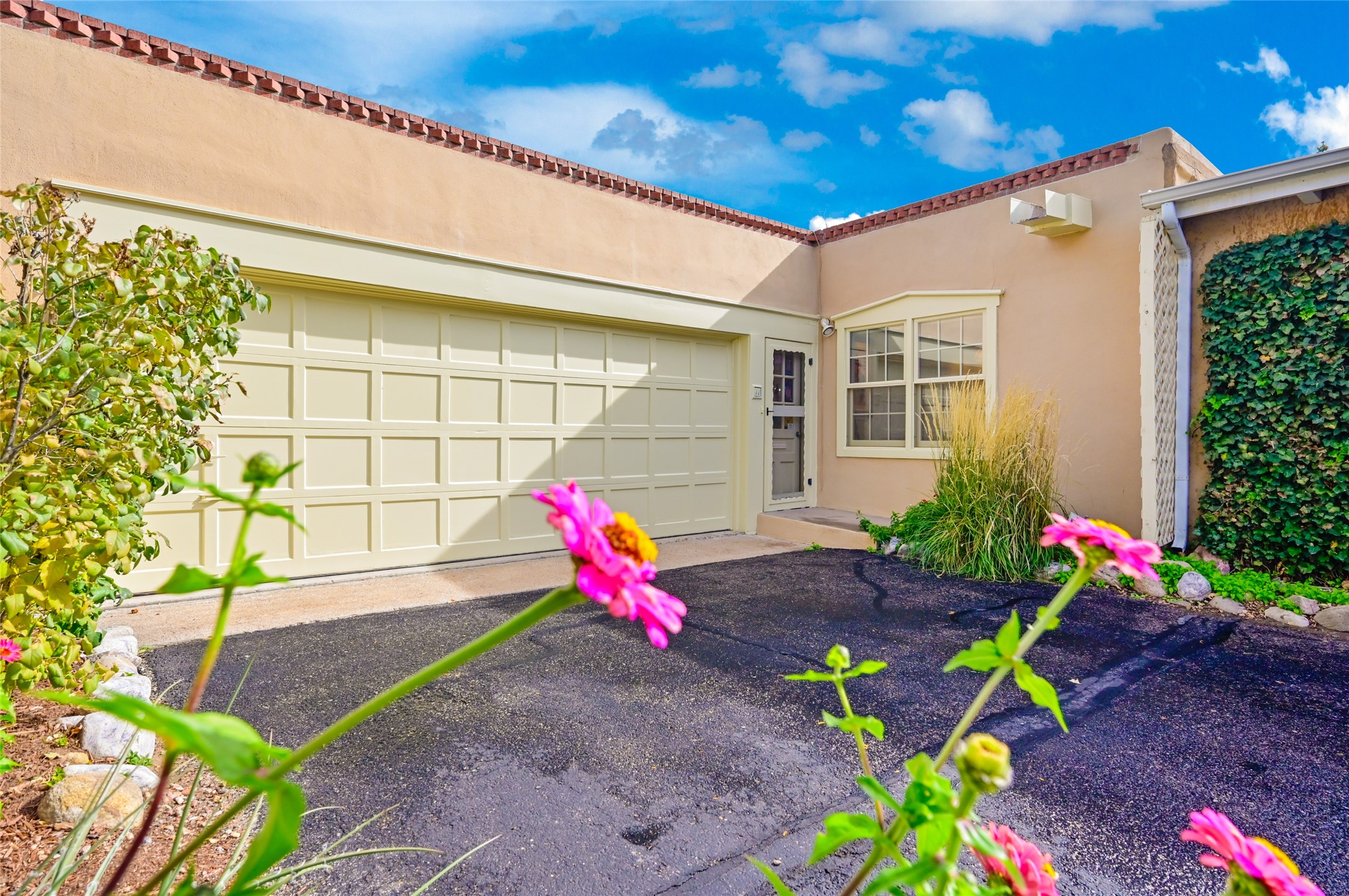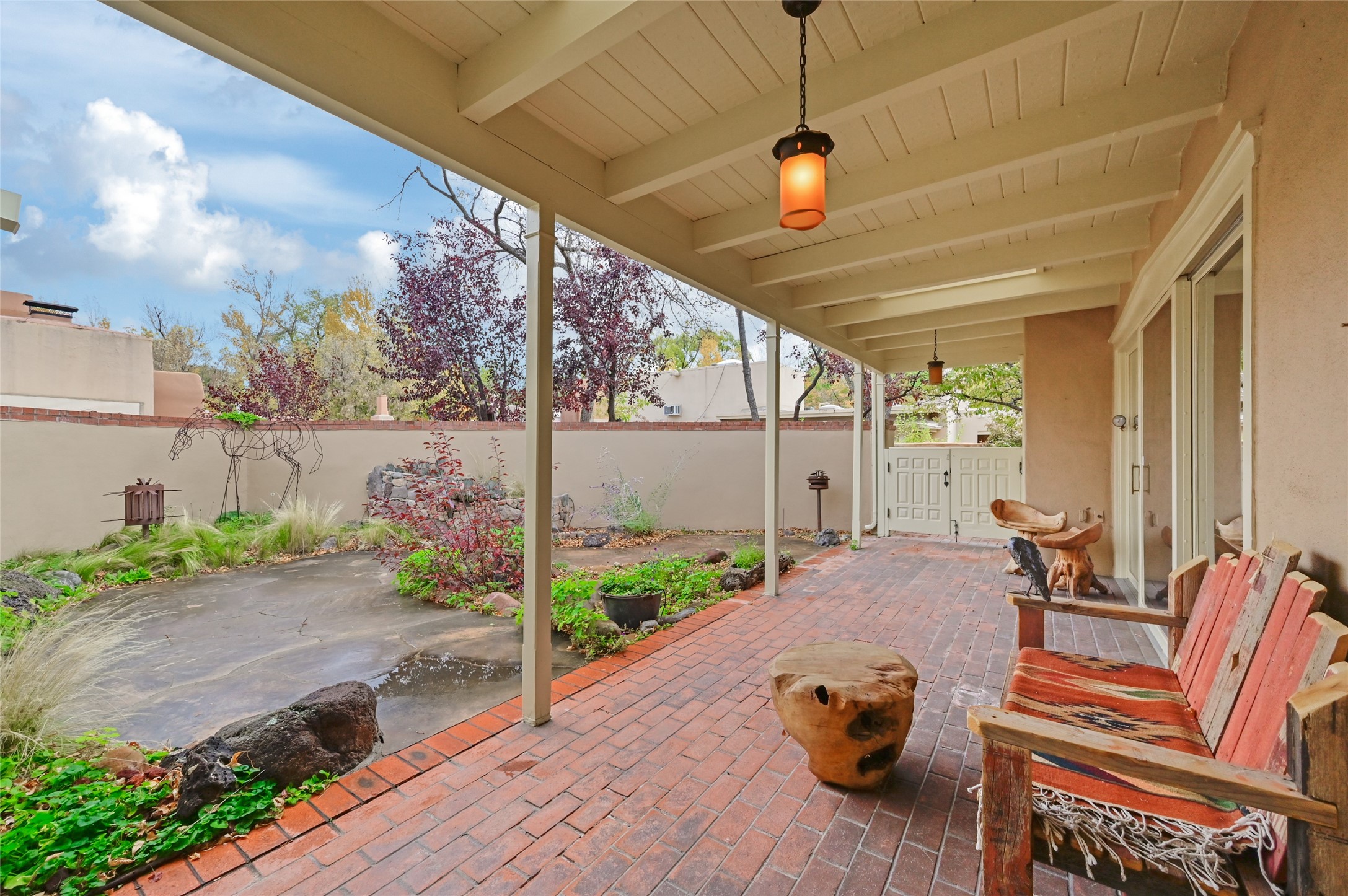 In the heart of Santa Fe, where art, culture, and cuisine intertwine, lies a hidden gem within the exclusive gates of The Compound Condos. Sheltered by graceful old trees and surrounded by lush, mature gardens, this residence offers a quiet escape moments from Canyon Road and the pulse of downtown. A private courtyard welcomes you inside, where sunlight pours through large windows and sliding doors, illuminating a warm living space anchored by a classic fireplace. Here, mornings begin with the scent of brewed coffee and evenings drift easily into fireside conversations. The open country kitchen, complete with generous counter space, vigas, and skylights, feels like the heart of the home. The primary suite, which captures the soft glow of the eastern light includes a kiva fireplace, a spacious dressing area, laundry, and full bath. A comfortable guest suite with walk-in closet and 3/4 bath ensures everyone feels at home. A heated two-car garage with an extra storage room adds practicality to this serene and private haven. A rare offering, where every detail reflects the timeless charm and understated feel of Santa Fe living.