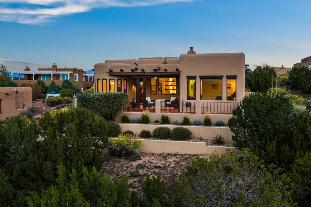 AMAZING VIEWS! Panoramic golf course, lake, Jemez Mountain and sunset views from this beautiful 3 bedroom & 2 bath Las Campanas home. Situated on an elevated lot overlooking the 14th fairway of the Jack Nicklaus designed Sunset Golf Course, this thoughtfully designed home is ideal as a permanent residence or turn-key second home. Wonderful open concept living is anchored by the cozy kiva fireplace on one end...and on the other a beautiful chef's kitchen where you'll find the spacious island with hammered copper farmhouse sink, top of the line appliances, generous pantry and beautiful dining area. Expansive windows capture the views, with French doors leading out to your covered portal for ideal outdoor entertaining. Your spacious Primary Suite enjoys those same incredible views and access to the portal, a spa-inspired bath featuring a jetted tub, walk in shower, double vanity and generous walk in closet. The Guest accommodations are nicely separated for privacy. Beautiful design features throughout... niches and built in shelving to showcase your art, classic vigas, cozy built in seating, roll down sun shades, custom doors & custom cabinetry. Additional highlights include new roof installed 2024 (transferable warranty), new refrigerator, new hot water heater, new patio railings and courtyard gates. Make this your ideal Santa Fe retreat!