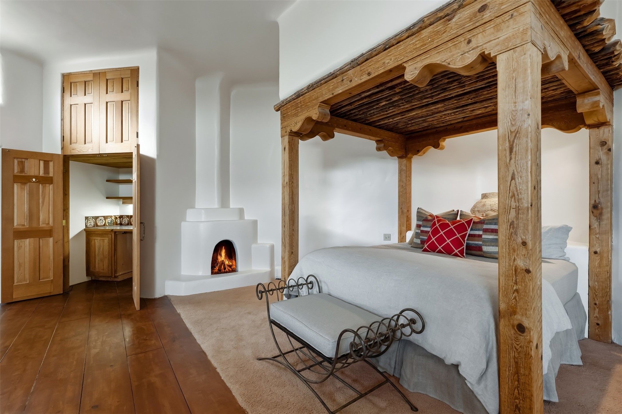 In the quaint village of Galisteo lies this gracious and majestic home with adjoining 5 acre lot, for a total of 10 acres, known as 'Hacienda del Sol." One hundred years ago was the site of the Old Galisteo School House. The original 1886 bell and corner stone 1938 were placed within the walls of this present day home. Built atop of a gentle hill with stunning views of the Galisteo Basin, Sangre de Cristos and Jemez Mountains along with huge white puffy cloud formations in a brilliant blue sky greet you everyday. Large rooms with cathedral ceilings flooded with light, sculptured fireplaces, oak and pine floors with 10 foot elegantly carved doors delight the eye upon entering. Screened in, is a lovely outdoor patio with vast, distant views. A gallery hallway runs the length of the house craving art, paintings, photographs, memorabilia. A chef's kitchen with a six burner stove, center islands, prep sinks has everything one would want. An elegant dining room with arched walls, subtle lighting, and carved cabinets allow for many guests or small intimate settings. Three Bedroom suites each with fireplaces and luscious bathrooms are perfectly placed for privacy. An attached "casita" with kitchen and bath is off one of the wings of the home. Outside, there is a circular, walled patio area for summer gatherings and moon lit nights. Included in this fabulous property is a blue gate opening up to an adjoining 5 acre parcel of vacant land accessed off of Camino San Cristobal used for pleasure or as additional acreage for another home, studio, horses, and imagination. Dream on...