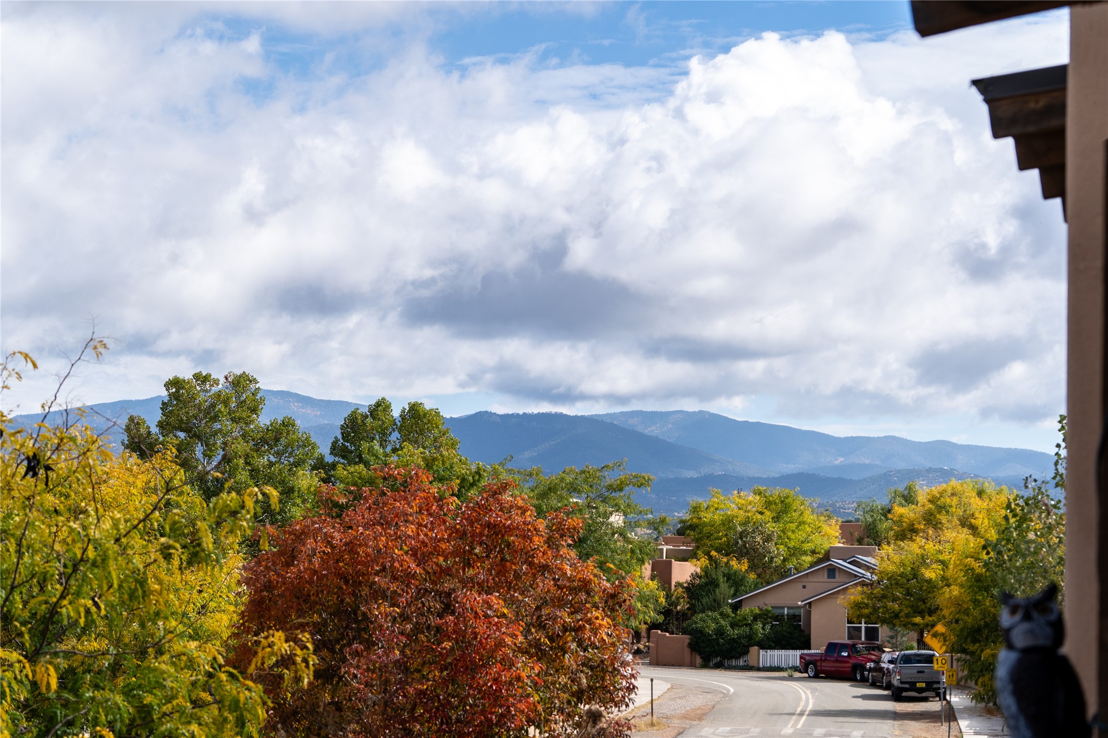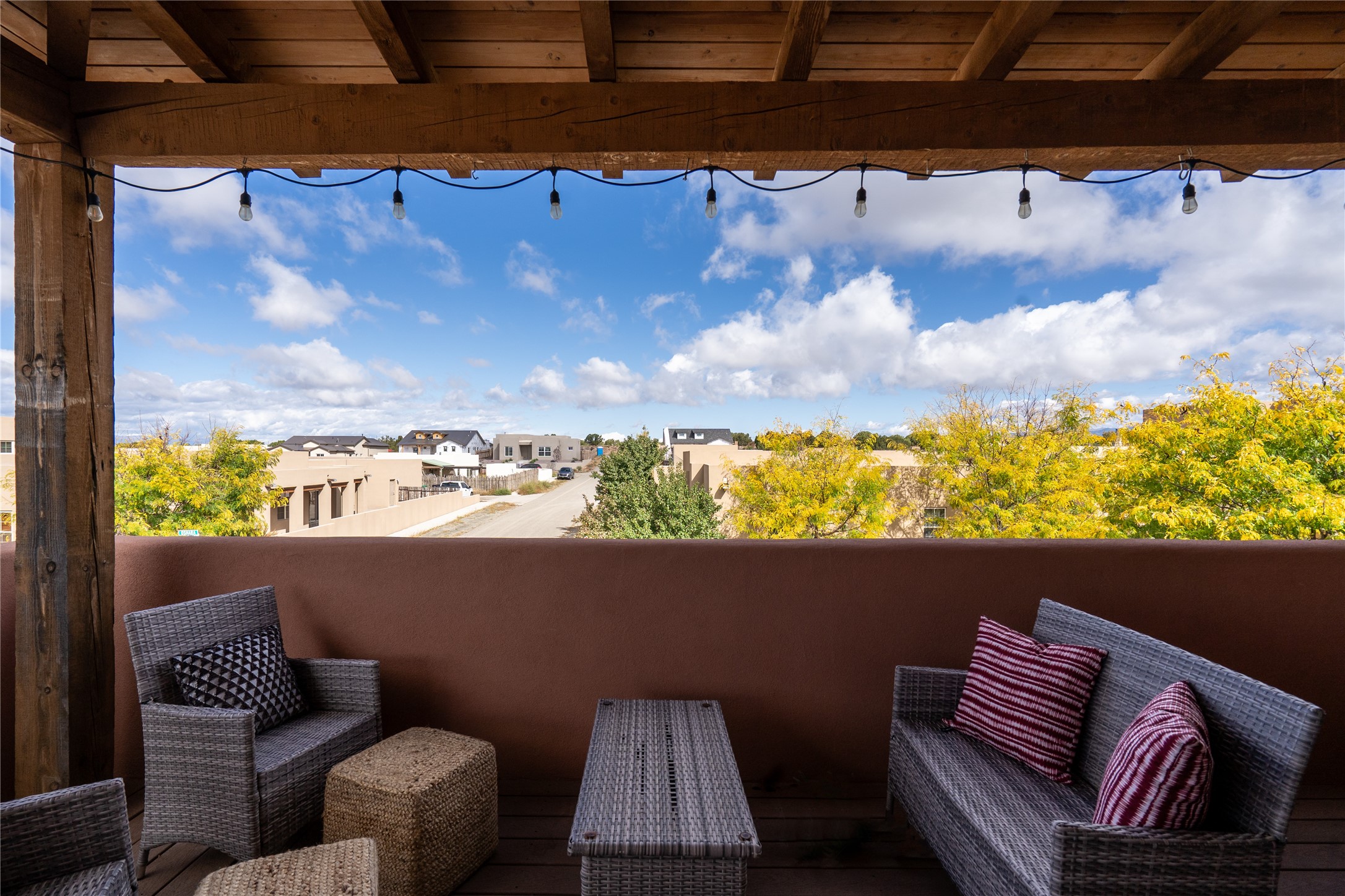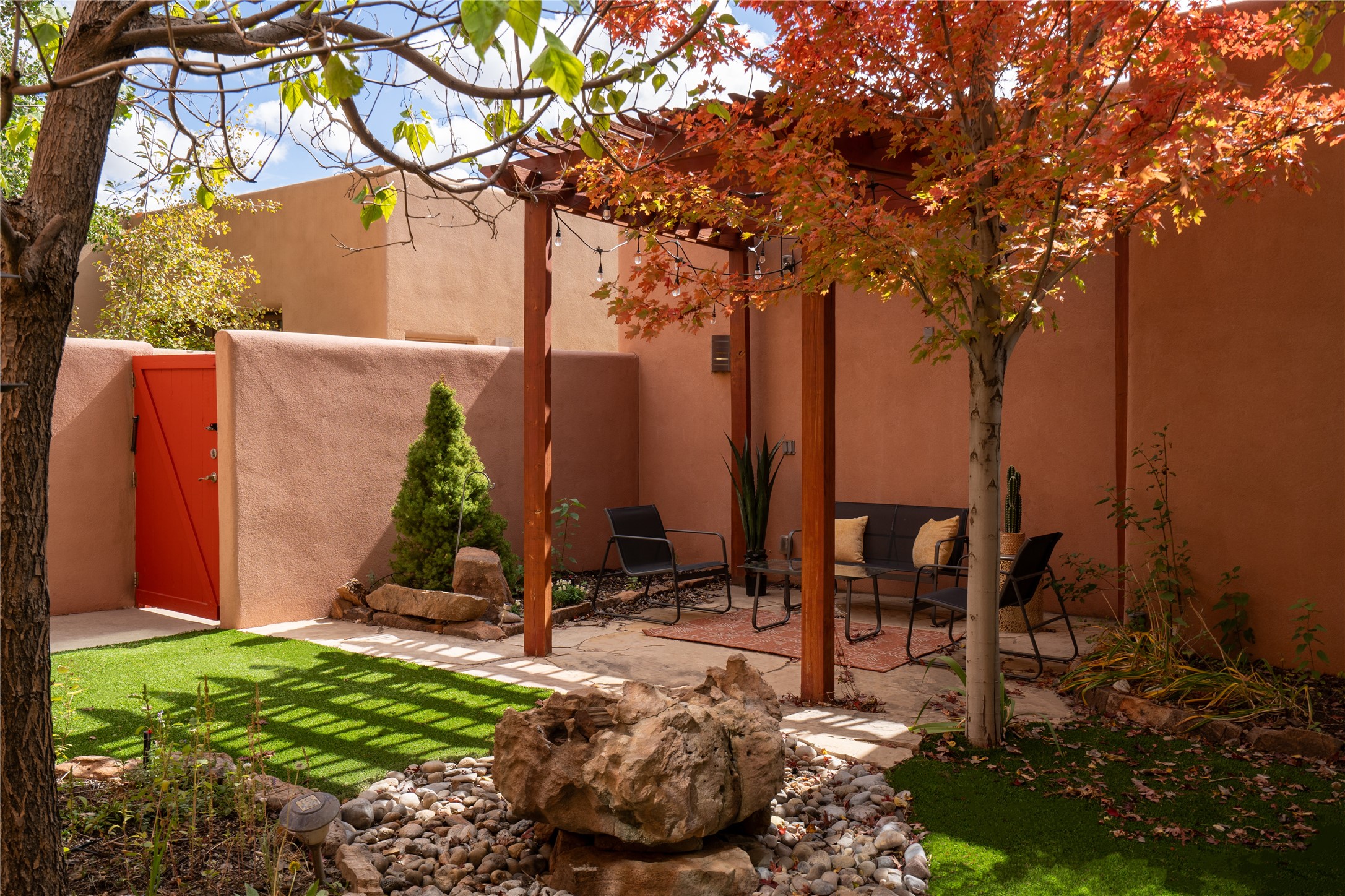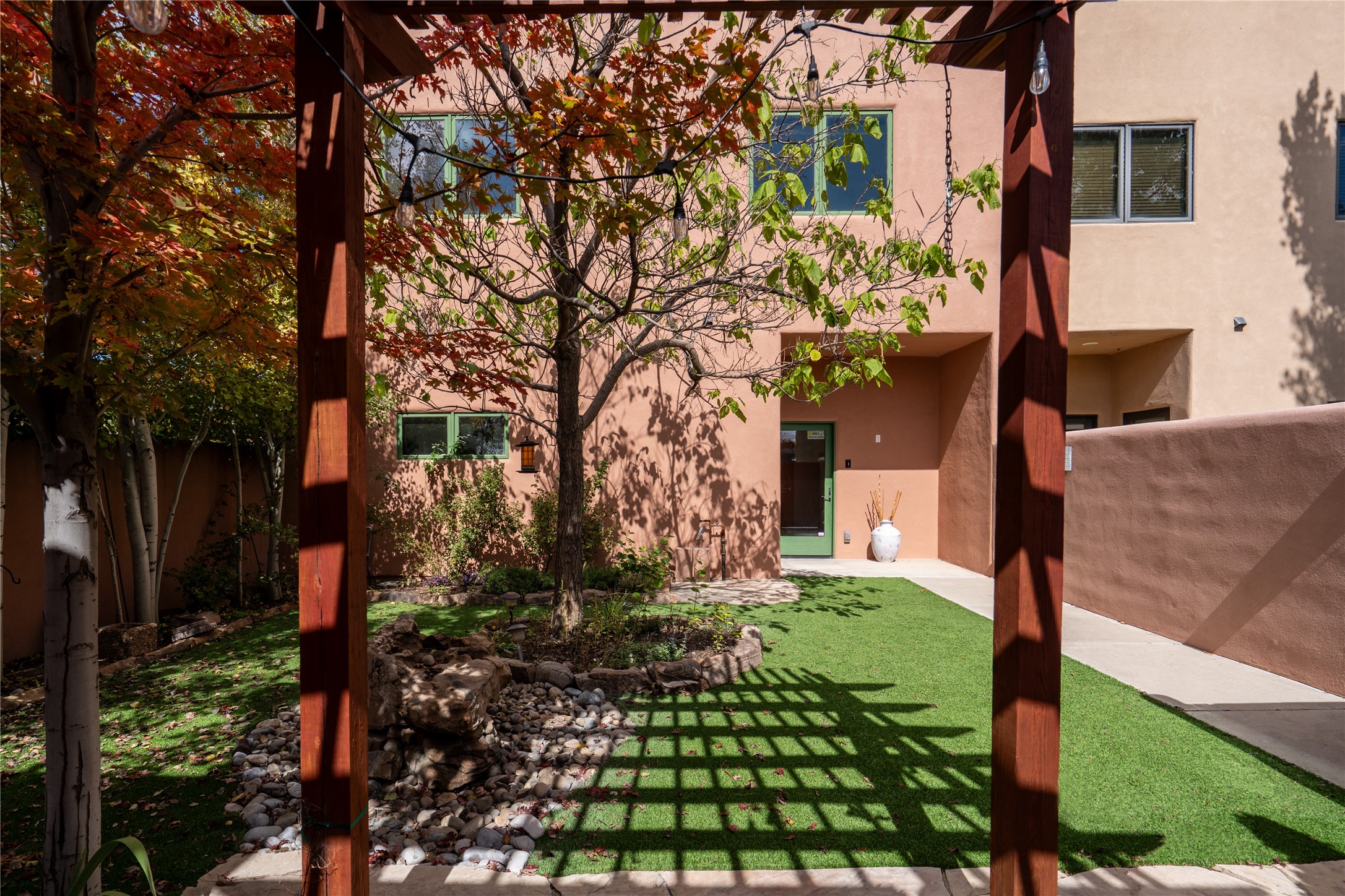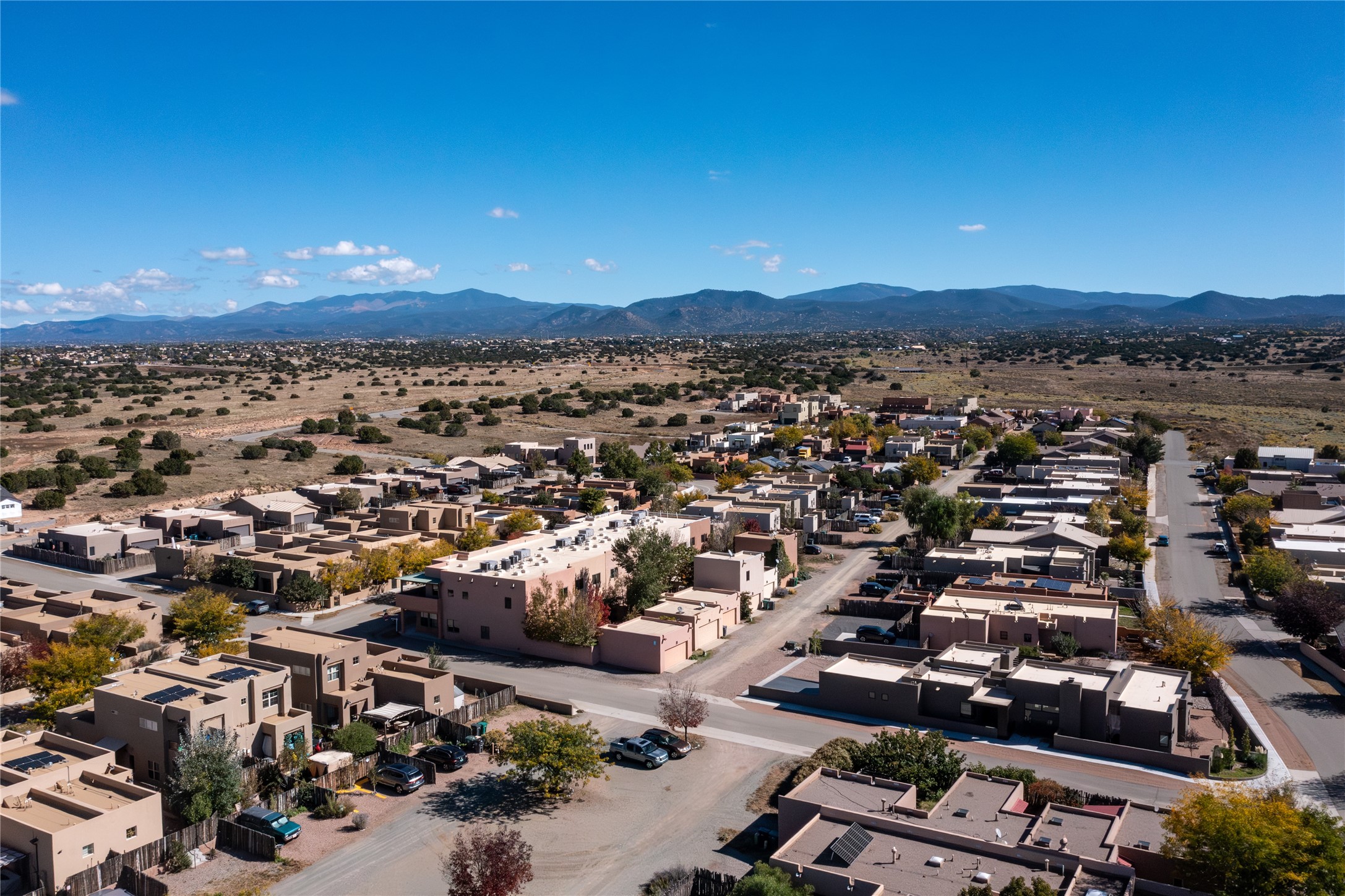 This modern corner-lot property in desirable Oshara Village offers the perfect blend of work and lifestyle flexibility. The ground floor features a spacious gallery/workshop--ideal for an artist, creative professional, or small business--divided into two rooms with expansive windows that flood the space with natural light. Additional highlights include a half-bath, workspace with a sink, durable concrete floors, and a lovely walled courtyard with flagstone, artificial grass, a pergola entertaining area, fountain, and mature landscaping, with direct access to a two-car garage.Upstairs, the light-filled two-bedroom, two-bath residence impresses with soaring ceilings, large windows, and an open floor plan. The chef's kitchen includes abundant workspace, a barstool-friendly island, sleek tile backsplash, and a GE Monogram six-burner cooktop/oven. The living area extends to a delightful outdoor deck, perfect for entertaining or enjoying mountain views. Luxury vinyl plank floors run throughout, creating a warm, modern feel.The spacious primary suite boasts a California Closets walk-in with built-ins, plus a spa-like bathroom with dual sinks, soaking tub, and separate shower. A second upstairs entrance from the back courtyard offers added flexibility--allowing the option to rent one level while living in the other.This unique property is a rare opportunity to combine work and home life in one stylish, functional space--or two separate spaces. Many other adjacent homes have also repurposed the downstairs as living space to provide the ultimate in comfort with multiple living areas. The popular Pantry Dos restaurant is within walking distance, along with an inviting community park and sculpture garden. The Santa Fe Community College with gym and swimming pool is nearby, and Richards and Rabbit Road offer easy access to Cerrillos/Zafarano shopping and the St. Francis Drive shopping area. The Plaza is an easy 15-minute drive.