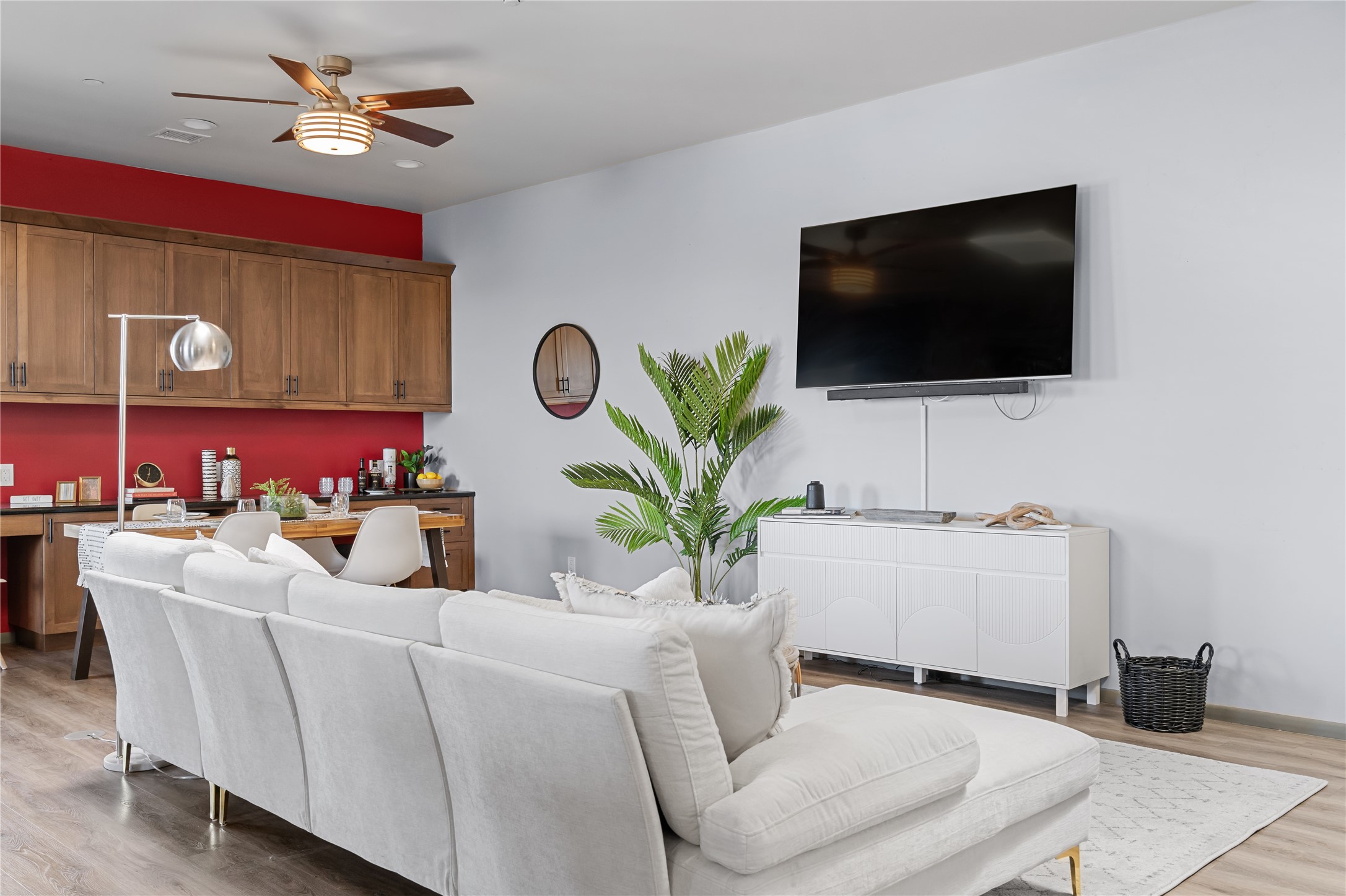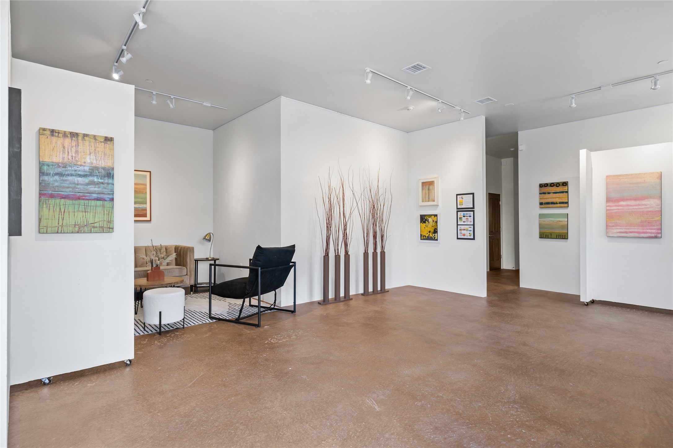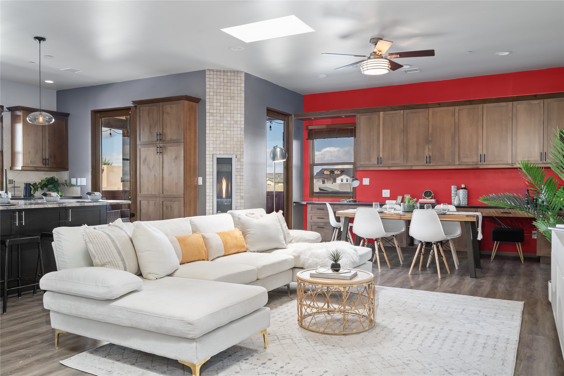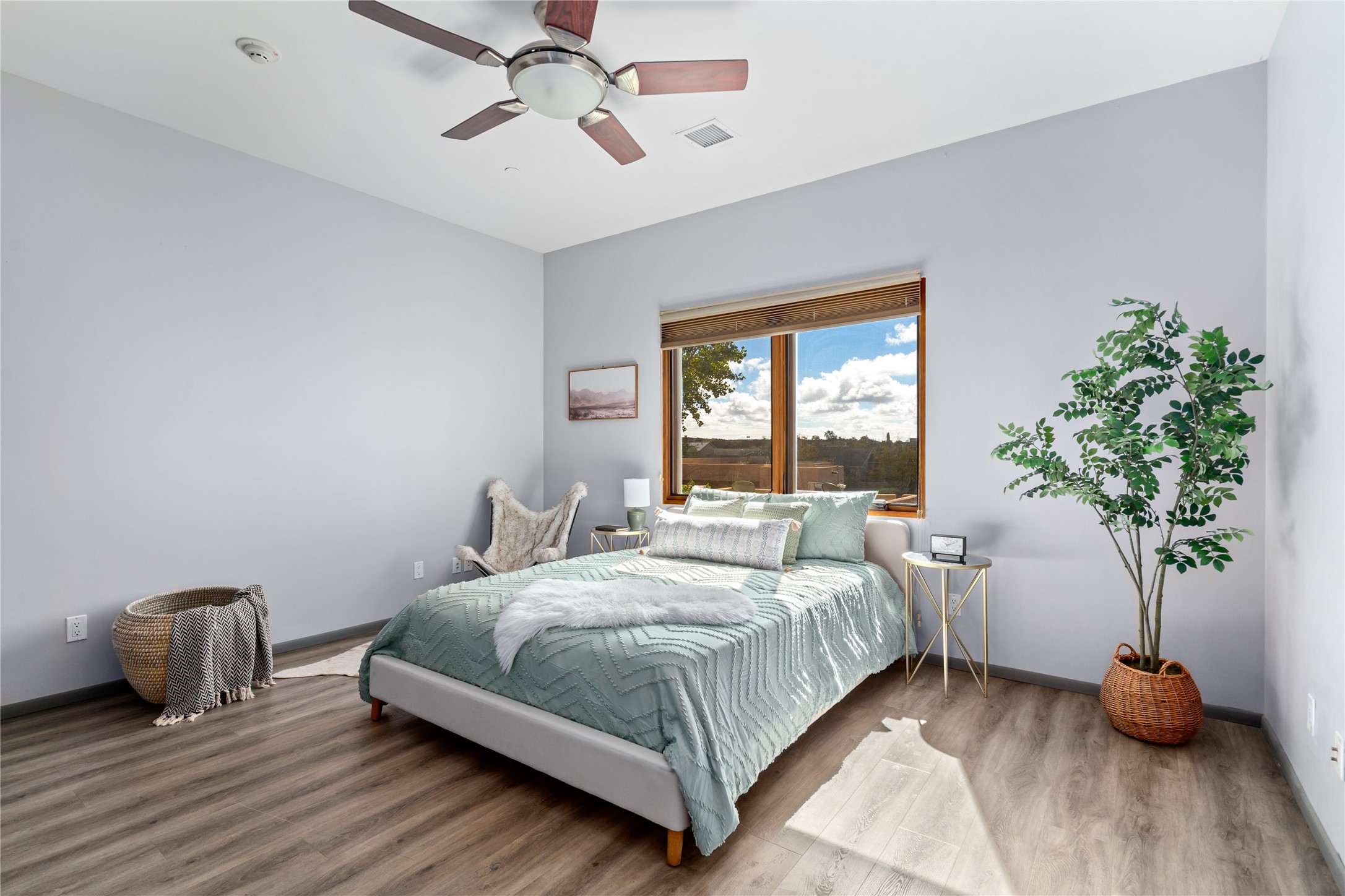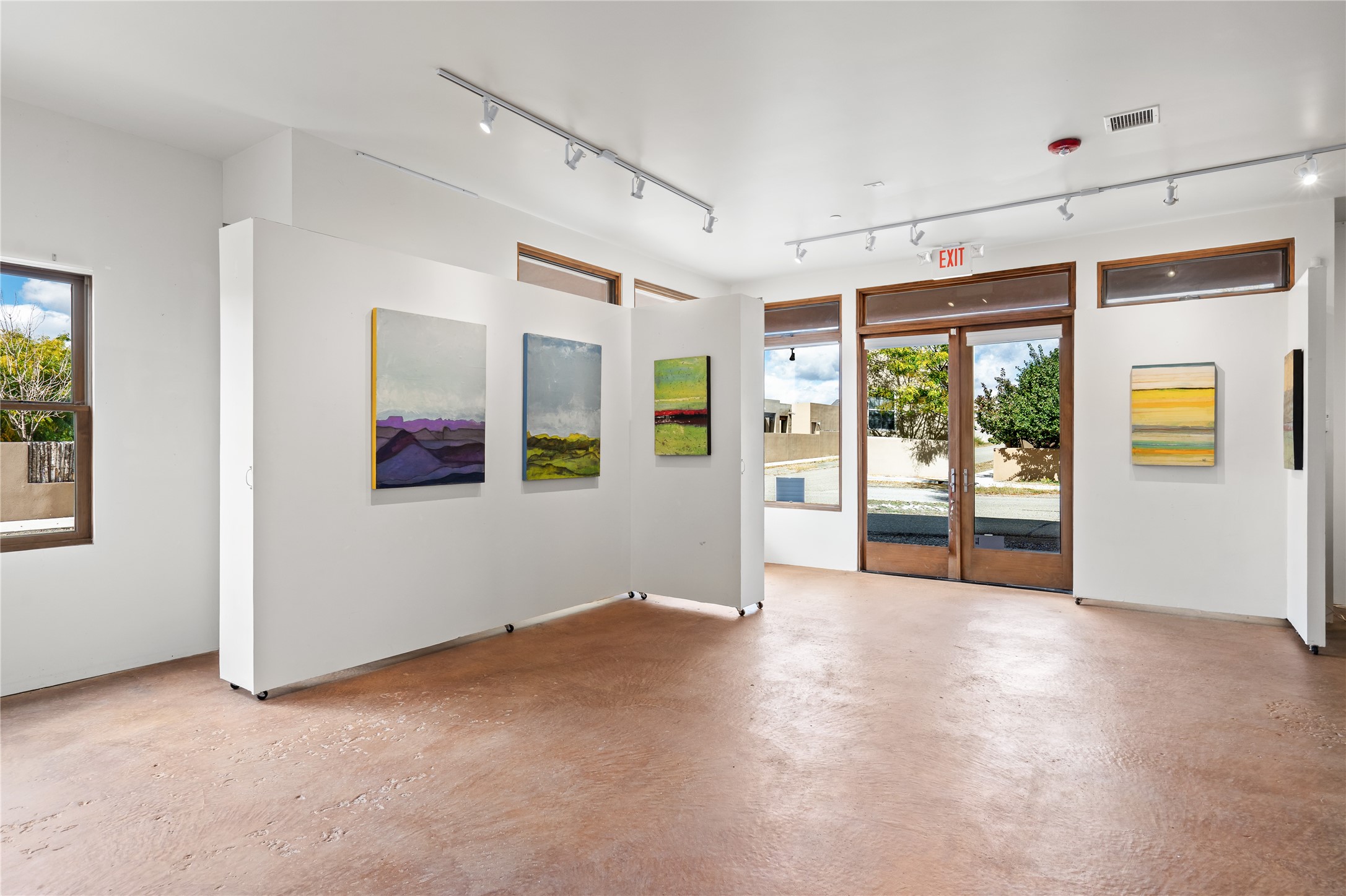 This modern corner-lot property in desirable Oshara Village offers the perfect blend of work and lifestyle flexibility. The ground floor features a spacious gallery/workshop--ideal for an artist, creative professional, or small business--divided into two rooms with expansive windows that flood the space with natural light. Additional highlights include a half-bath, workspace with a sink, durable concrete floors, and a lovely walled courtyard with flagstone, artificial grass, a pergola entertaining area, fountain, and mature landscaping, with direct access to a two-car garage.Upstairs, the light-filled two-bedroom, two-bath residence impresses with soaring ceilings, large windows, and an open floor plan. The chef's kitchen includes abundant workspace, a barstool-friendly island, sleek tile backsplash, and a GE Monogram six-burner cooktop/oven. The living area extends to a delightful outdoor deck, perfect for entertaining or enjoying mountain views. Luxury vinyl plank floors run throughout, creating a warm, modern feel.The spacious primary suite boasts a California Closets walk-in with built-ins, plus a spa-like bathroom with dual sinks, soaking tub, and separate shower. A second upstairs entrance from the back courtyard offers added flexibility--allowing the option to rent one level while living in the other.This unique property is a rare opportunity to combine work and home life in one stylish, functional space--or two separate spaces. Many other adjacent homes have also repurposed the downstairs as living space to provide the ultimate in comfort with multiple living areas. The popular Pantry Dos restaurant is within walking distance, along with an inviting community park and sculpture garden. The Santa Fe Community College with gym and swimming pool is nearby, and Richards and Rabbit Road offer easy access to Cerrillos/Zafarano shopping and the St. Francis Drive shopping area. The Plaza is an easy 15-minute drive.