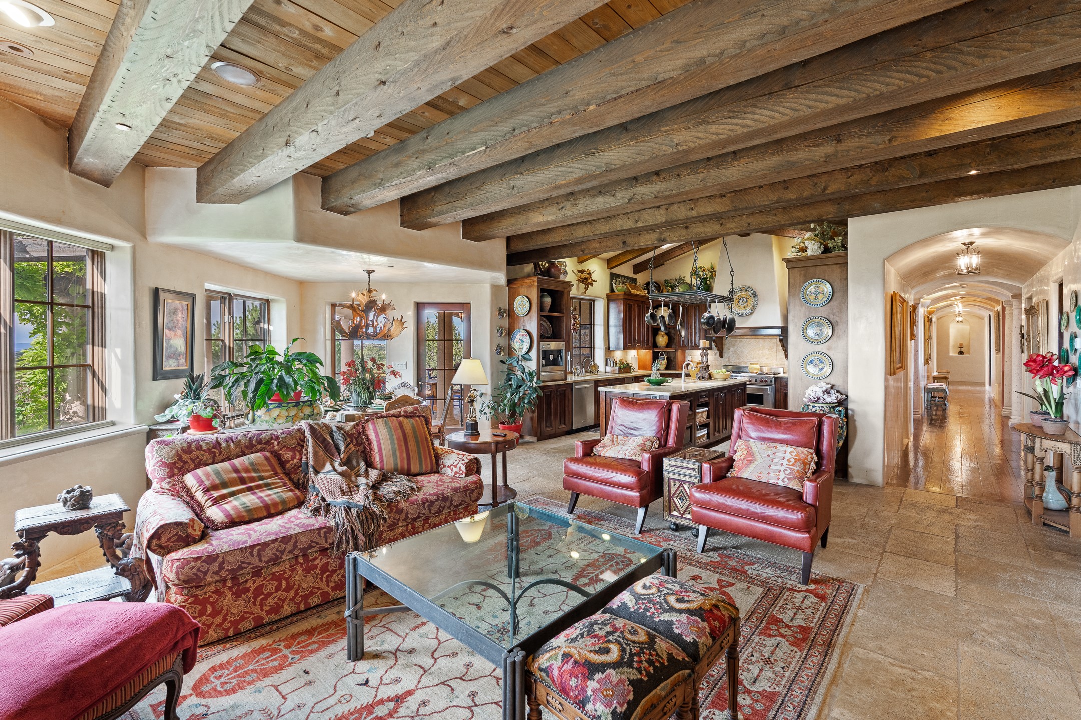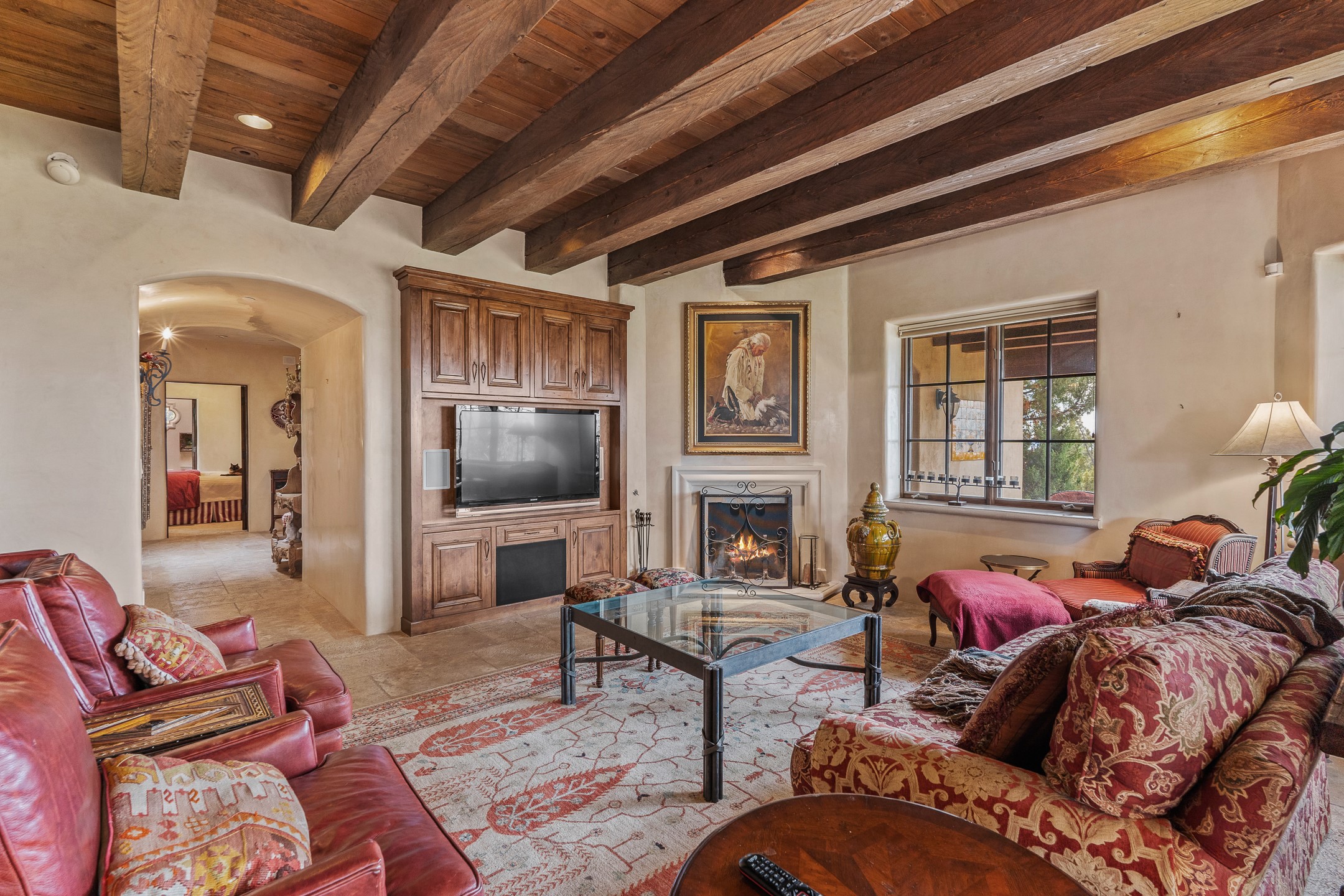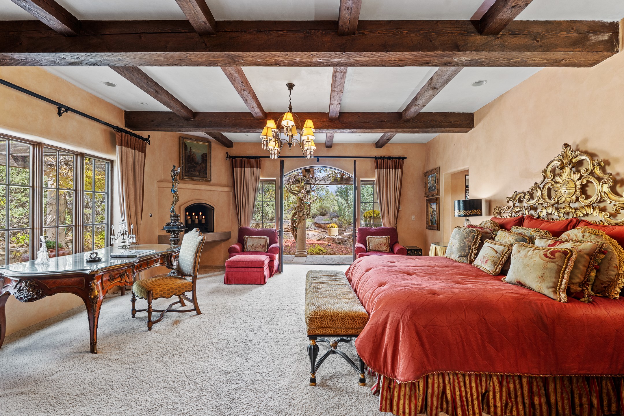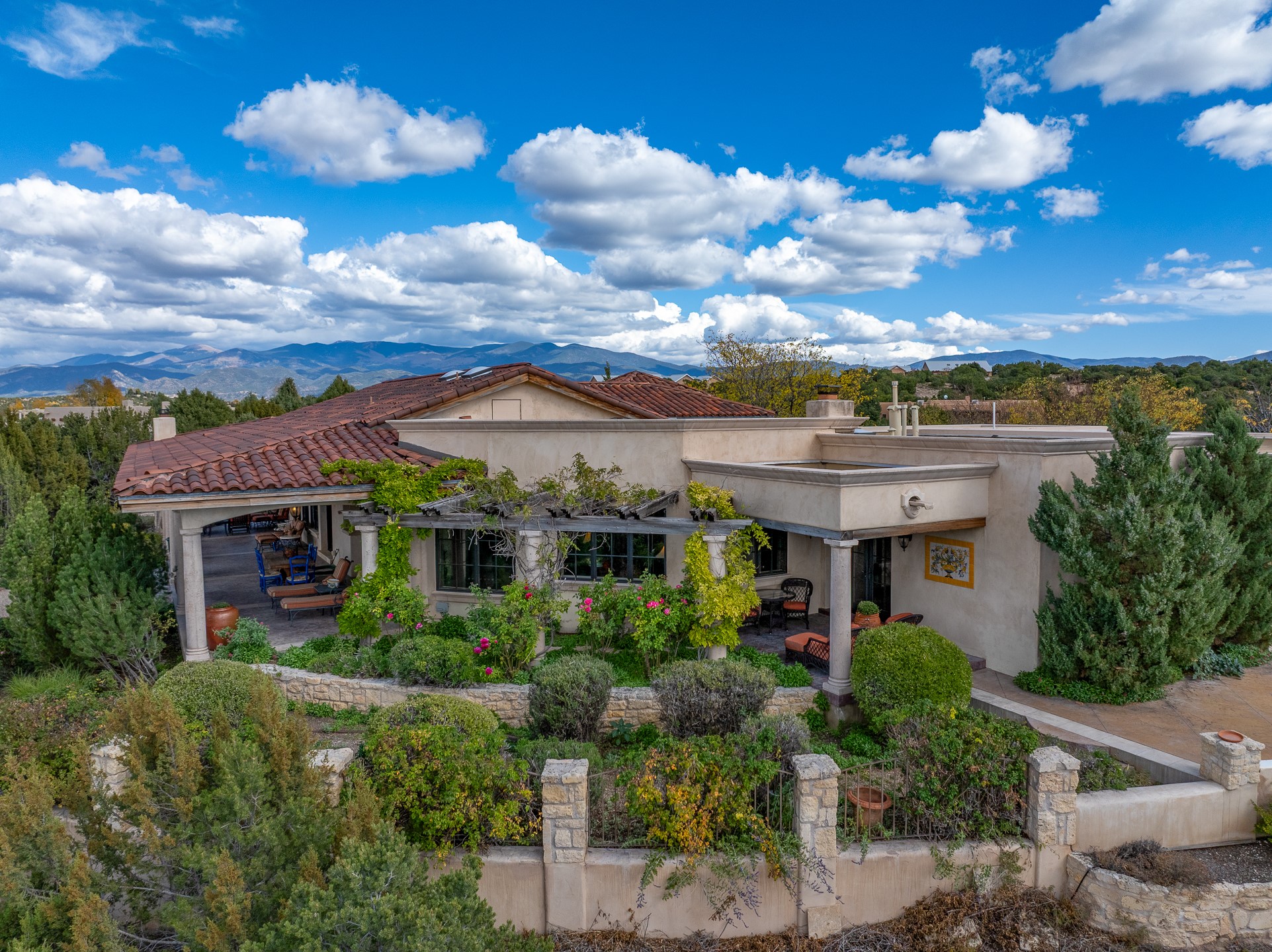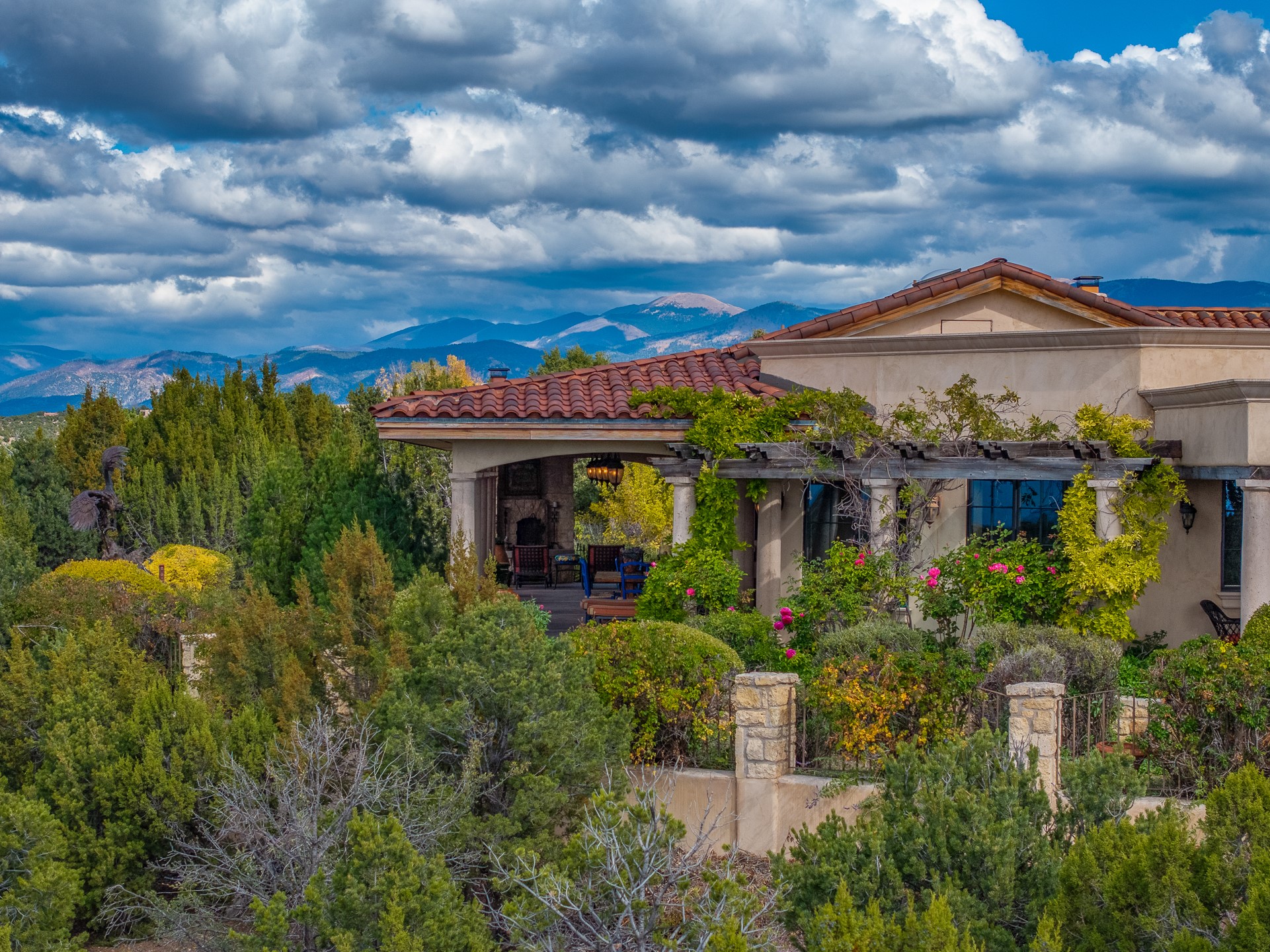 For those drawn to the romance of Italy, this extraordinary residence captures the essence of a Tuscan villa translated beautifully into the high desert landscape of Santa Fe. Nestled on 2.5 acres in the coveted Sundance Estates, this home with 4 bedrooms plus an office, 4.5 baths, and a 3-car garage offers 5,013 square feet of refined living, crafted with exquisite detail and timeless materials. Beyond stately wrought-iron gates, cupid sculptures and a stamped and colored concrete drive lead to a grand arrival with limestone walls, a graceful fountain, and hand-hewn double doors. Inside, rich walnut and travertine floors create a harmonious blend of warmth and sophistication. Diamond plaster walls, coved plaster ceilings, and rustic wood trestle beams evoke the artistry of old-world Europe, while expansive windows and French doors frame breathtaking mountain and sunset vistas. The chef's kitchen is a showpiece--adorned with alder cabinetry, granite countertops, a Wolf range, a Subzero refrigerator, a built-in Miele coffee center, and a wine cooler. Here you'll be romanced by a generous island, casual dining area, and adjoining family room with a fireplace, creating an inviting central gathering space. The kitchen and living room open to a deep covered portal designed for alfresco entertaining, featuring an outdoor kitchen, limestone fireplace, and rose garden.The east wing hosts the elegant primary suite with its own fireplace, private portal, and in-ground spa with a waterfall. The spa-like bath offers dual vanities, a soaking tub, and a large walk-in shower, while the custom closet provides both beauty and functionality. On the west side of the home, you will find 2 guest suites providing separation and privacy. There is also a handsome study with a built-in desk and shelves, and a view to the front garden and fountain. Additionally, there is a private casita with its own entrance, kitchenette, and ensuite bath offers comfort and independence for guests.