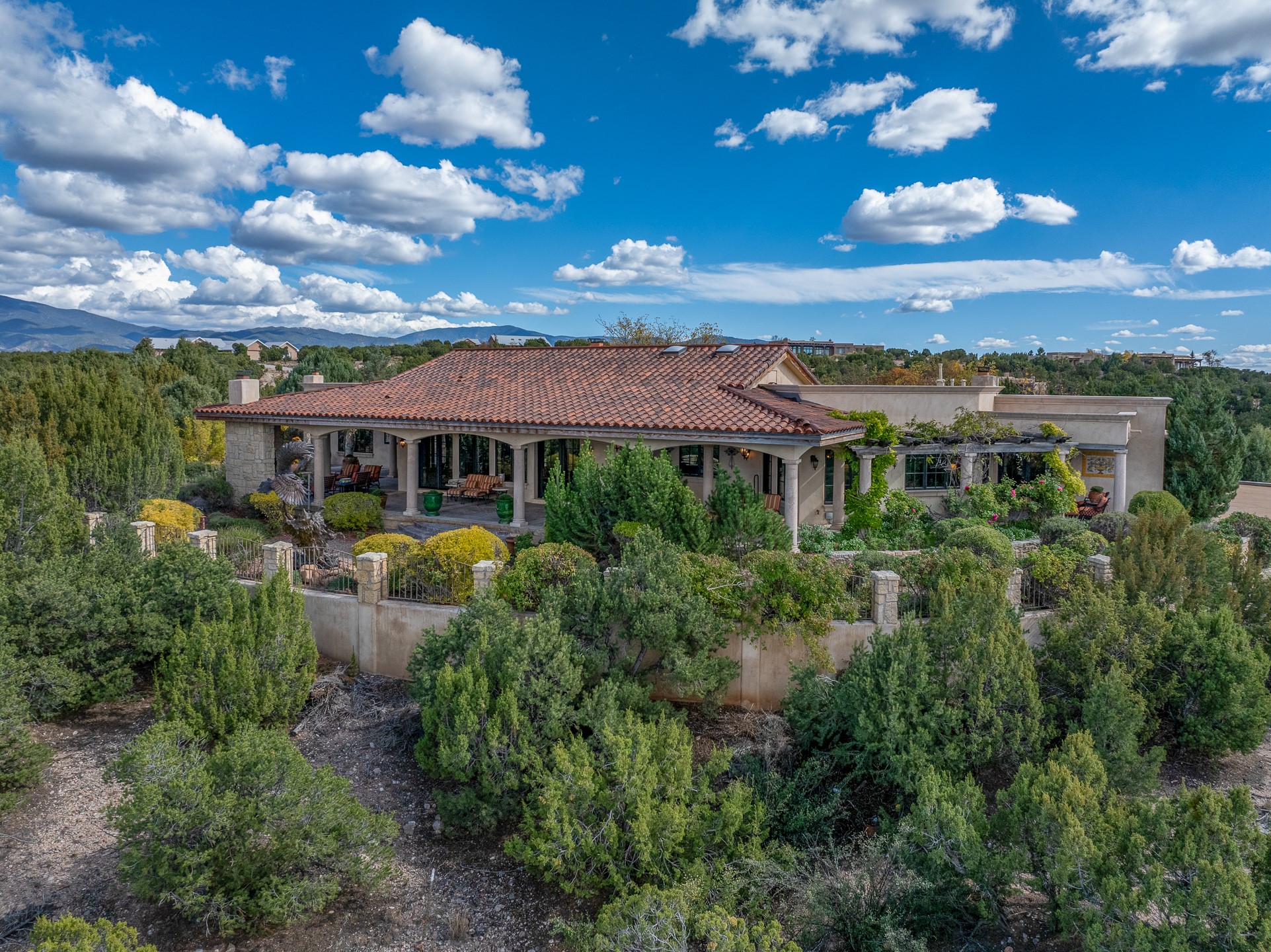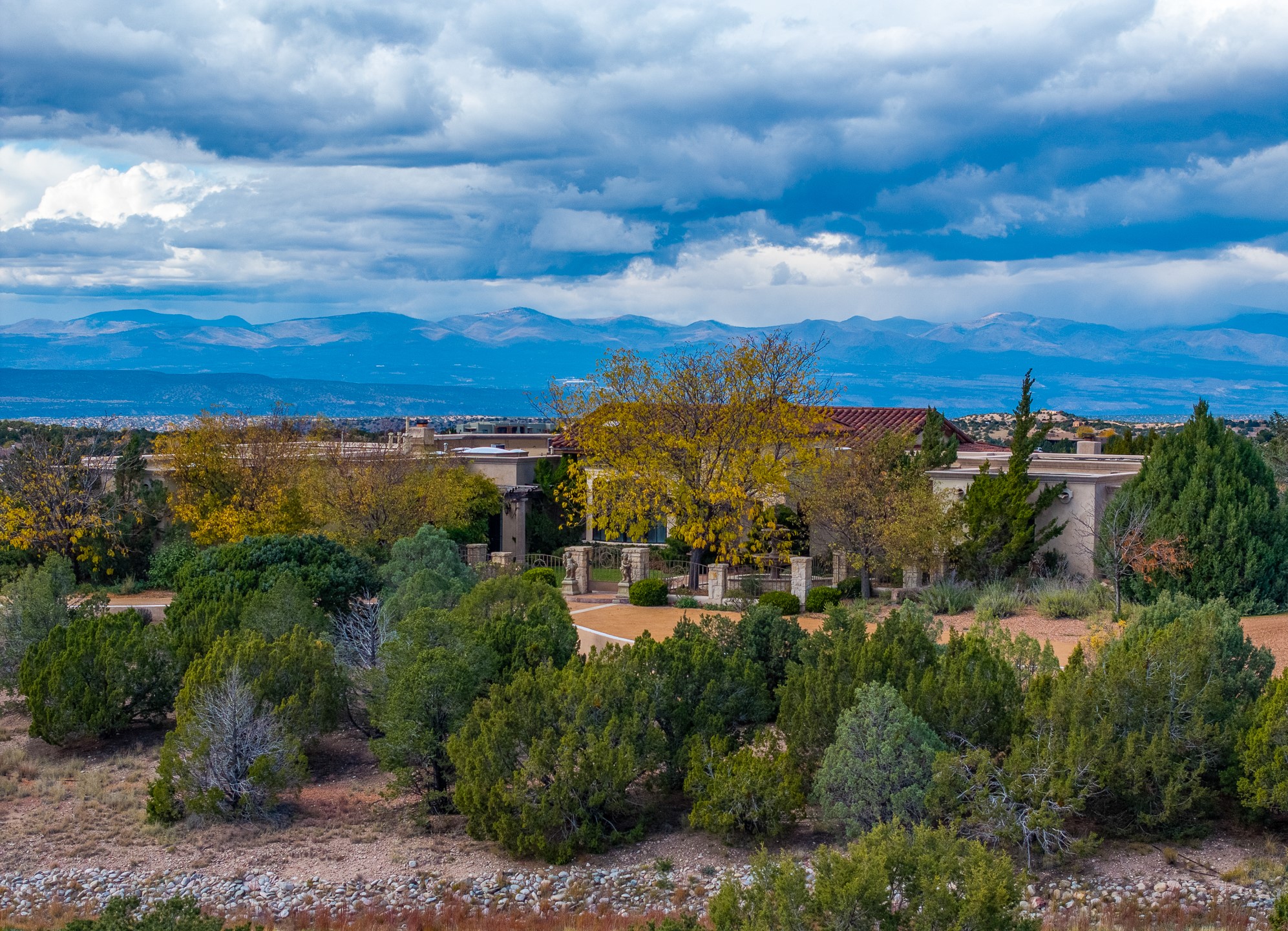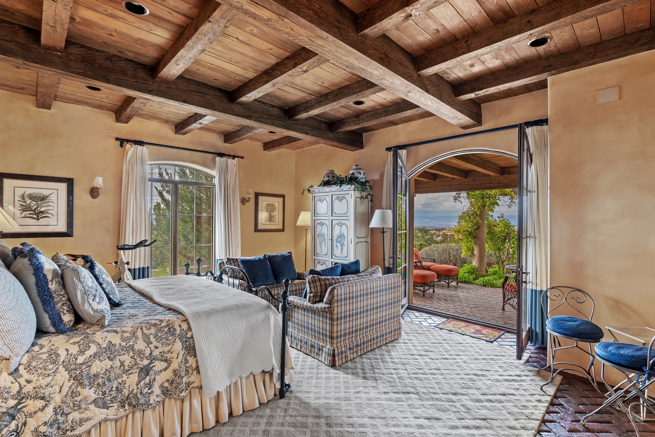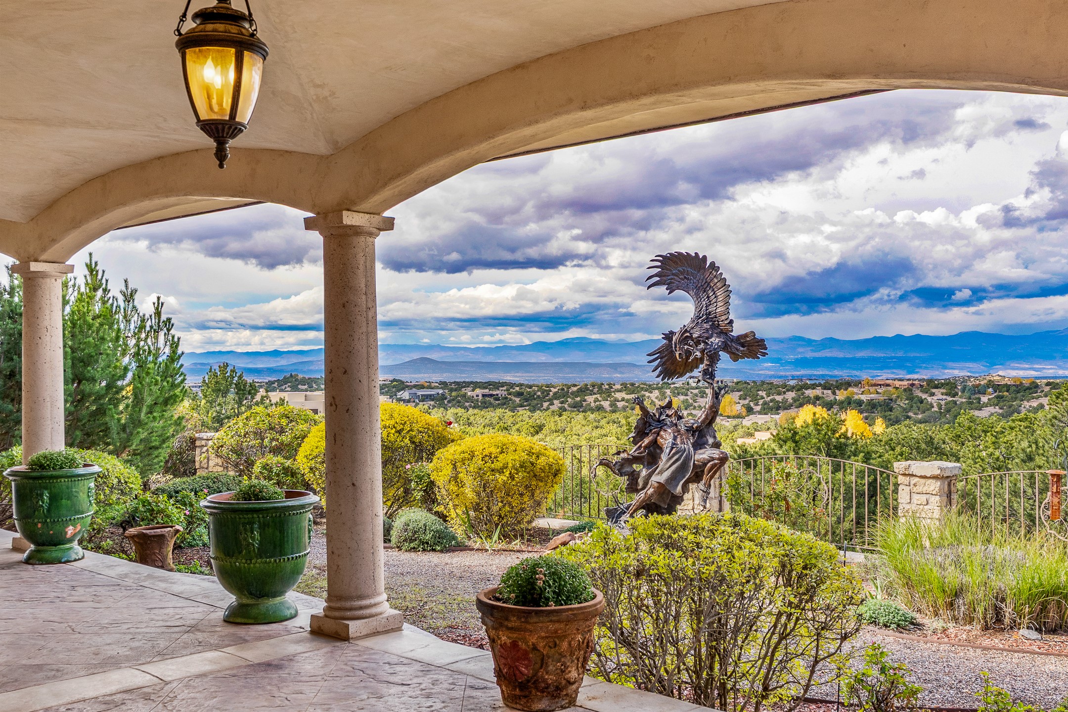 For those drawn to the romance of Italy, this extraordinary residence captures the essence of a Tuscan villa translated beautifully into the high desert landscape of Santa Fe. Nestled on 2.5 acres in the coveted Sundance Estates, this home with 4 bedrooms plus an office, 4.5 baths, and a 3-car garage offers 5,013 square feet of refined living, crafted with exquisite detail and timeless materials. Beyond stately wrought-iron gates, cupid sculptures and a stamped and colored concrete drive lead to a grand arrival with limestone walls, a graceful fountain, and hand-hewn double doors. Inside, rich walnut and travertine floors create a harmonious blend of warmth and sophistication. Diamond plaster walls, coved plaster ceilings, and rustic wood trestle beams evoke the artistry of old-world Europe, while expansive windows and French doors frame breathtaking mountain and sunset vistas. The chef's kitchen is a showpiece--adorned with alder cabinetry, granite countertops, a Wolf range, a Subzero refrigerator, a built-in Miele coffee center, and a wine cooler. Here you'll be romanced by a generous island, casual dining area, and adjoining family room with a fireplace, creating an inviting central gathering space. The kitchen and living room open to a deep covered portal designed for alfresco entertaining, featuring an outdoor kitchen, limestone fireplace, and rose garden.The east wing hosts the elegant primary suite with its own fireplace, private portal, and in-ground spa with a waterfall. The spa-like bath offers dual vanities, a soaking tub, and a large walk-in shower, while the custom closet provides both beauty and functionality. On the west side of the home, you will find 2 guest suites providing separation and privacy. There is also a handsome study with a built-in desk and shelves, and a view to the front garden and fountain. Additionally, there is a private casita with its own entrance, kitchenette, and ensuite bath offers comfort and independence for guests.