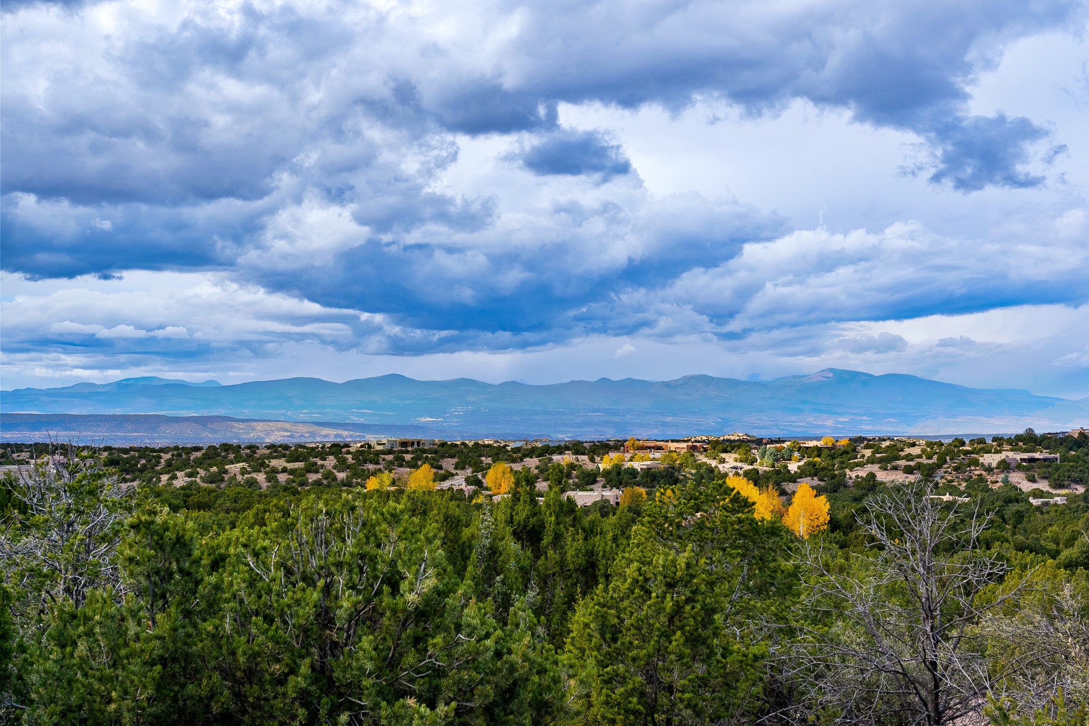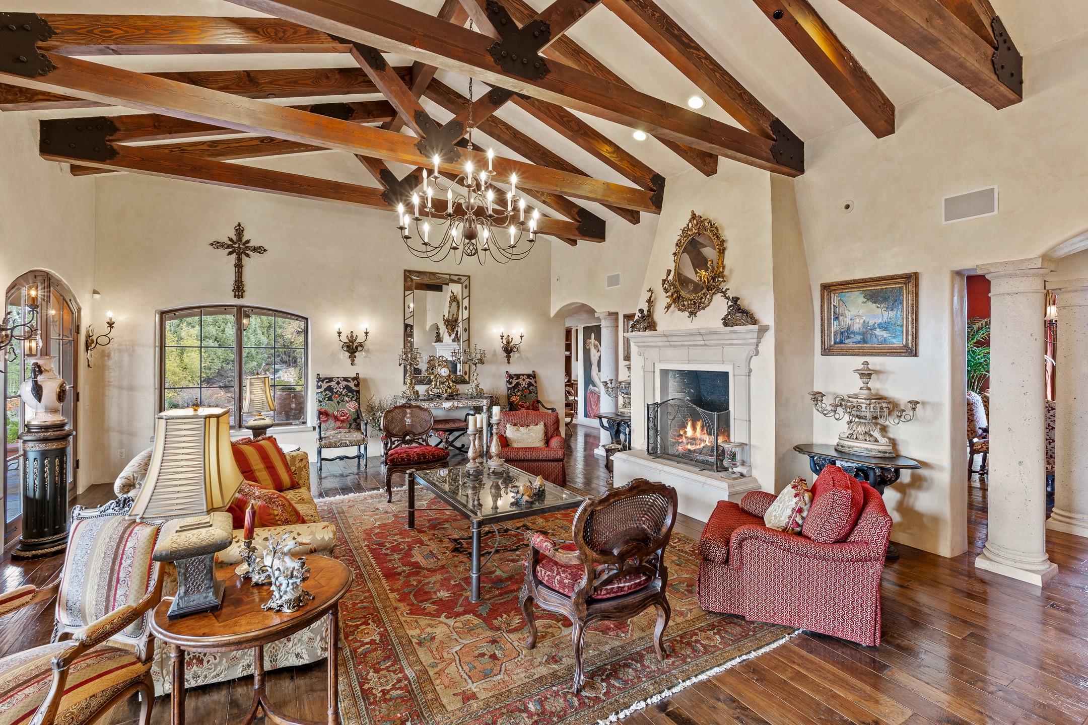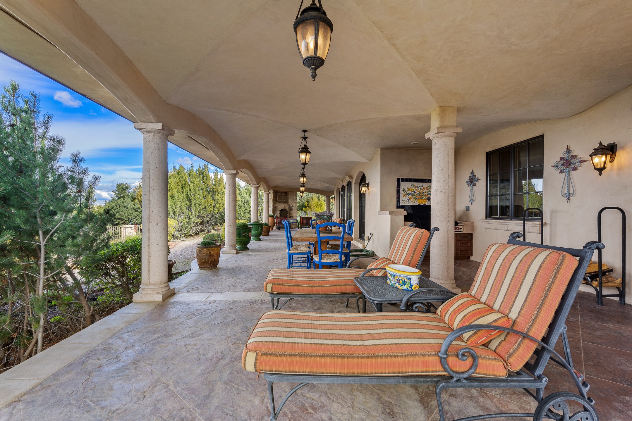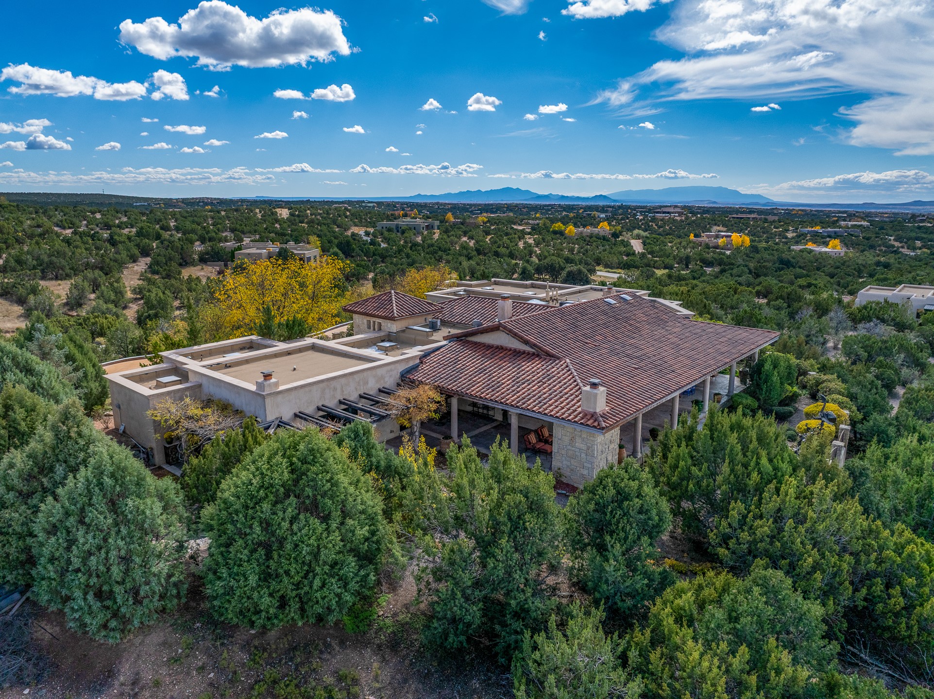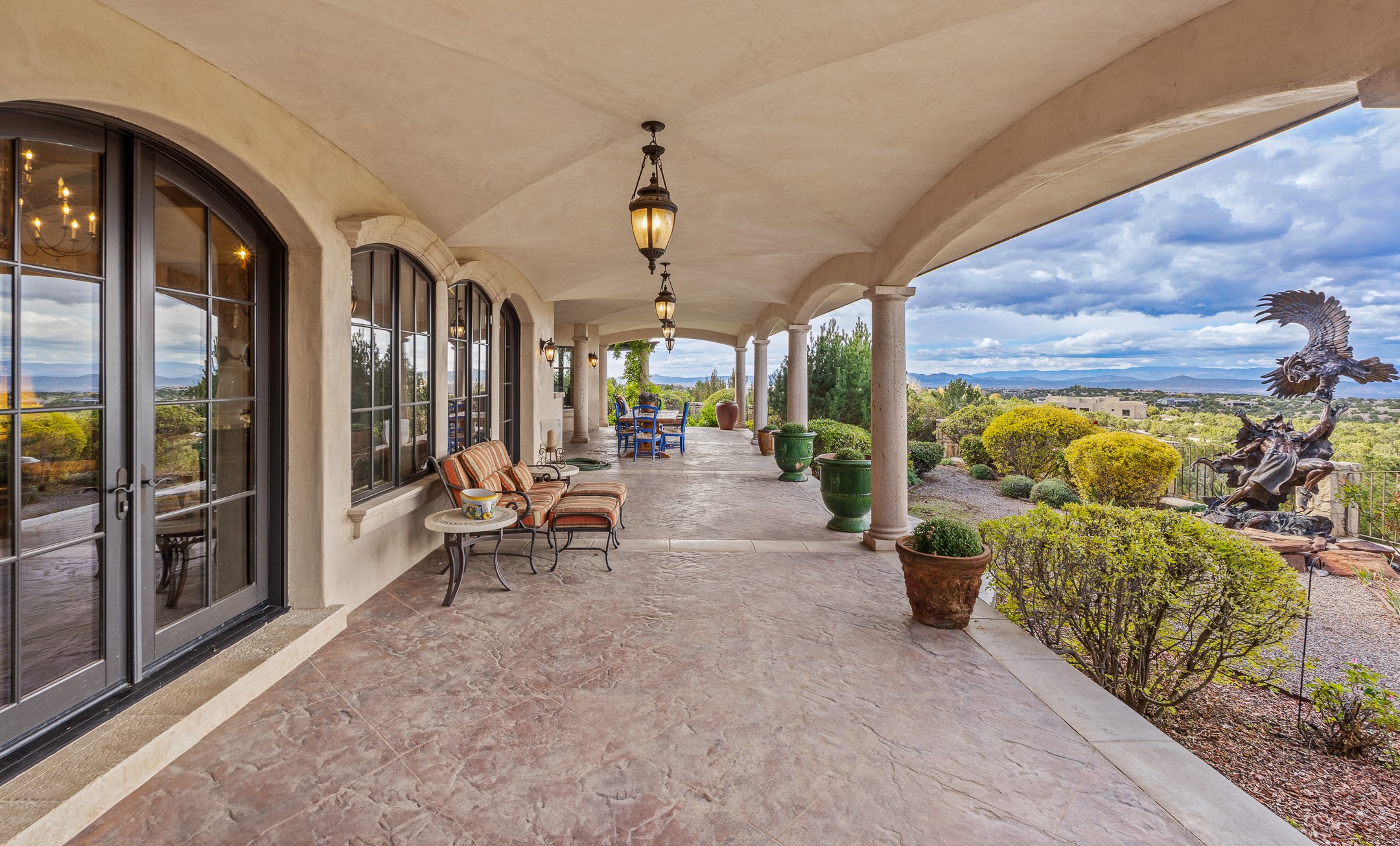 For those drawn to the romance of Italy, this extraordinary residence captures the essence of a Tuscan villa translated beautifully into the high desert landscape of Santa Fe. Nestled on 2.5 acres in the coveted Sundance Estates, this home with 4 bedrooms plus an office, 4.5 baths, and a 3-car garage offers 5,013 square feet of refined living, crafted with exquisite detail and timeless materials. Beyond stately wrought-iron gates, cupid sculptures and a stamped and colored concrete drive lead to a grand arrival with limestone walls, a graceful fountain, and hand-hewn double doors. Inside, rich walnut and travertine floors create a harmonious blend of warmth and sophistication. Diamond plaster walls, coved plaster ceilings, and rustic wood trestle beams evoke the artistry of old-world Europe, while expansive windows and French doors frame breathtaking mountain and sunset vistas. The chef's kitchen is a showpiece--adorned with alder cabinetry, granite countertops, a Wolf range, a Subzero refrigerator, a built-in Miele coffee center, and a wine cooler. Here you'll be romanced by a generous island, casual dining area, and adjoining family room with a fireplace, creating an inviting central gathering space. The kitchen and living room open to a deep covered portal designed for alfresco entertaining, featuring an outdoor kitchen, limestone fireplace, and rose garden.The east wing hosts the elegant primary suite with its own fireplace, private portal, and in-ground spa with a waterfall. The spa-like bath offers dual vanities, a soaking tub, and a large walk-in shower, while the custom closet provides both beauty and functionality. On the west side of the home, you will find 2 guest suites providing separation and privacy. There is also a handsome study with a built-in desk and shelves, and a view to the front garden and fountain. Additionally, there is a private casita with its own entrance, kitchenette, and ensuite bath offers comfort and independence for guests.
