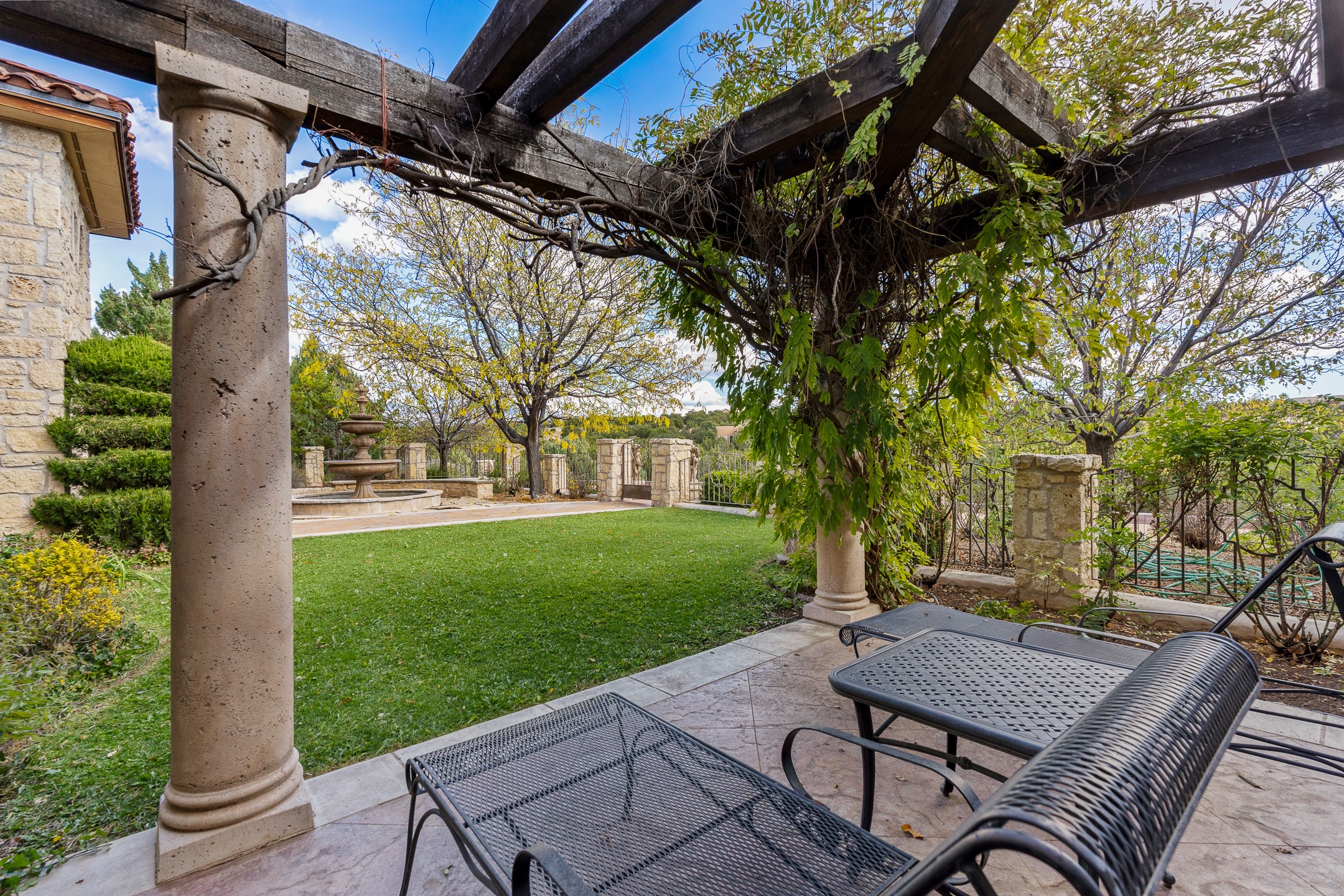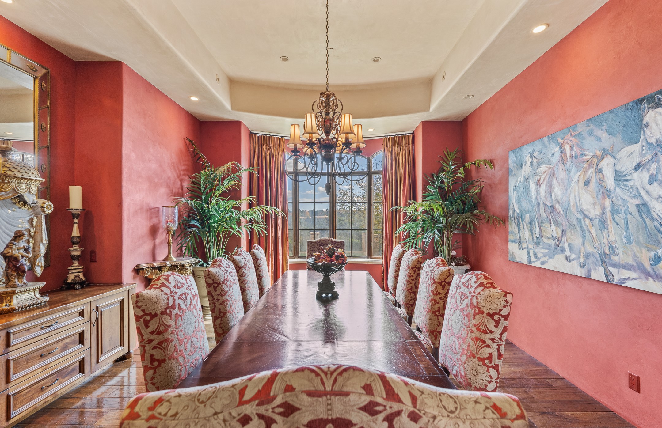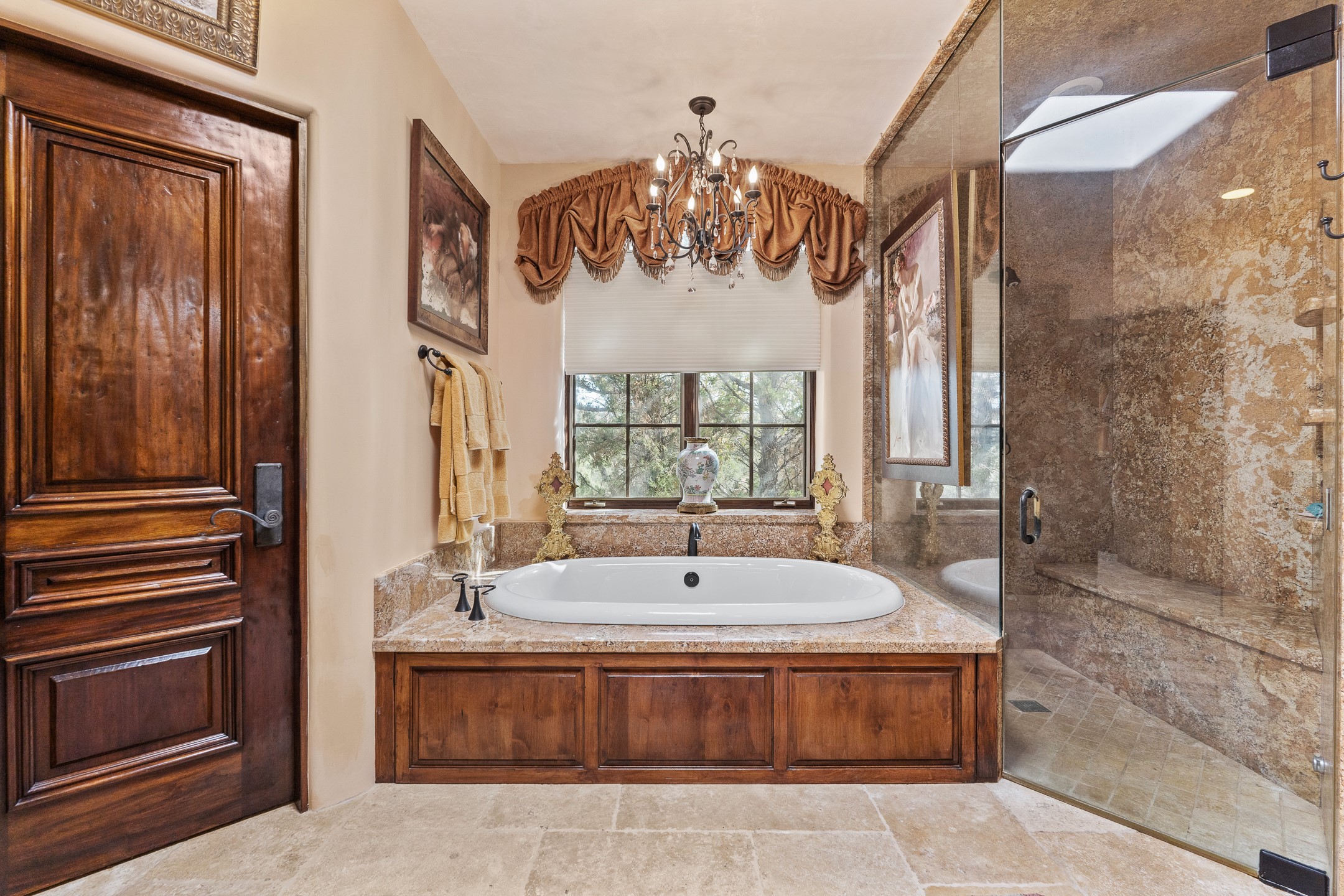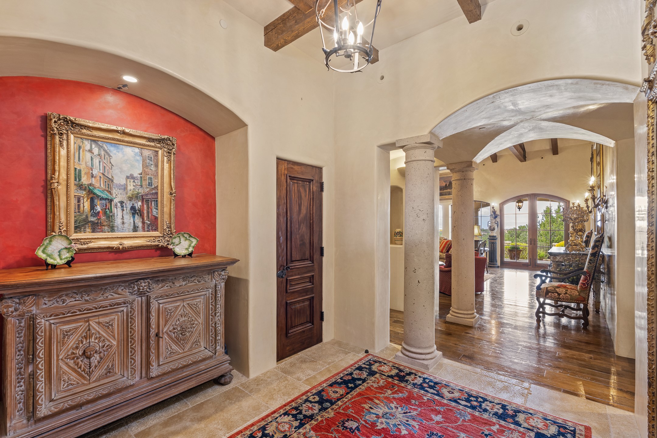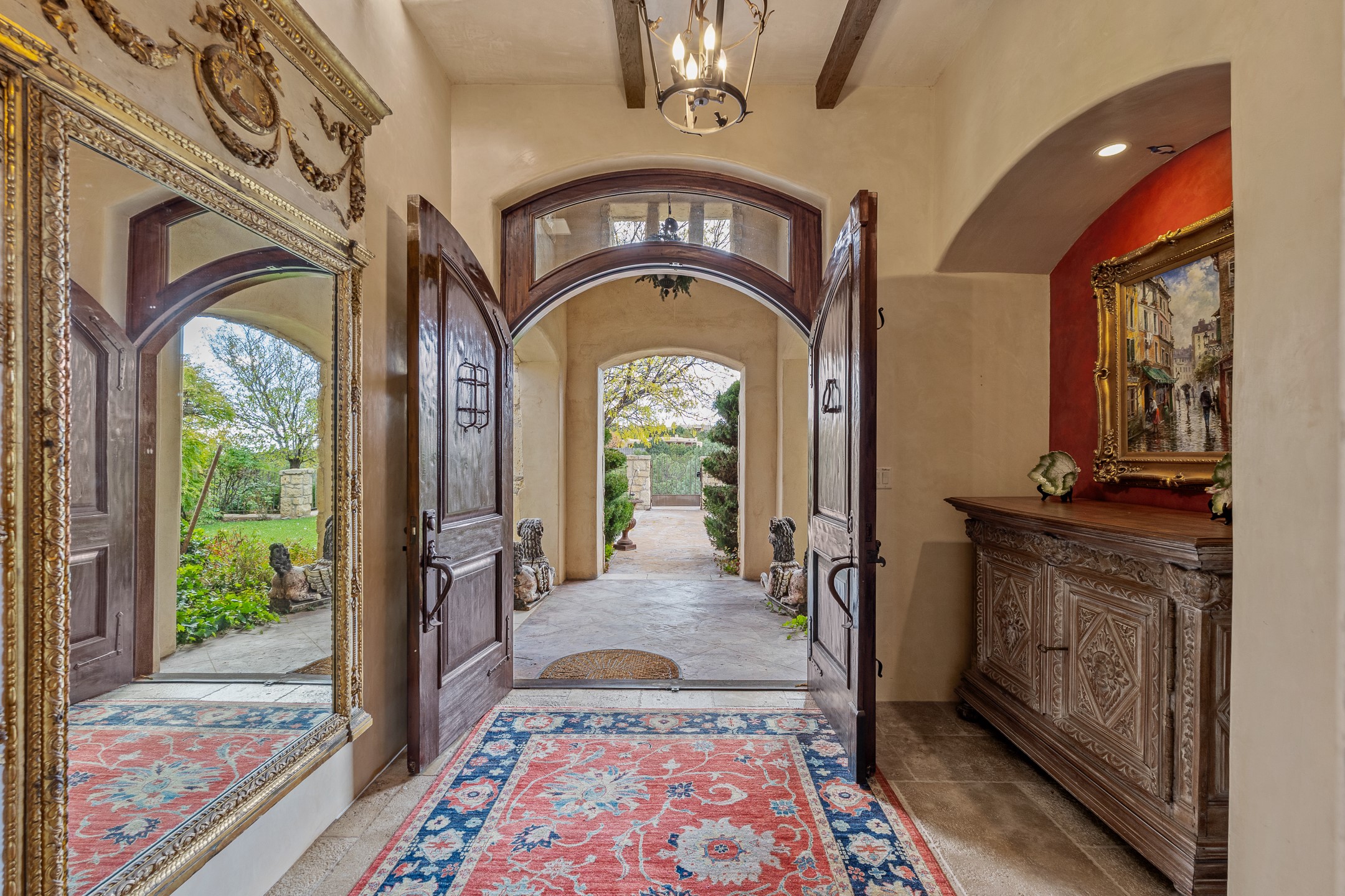 For those drawn to the romance of Italy, this extraordinary residence captures the essence of a Tuscan villa translated beautifully into the high desert landscape of Santa Fe. Nestled on 2.5 acres in the coveted Sundance Estates, this home with 4 bedrooms plus an office, 4.5 baths, and a 3-car garage offers 5,013 square feet of refined living, crafted with exquisite detail and timeless materials. Beyond stately wrought-iron gates, cupid sculptures and a stamped and colored concrete drive lead to a grand arrival with limestone walls, a graceful fountain, and hand-hewn double doors. Inside, rich walnut and travertine floors create a harmonious blend of warmth and sophistication. Diamond plaster walls, coved plaster ceilings, and rustic wood trestle beams evoke the artistry of old-world Europe, while expansive windows and French doors frame breathtaking mountain and sunset vistas. The chef's kitchen is a showpiece--adorned with alder cabinetry, granite countertops, a Wolf range, a Subzero refrigerator, a built-in Miele coffee center, and a wine cooler. Here you'll be romanced by a generous island, casual dining area, and adjoining family room with a fireplace, creating an inviting central gathering space. The kitchen and living room open to a deep covered portal designed for alfresco entertaining, featuring an outdoor kitchen, limestone fireplace, and rose garden.The east wing hosts the elegant primary suite with its own fireplace, private portal, and in-ground spa with a waterfall. The spa-like bath offers dual vanities, a soaking tub, and a large walk-in shower, while the custom closet provides both beauty and functionality. On the west side of the home, you will find 2 guest suites providing separation and privacy. There is also a handsome study with a built-in desk and shelves, and a view to the front garden and fountain. Additionally, there is a private casita with its own entrance, kitchenette, and ensuite bath offers comfort and independence for guests.