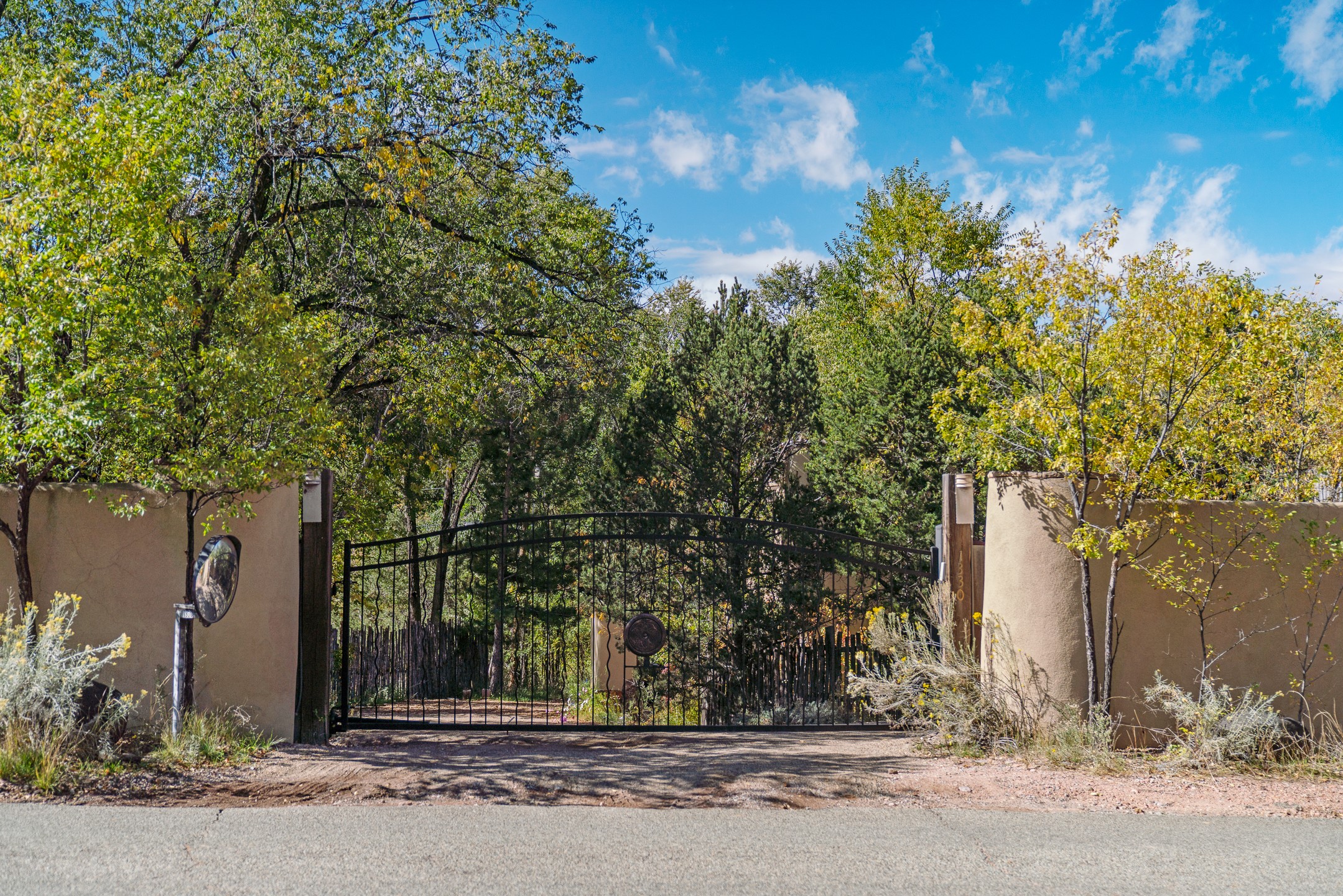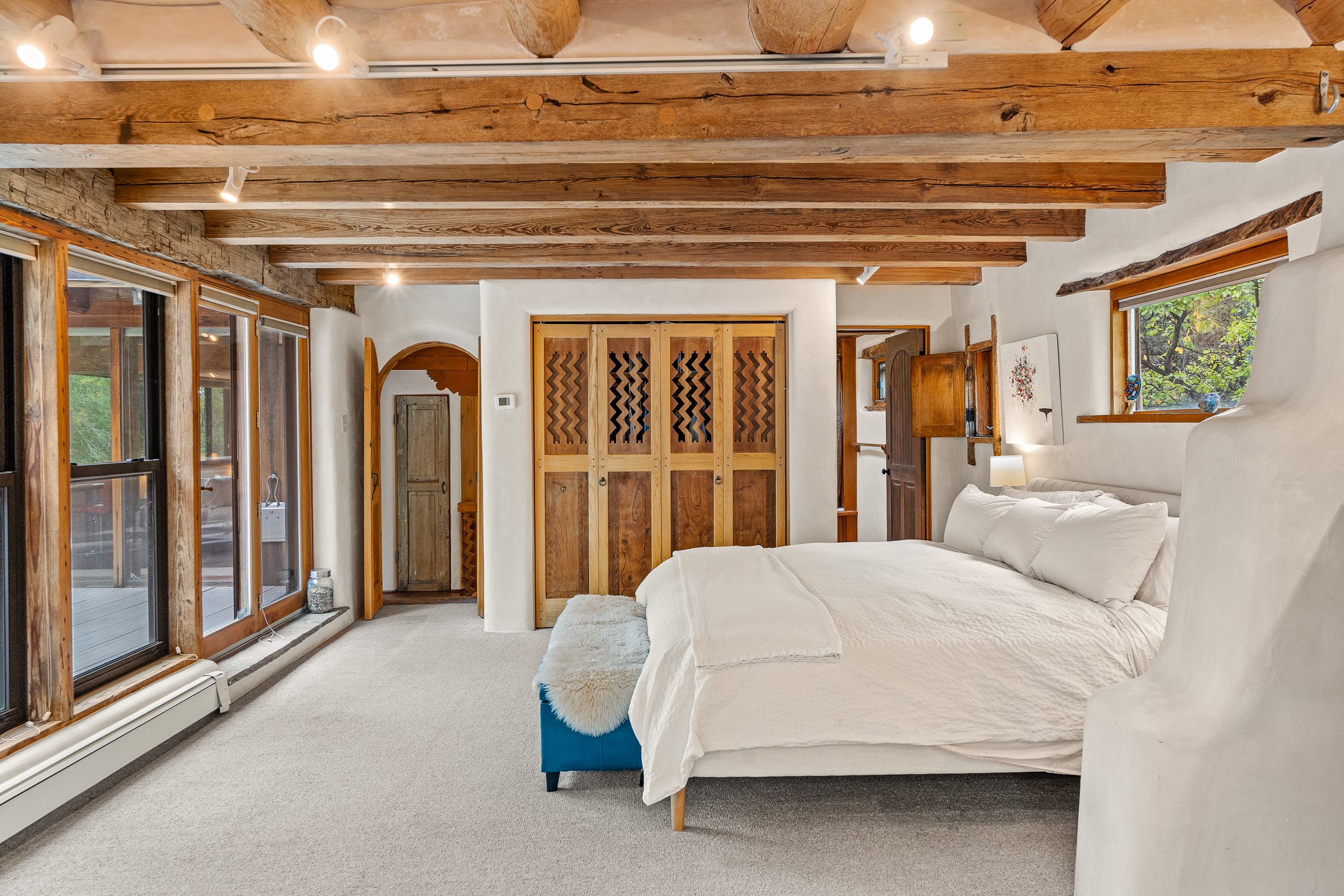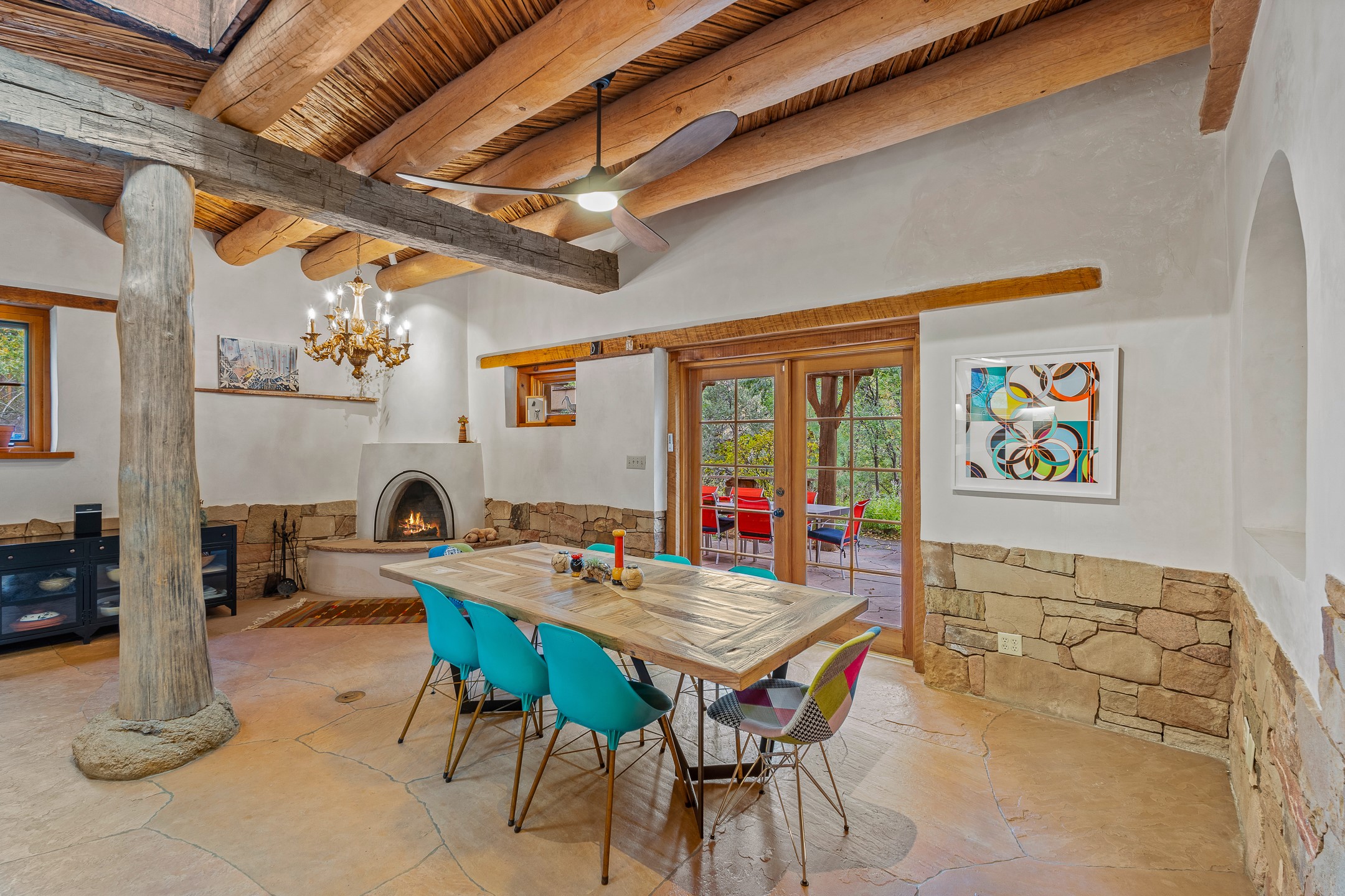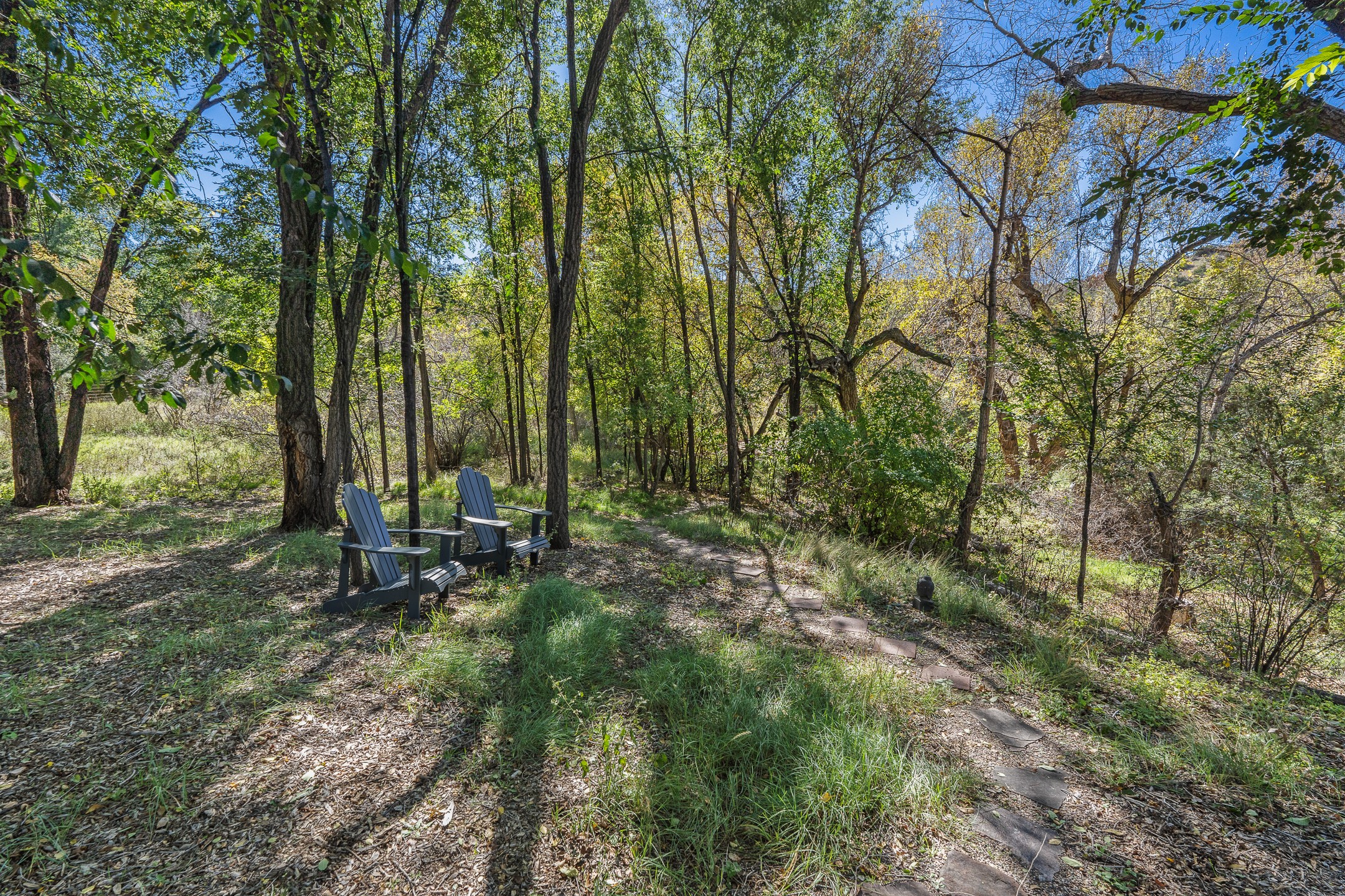Location, location! A quick 8 minutes to Santa Fe Plaza and 5 minutes from the beloved Tesuque Village Market, this extraordinary 3,366 sq ft adobe sanctuary is nestled on .77 lush, tree-covered acre and adjacent to the seasonal Tesuque Creek. This 3 bdrm/3.5 bath residence blends soulful Santa Fe architecture built by notable local craftsmen, with regenerative land stewardship to support biodiversity. Flagstone floors, vigas, split cedar ceilings, and walls that transition organically from adobe to stone create a uniquely grounded and artistic living experience. The renovated kitchen features natural stone countertops and open dining area perfect for entertaining. Dining area opens to a covered portal with a natural gas firepit ideal for outdoor gatherings beneath the stars, rain or shine. There are two living areas: The original living room was designed for Japanese tea ceremony with glass wall that opens to views of the garden and creek side forest. The North living room features a dramatic fireplace, high ceilings, and connects to a serene ground-level primary suite with cedar lined closet, as well as a fenced garden area abundant with fruit trees and pollinator-friendly plants. The handcrafted staircase is built with no nails and leads to the upper level, where you'll find a guest suite and a second primary suite with a private deck and an infrared sauna - an immersive retreat in the treetops of Tesuque. Both have en suite bathrooms.Additional amenities include an automatic gated entry, labyrinth, private well with pristine water, EV charger, and a handcrafted workshop. There is so much more to say about this poetic property, but if you're seeking a Santa Fe home that honors nature, creativity, and intentional living, this eco-sanctuary in Tesuque is for you. Hiking access via arroyo from back yard and up the road .75 miles to the Lower Windsor Trailhead offer instant connection to the Sangre de Cristomountains and the coveted ecology of the Tesuque Valley.