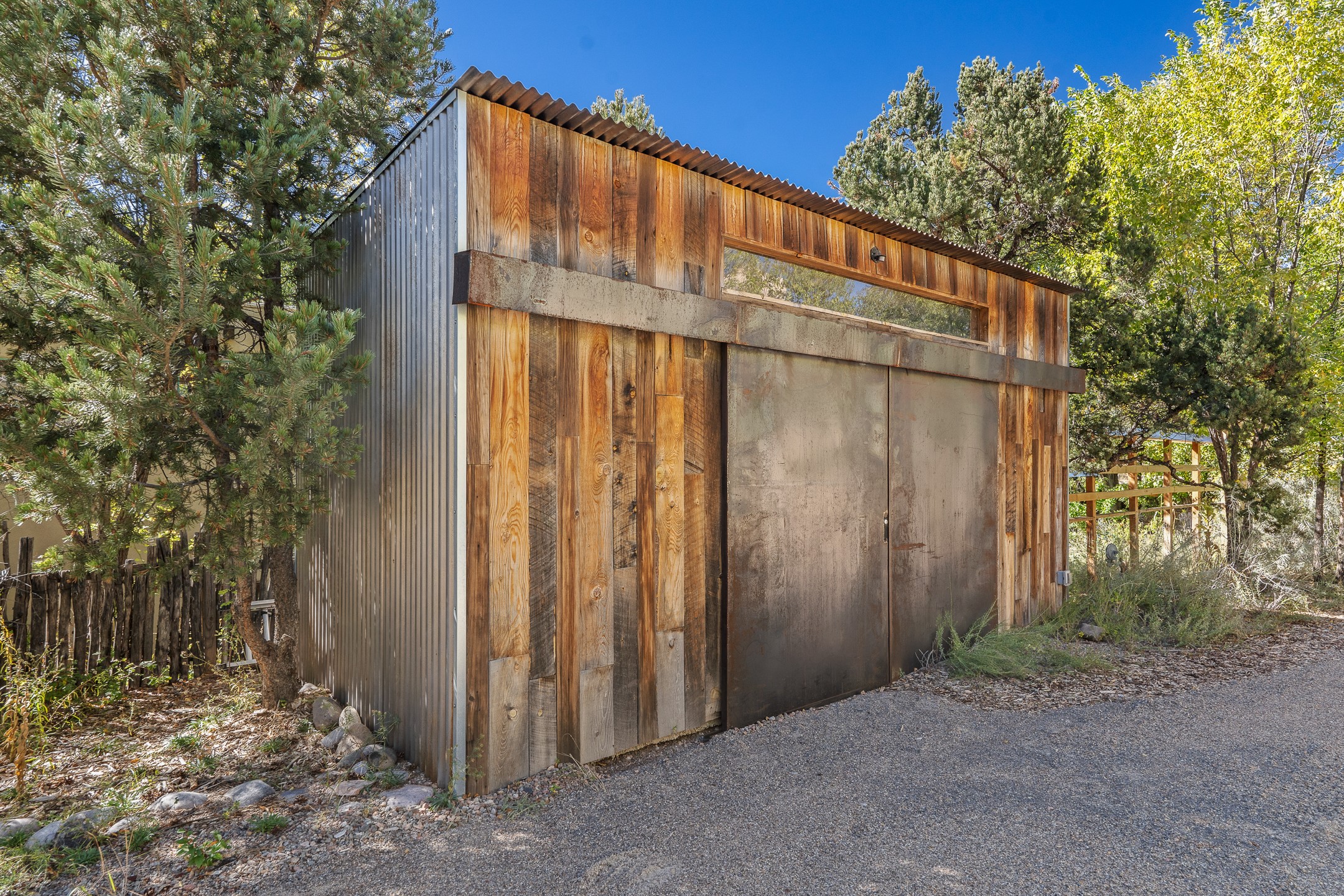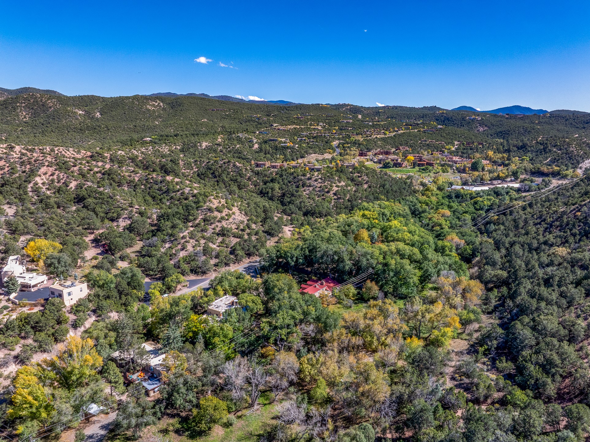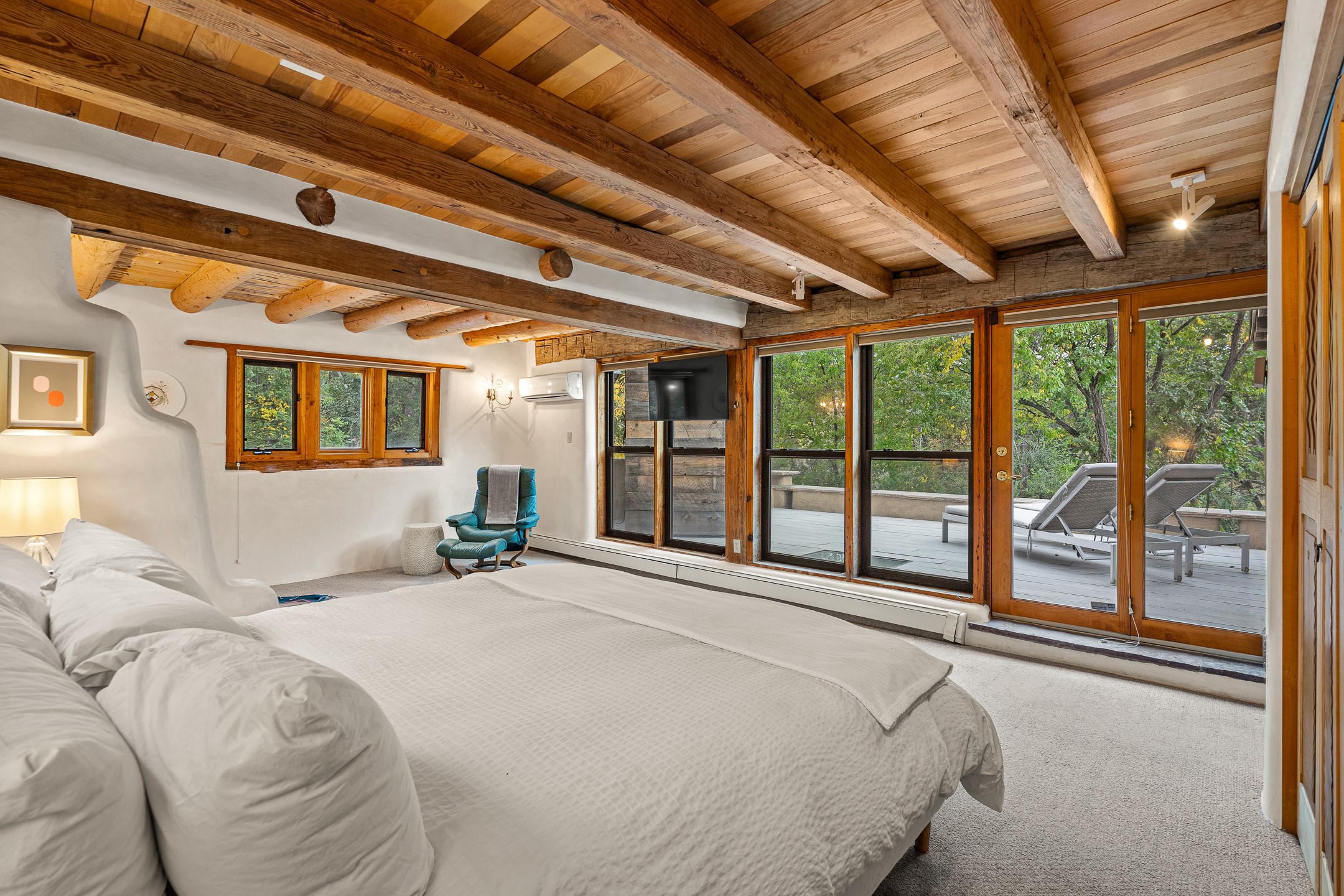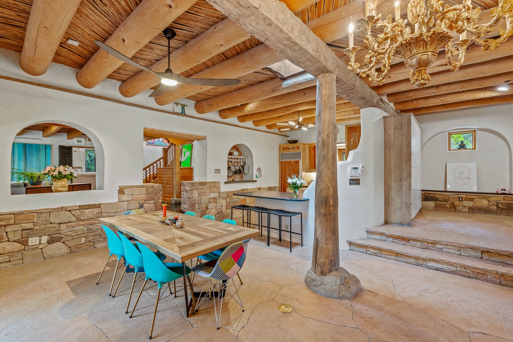 Location, location! A quick 8 minutes to Santa Fe Plaza and 5 minutes from the beloved Tesuque Village Market, this extraordinary 3,366 sq ft adobe sanctuary is nestled on .77 lush, tree-covered acre and adjacent to the seasonal Tesuque Creek. This 3 bdrm/3.5 bath residence blends soulful Santa Fe architecture built by notable local craftsmen, with regenerative land stewardship to support biodiversity. Flagstone floors, vigas, split cedar ceilings, and walls that transition organically from adobe to stone create a uniquely grounded and artistic living experience. The renovated kitchen features natural stone countertops and open dining area perfect for entertaining. Dining area opens to a covered portal with a natural gas firepit ideal for outdoor gatherings beneath the stars, rain or shine. There are two living areas: The original living room was designed for Japanese tea ceremony with glass wall that opens to views of the garden and creek side forest. The North living room features a dramatic fireplace, high ceilings, and connects to a serene ground-level primary suite with cedar lined closet, as well as a fenced garden area abundant with fruit trees and pollinator-friendly plants. The handcrafted staircase is built with no nails and leads to the upper level, where you'll find a guest suite and a second primary suite with a private deck and an infrared sauna - an immersive retreat in the treetops of Tesuque. Both have en suite bathrooms.Additional amenities include an automatic gated entry, labyrinth, private well with pristine water, EV charger, and a handcrafted workshop. There is so much more to say about this poetic property, but if you're seeking a Santa Fe home that honors nature, creativity, and intentional living, this eco-sanctuary in Tesuque is for you. Hiking access via arroyo from back yard and up the road .75 miles to the Lower Windsor Trailhead offer instant connection to the Sangre de Cristomountains and the coveted ecology of the Tesuque Valley.