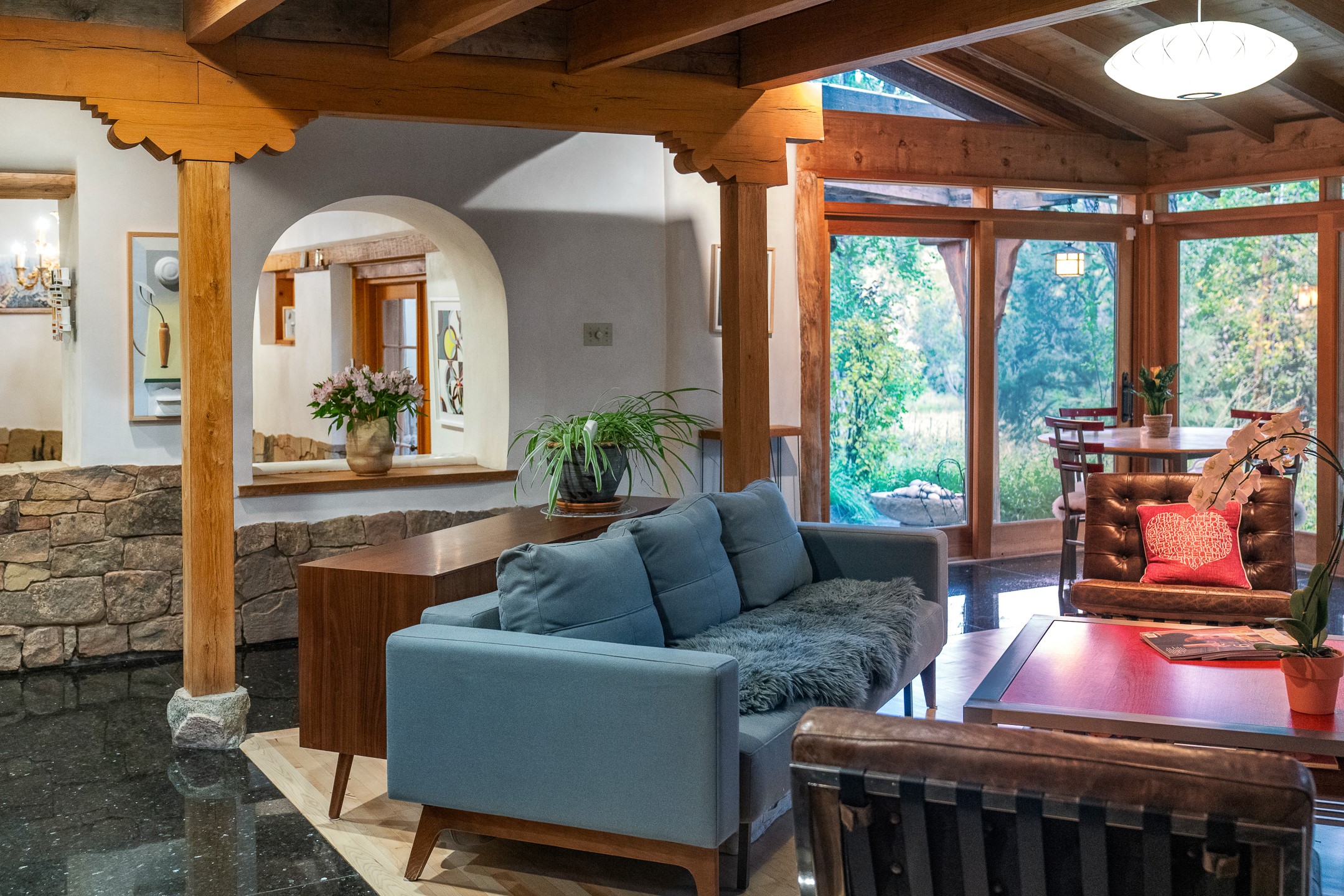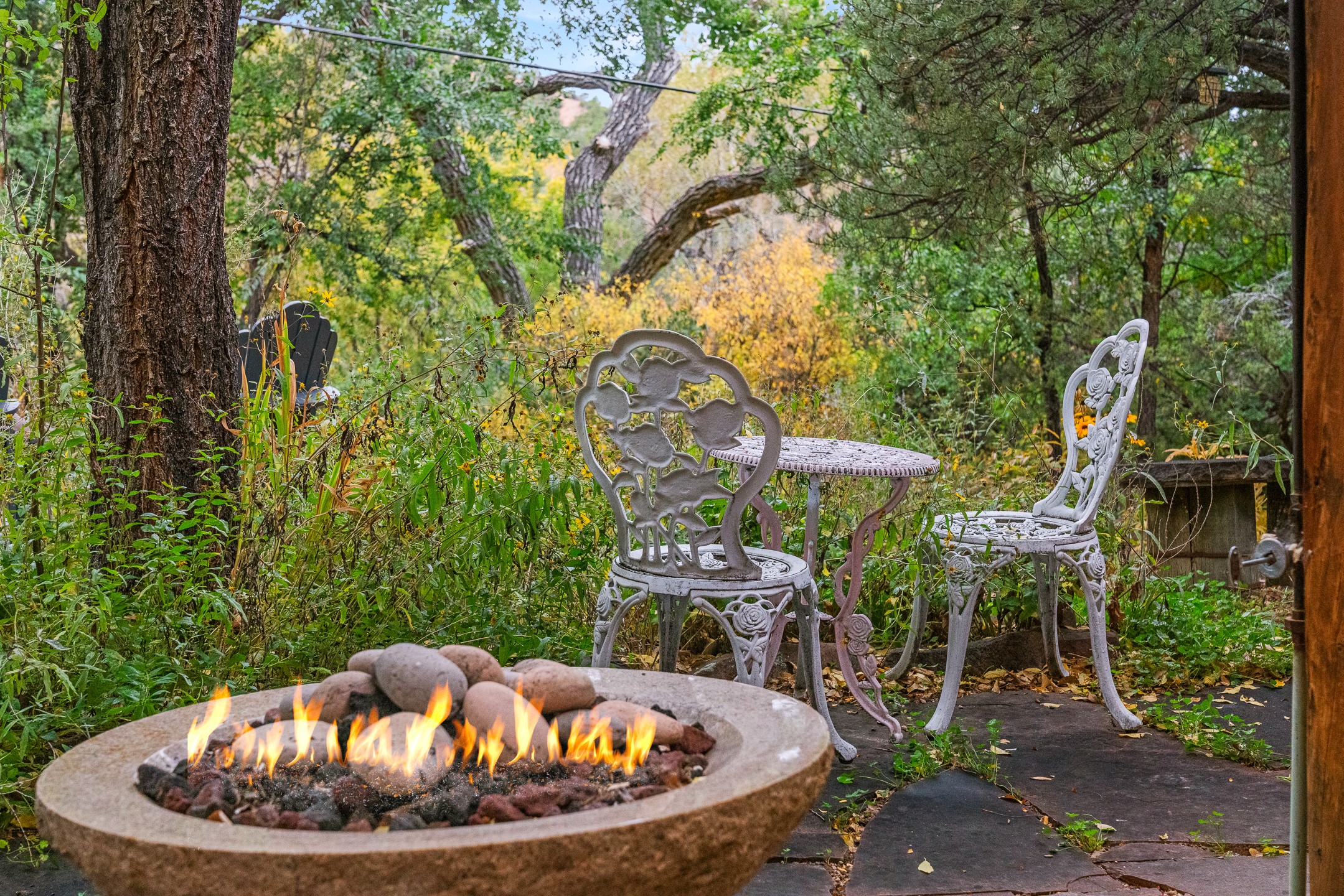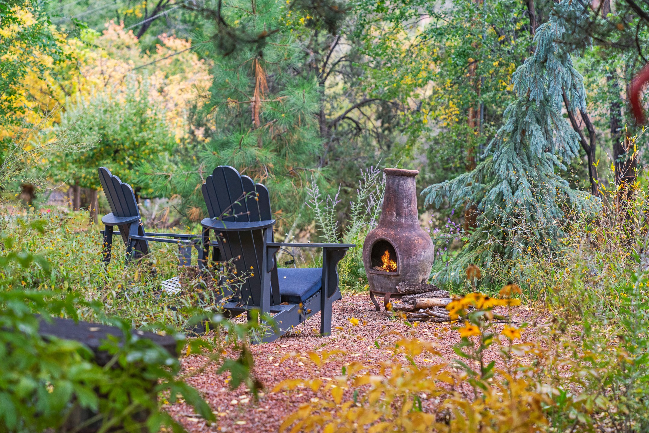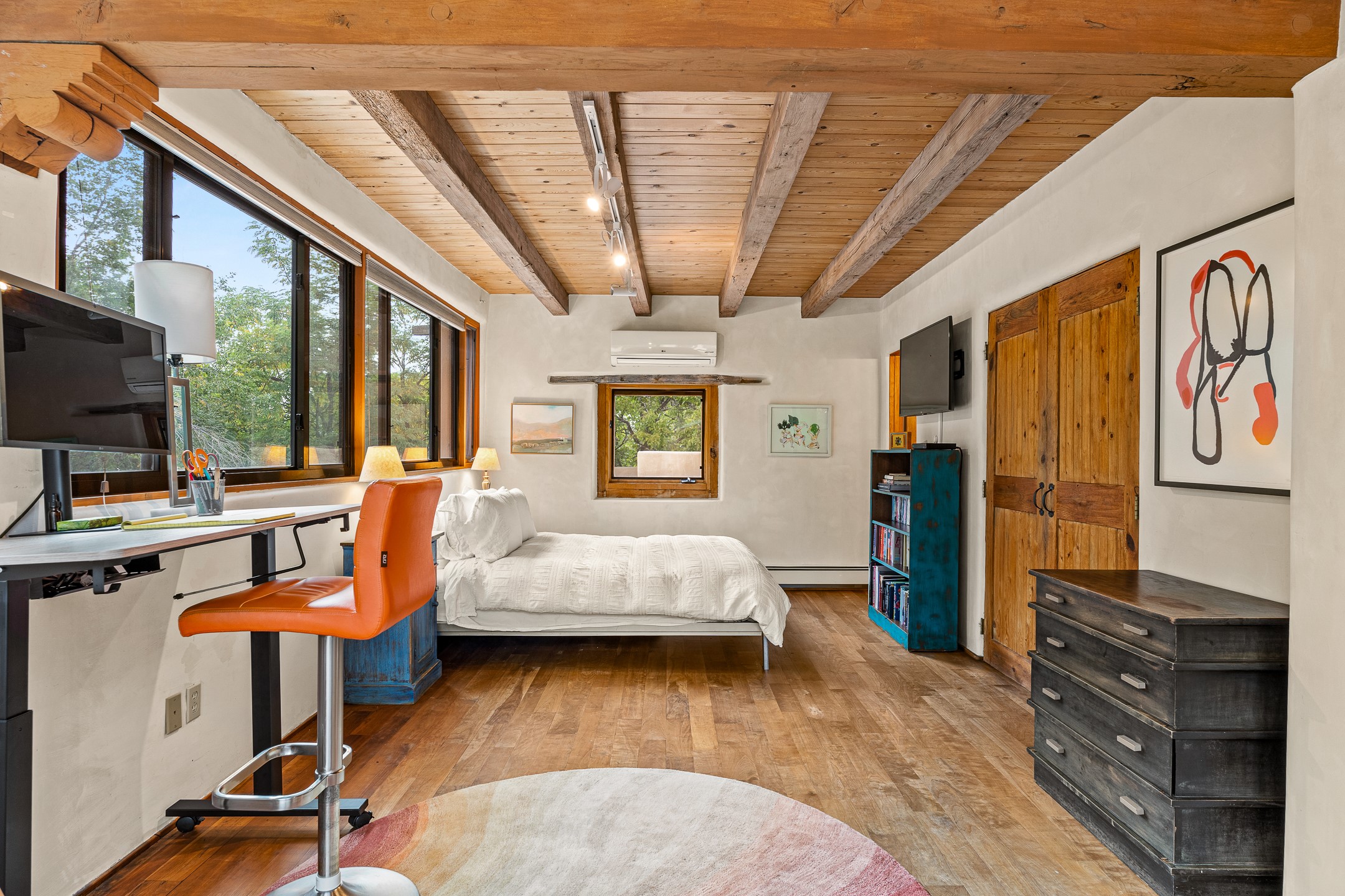 Location, location! A quick 8 minutes to Santa Fe Plaza and 5 minutes from the beloved Tesuque Village Market, this extraordinary 3,366 sq ft adobe sanctuary is nestled on .77 lush, tree-covered acre and adjacent to the seasonal Tesuque Creek. This 3 bdrm/3.5 bath residence blends soulful Santa Fe architecture built by notable local craftsmen, with regenerative land stewardship to support biodiversity. Flagstone floors, vigas, split cedar ceilings, and walls that transition organically from adobe to stone create a uniquely grounded and artistic living experience. The renovated kitchen features natural stone countertops and open dining area perfect for entertaining. Dining area opens to a covered portal with a natural gas firepit ideal for outdoor gatherings beneath the stars, rain or shine. There are two living areas: The original living room was designed for Japanese tea ceremony with glass wall that opens to views of the garden and creek side forest. The North living room features a dramatic fireplace, high ceilings, and connects to a serene ground-level primary suite with cedar lined closet, as well as a fenced garden area abundant with fruit trees and pollinator-friendly plants. The handcrafted staircase is built with no nails and leads to the upper level, where you'll find a guest suite and a second primary suite with a private deck and an infrared sauna - an immersive retreat in the treetops of Tesuque. Both have en suite bathrooms.Additional amenities include an automatic gated entry, labyrinth, private well with pristine water, EV charger, and a handcrafted workshop. There is so much more to say about this poetic property, but if you're seeking a Santa Fe home that honors nature, creativity, and intentional living, this eco-sanctuary in Tesuque is for you. Hiking access via arroyo from back yard and up the road .75 miles to the Lower Windsor Trailhead offer instant connection to the Sangre de Cristomountains and the coveted ecology of the Tesuque Valley.