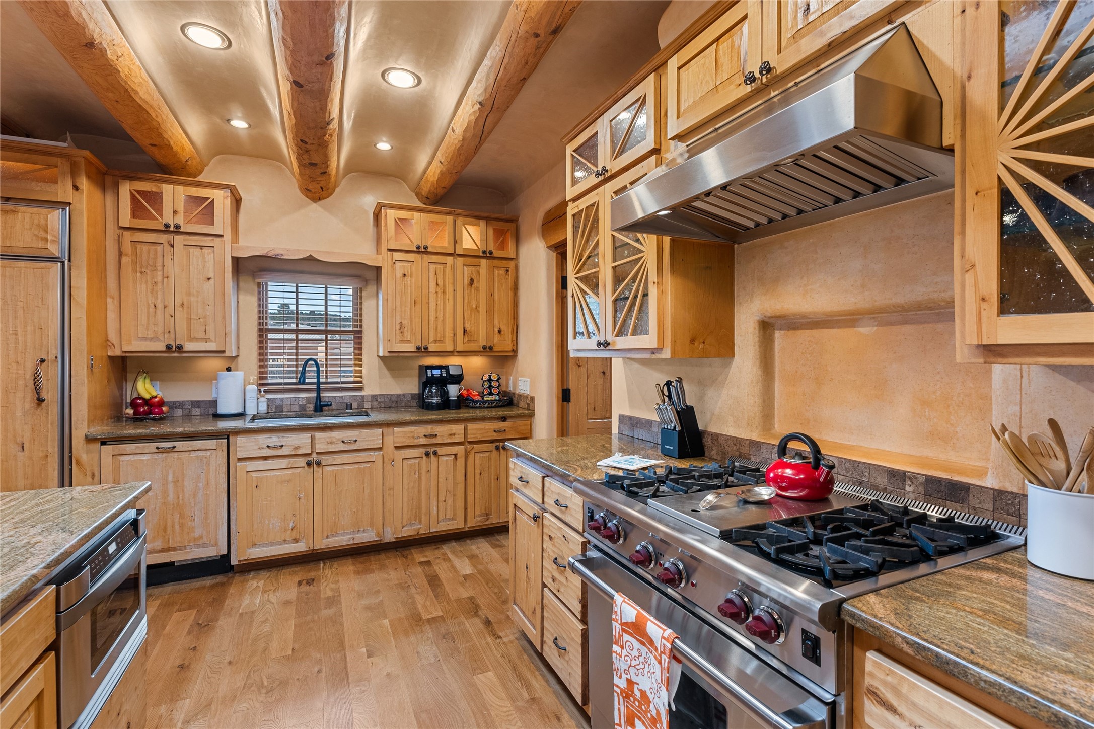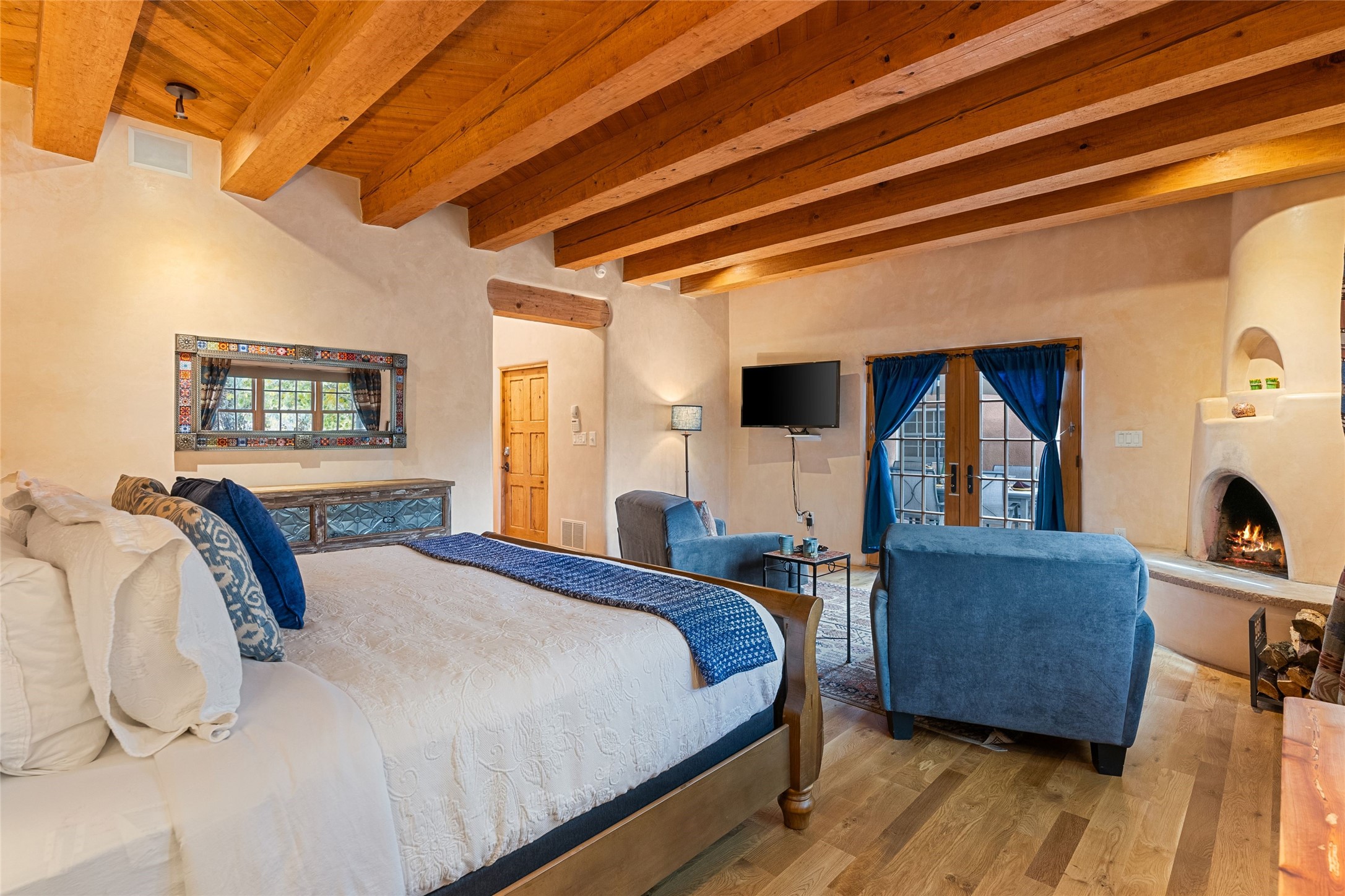 Overlooking the serene Santa Fe River, Historic Upper Canyon Road Santa Fe Eastside 3-bedroom, 2.5-bath adobe home with wonderful mountain views. Potential for rental income upon receipt of a City of Santa Fe Short Term Rental permit. This property includes two separately deeded lots, offering ample space and endless possibilities, whether you envision a guest house, studio, or an expansive garden retreat. High end design features include white oak flooring that flows throughout the open-concept living, dining, and kitchen areas, providing a warm and inviting atmosphere. Highlighted by three charming fireplaces and custom alder cabinets, the home seamlessly blends comfort and sophistication. The light-filled kitchen is appointed with top-of-the-line Wolf gas range, Sub-Zero refrigerator, and a Sub-Zero wine cooler, making it ideal for both everyday cooking and entertaining. Primary suite features a sitting area, fireplace, and private access to the outdoor patio. The en-suite bath is a luxurious escape, complete with a Kohler Tea-for-Two tub and a spacious walk-in shower. Two additional guest bedrooms share a bath and a cozy office area, perfect for remote work or creative pursuits. Step outside to enjoy multiple outdoor spaces that showcase breathtaking river and mountain views. To top it all off, a hot tub awaits you for soothing evenings under the stars. Rare one-car garage on Upper Canyon Rd. Coveted location close to the Cerro Gordo Trailhead, restaurants and galleries of Canyon Rd and the Santa Fe Plaza.