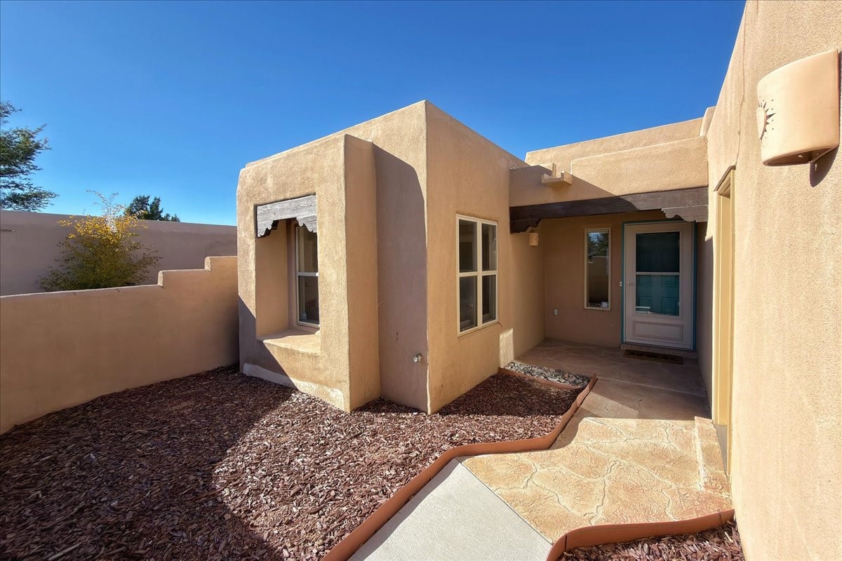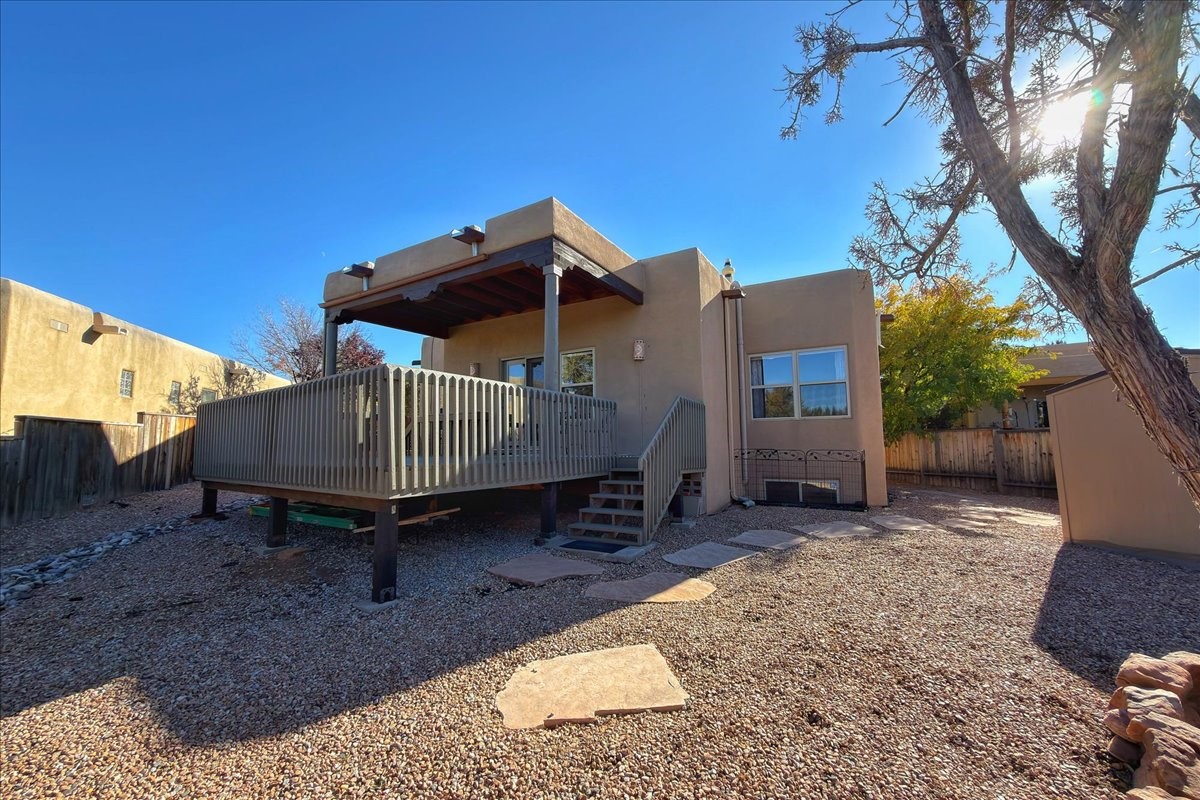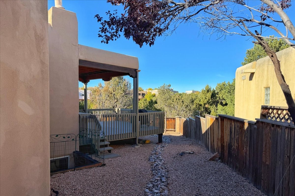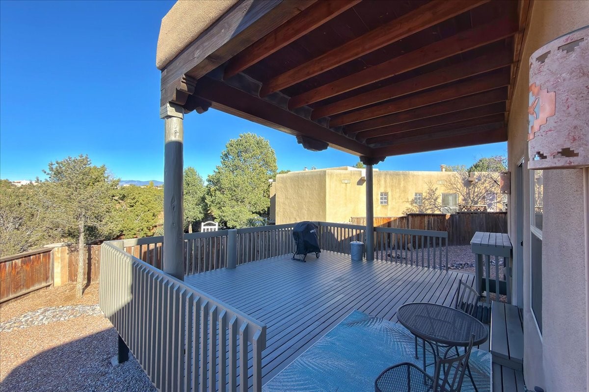 Nestled in the desirable Pueblos del Sol subdivision, this beautifully maintained split-level Pueblo-style home blends traditional Santa Fe charm with modern comfort. Featuring 3 bedrooms, 3 baths, a flex room, and generous living spaces, the home welcomes you with classic vigas, wood doors, and a warm, light-filled interior that captures the spirit of the Southwest.The main level offers a spacious living area with a kiva-style fireplace, an inviting dining space, and an updated kitchen featuring granite counters, stainless steel appliances, and gas cooking. The primary bedroom suite is conveniently located on this level, offering privacy, an en suite bath, and easy access to the main living areas.Downstairs, the split-level design reveals two additional bedrooms, a full bath, and a flex room perfect for a home office, studio, or media space. Every detail reflects thoughtful care and updates, including mini-split heating and cooling systems for year-round comfort, a water softener/reverse osmosis system, and a radon mitigation system for peace of mind.Step outside to enjoy the best of Santa Fe living. A new wood deck extends your living space outdoors--ideal for relaxing or entertaining--overlooking a beautifully xeriscaped yard designed for low maintenance and natural beauty. From your backyard gate, access scenic walking trails and open space that define the Pueblos del Sol lifestyle.Additional features include an oversized two-car garage, excellent storage throughout, granite countertops, and a well-maintained roof. This home's blend of timeless style, modern updates, and thoughtful layout make it a standout in one of Santa Fe's most sought-after neighborhoods.Located close to schools, shopping, and dining, yet surrounded by trails and open skies, 2917 Pueblo Halona offers the perfect balance of convenience, comfort, and authentic Santa Fe character.