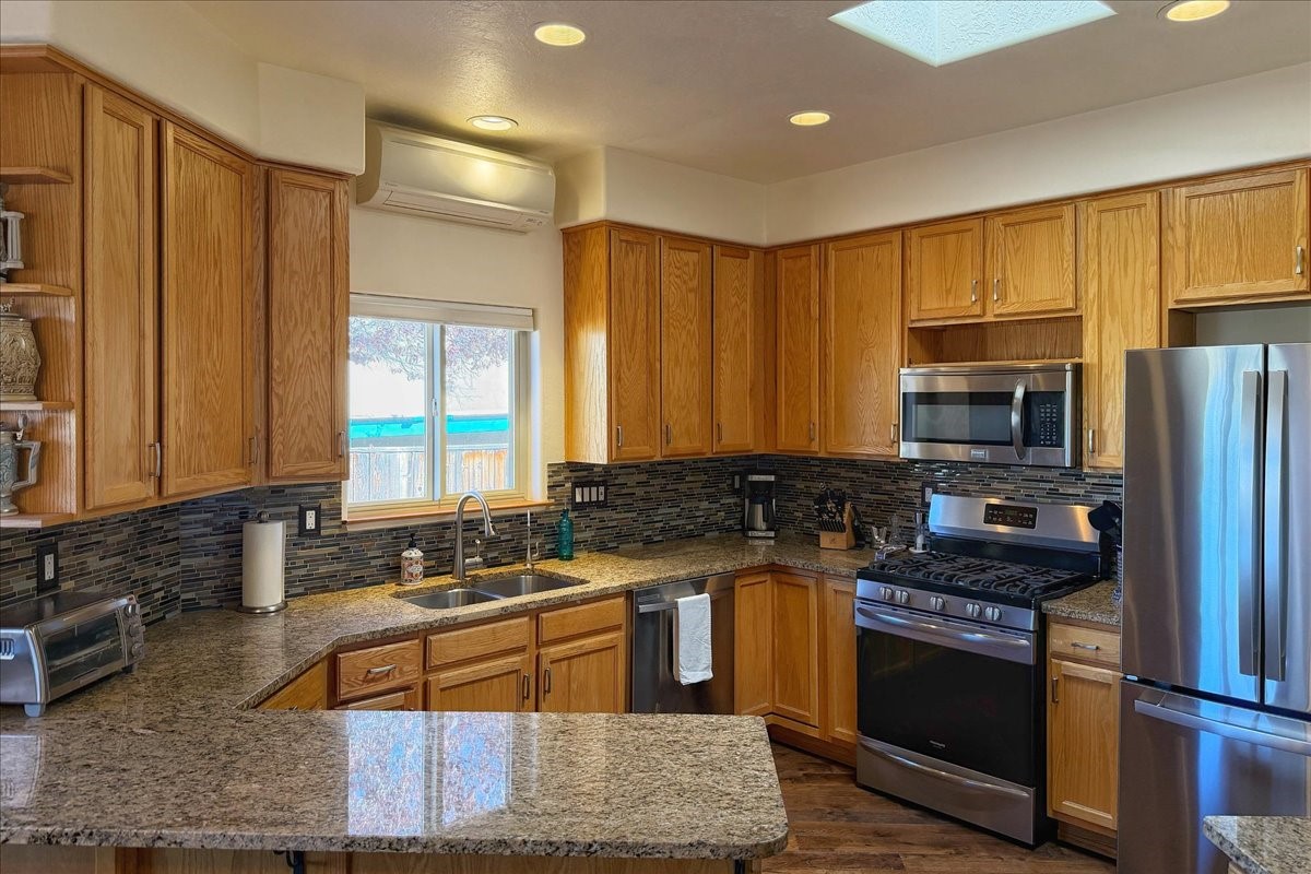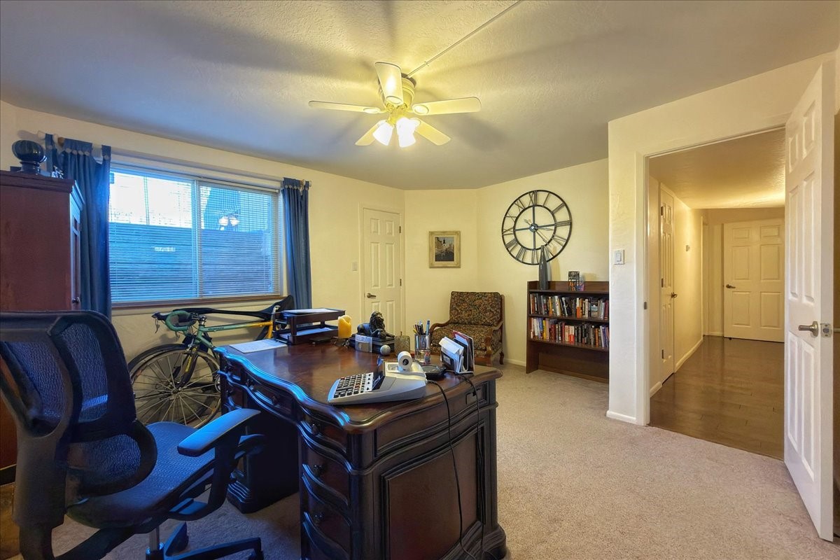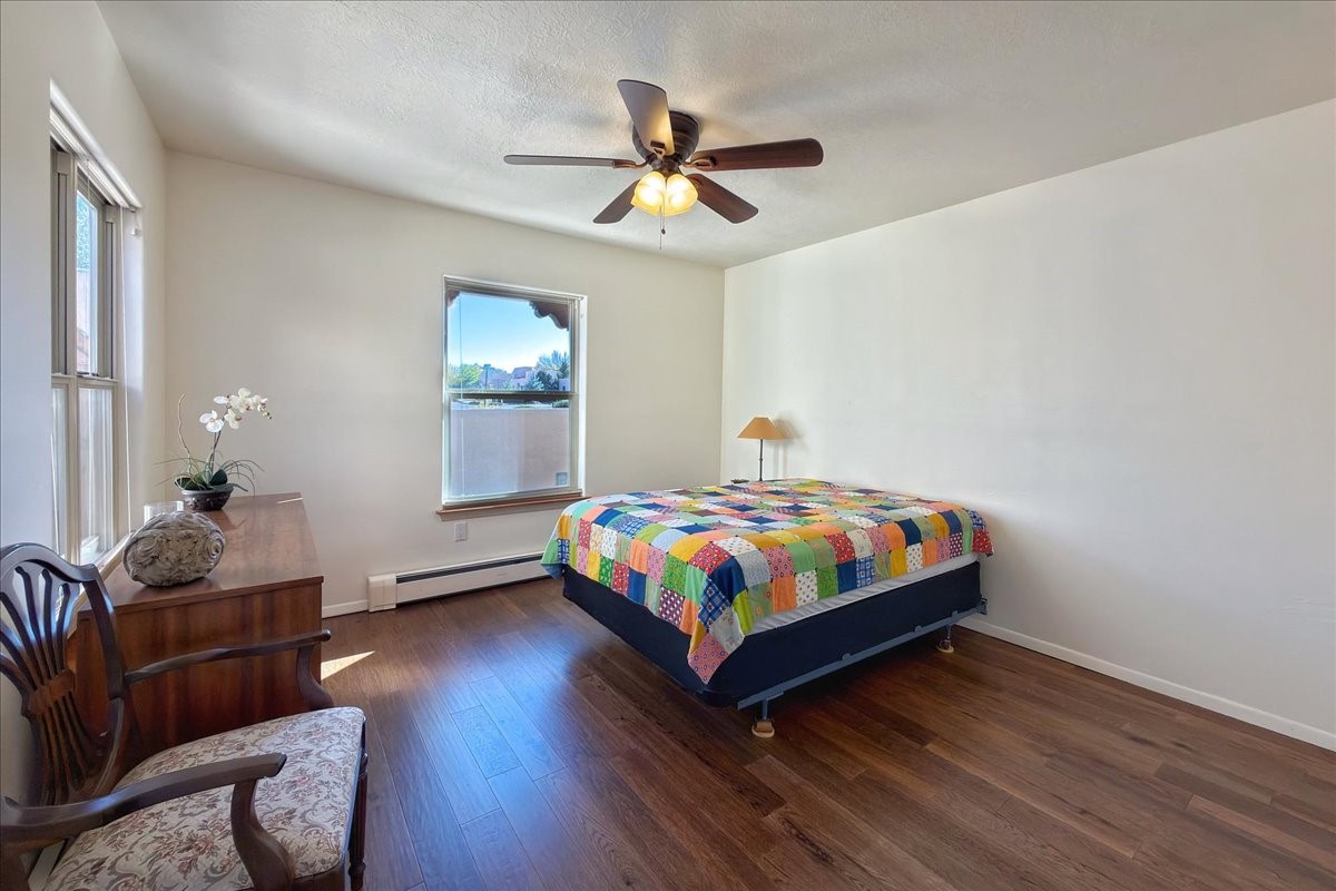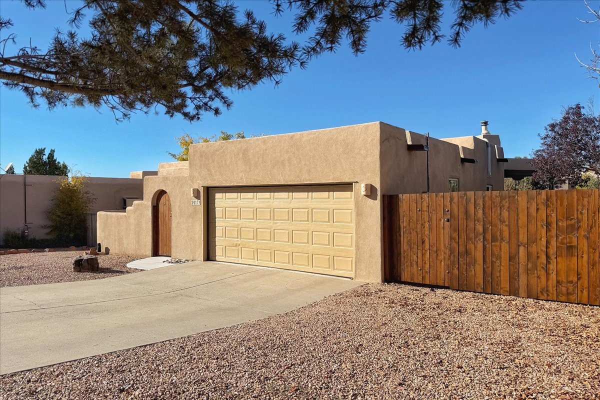 Nestled in the desirable Pueblos del Sol subdivision, this beautifully maintained split-level Pueblo-style home blends traditional Santa Fe charm with modern comfort. Featuring 3 bedrooms, 3 baths, a flex room, and generous living spaces, the home welcomes you with classic vigas, wood doors, and a warm, light-filled interior that captures the spirit of the Southwest.The main level offers a spacious living area with a kiva-style fireplace, an inviting dining space, and an updated kitchen featuring granite counters, stainless steel appliances, and gas cooking. The primary bedroom suite is conveniently located on this level, offering privacy, an en suite bath, and easy access to the main living areas.Downstairs, the split-level design reveals two additional bedrooms, a full bath, and a flex room perfect for a home office, studio, or media space. Every detail reflects thoughtful care and updates, including mini-split heating and cooling systems for year-round comfort, a water softener/reverse osmosis system, and a radon mitigation system for peace of mind.Step outside to enjoy the best of Santa Fe living. A new wood deck extends your living space outdoors--ideal for relaxing or entertaining--overlooking a beautifully xeriscaped yard designed for low maintenance and natural beauty. From your backyard gate, access scenic walking trails and open space that define the Pueblos del Sol lifestyle.Additional features include an oversized two-car garage, excellent storage throughout, granite countertops, and a well-maintained roof. This home's blend of timeless style, modern updates, and thoughtful layout make it a standout in one of Santa Fe's most sought-after neighborhoods.Located close to schools, shopping, and dining, yet surrounded by trails and open skies, 2917 Pueblo Halona offers the perfect balance of convenience, comfort, and authentic Santa Fe character.