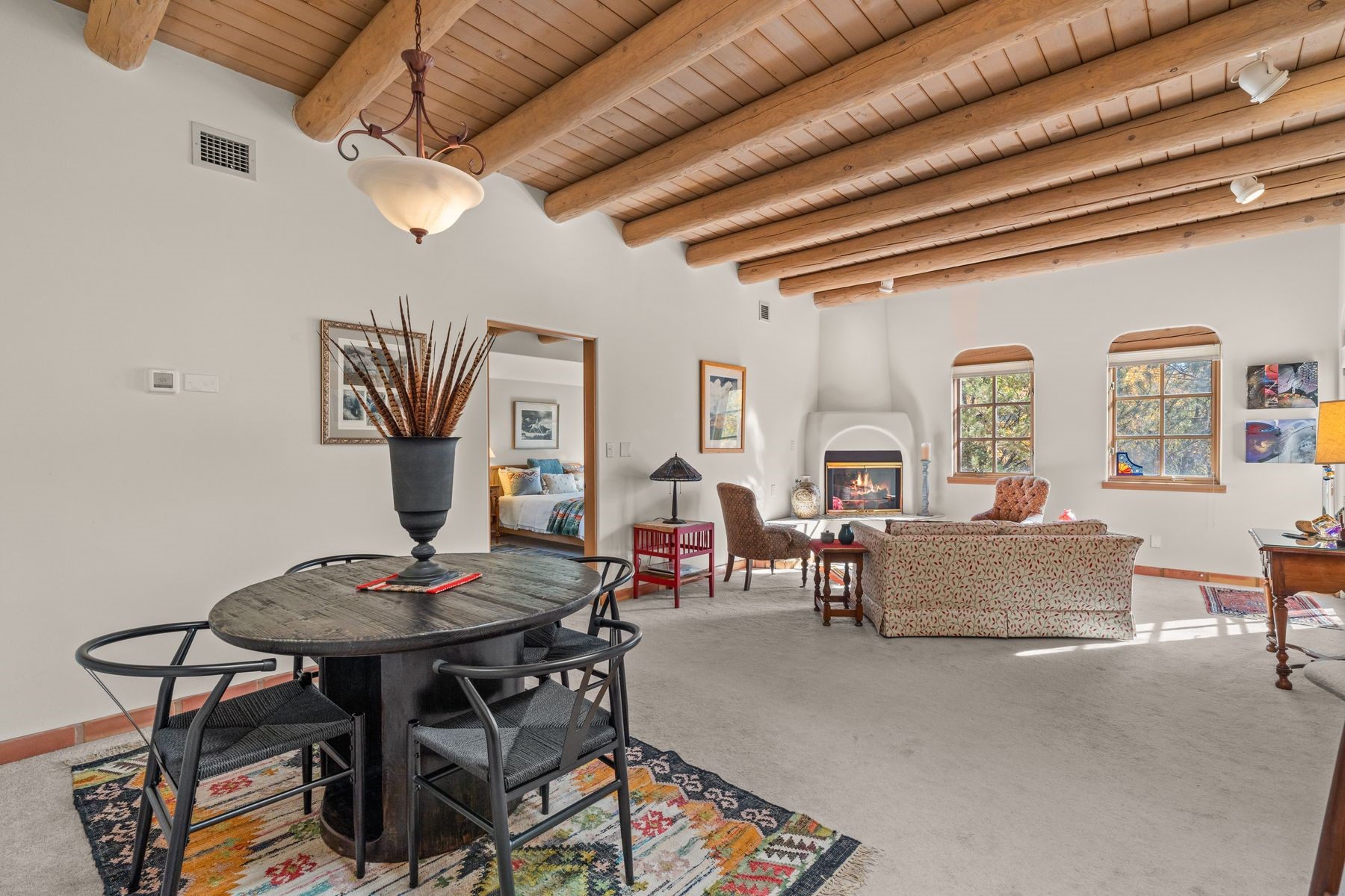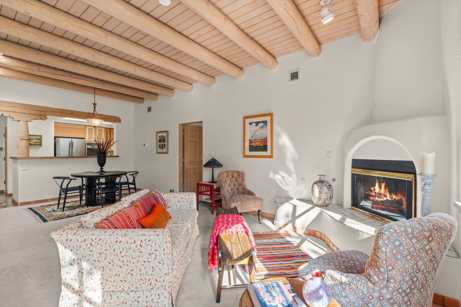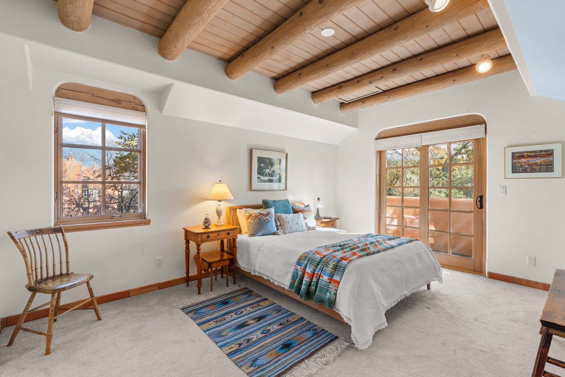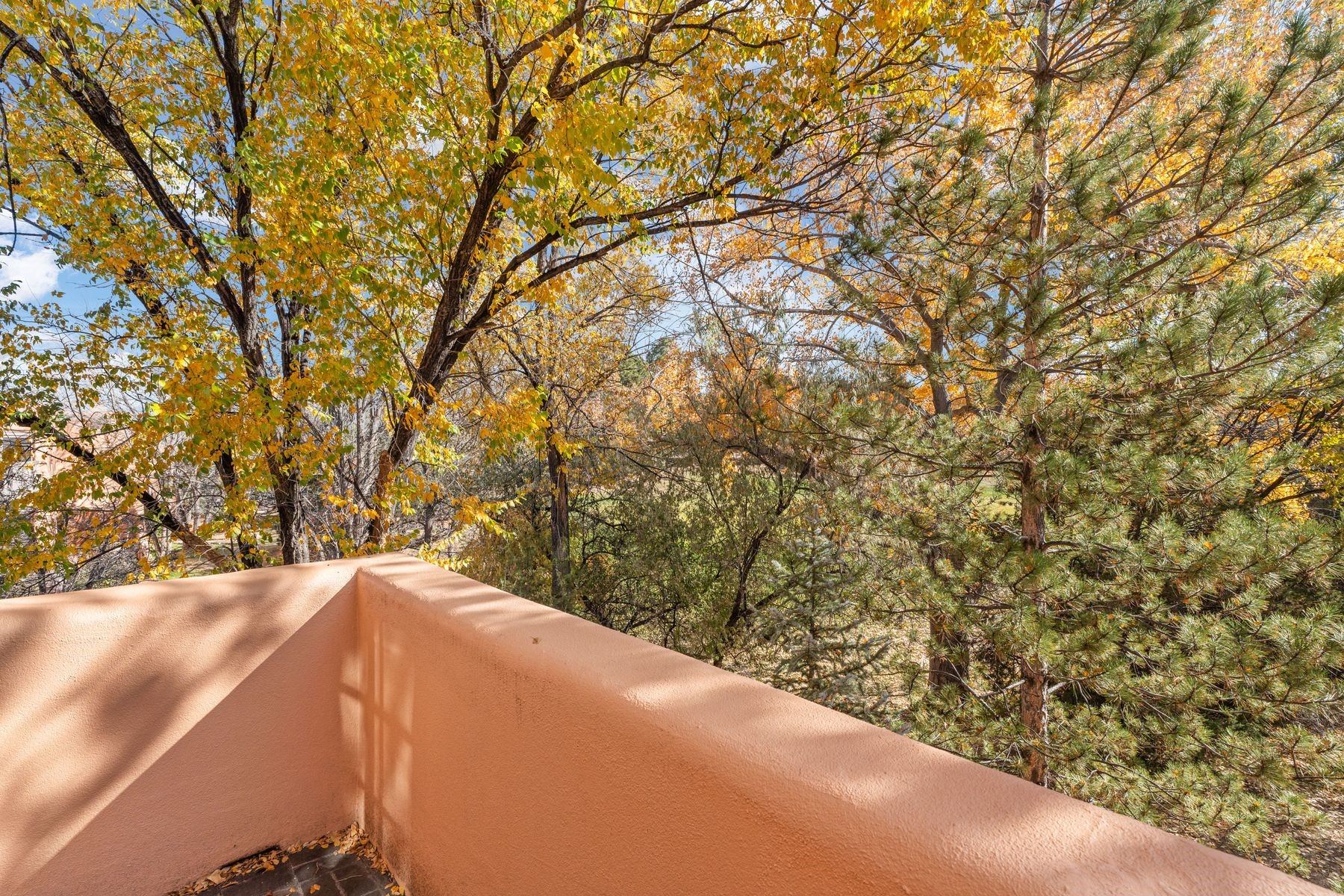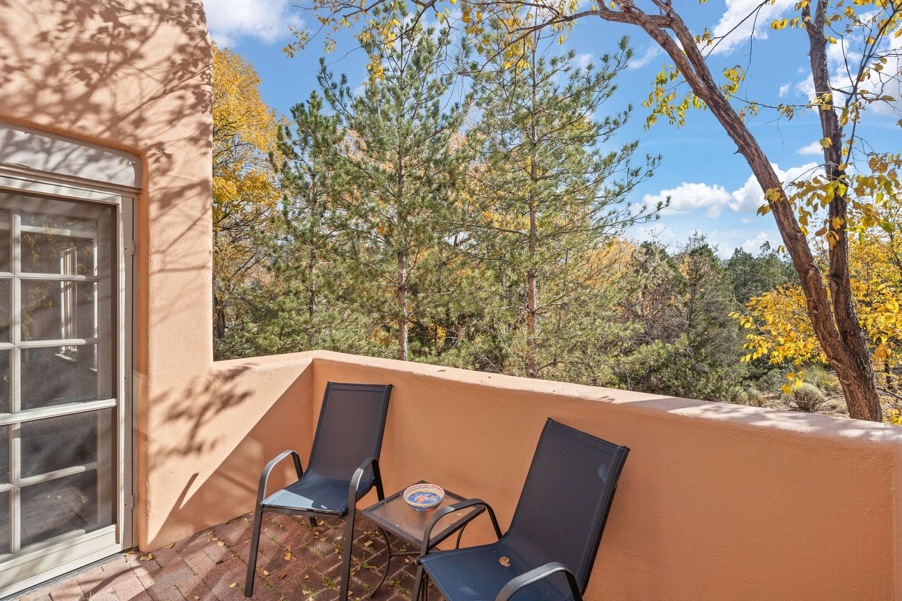 Enjoy easy living in this beautiful second-story end unit surrounded by trees and natural light. With two peaceful balconies, it feels like your own private retreat. Inside, the open layout is bright and welcoming, featuring vigas, skylights and a cozy gas fireplace. A private entry enclave with a banco adds a touch of inviting Santa Fe charm. Designed for comfort and convenience, you'll find tile and carpet flooring, air conditioning and step-in shower. Relax knowing underground parking and resort-style amenities are just steps away, including a clubhouse, pool, tennis, golf, spa, fitness center, restaurant and 24-hour hosted gate. Low-maintenance, light-filled and perfectly serene -- this is Santa Fe living made easy.