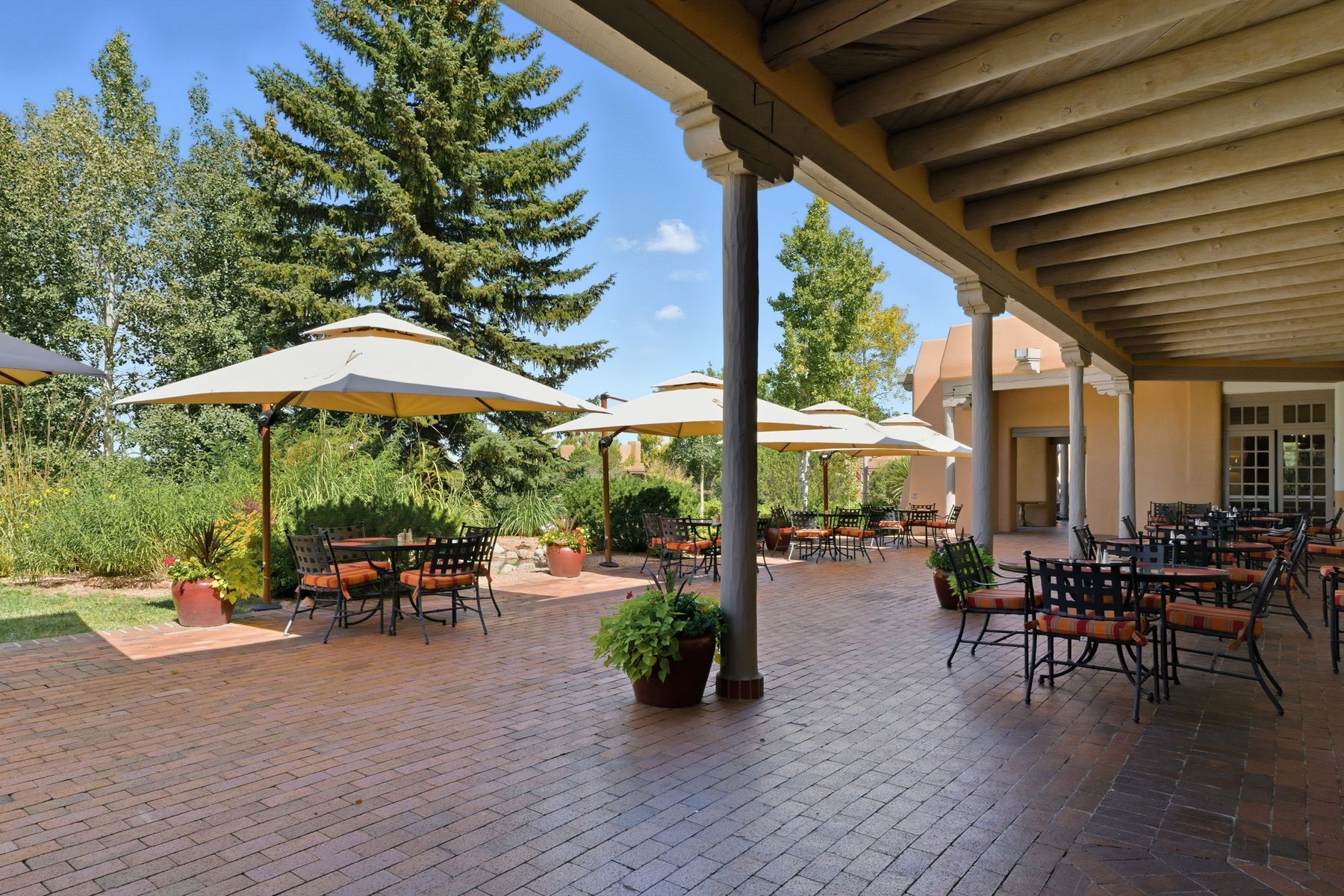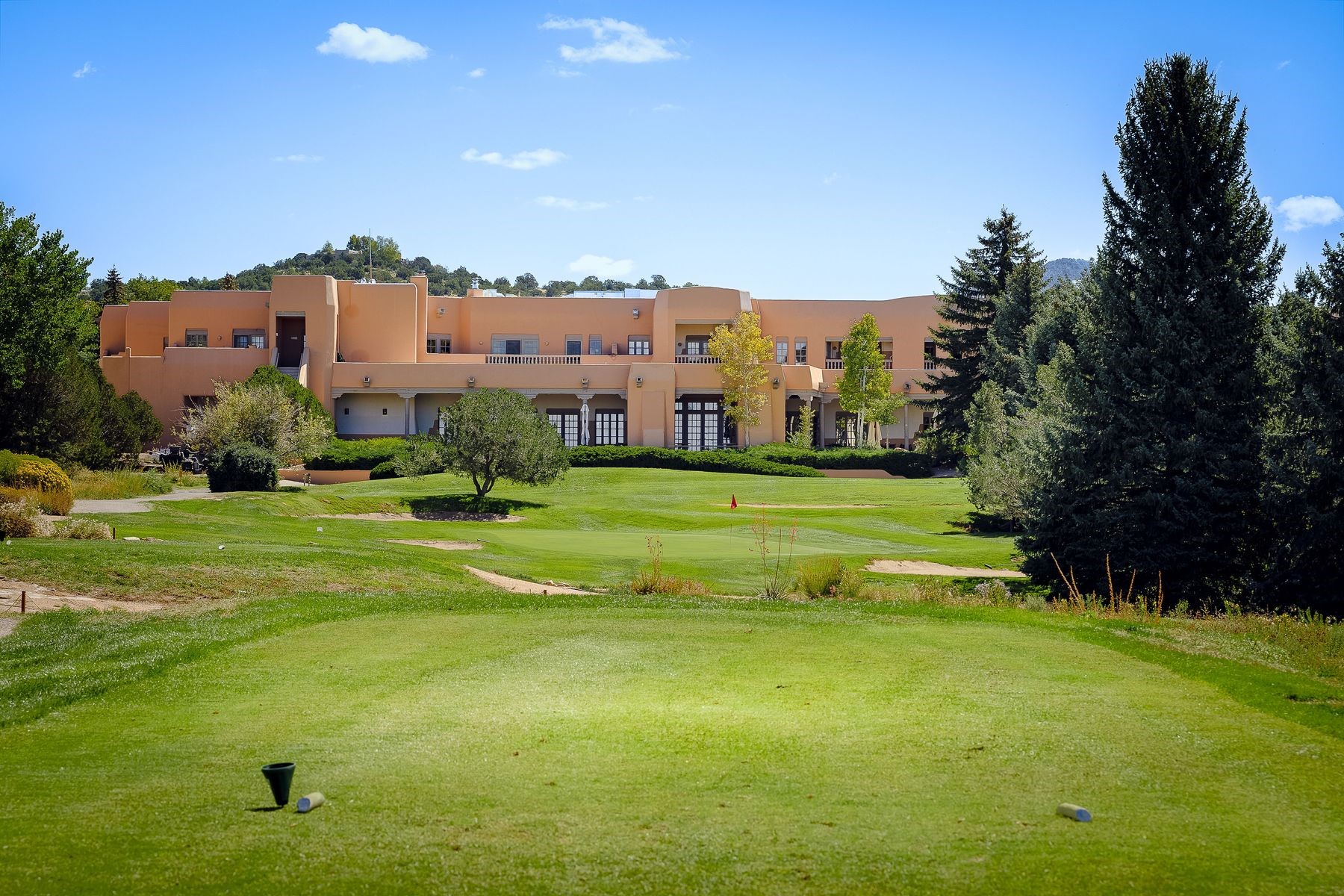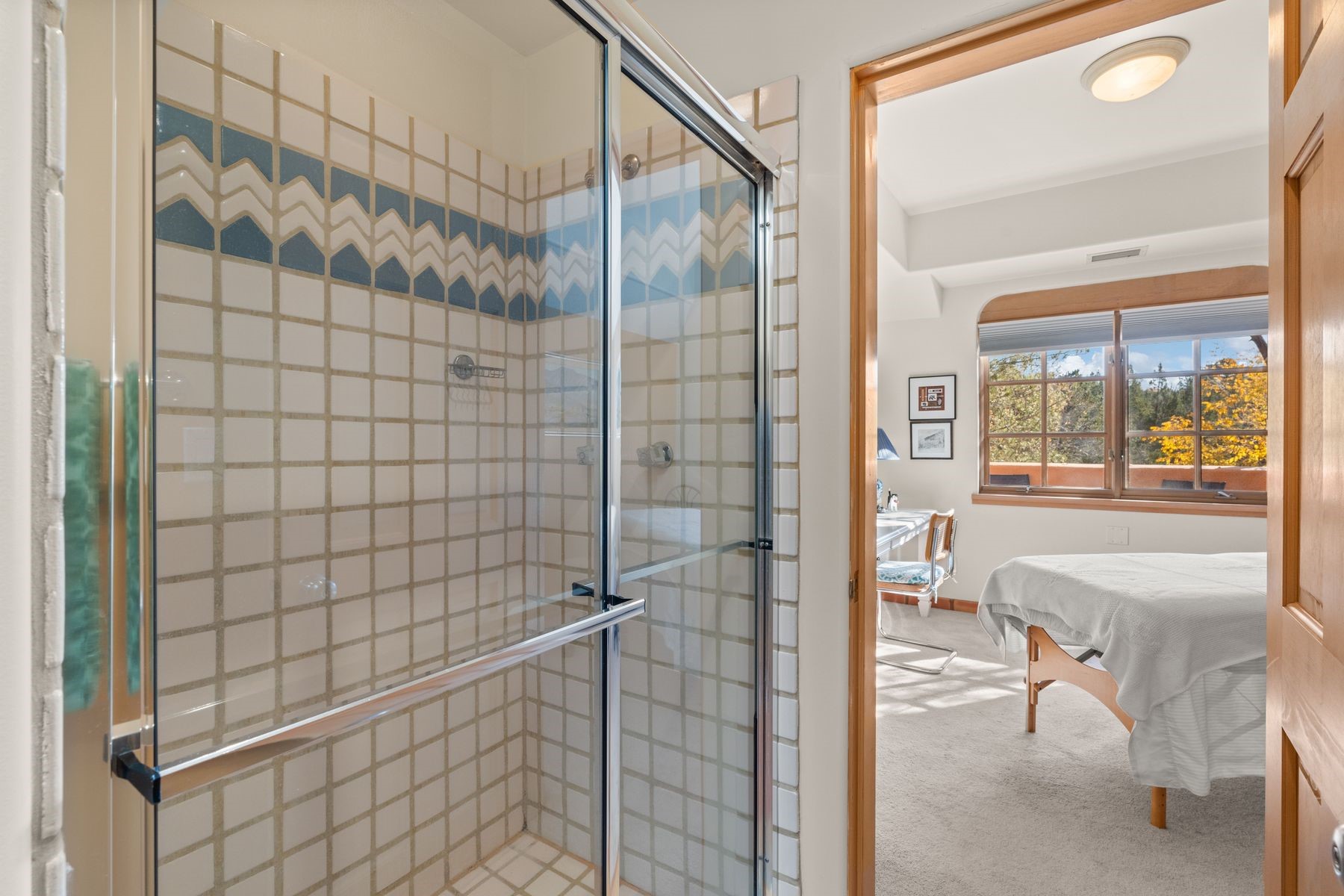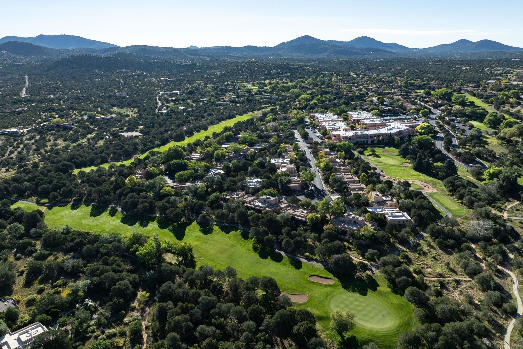 Enjoy easy living in this beautiful second-story end unit surrounded by trees and natural light. With two peaceful balconies, it feels like your own private retreat. Inside, the open layout is bright and welcoming, featuring vigas, skylights and a cozy gas fireplace. A private entry enclave with a banco adds a touch of inviting Santa Fe charm. Designed for comfort and convenience, you'll find tile and carpet flooring, air conditioning and step-in shower. Relax knowing underground parking and resort-style amenities are just steps away, including a clubhouse, pool, tennis, golf, spa, fitness center, restaurant and 24-hour hosted gate. Low-maintenance, light-filled and perfectly serene -- this is Santa Fe living made easy.