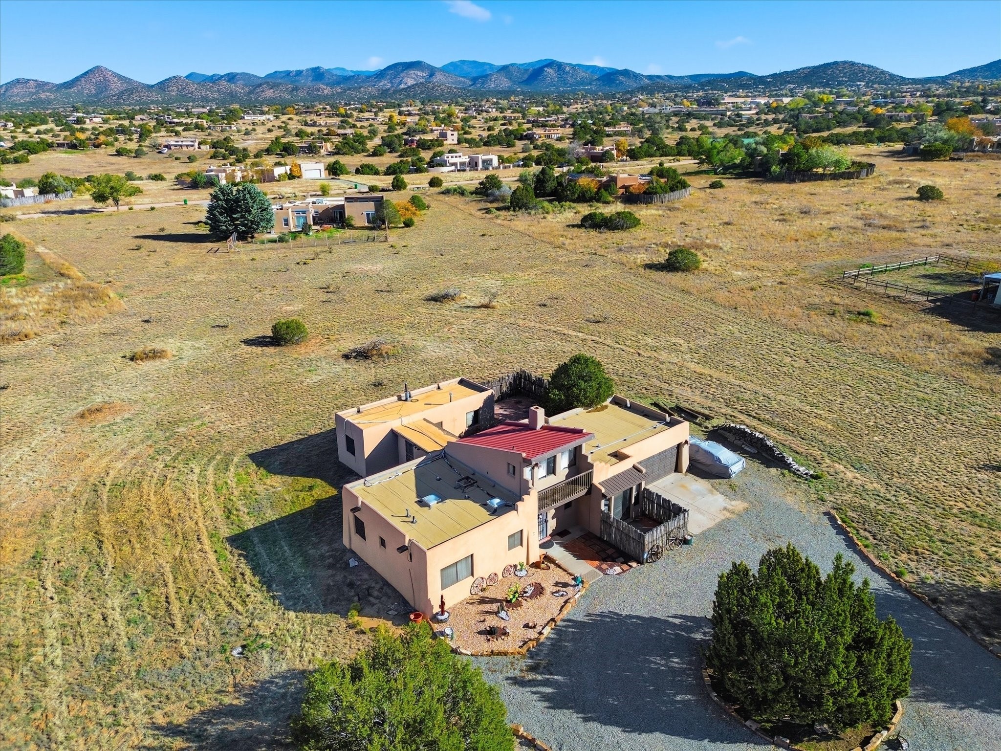A serene Santa Fe retreat in the coveted Eldorado community. This beautifully designed 3-bed, 2-bath residence sits on 1.64 acres with sweeping mountain views and the peaceful rhythm of desert living. Light-filled interiors feature high ceilings, tile floors, and a Kiva fireplace that adds warmth and timeless Santa Fe charm. The kitchen and living spaces open to a private patio perfect for entertaining or quiet starlit evenings. Experience tranquil country living just minutes from Santa Fe's Plaza, galleries, and fine dining. The spacious lot offers room to garden, relax, or expand. A perfect blend of comfort, elegance, and Southwest beauty, schedule your private tour today and see it for yourself.