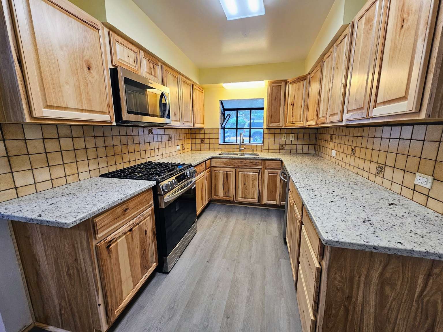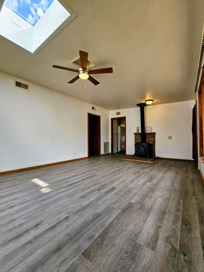 Enjoy the privacy of this beautiful home on a canyon lot! Large deck across the back of the house with view to the canyon. The deck is accessible from one of the bedrooms through sliding glass doors. High ceiling in the second living area with Saltillo type tile. Cozy living room with a wood stove. Newly renovated kitchen with new kitchen cabinets, new sink and faucet, beautiful granite countertop, new gas range, new dishwasher, and new over the range microwave. New vinyl flooring in living room and kitchen. New furnace in December 2019, new roof (metal and TPO) in 2023. One off-street designated parking space Great location! Just minutes from High School and the lab! You'll love the convenience and outdoor lifestyle this area provides!