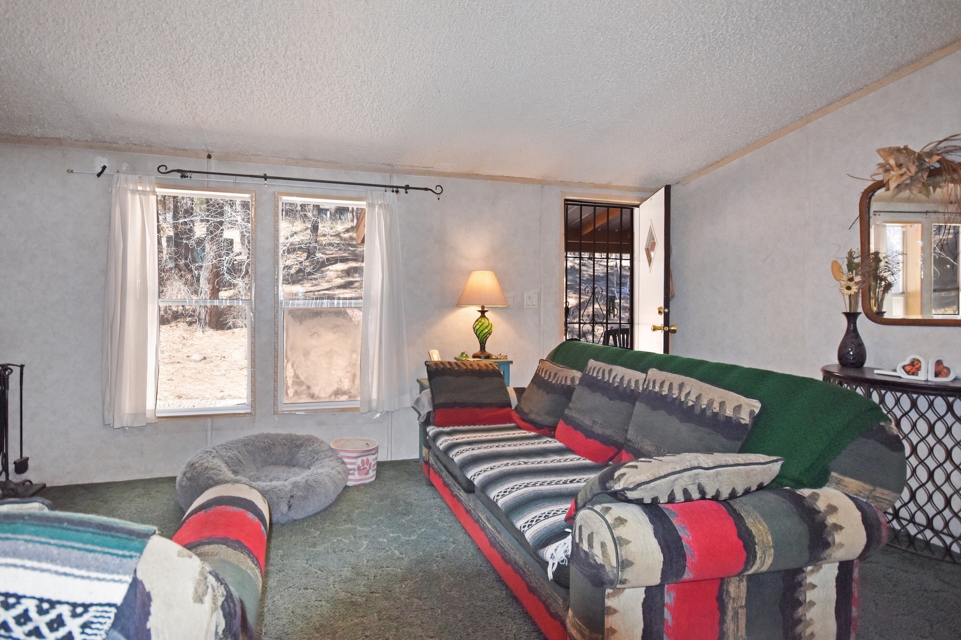 Fabulous Views, Easy Access, & a Great Location! Nestled in the tight-knit community of La Cueva, this charming & affordable home sits on a 0.5-acre lot surrounded by pine trees & nature. Enjoy community water through Hidden Valley Estates MDWCA. The spacious layout features a split floor plan with the master bedroom on one side & two additional bedrooms on the other. Two full baths, including one with a garden tub. The open concept living area has an efficient woodstove for cozy evenings at home, & the country kitchen provides plenty of counter space along with an attached laundry room. Enjoy fishing & hiking right out your back door! Conveniently located on a county-maintained road for year-round access and just a reasonable 40-minute commute to Los Alamos. Don't miss this one!