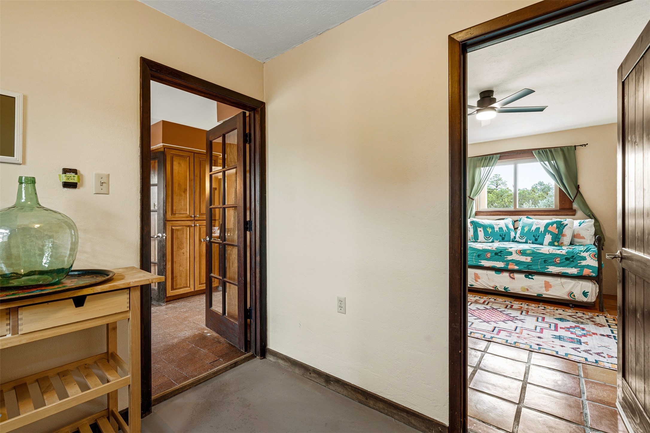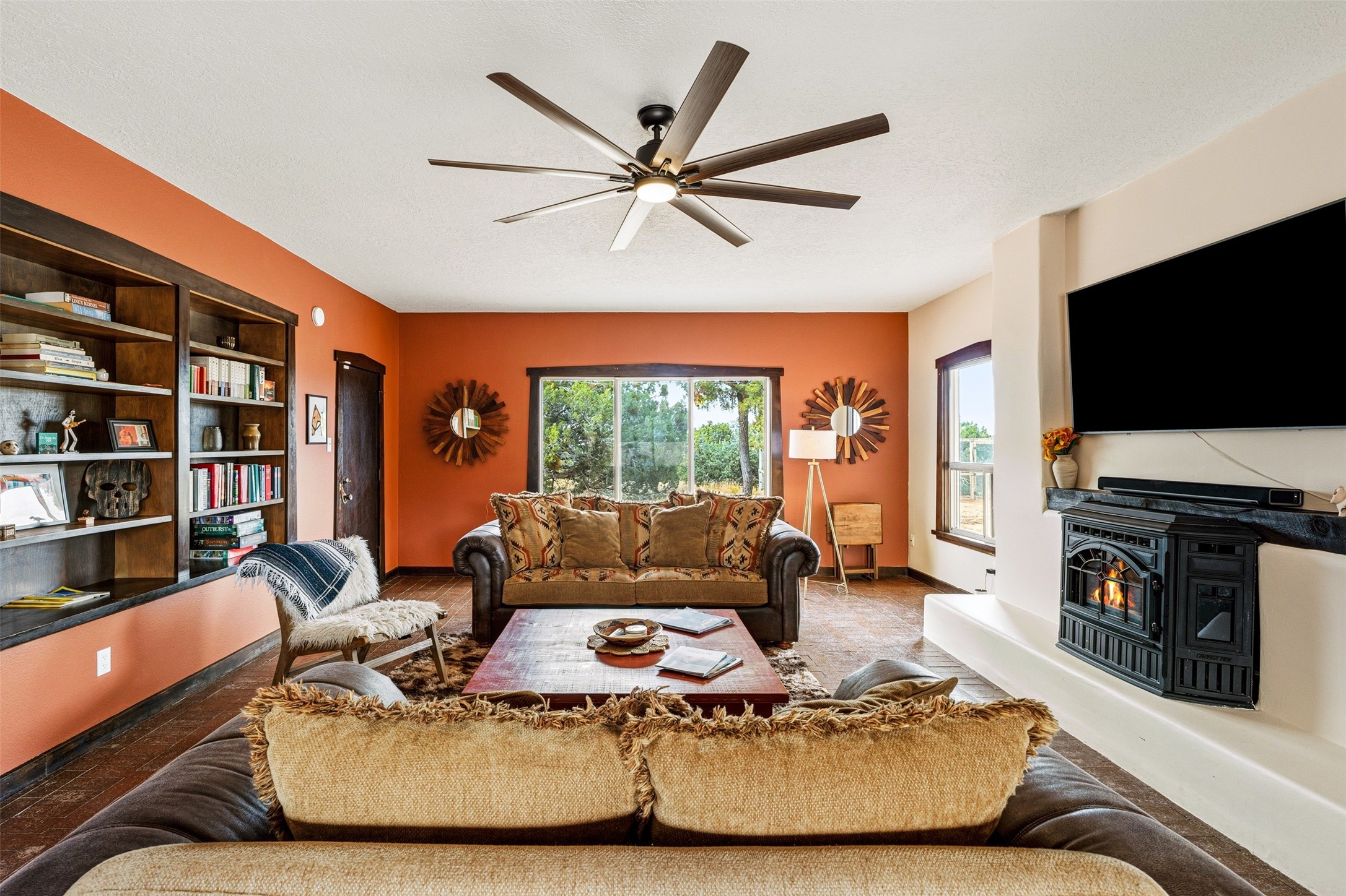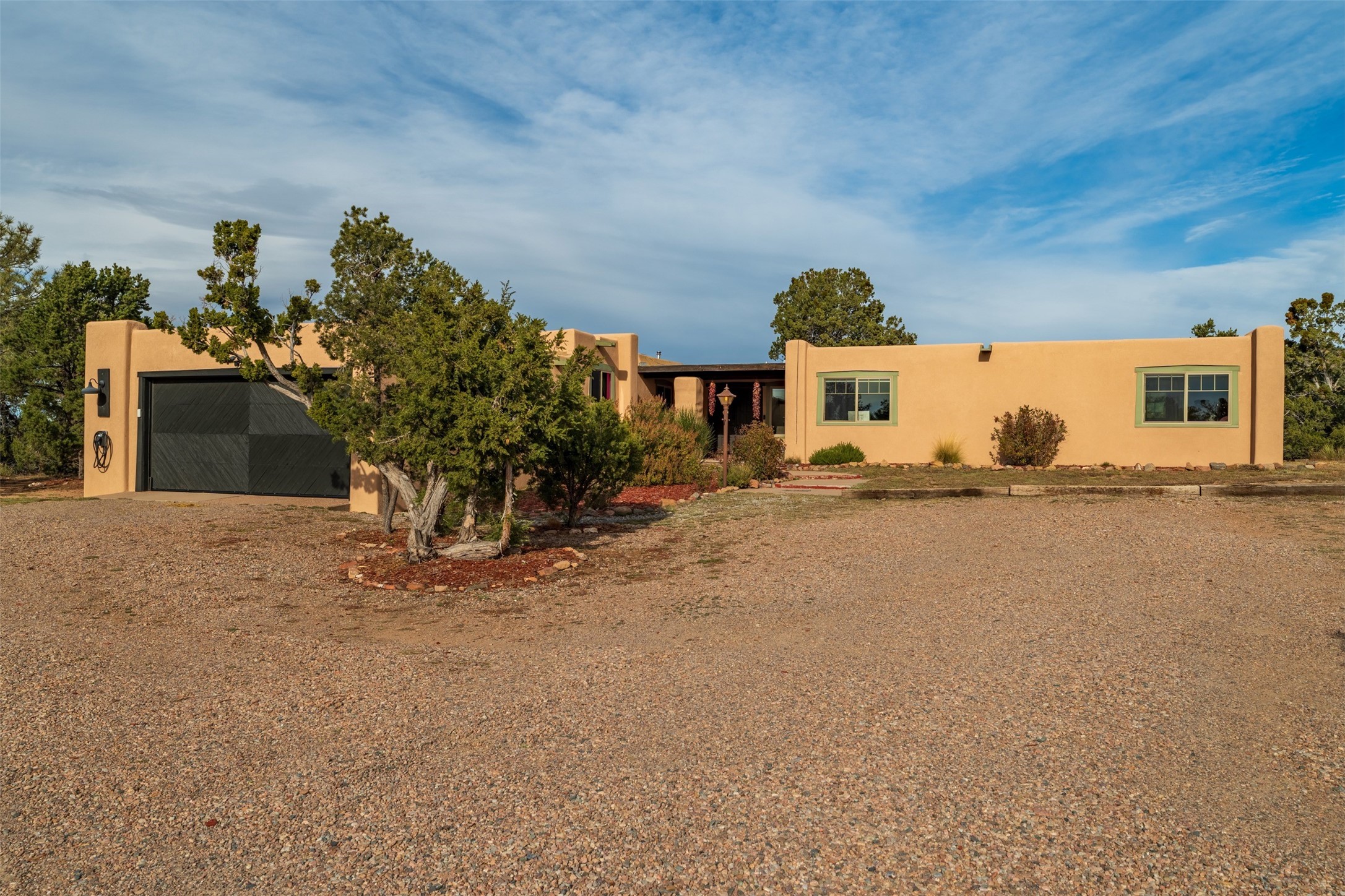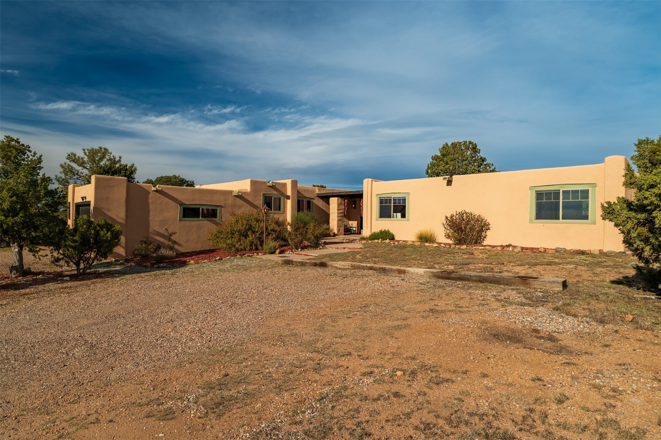 Discover this thoughtfully designed 3-bedroom, 2-bath home on five acres in Sunlit Hills, offering the perfect blend of rural tranquility and everyday convenience. Enjoy views of the Jemez Mountains and nearby foothills, just 10 minutes from town.The home's L-shaped layout centers around a courtyard and two large covered patios, ideal for outdoor dining and relaxation. Inside, you'll find brick and tile floors, maple cabinetry, custom built-ins, and generous closet space throughout.The private primary suite features a fireplace and peaceful views, while a pellet stove in the living room adds warmth and charm. A bonus room offers flexibility for an office, studio, or extra storage.Perfect for homesteading, the property includes a large chicken coop, fully fenced and deer-proof garden area, a spacious storage shed, and ample space for horses. Eco-friendly amenities include a fully owned solar panel array and EV charging station.With its heated two-car garage, self-sufficient design, and proven short-term rental history, this home offers comfort, versatility, and stunning natural beauty--all within easy reach of town.