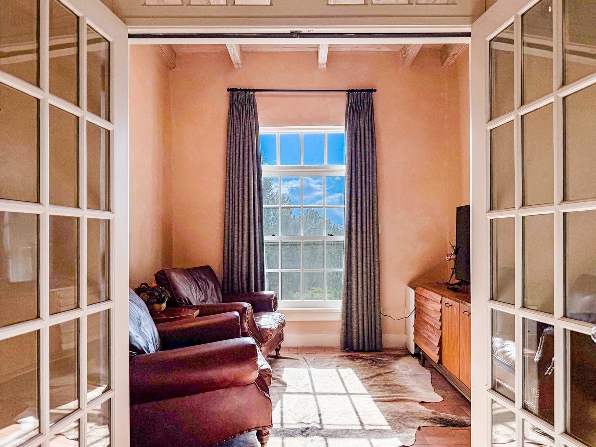 Nestled on 1.7 acres of lush, landscaped grounds near Bishop's Lodge Road, this timeless Territorial estate embodies the essence of Southwest living just five minutes from the Plaza. Behind a welcoming electronic gate, discover serene gardens and mature trees that set the tone for a private retreat filled with warmth and character. Inside, the residence unfolds with effortless grace, featuring hardwood and brick floors, tall ceilings and abundant natural light. The thoughtfully designed floor plan offers four bedrooms, three full baths, a three-quarter bath and a powder room, blending comfort and privacy throughout. Three inviting guest suites, each with its own en suite bath, are privately situated apart from the main living areas, providing an ideal layout for hosting family or friends. The elegant home captures the timeless charm of Santa Fe, where every detail invites relaxation and connection to the surrounding beauty.