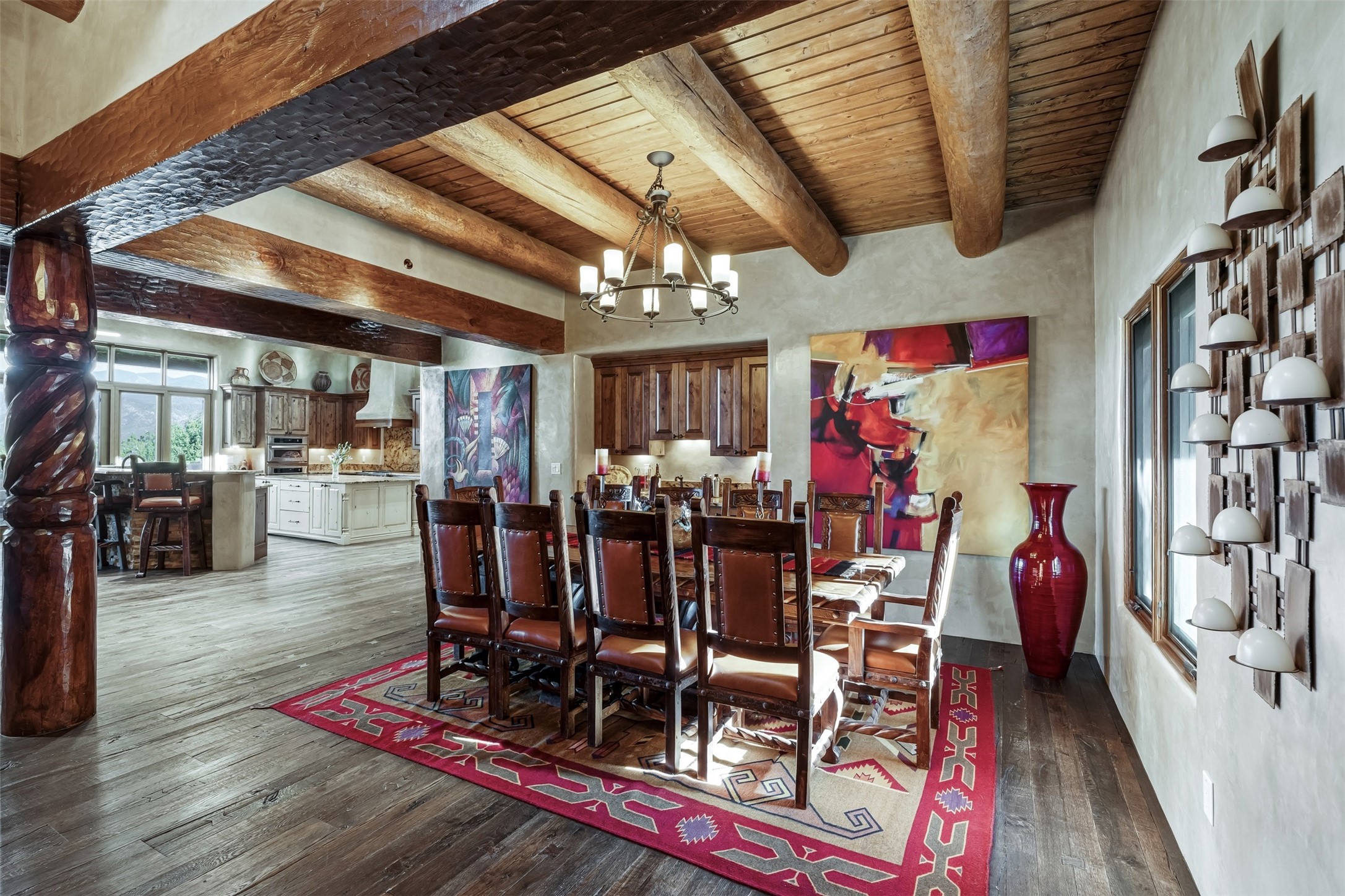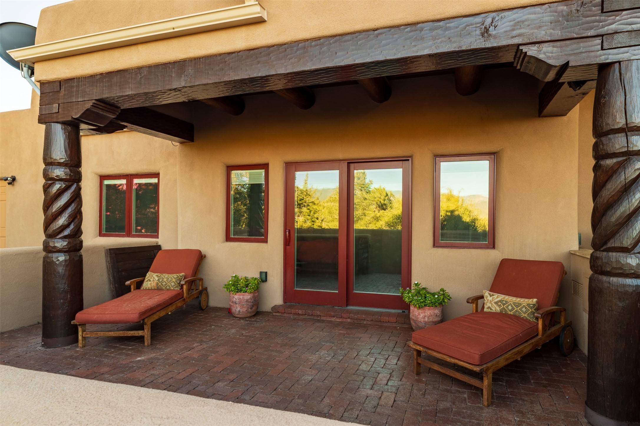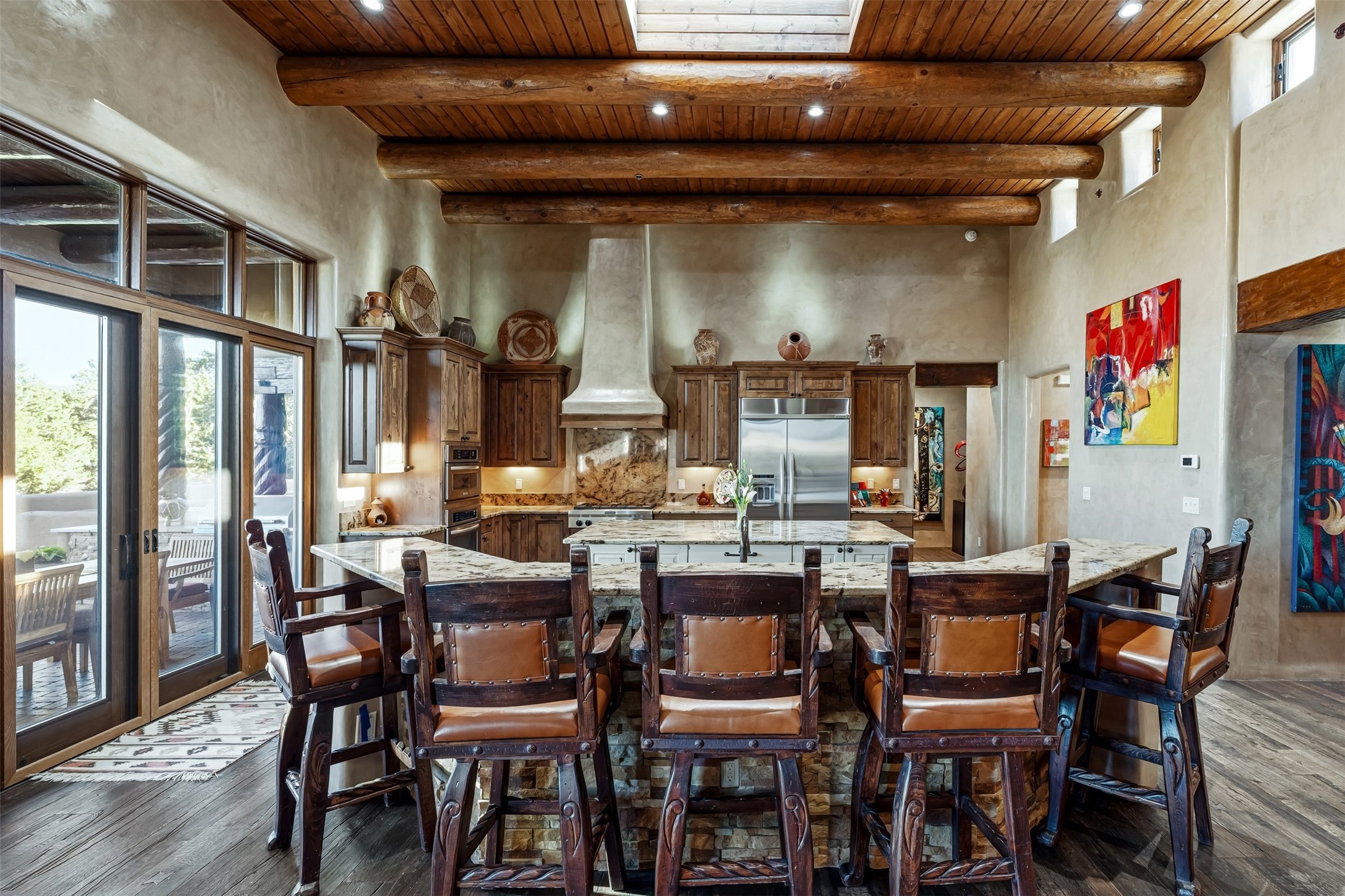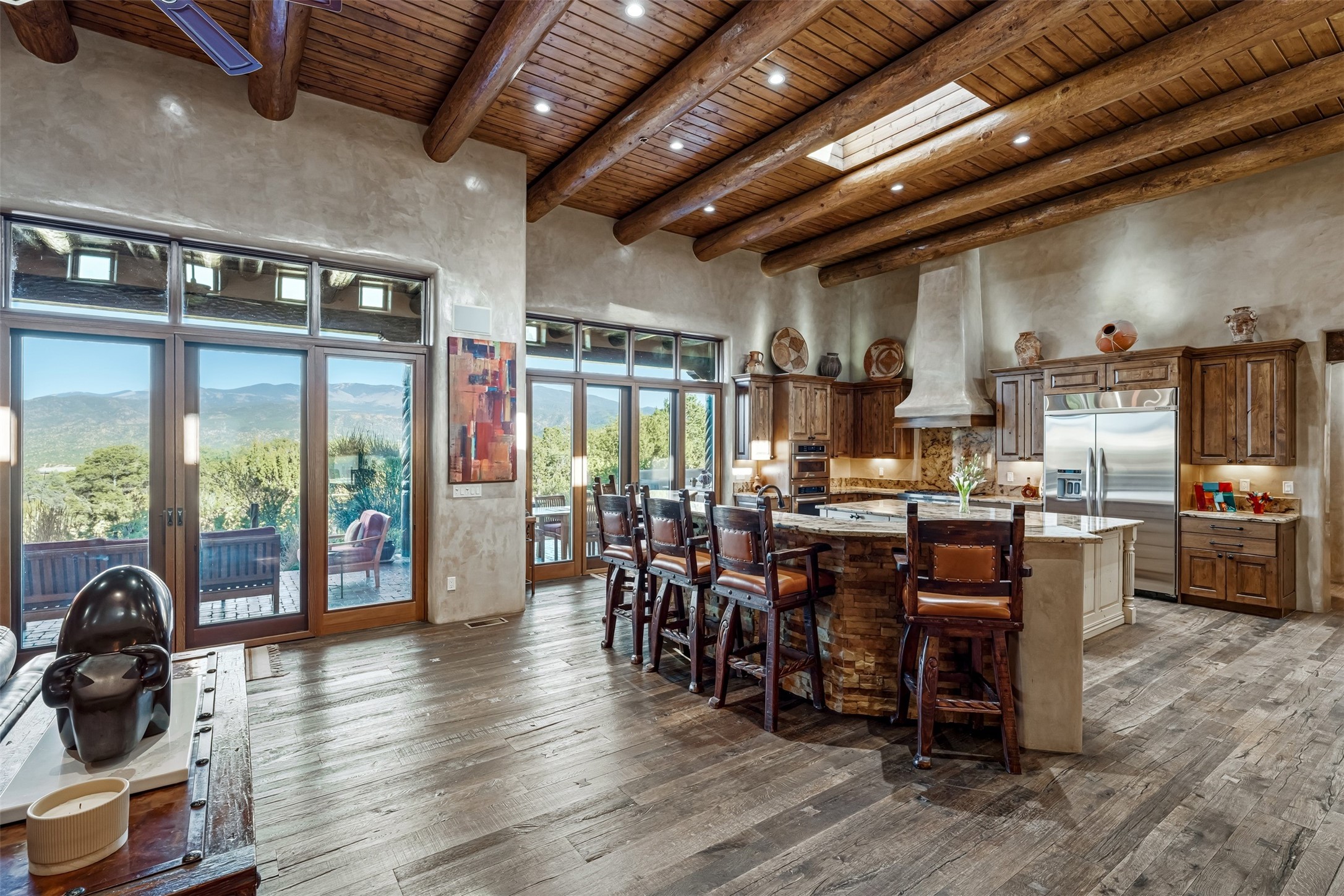 Perched on a private hillside in the prestigious Monte Sereno community, this exceptional custom home, designed by renowned architect Joe Boyden, offers a seamless blend of timeless elegance and modern Southwestern luxury. Built in 2014 and meticulously maintained, the home invites you into a world where architectural artistry meets sweeping natural beauty.From the moment you enter, you're greeted by jaw-dropping views of the Sangre de Cristo Mountains, framed by grand glass doors and expansive portals that blur the line between indoor and outdoor living. The dramatic great room, with soaring ceilings accented by massive hand-carved vigas and rich plaster walls, sets the tone for the home's artful blend of authenticity and sophistication.With 3 spacious bedrooms, a flexible office or 4th bedroom, and 4 luxurious bathrooms, the home offers both intimacy and space. The heart of the home is the gourmet kitchen, complete with two striking granite islands, high-end stainless appliances, a generous butler's pantry, and artisan cabinetry. An entertainer's dream, the kitchen flows into the great room and out to the covered patio with a kiva fireplace, perfect for al fresco dining under New Mexico's vast skies.Outside, lush native landscaping and a professionally installed drip irrigation system complement the natural terrain, while multiple outdoor living areas invite you to relax and take in the sunset, stars, and ever-changing light of the high desert.Tucked just minutes from downtown Santa Fe and the acclaimed Santa Fe Opera, this home offers the serenity of Monte Sereno living with the cultural heartbeat of the city just moments away.Experience the very best of Santa Fe--privacy, luxury, and panoramic beauty--all in one extraordinary residence.