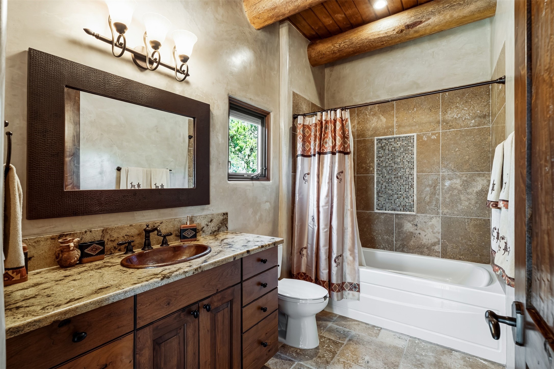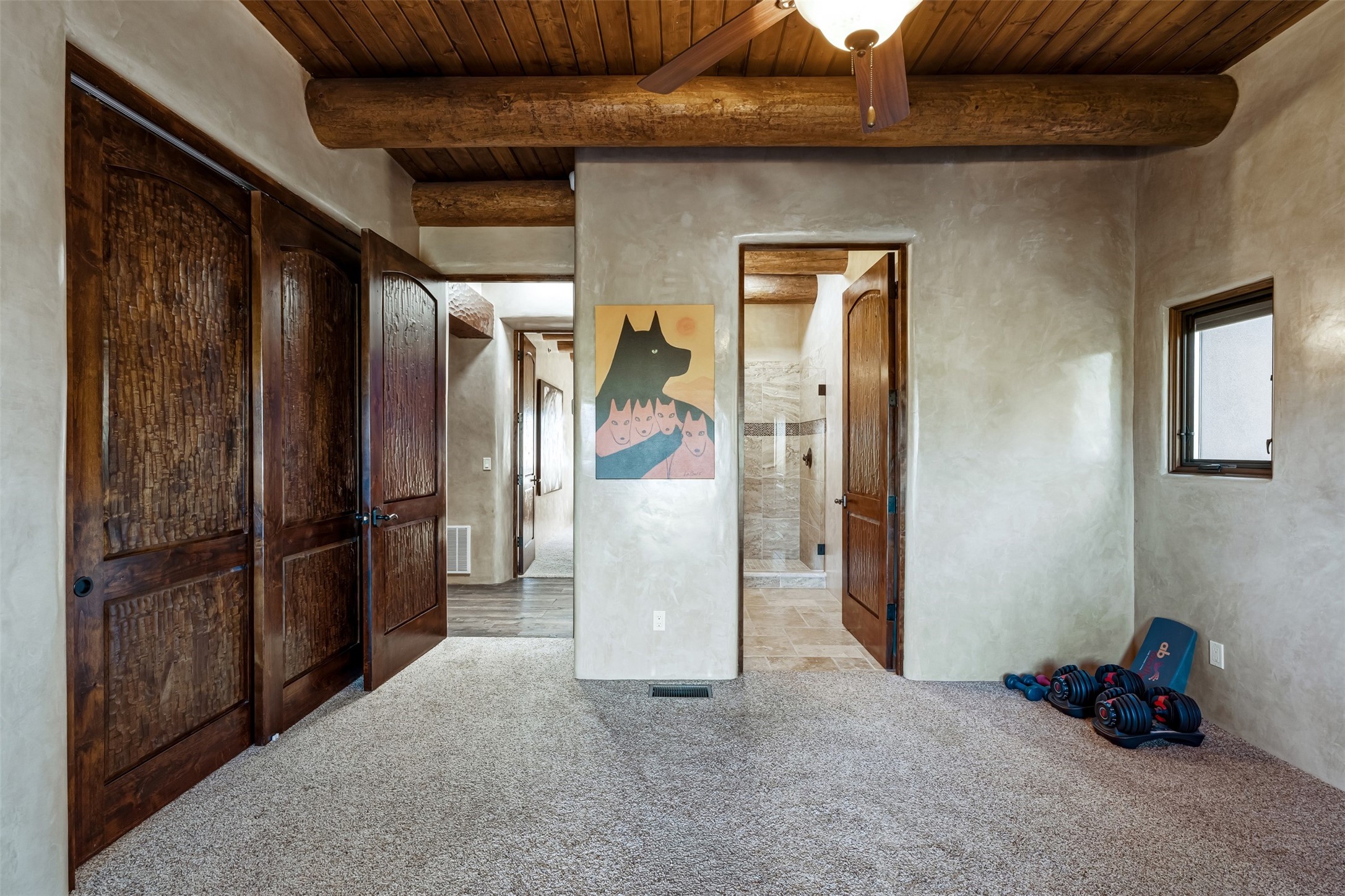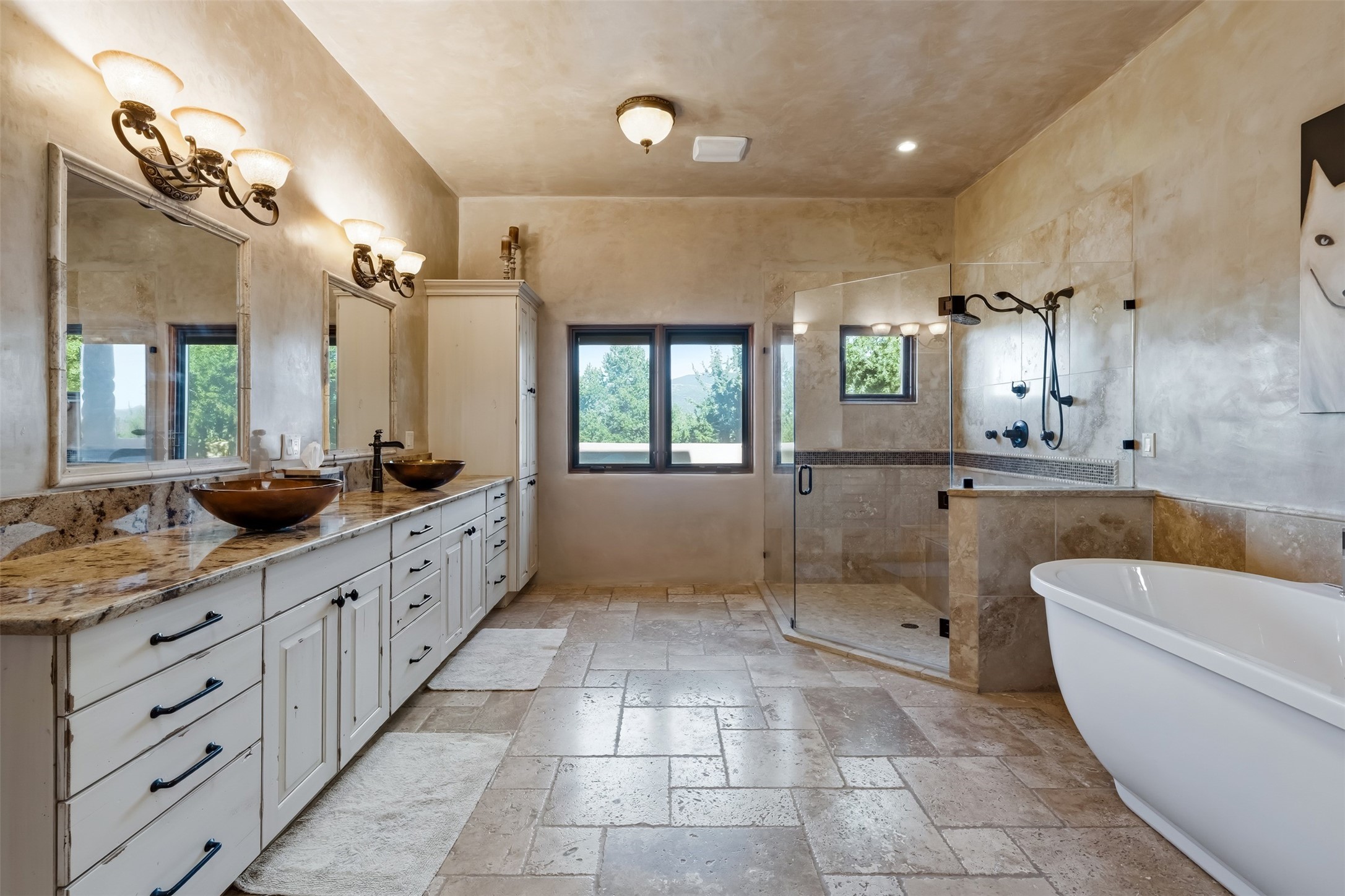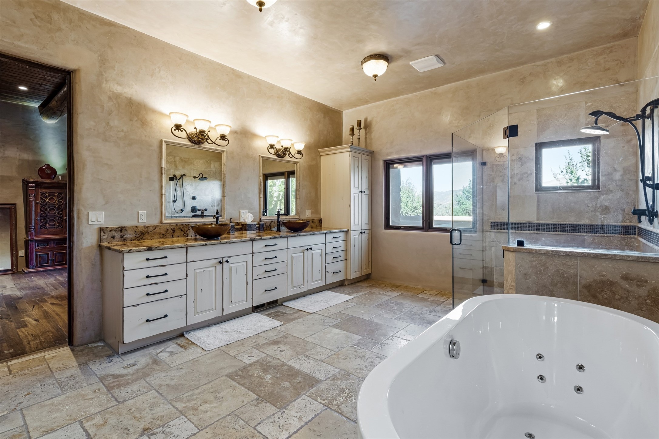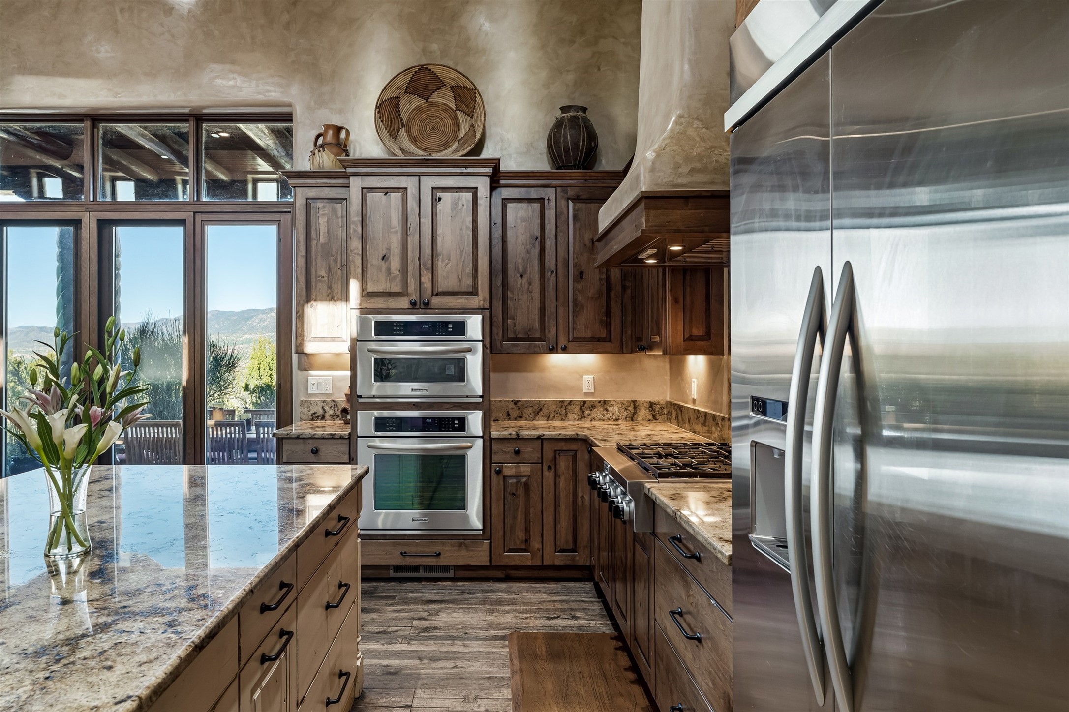 Perched on a private hillside in the prestigious Monte Sereno community, this exceptional custom home, designed by renowned architect Joe Boyden, offers a seamless blend of timeless elegance and modern Southwestern luxury. Built in 2014 and meticulously maintained, the home invites you into a world where architectural artistry meets sweeping natural beauty.From the moment you enter, you're greeted by jaw-dropping views of the Sangre de Cristo Mountains, framed by grand glass doors and expansive portals that blur the line between indoor and outdoor living. The dramatic great room, with soaring ceilings accented by massive hand-carved vigas and rich plaster walls, sets the tone for the home's artful blend of authenticity and sophistication.With 3 spacious bedrooms, a flexible office or 4th bedroom, and 4 luxurious bathrooms, the home offers both intimacy and space. The heart of the home is the gourmet kitchen, complete with two striking granite islands, high-end stainless appliances, a generous butler's pantry, and artisan cabinetry. An entertainer's dream, the kitchen flows into the great room and out to the covered patio with a kiva fireplace, perfect for al fresco dining under New Mexico's vast skies.Outside, lush native landscaping and a professionally installed drip irrigation system complement the natural terrain, while multiple outdoor living areas invite you to relax and take in the sunset, stars, and ever-changing light of the high desert.Tucked just minutes from downtown Santa Fe and the acclaimed Santa Fe Opera, this home offers the serenity of Monte Sereno living with the cultural heartbeat of the city just moments away.Experience the very best of Santa Fe--privacy, luxury, and panoramic beauty--all in one extraordinary residence.
