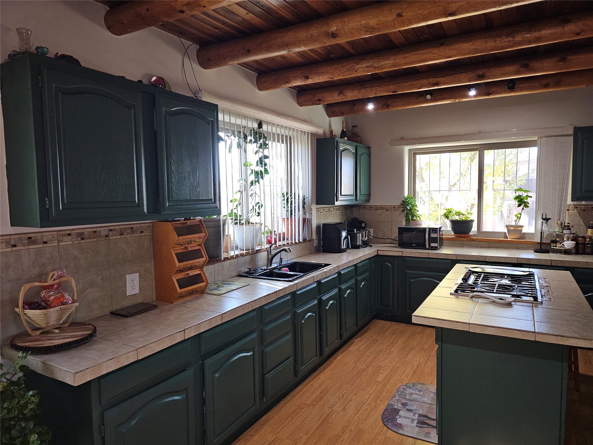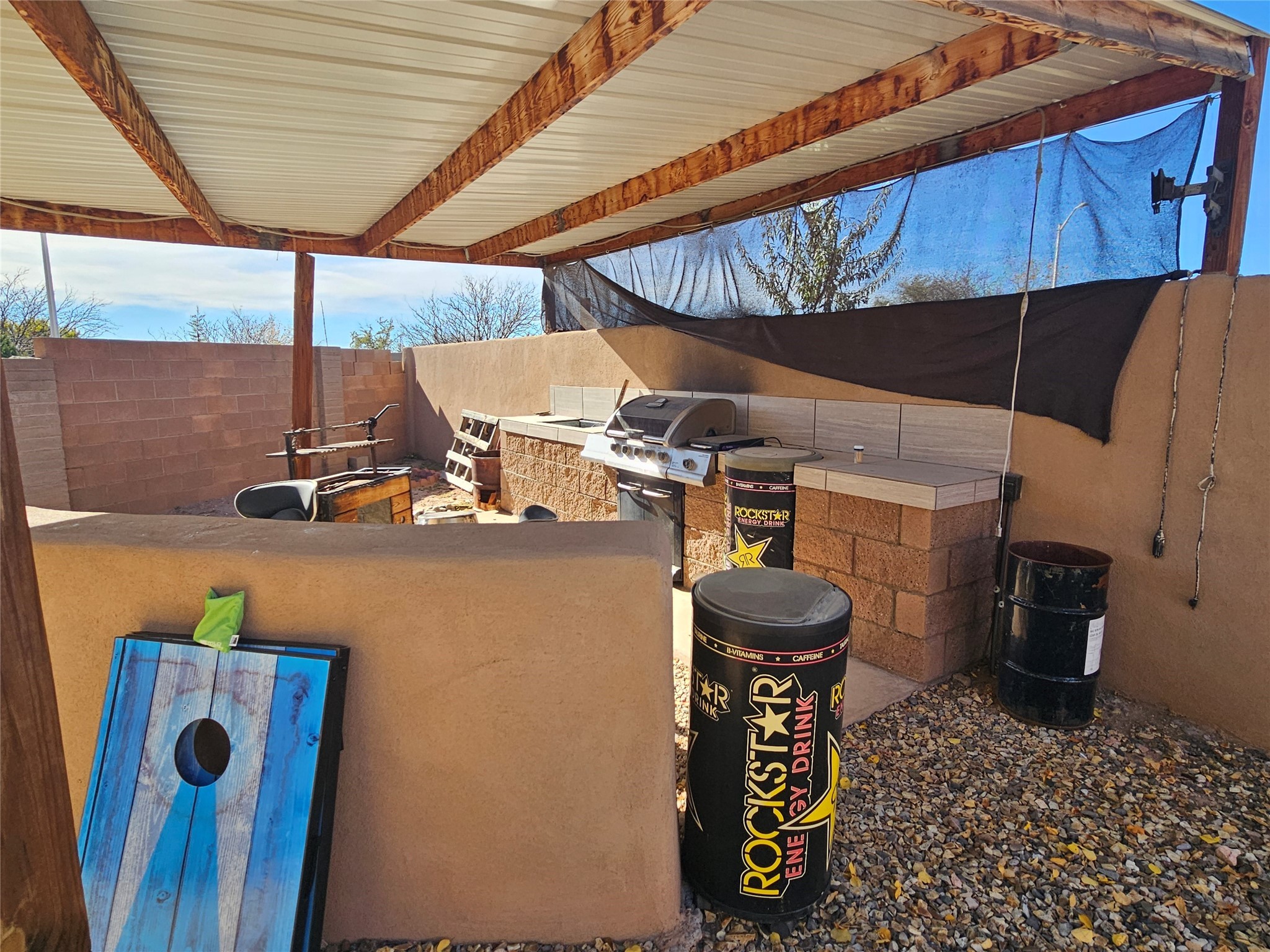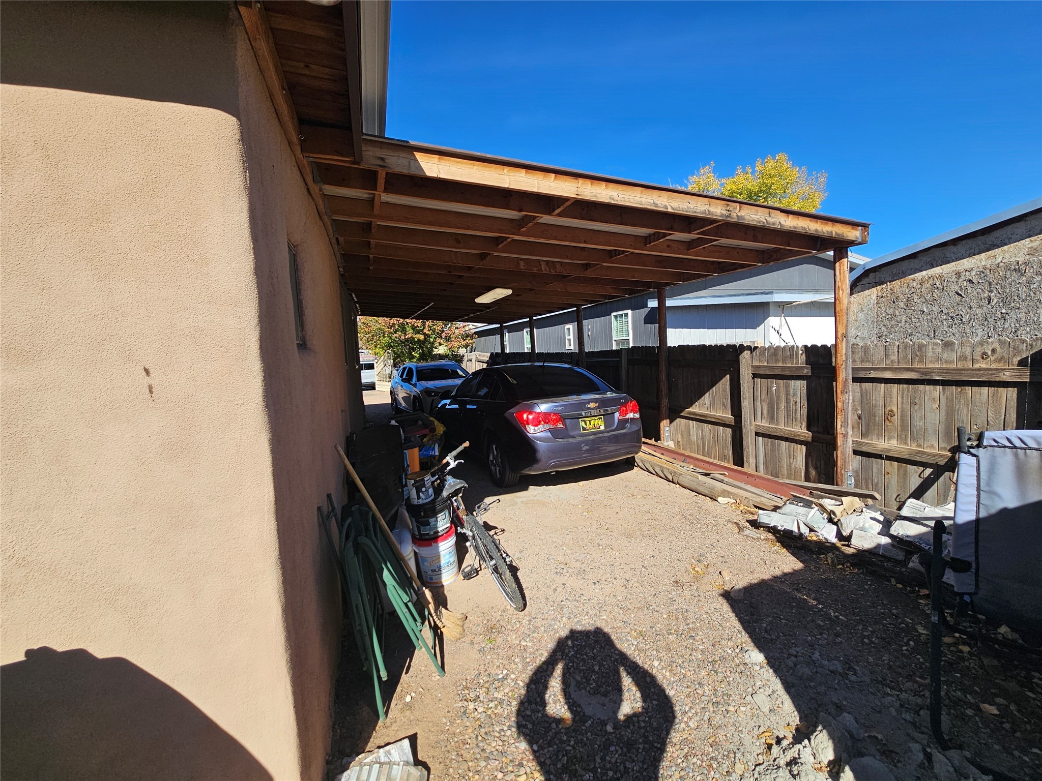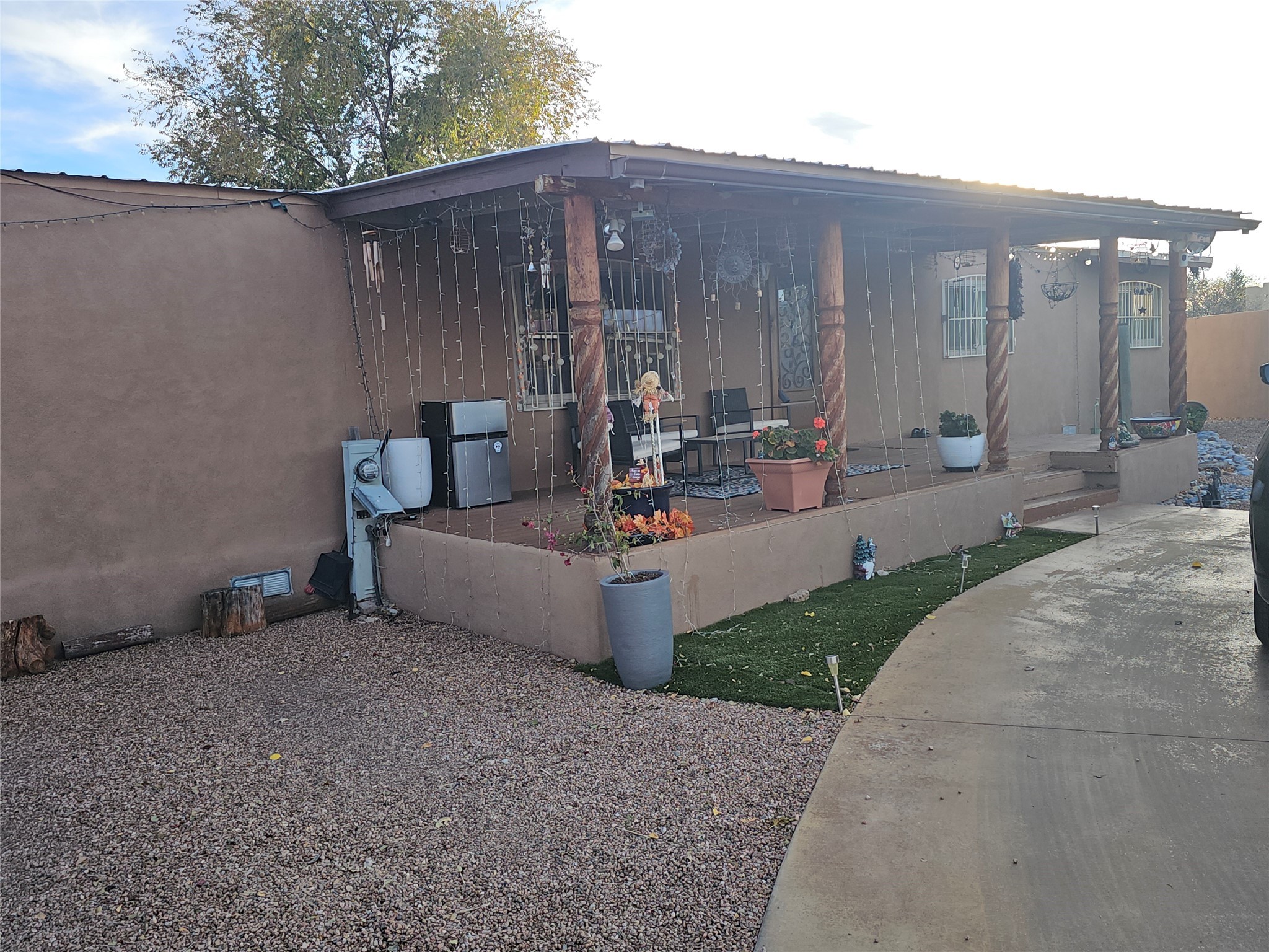 This is no ordinary manufactured home. Unique in so many ways: stuccoed double-wide with significant on-site-built additions. Large corner lot. Permanent foundation. Saltillo floor tile, vigas, hard trowel plaster walls, and a metal roof. Newer Anderson windows, four good-sized bedrooms, and three full baths. Radient heat . Large living and dining rooms and a fabulous kitchen. This home sits on a large .22-acre lot with a covered outdoor kitchen and entertainment area, plus a fire pit. Fully fenced and walled-in yard with double gates and a double carport and a concrete driveway for parking